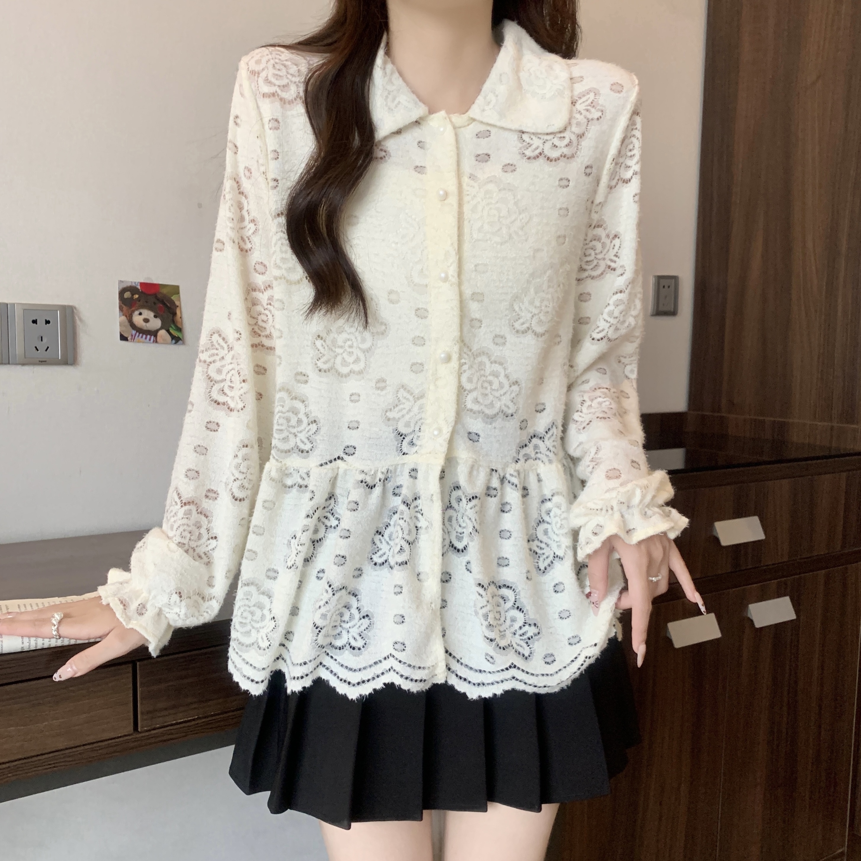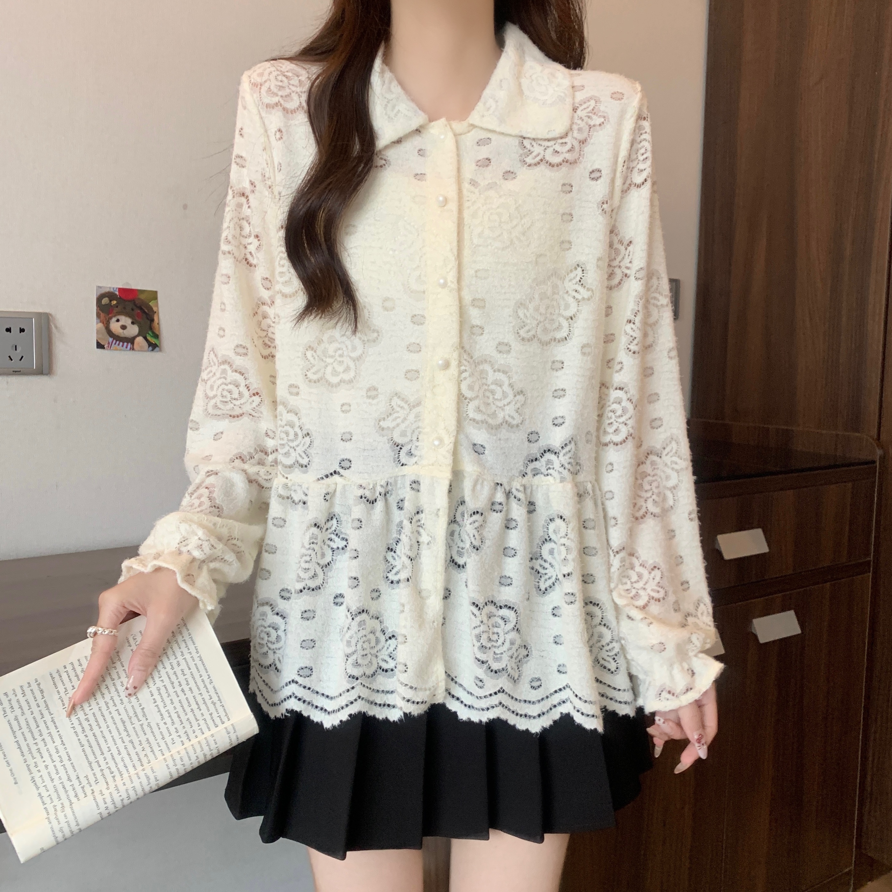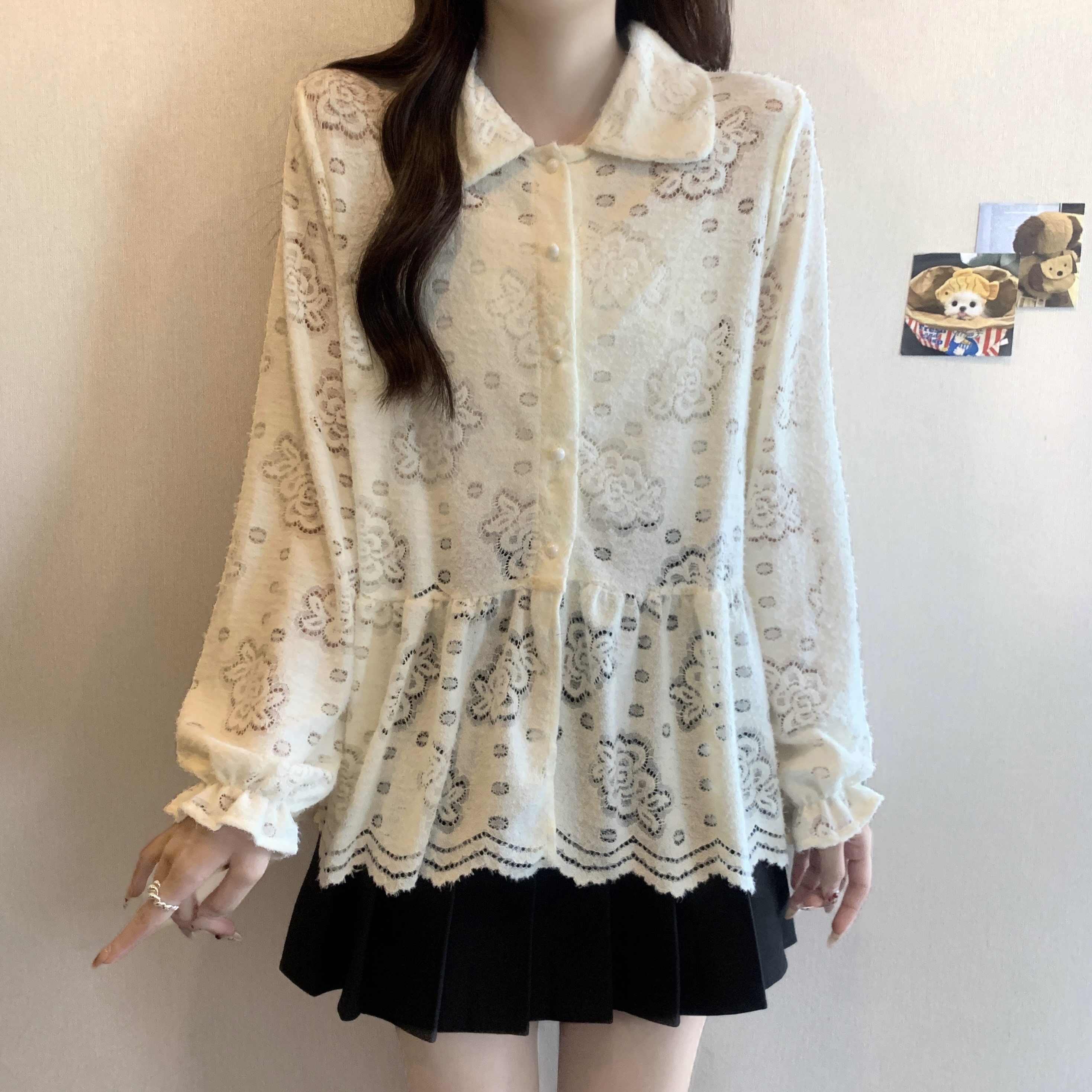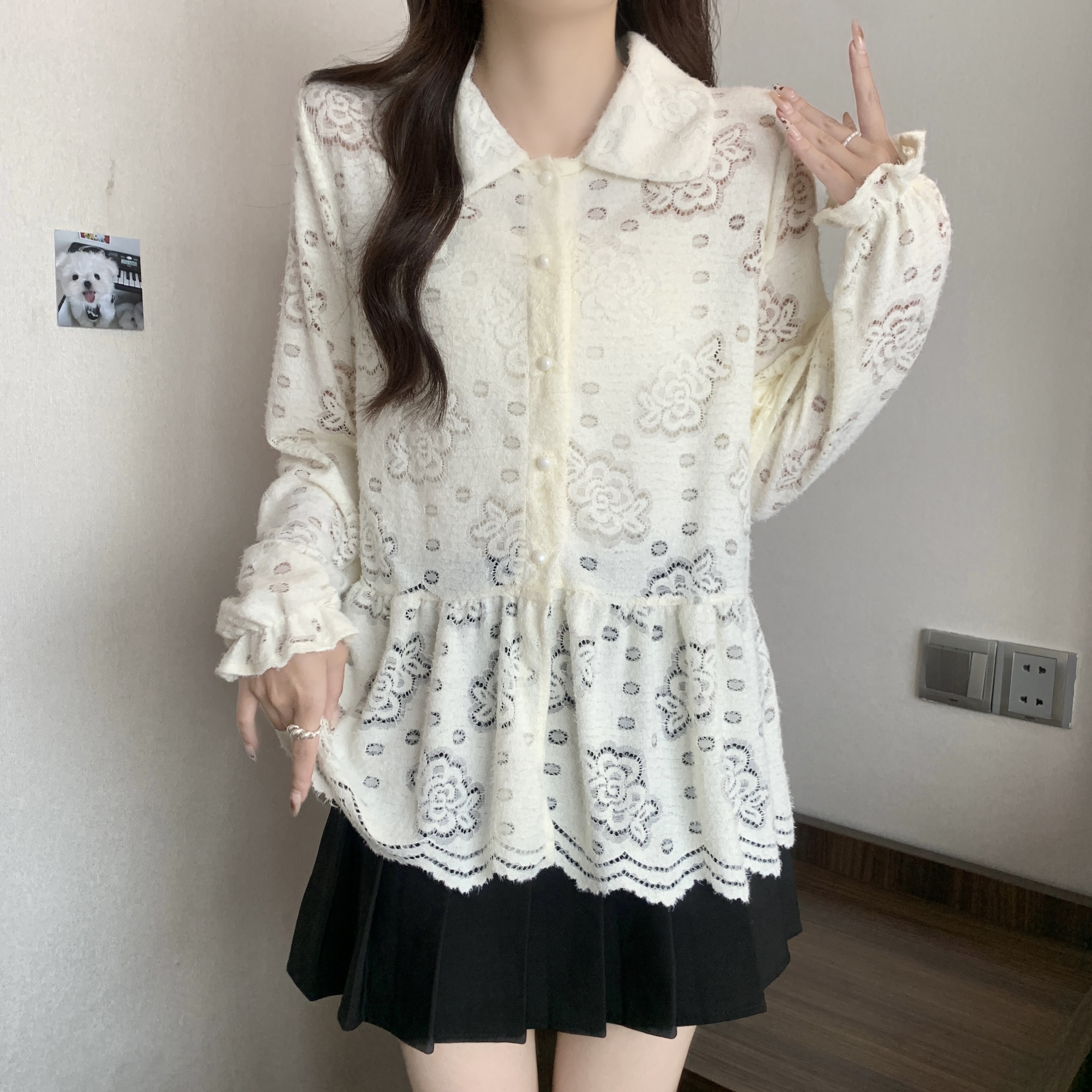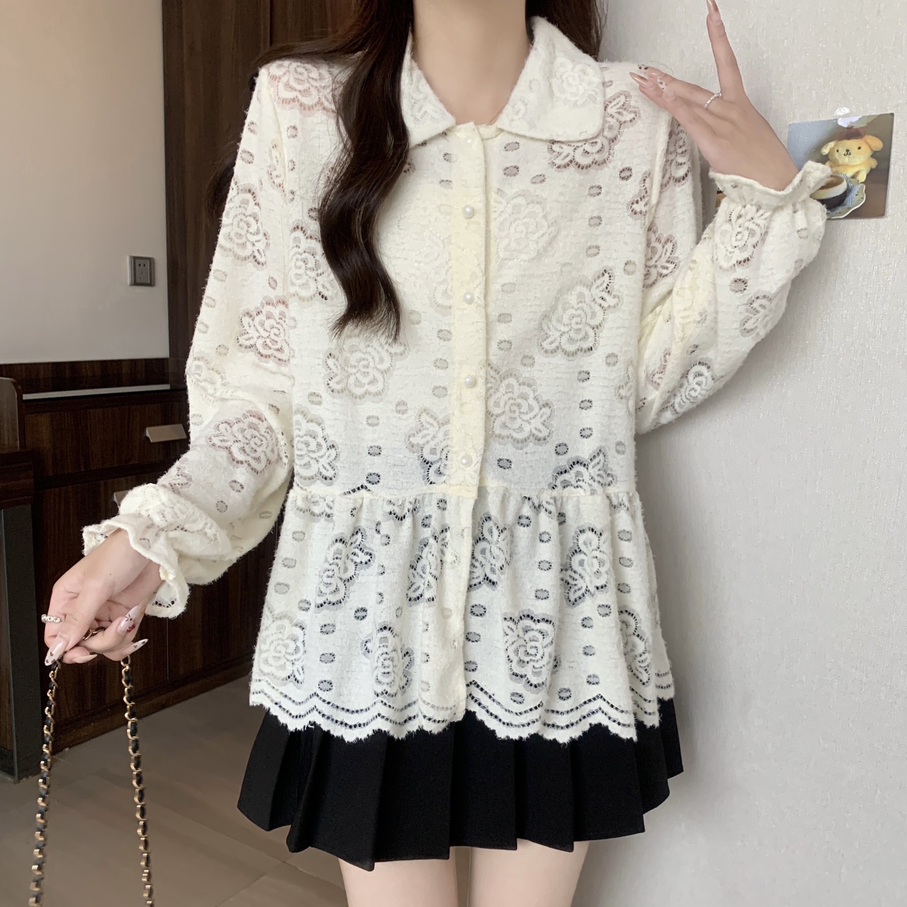 MY14564# 新款蕾丝长袖针织衬衫女娃娃领百搭宽松上衣女裝貨源服裝批發