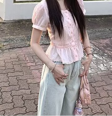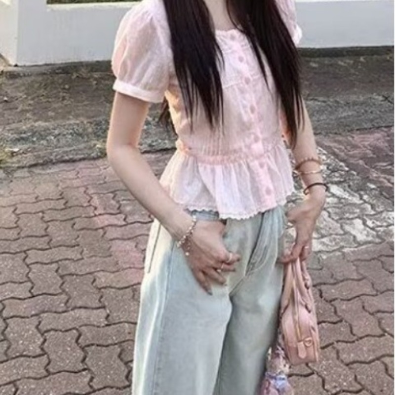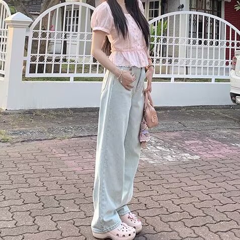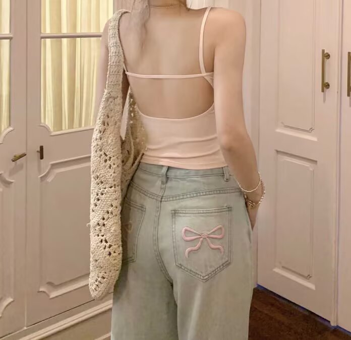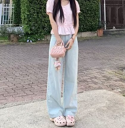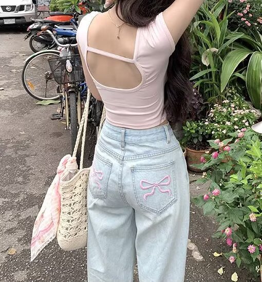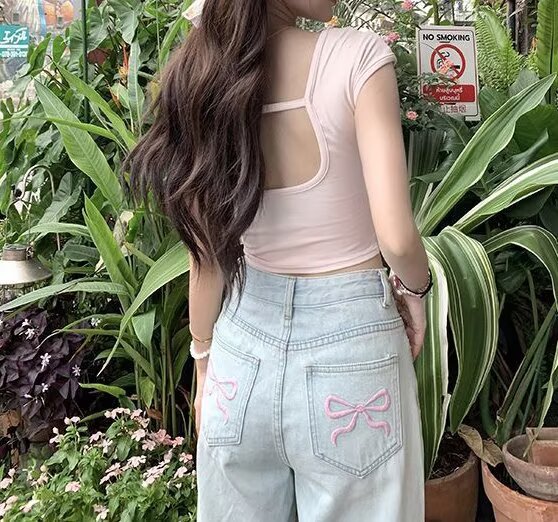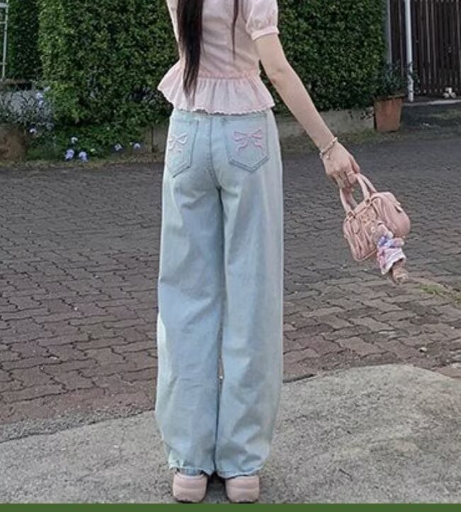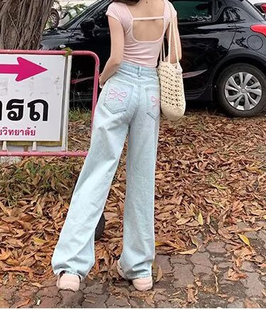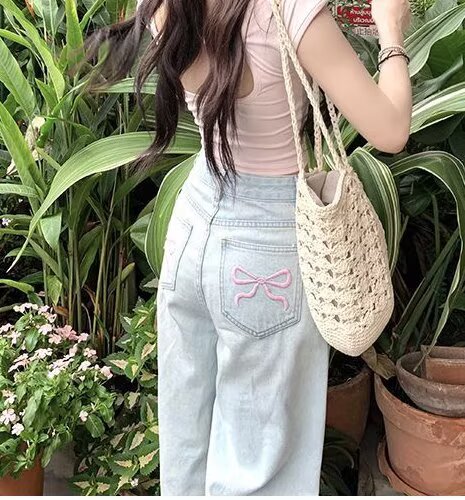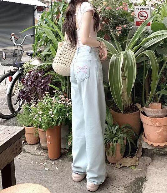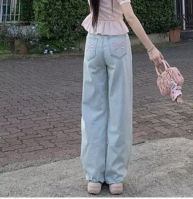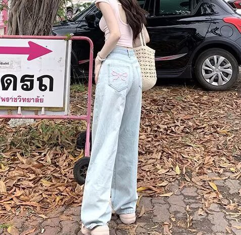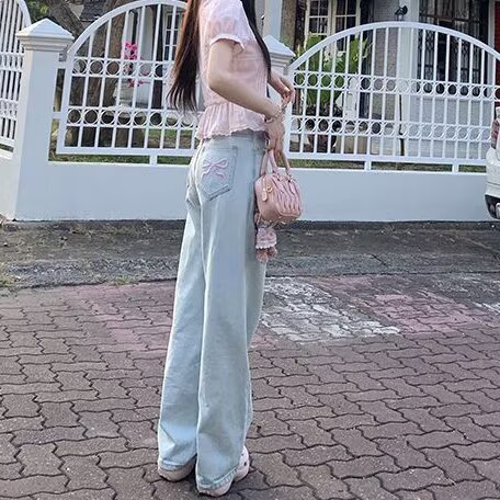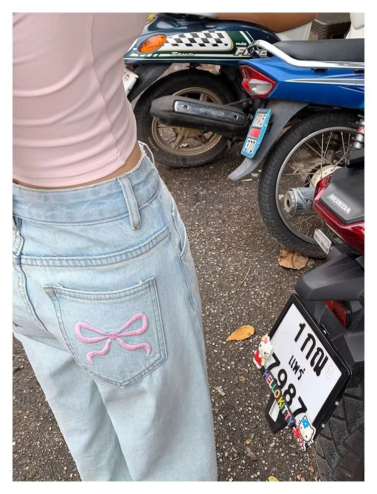 MY14589# 后口袋刺绣蝴蝶结牛仔裤新款高腰宽松直筒裤阔腿裤拖地裤女裝貨源服裝批發