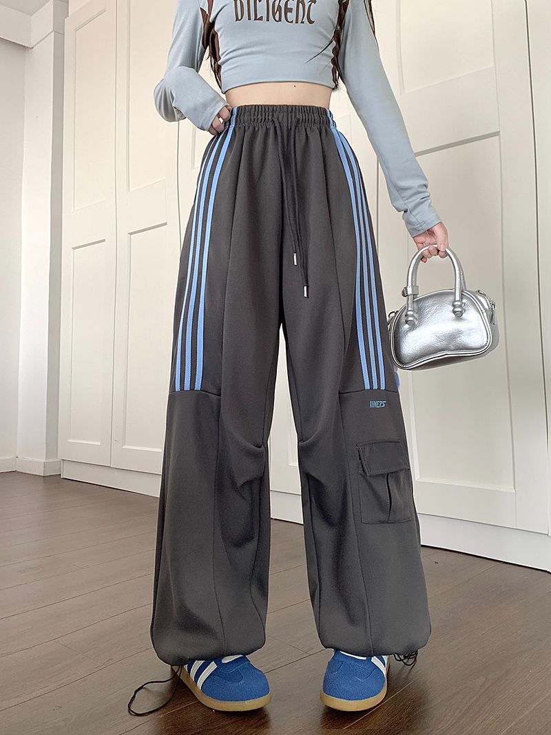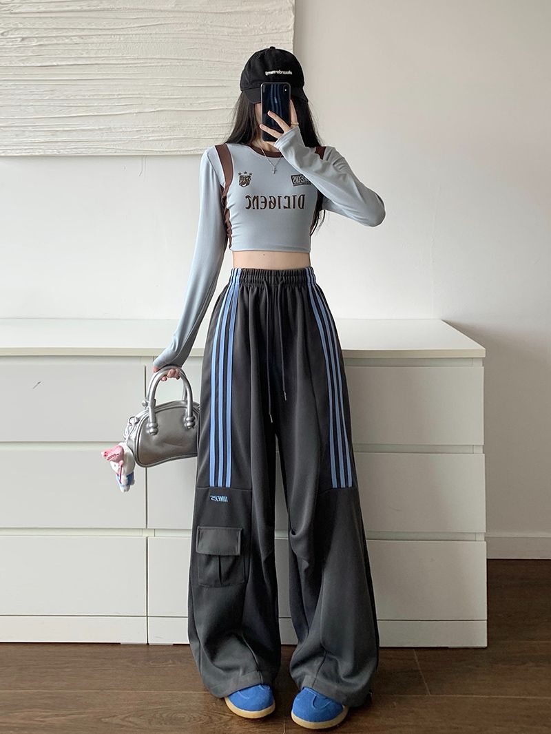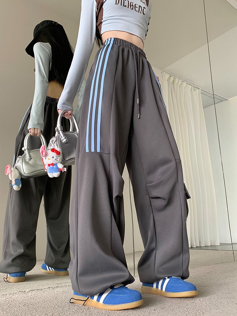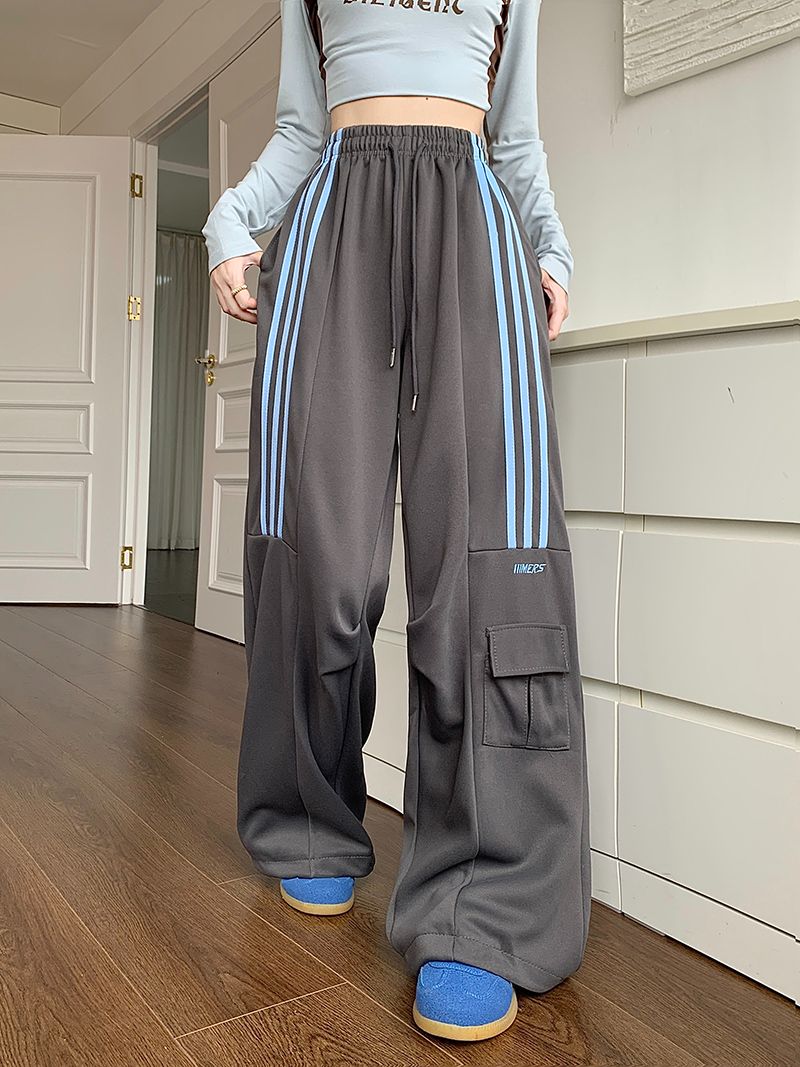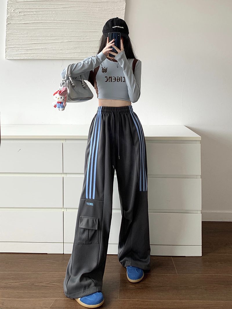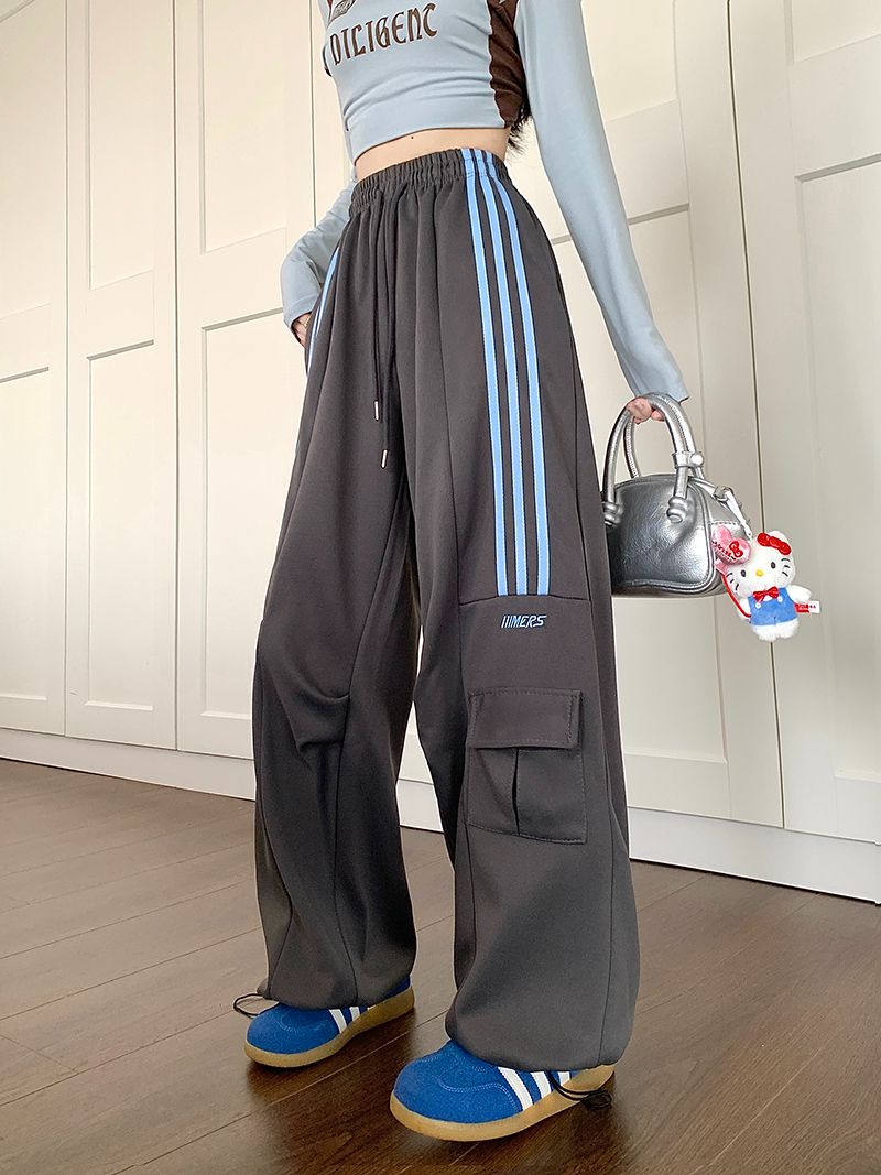 MY14965# 美式三条杠休闲运动裤男女多口袋阔腿工装卫裤女裝貨源服裝批發