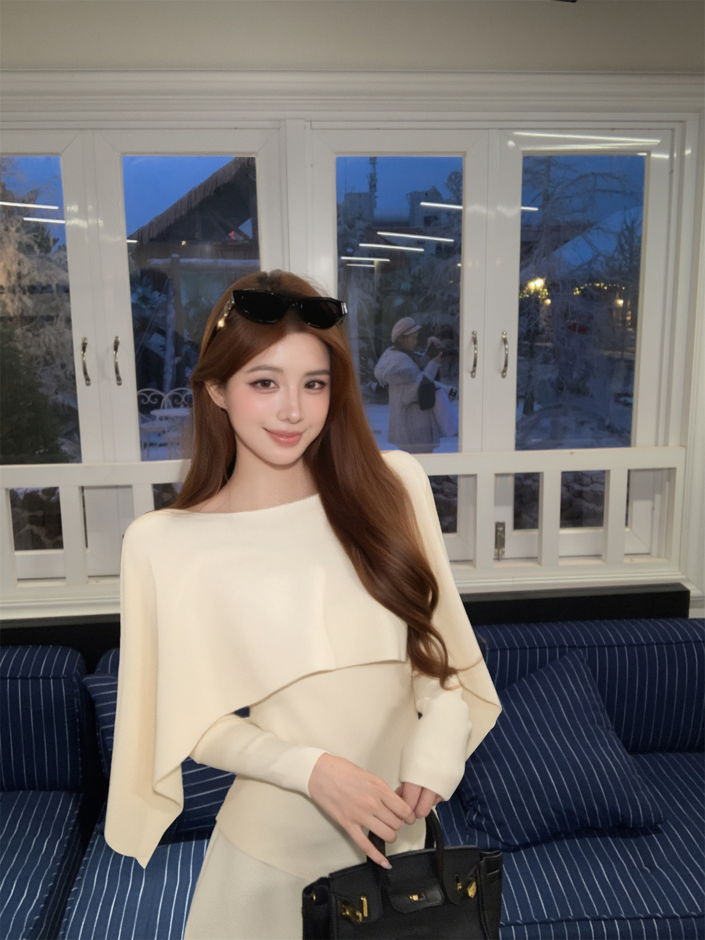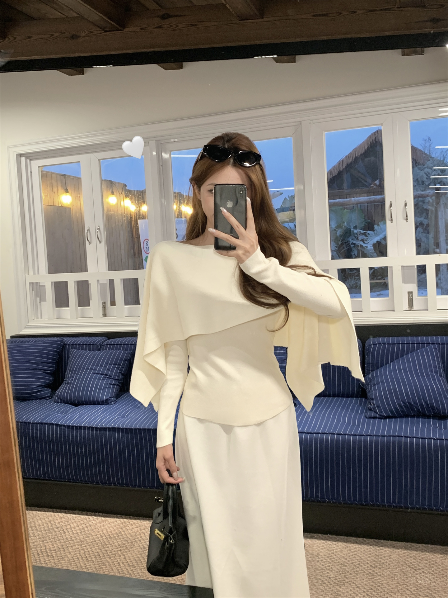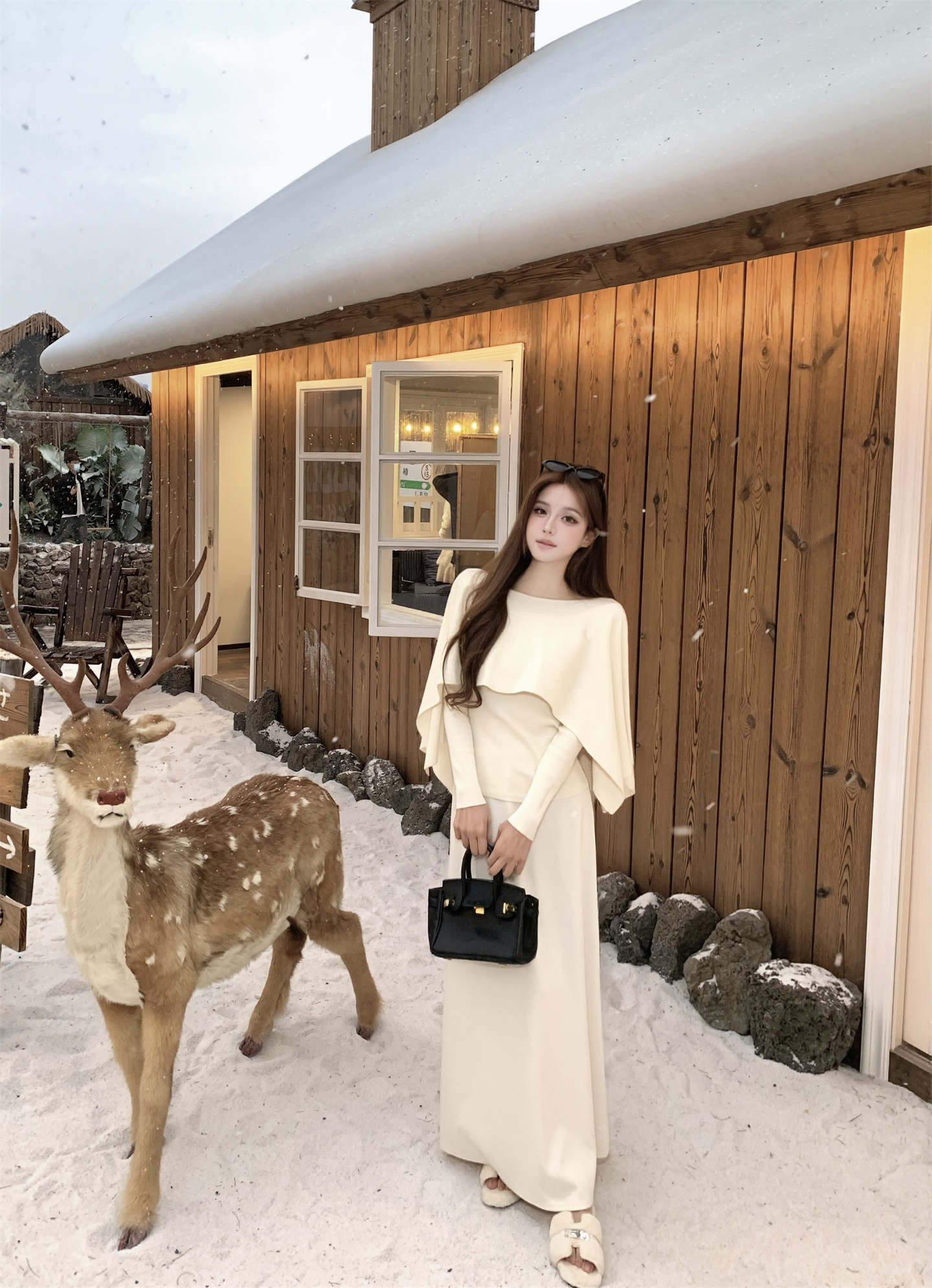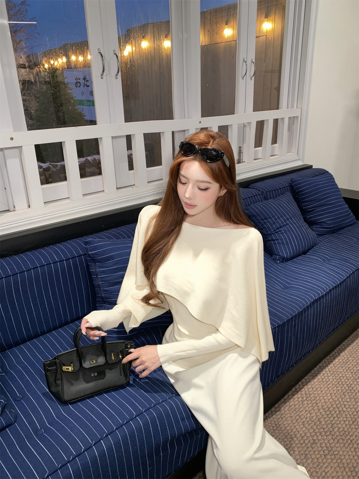 MY14970# 高级感千金斗篷披肩针织毛衣两件套+梨型身材遮肉长裙女裝貨源服裝批發