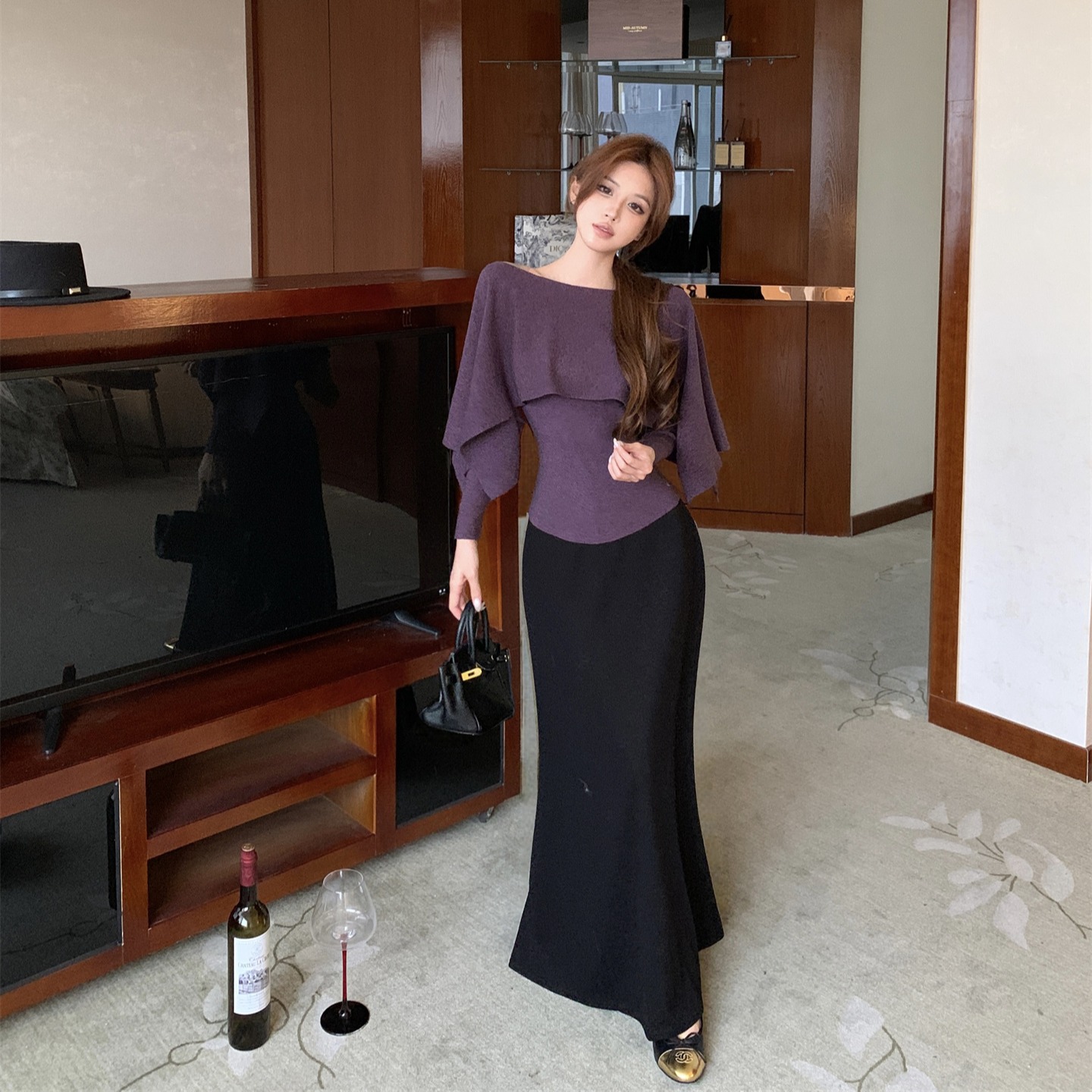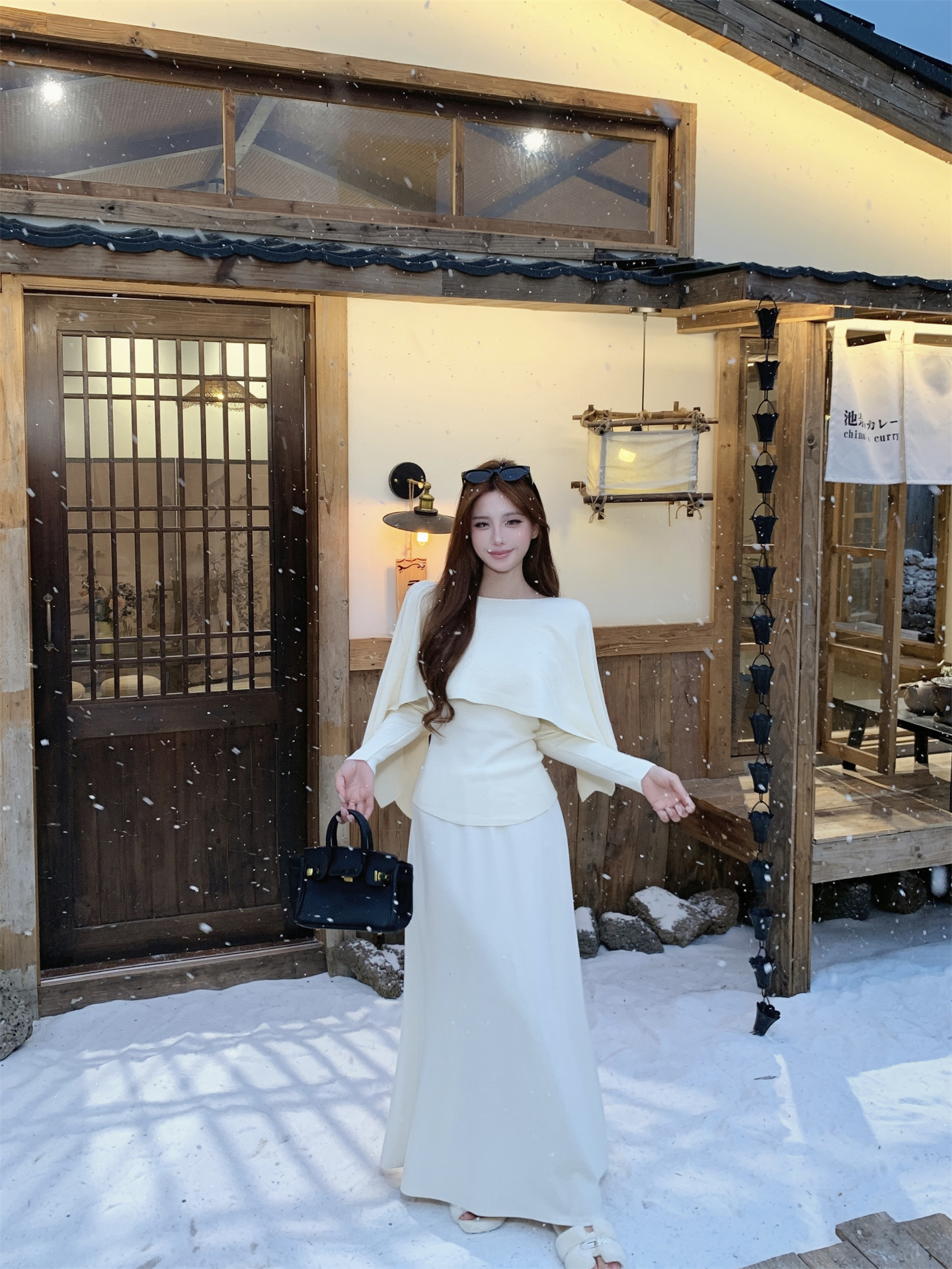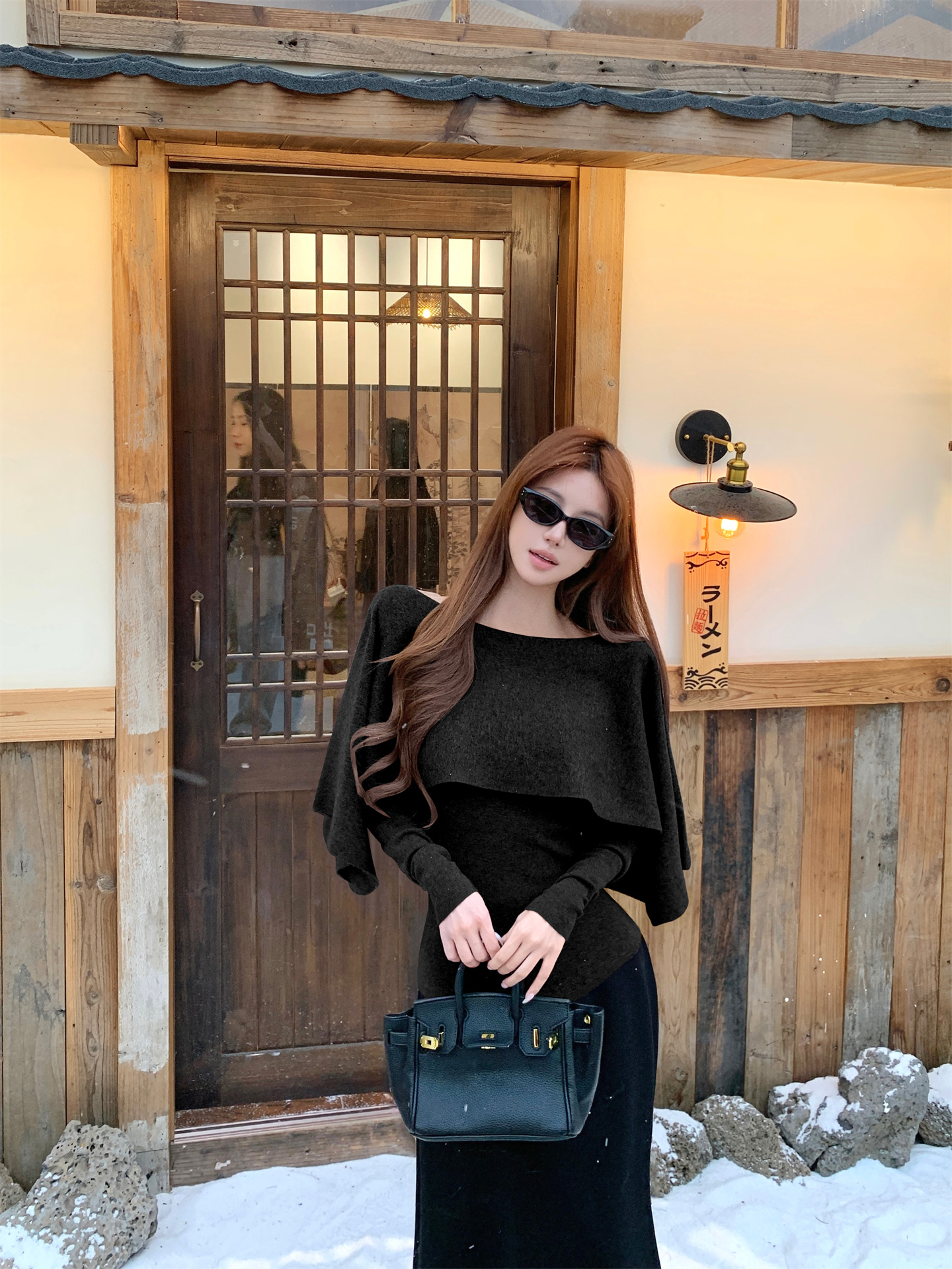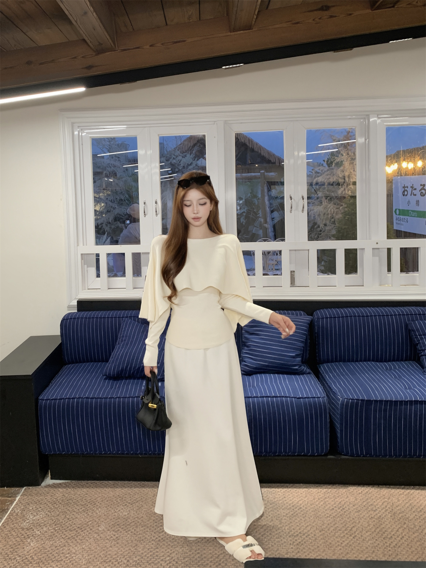MY14970# 高级感千金斗篷披肩针织毛衣两件套+梨型身材遮肉长裙女裝貨源服裝批發
