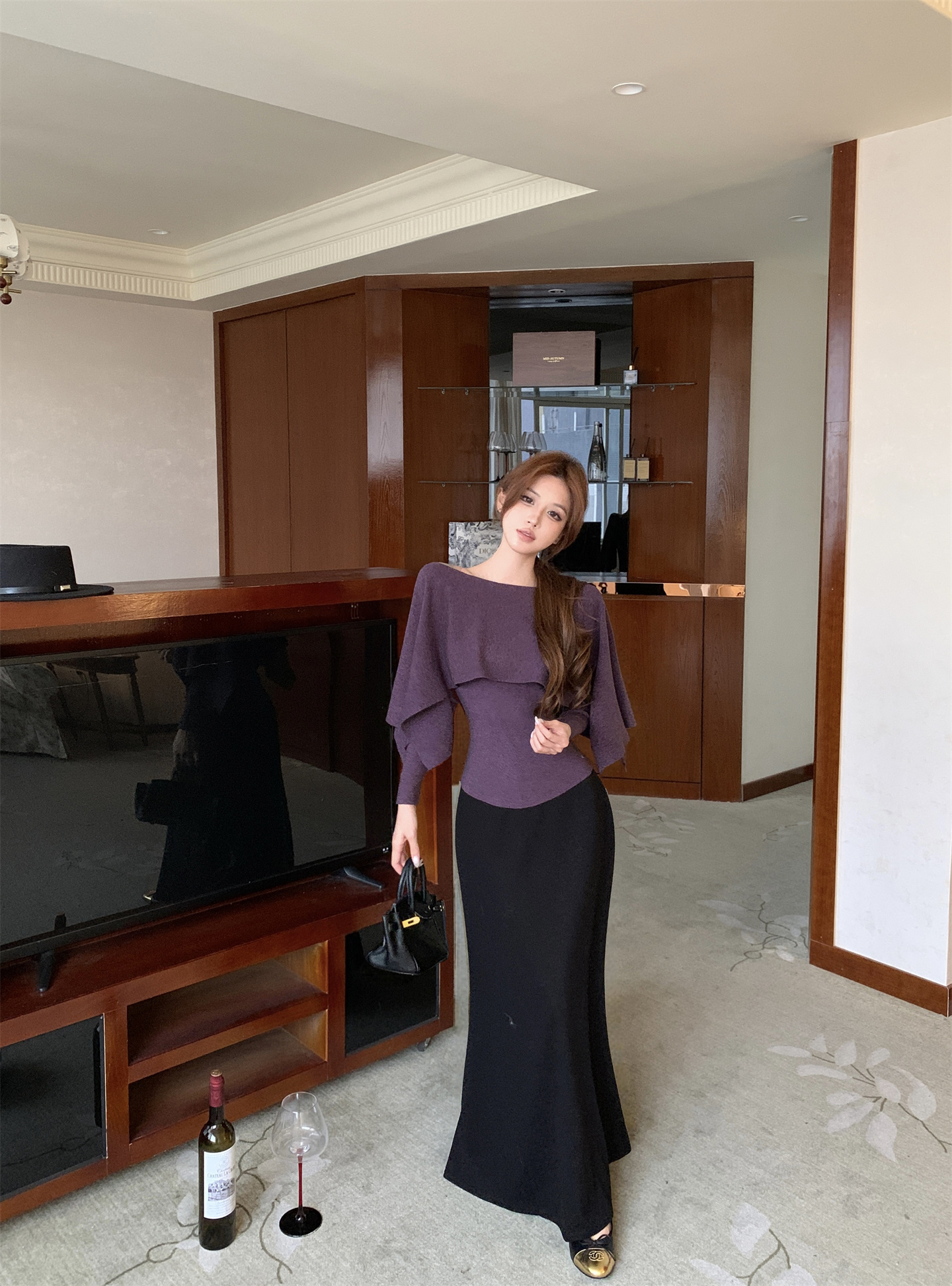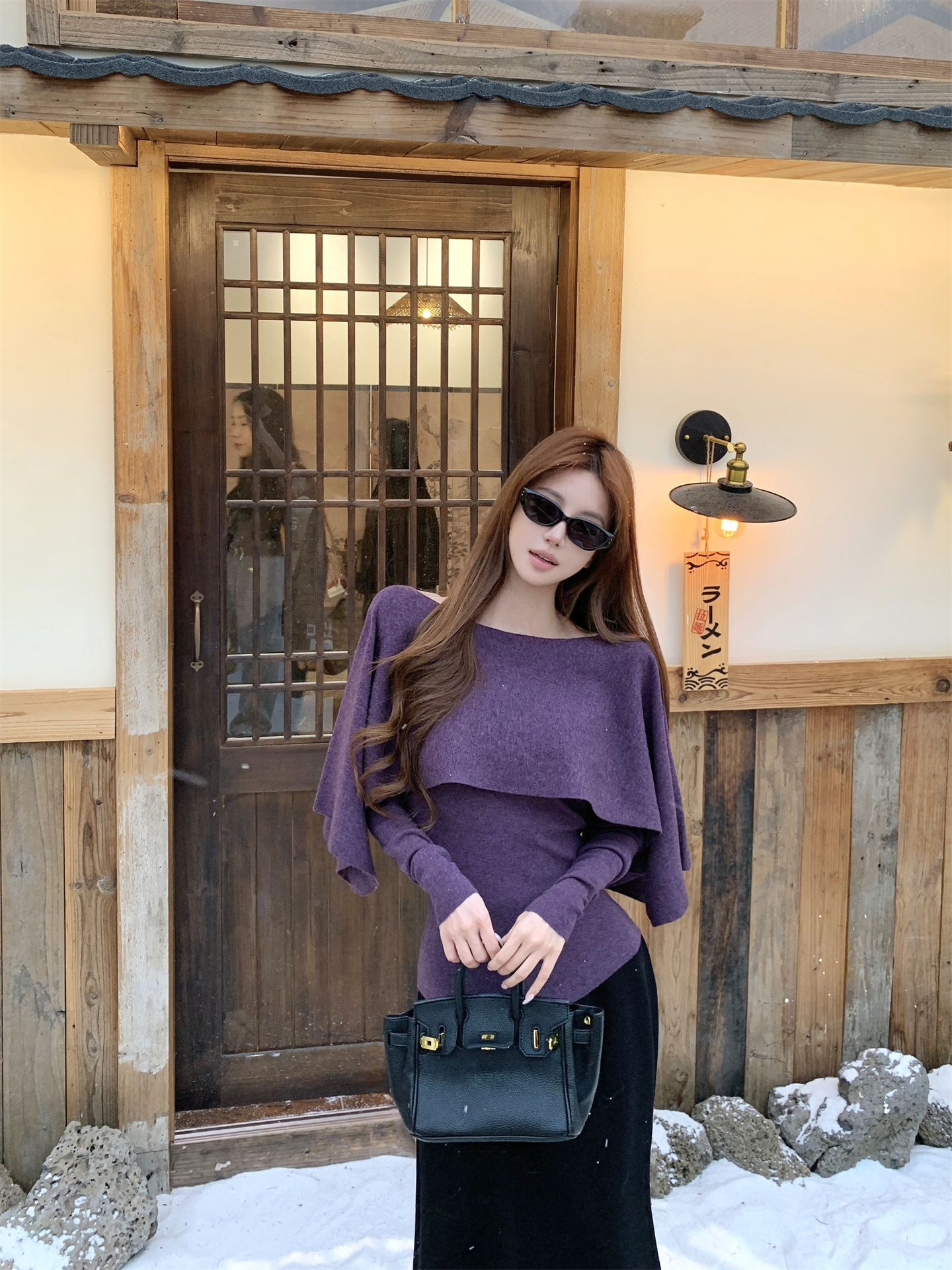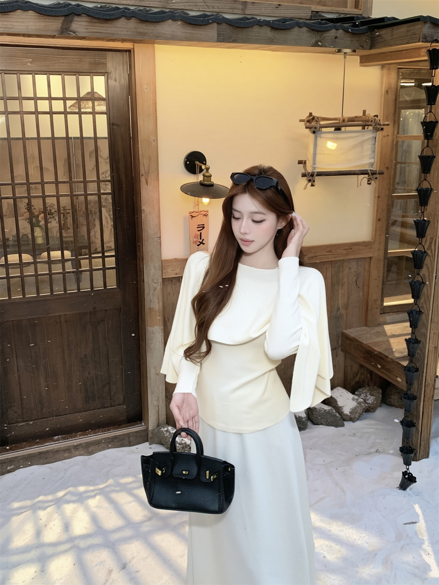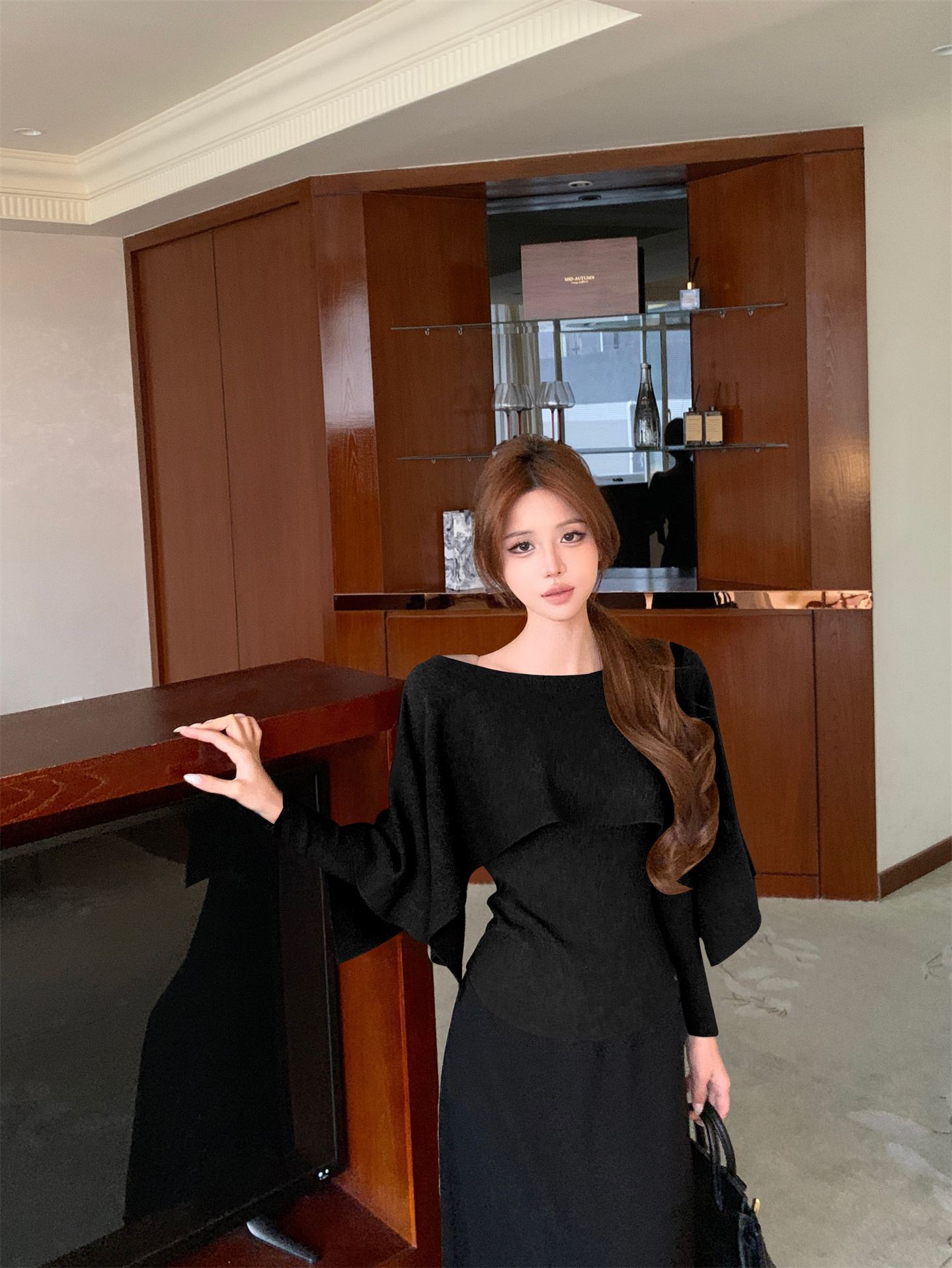 MY14970# 高级感千金斗篷披肩针织毛衣两件套+梨型身材遮肉长裙女裝貨源服裝批發