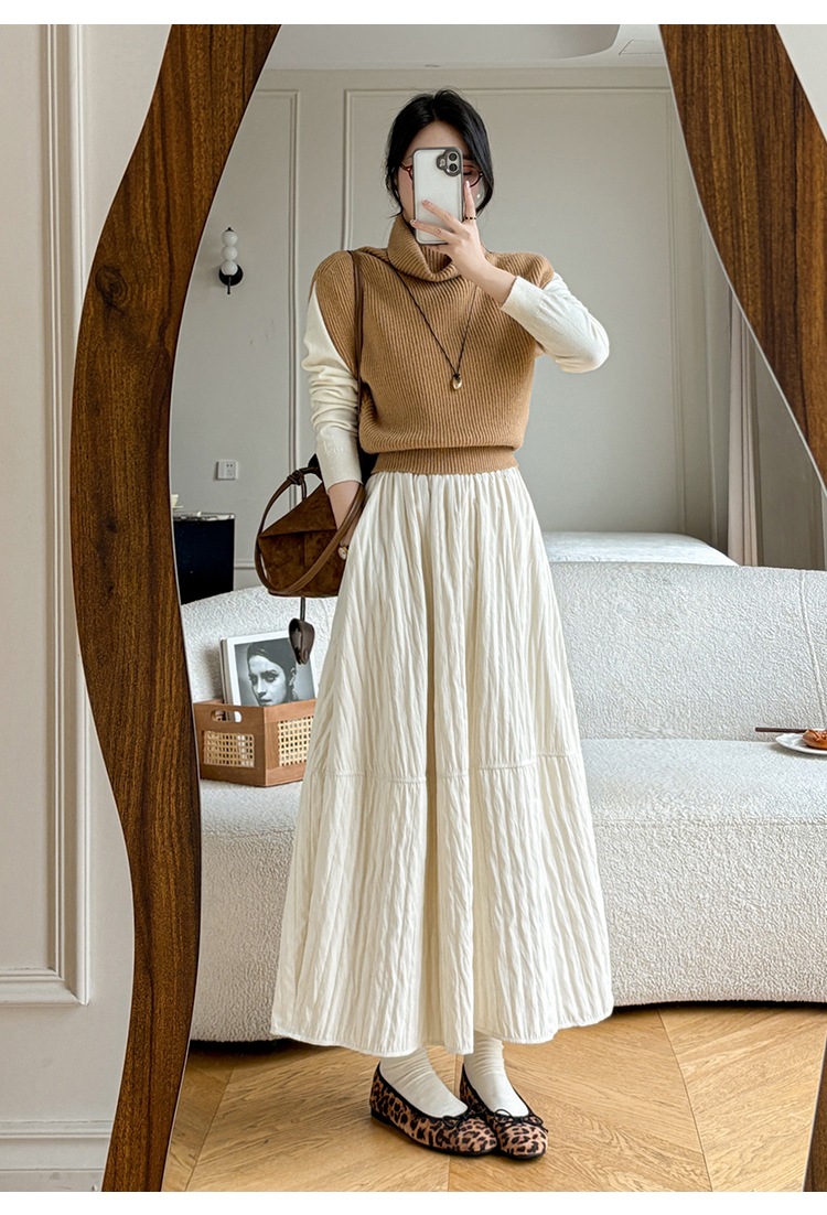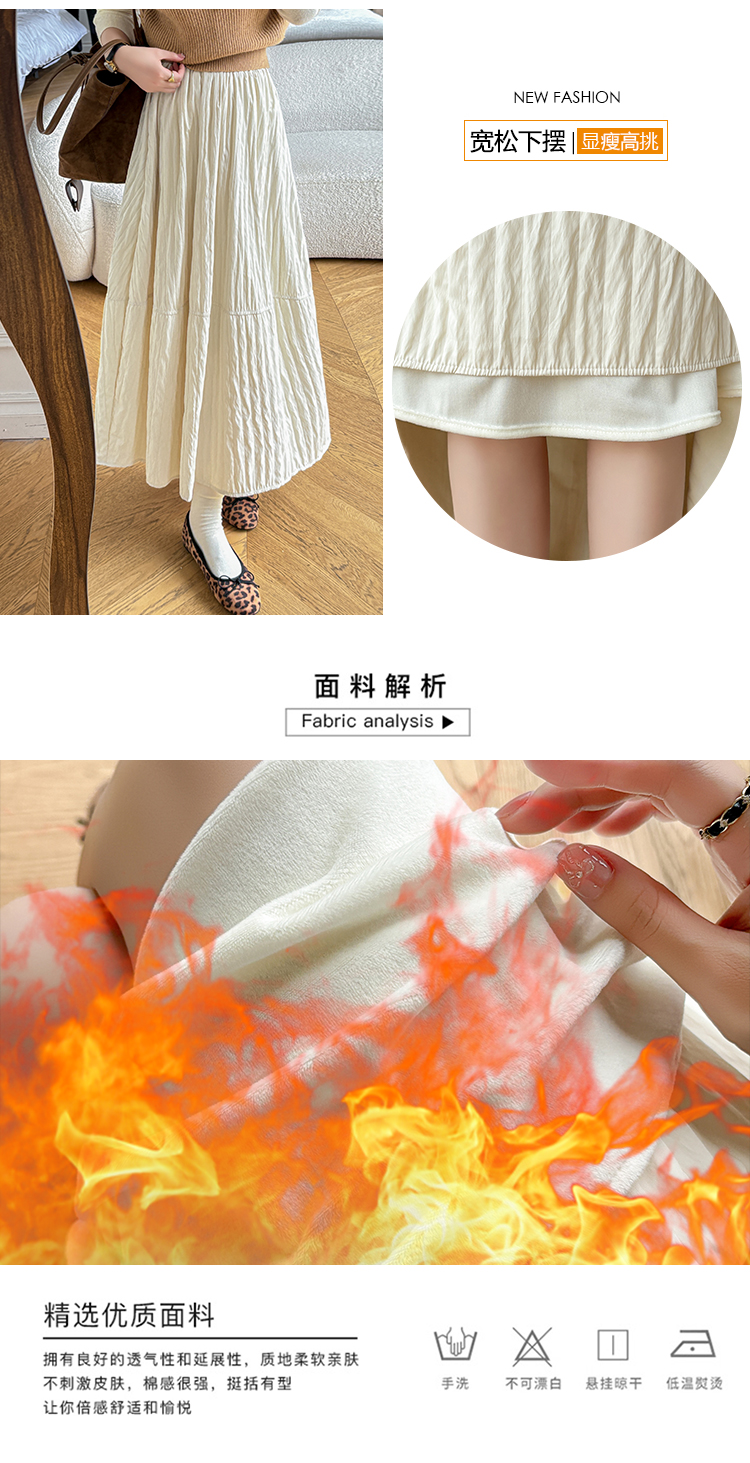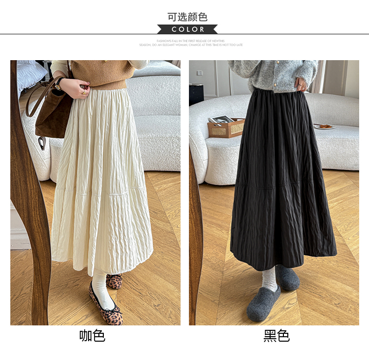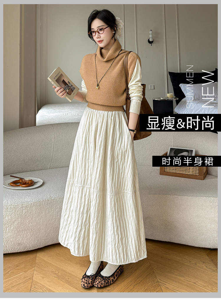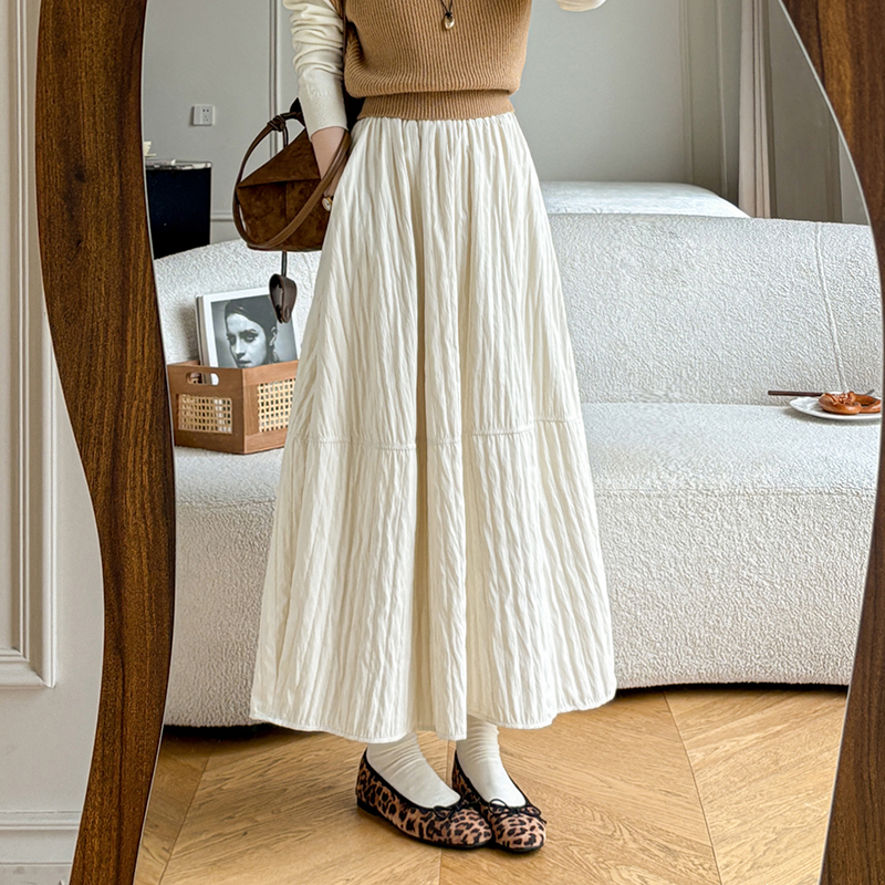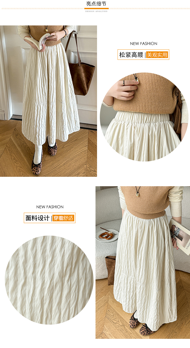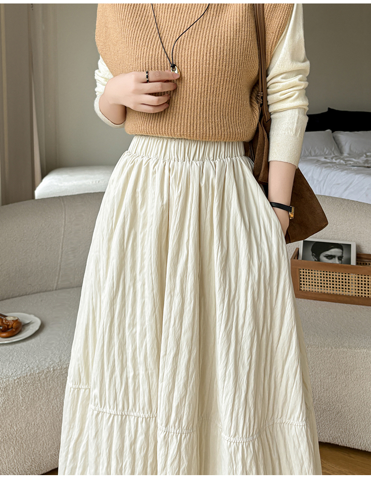 MY14991# 韩系新款白色夹棉工艺半身裙女松紧腰显瘦加绒中长裙口袋a字伞裙女裝貨源服裝批發