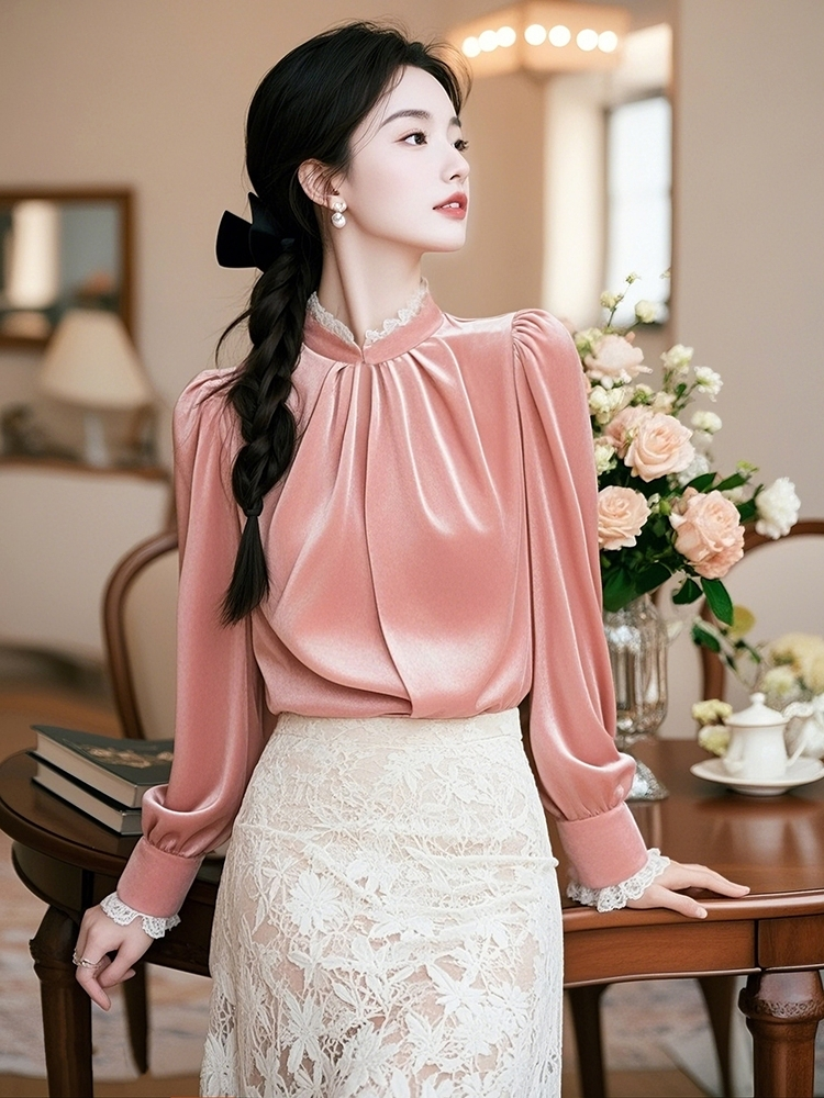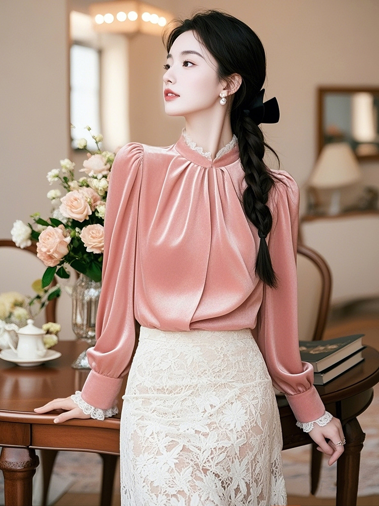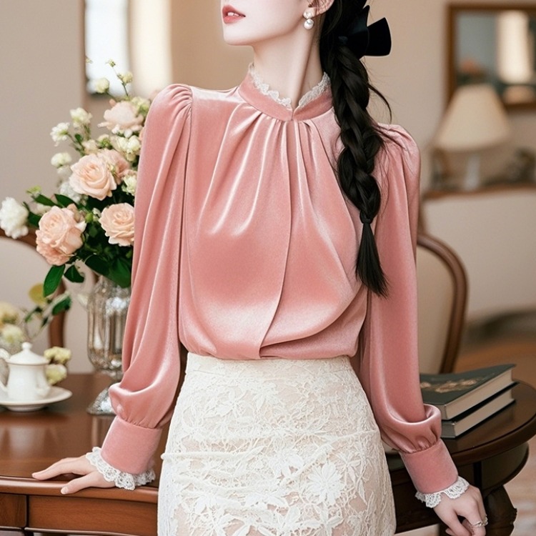MY15006# 新款独特设计感小众上衣气质高级感粉色丝绒衬衫女女裝貨源服裝批發