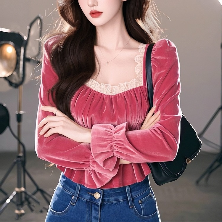 MY15007# 新款韩系chic气质上衣玫粉色蕾丝边丝绒长袖衬衫女女裝貨源服裝批發