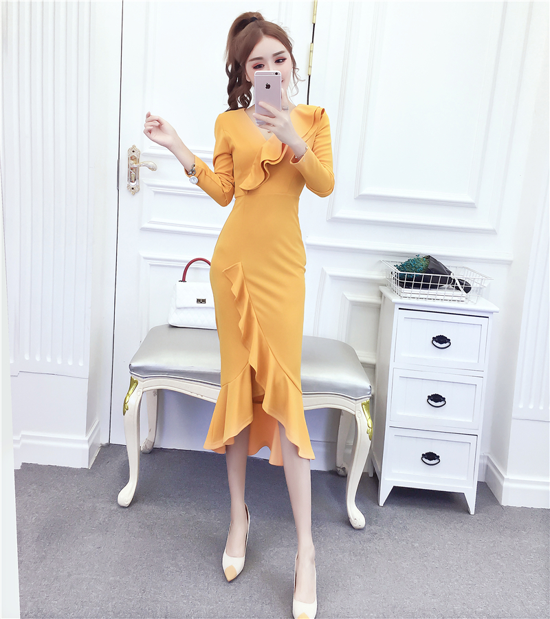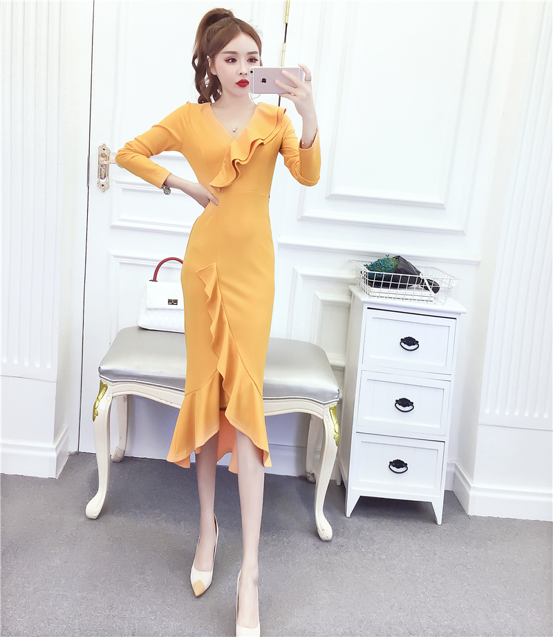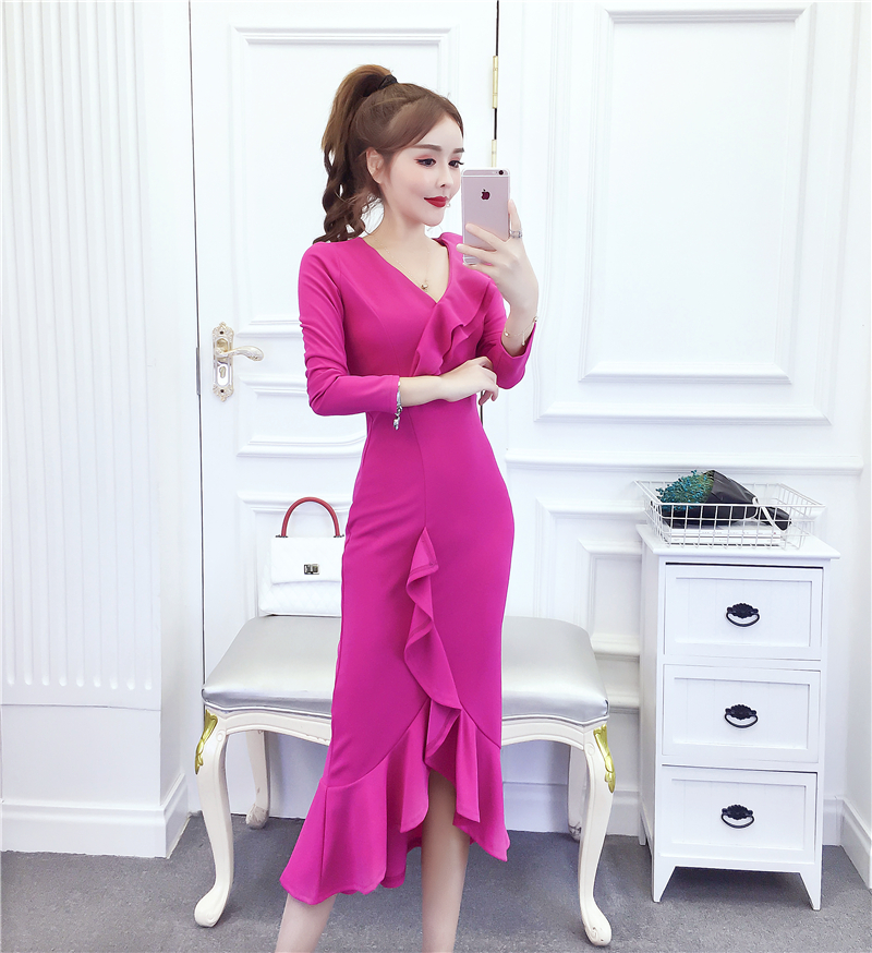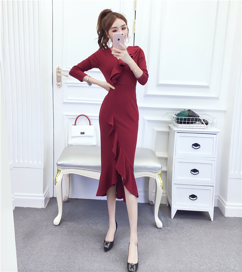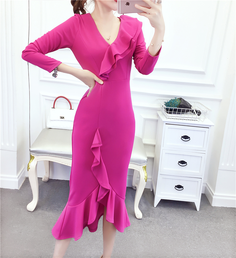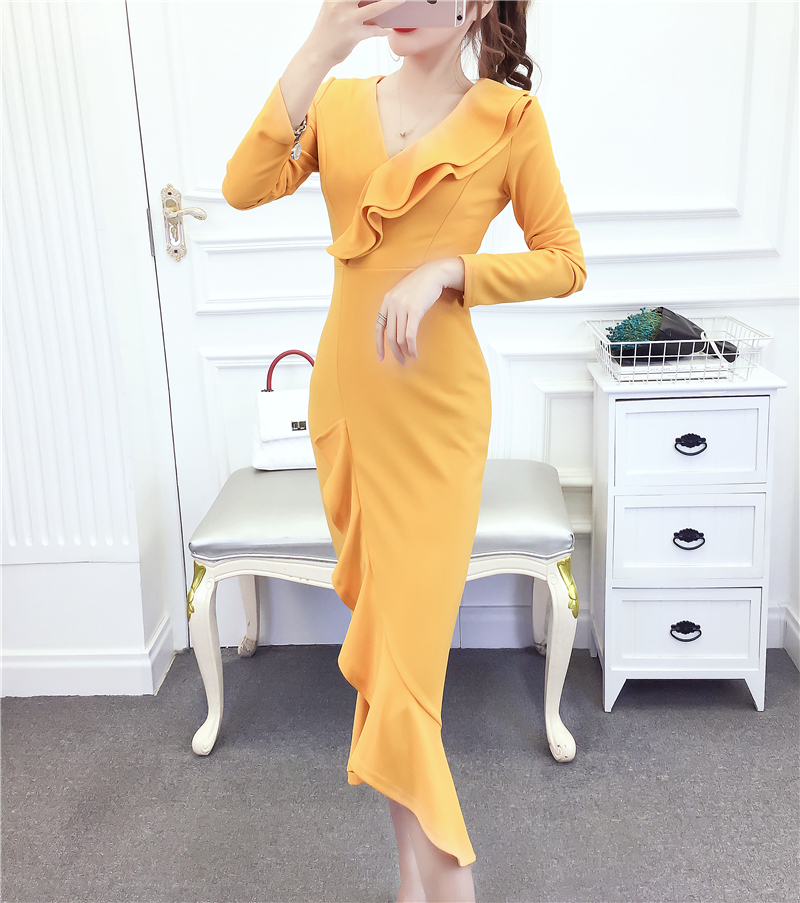 MY15036# 时尚气质v领荷叶边礼服长裙不规则包臀连衣裙女裝貨源服裝批發