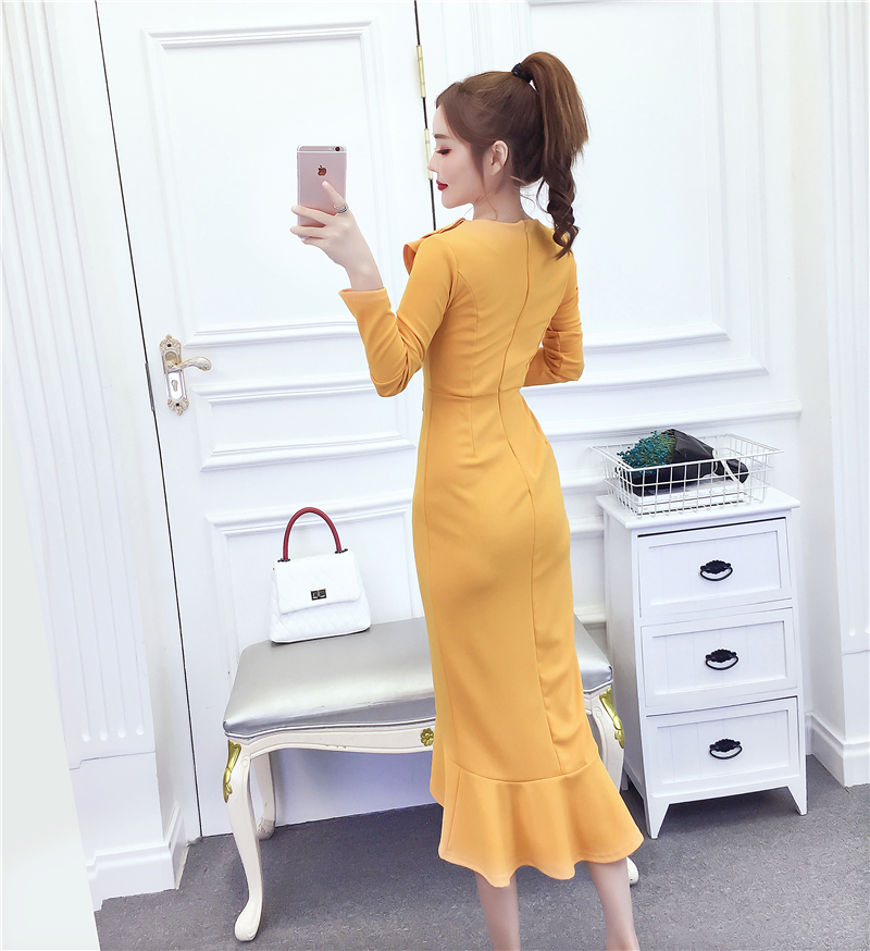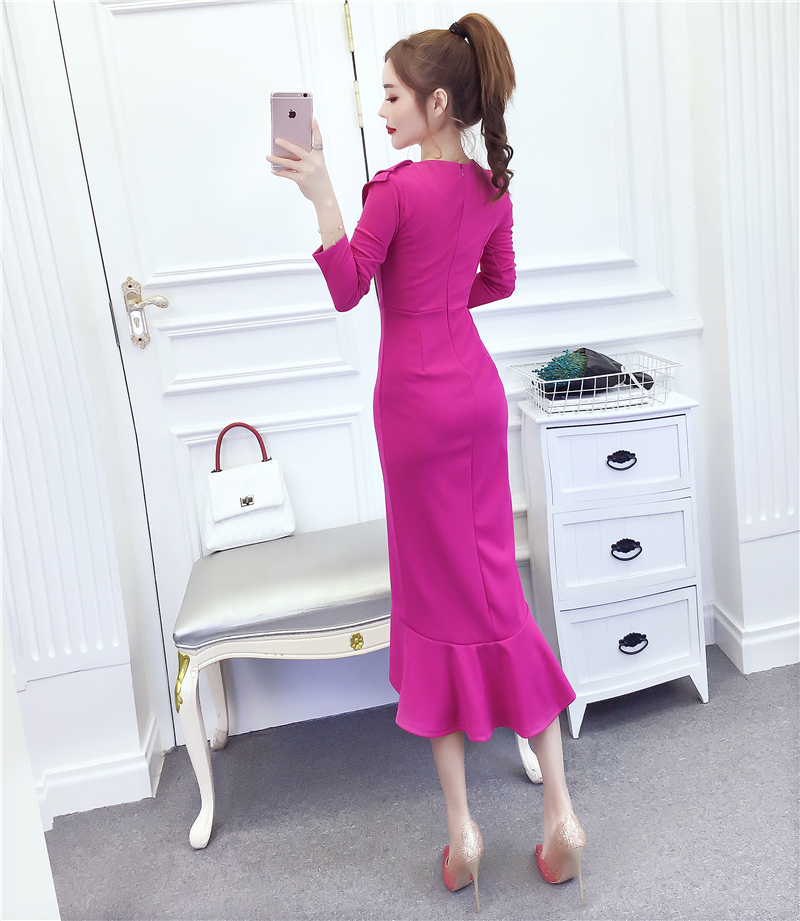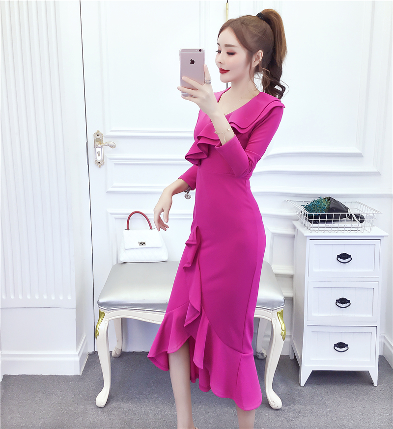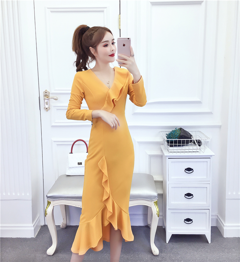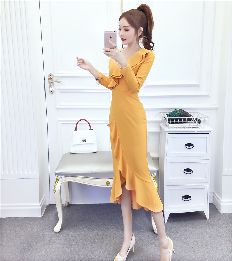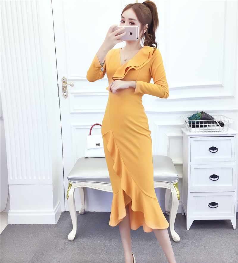 MY15036# 时尚气质v领荷叶边礼服长裙不规则包臀连衣裙女裝貨源服裝批發