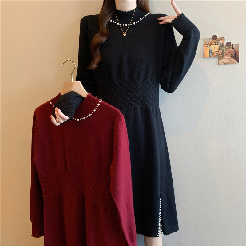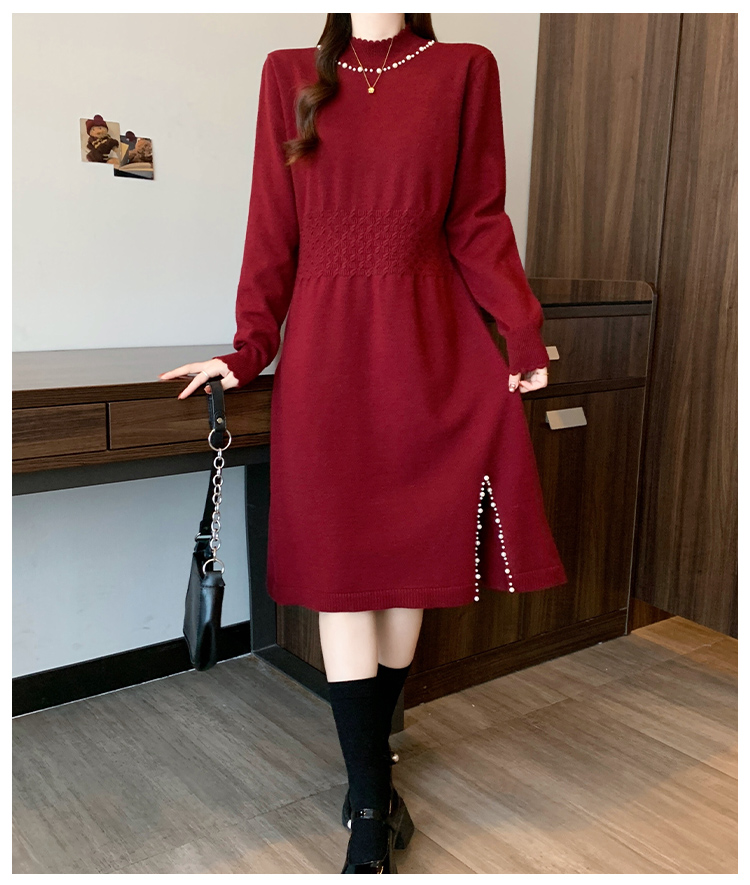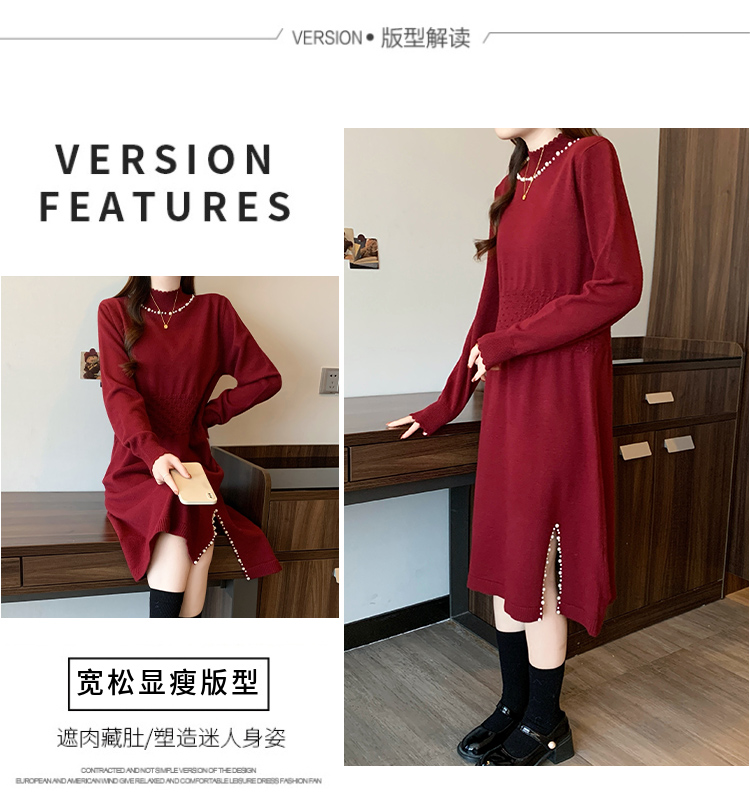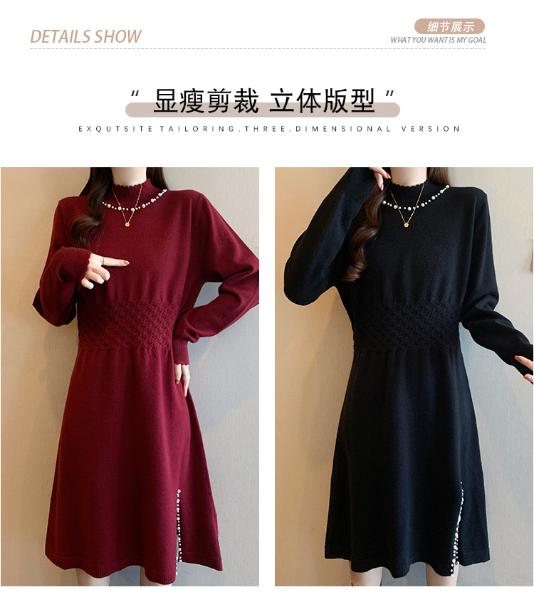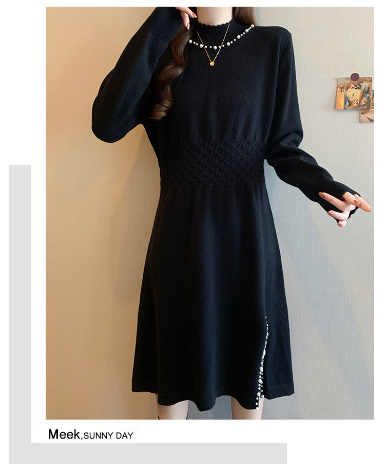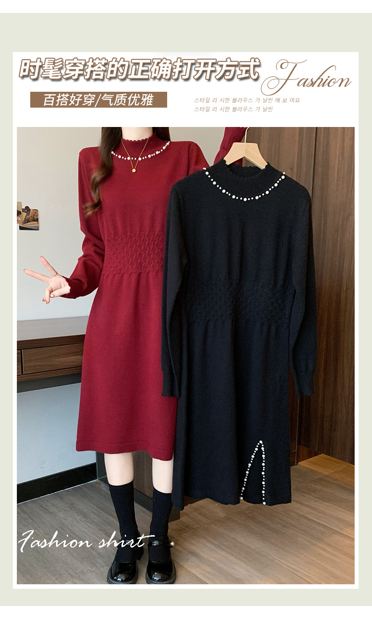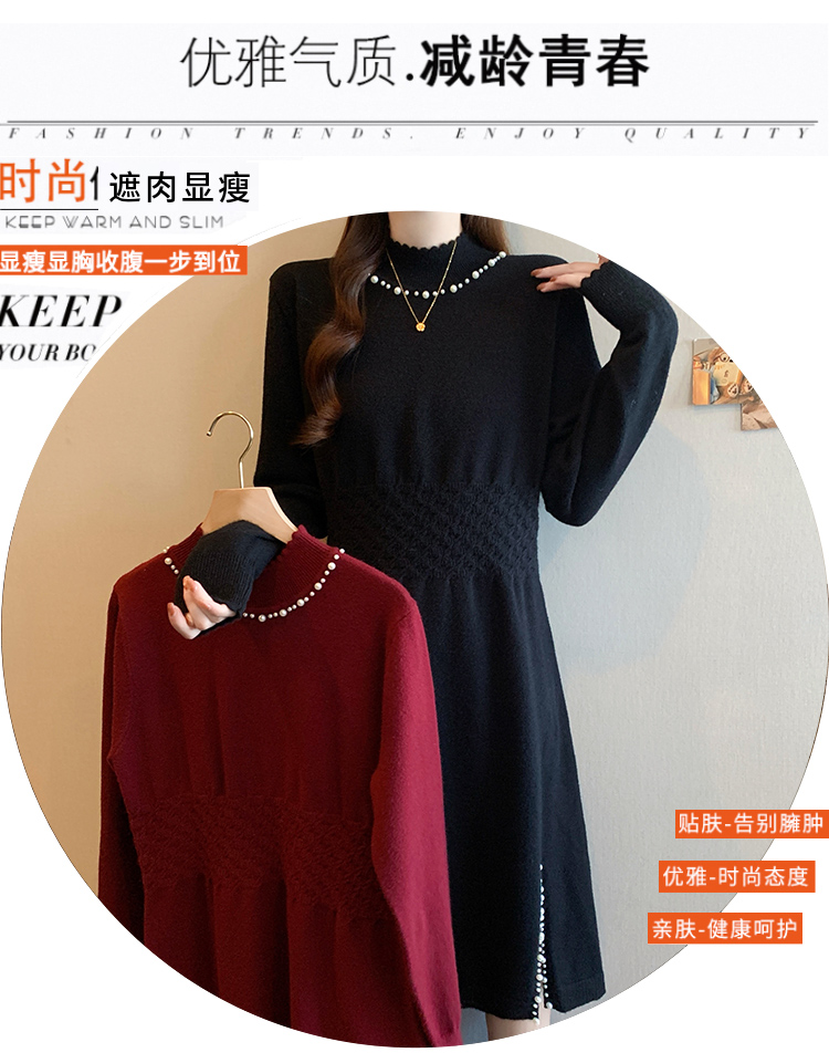 MY15038# 新款大码女装胖mm中长款针织钉珠A字打底开叉连衣裙女裝貨源服裝批發