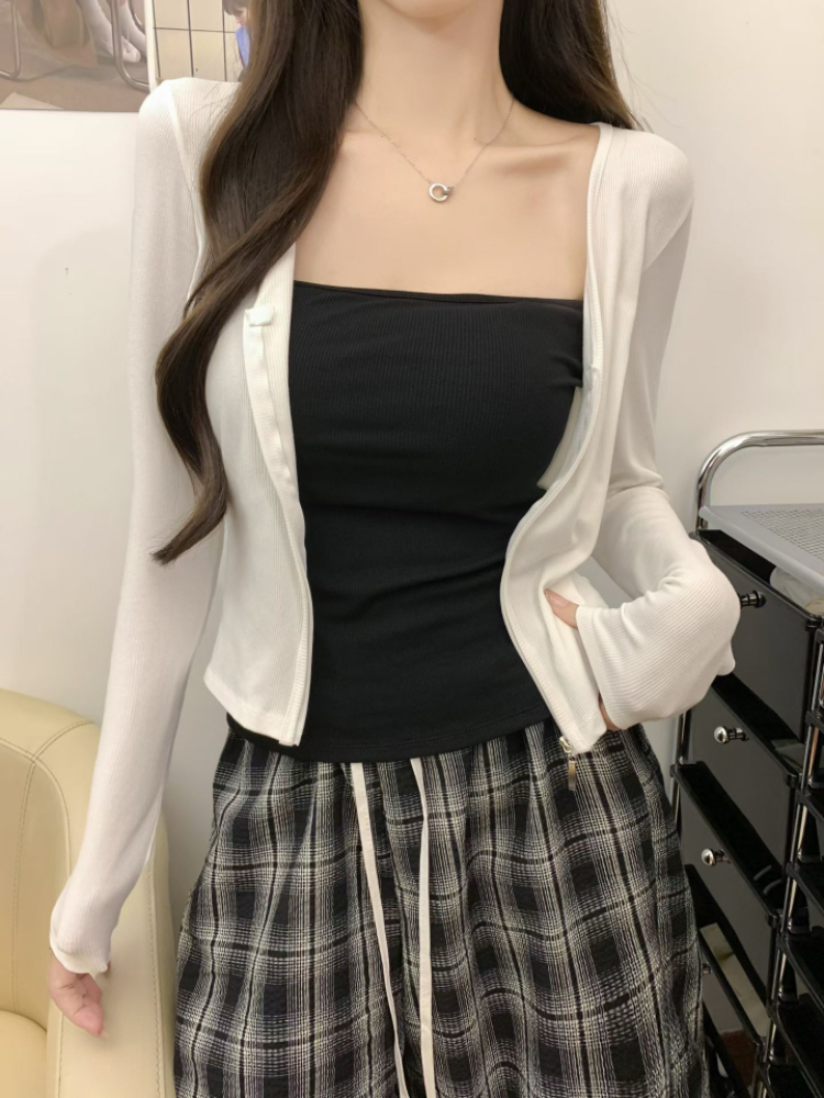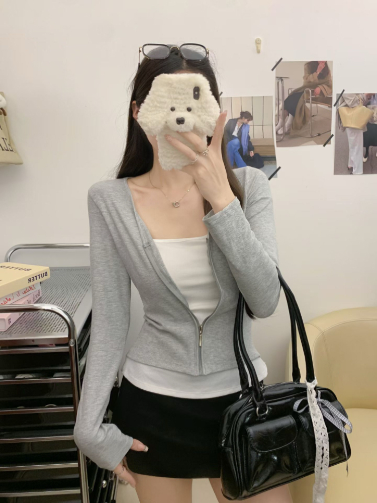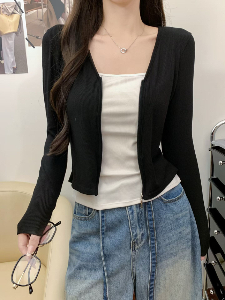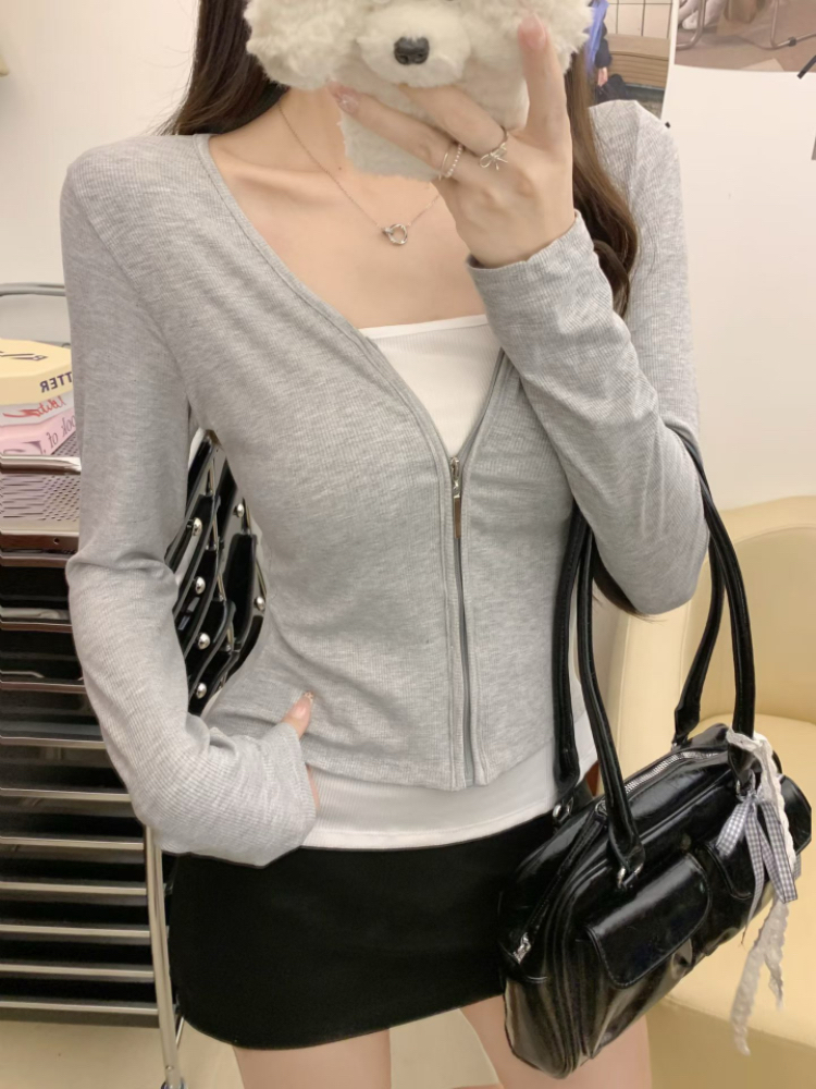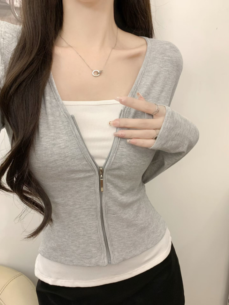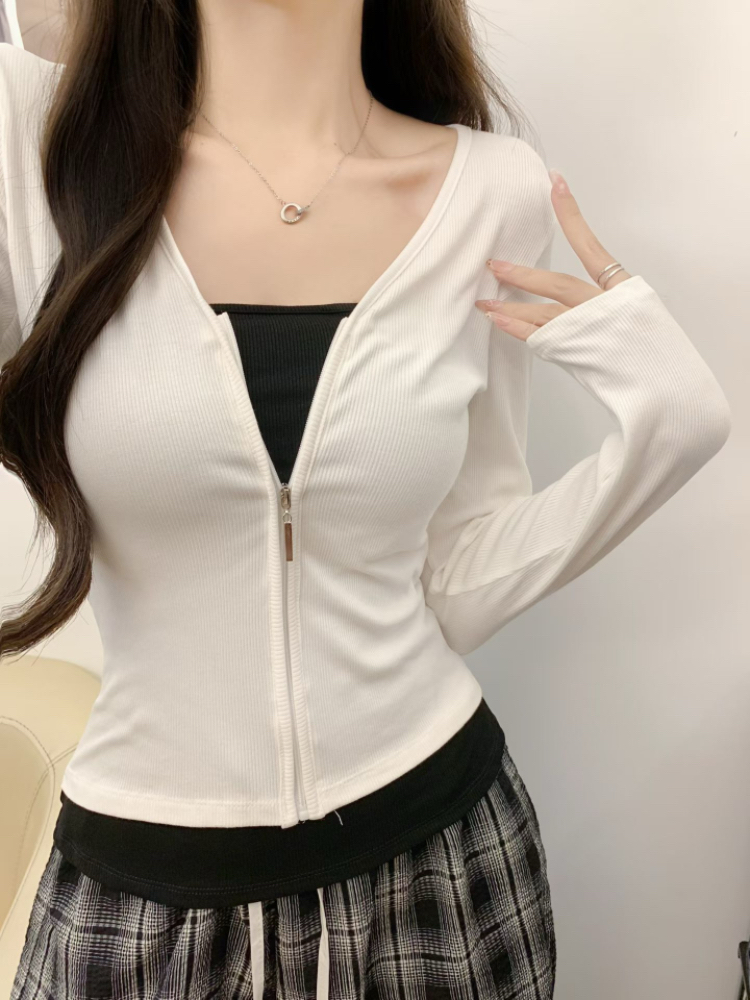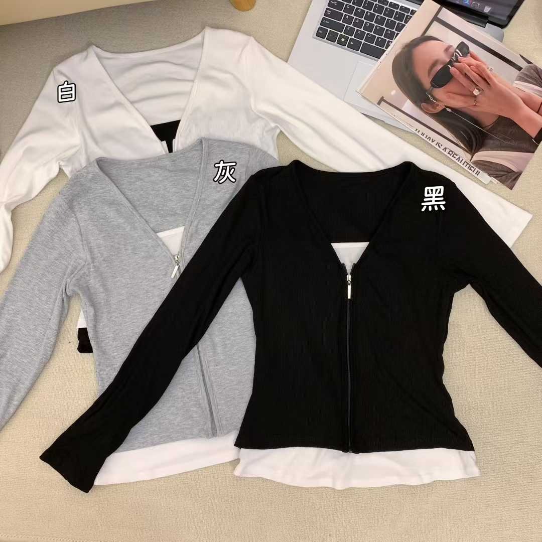 MY15041# 韩系半开领拼接假两件长袖V领T恤拉链上衣女裝貨源服裝批發