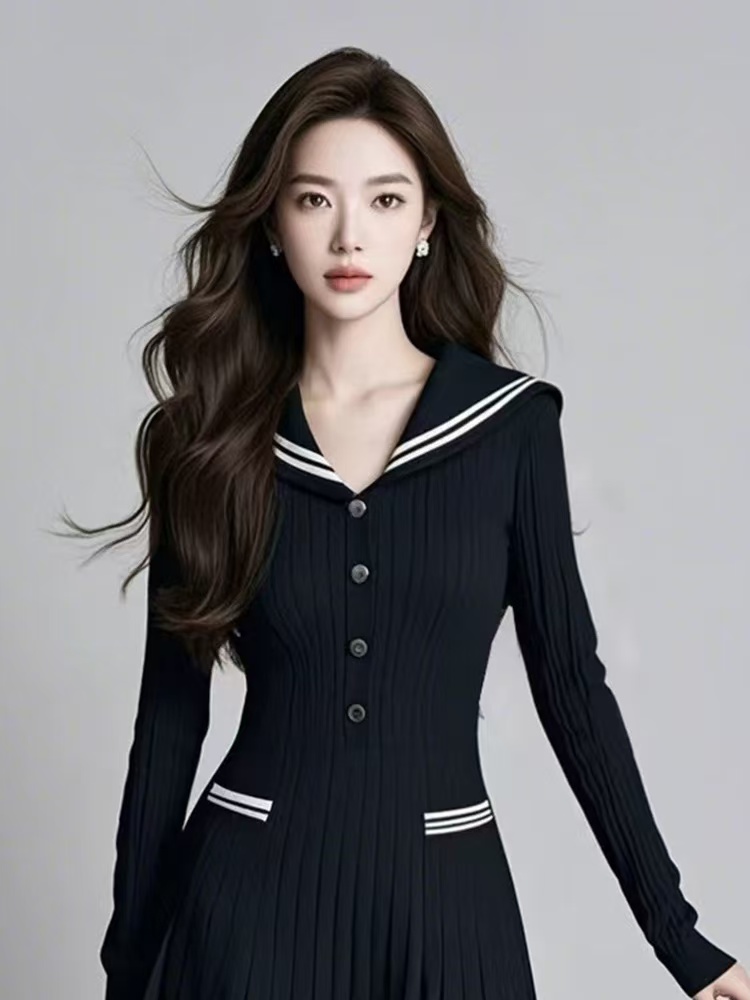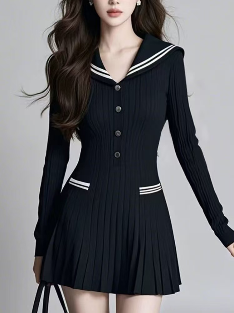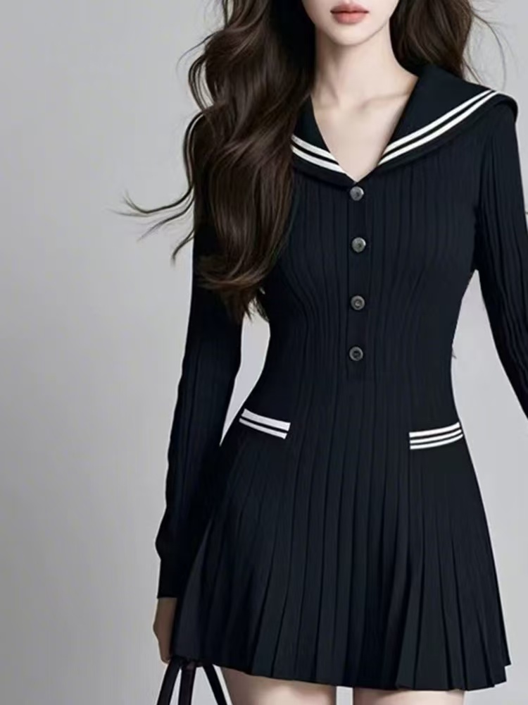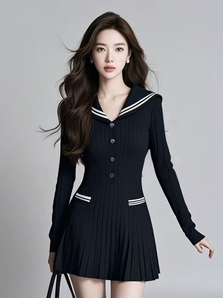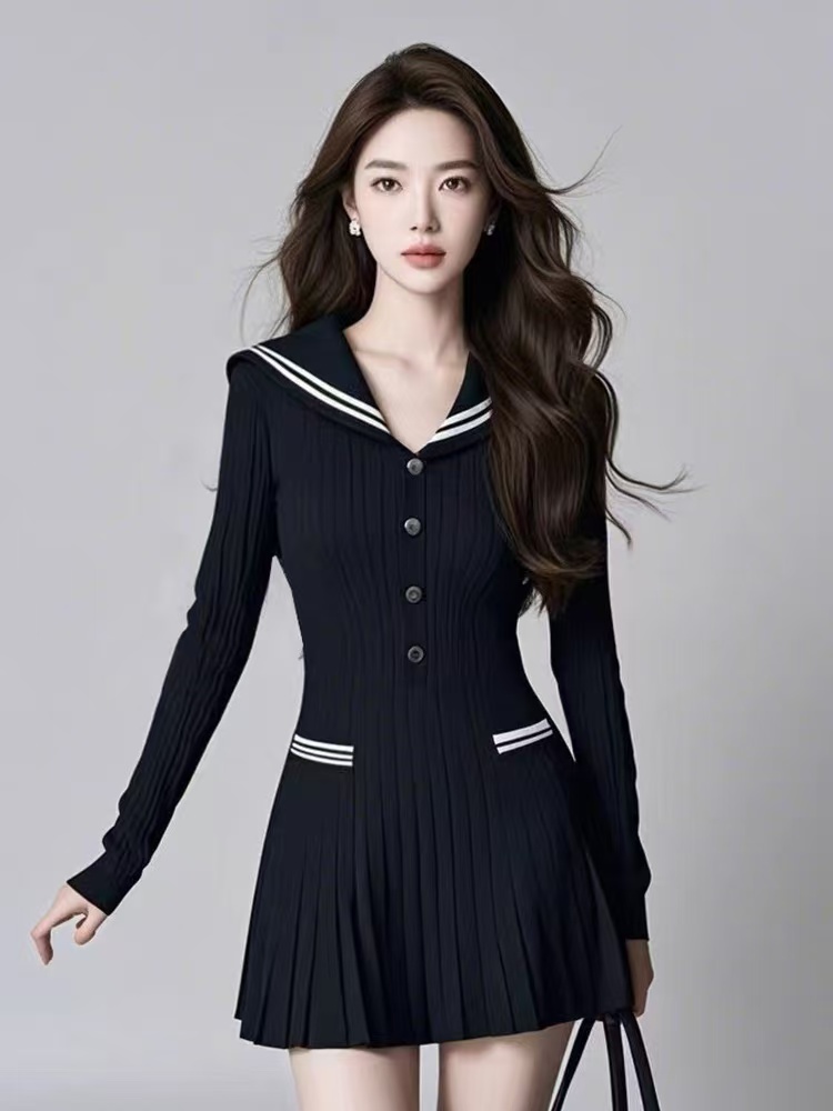 MY15054# 法式黑色海军领针织连衣裙新款名媛高端小洋装毛衣裙子女裝貨源服裝批發
