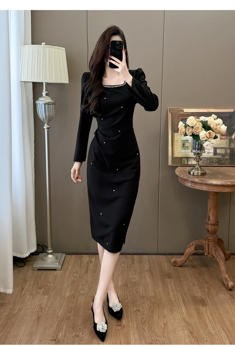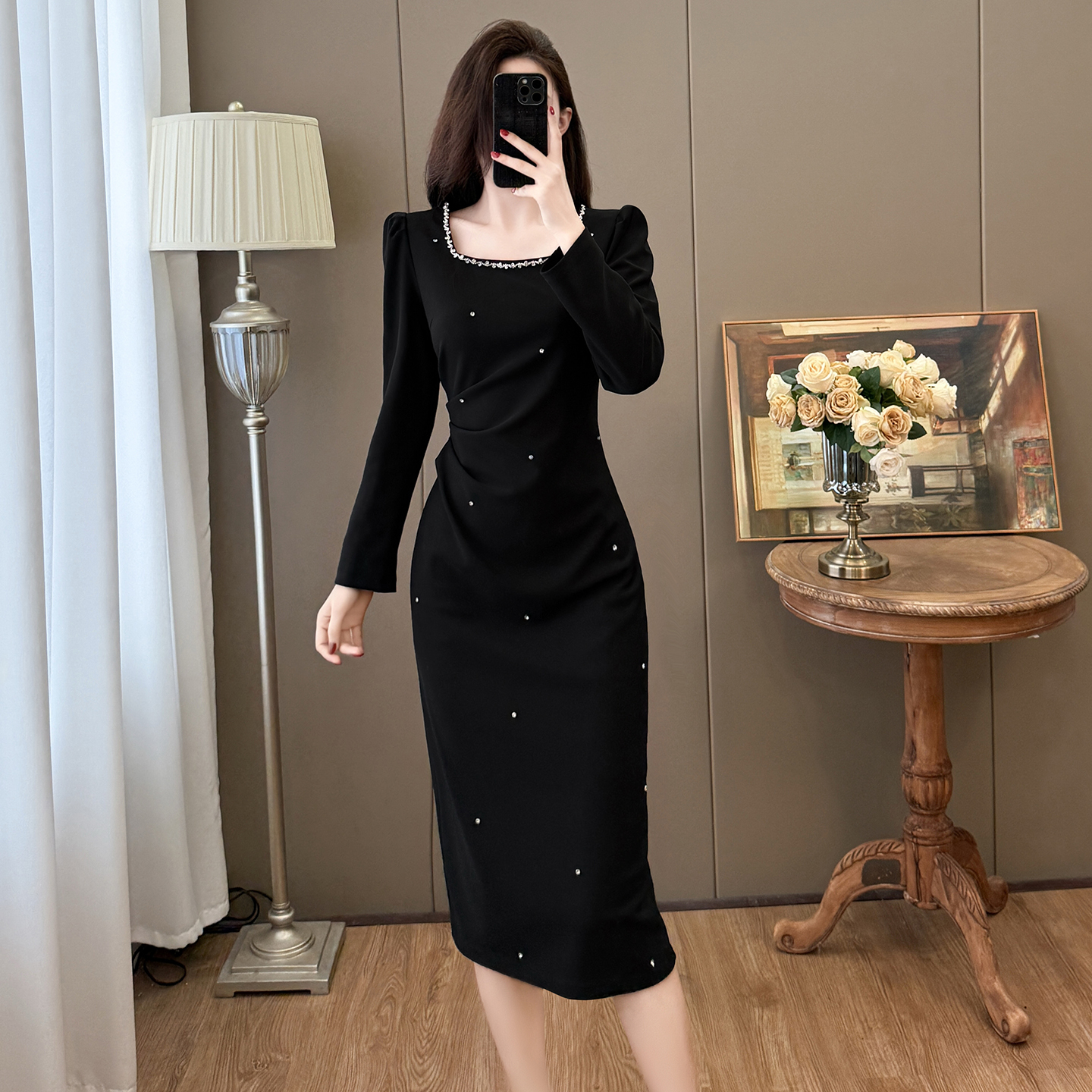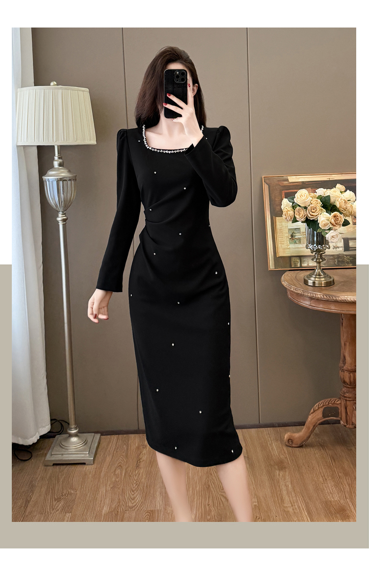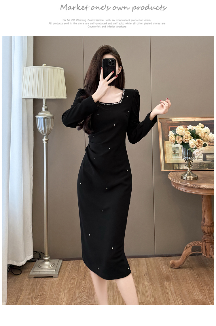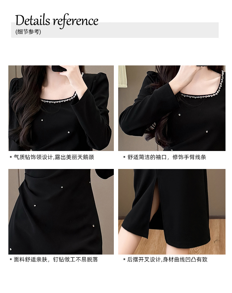 MY15076# 钉钻方领赫本风重工气质高级感轻奢名媛风大码连衣裙女裝貨源服裝批發