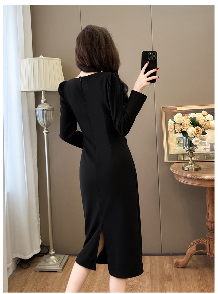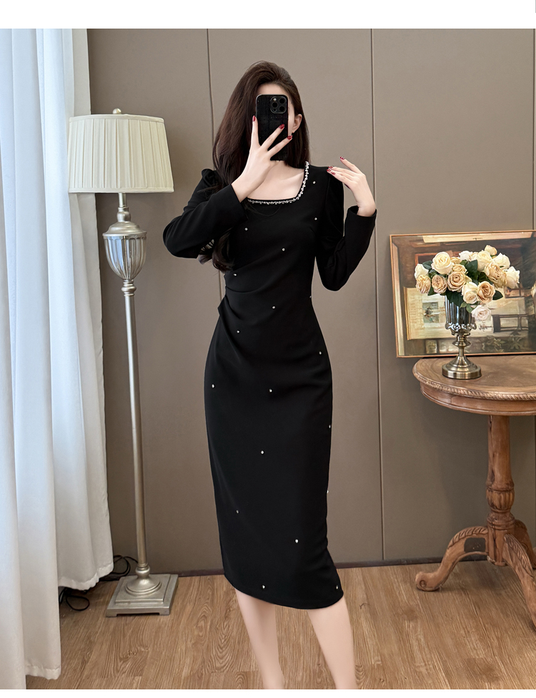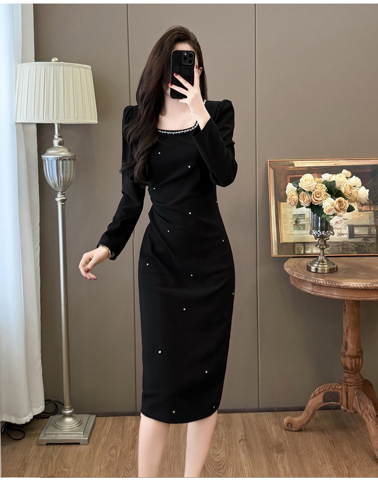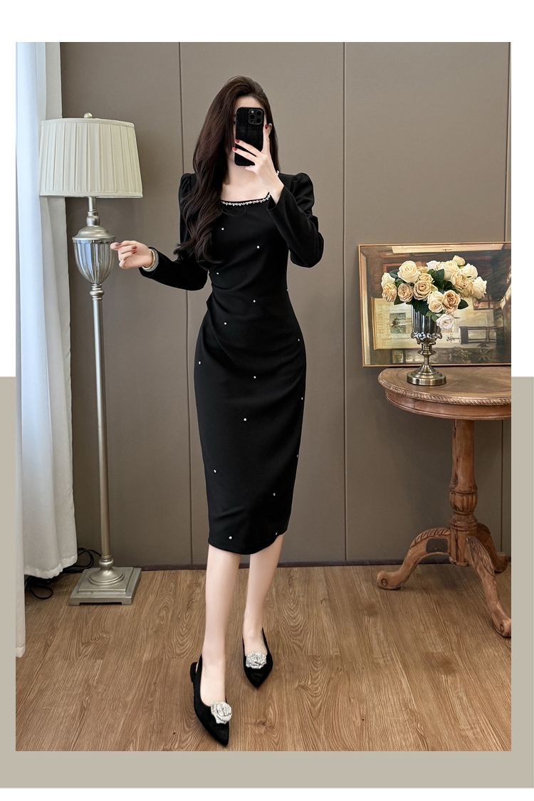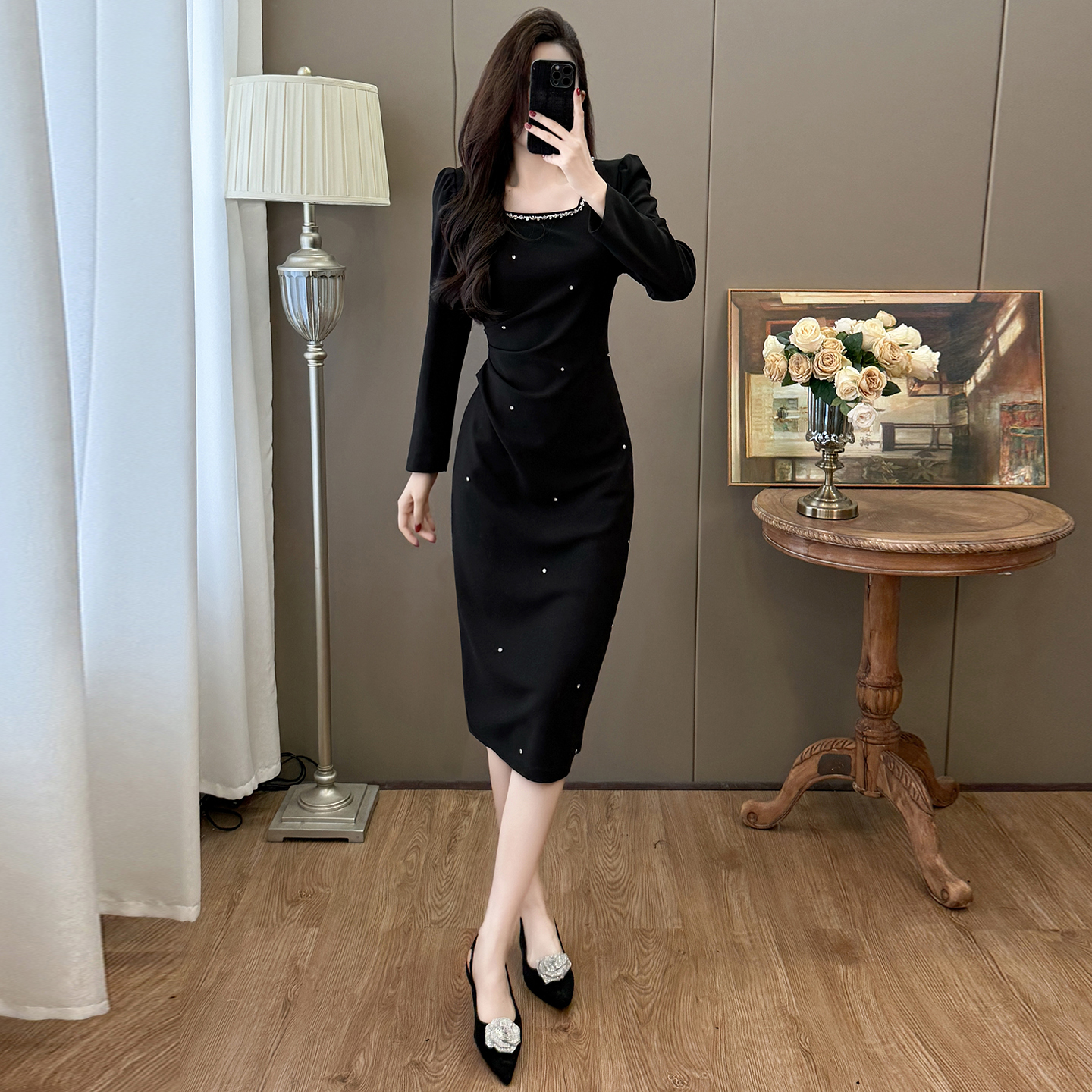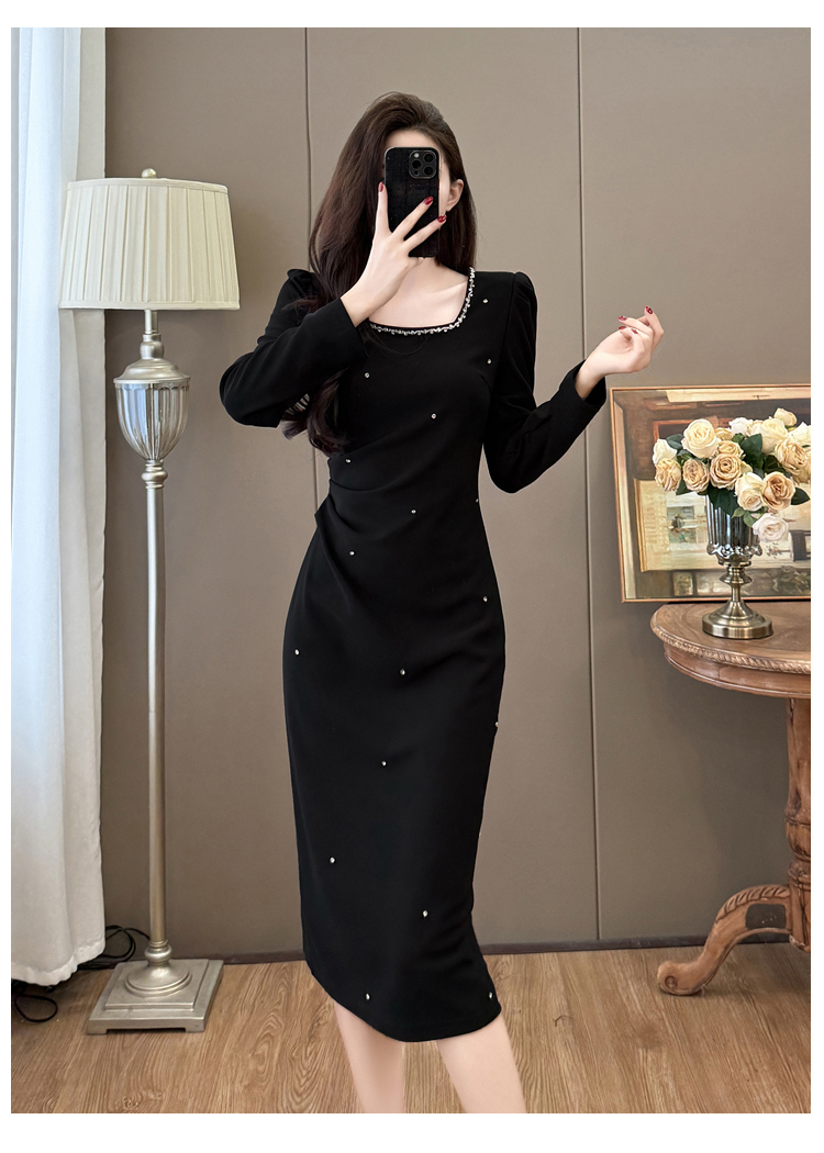 MY15076# 钉钻方领赫本风重工气质高级感轻奢名媛风大码连衣裙女裝貨源服裝批發