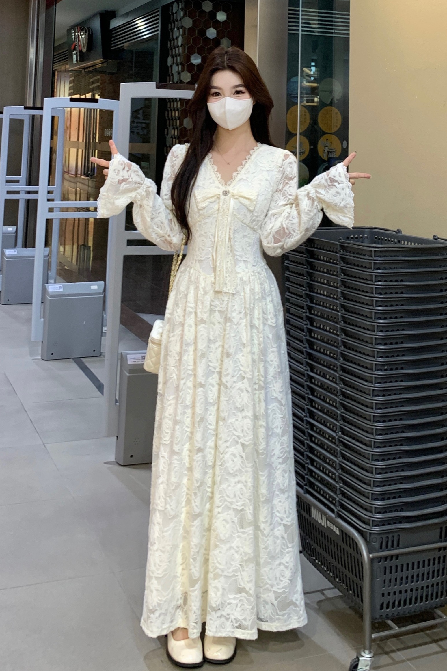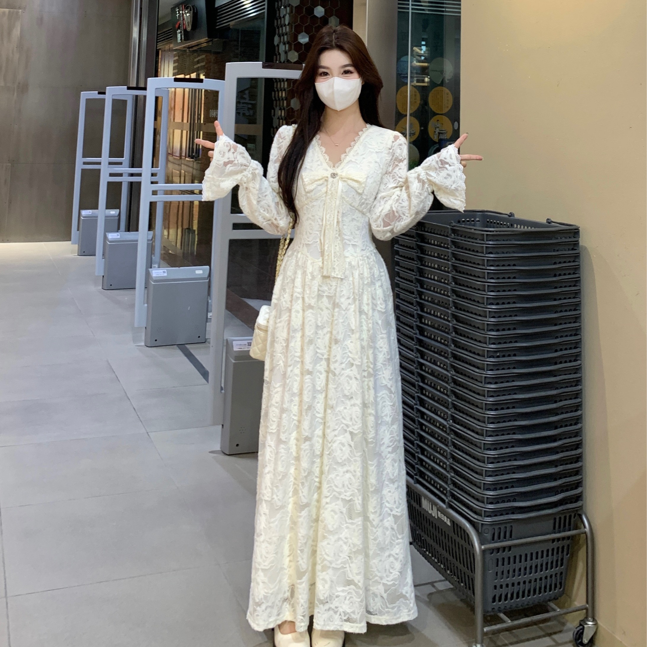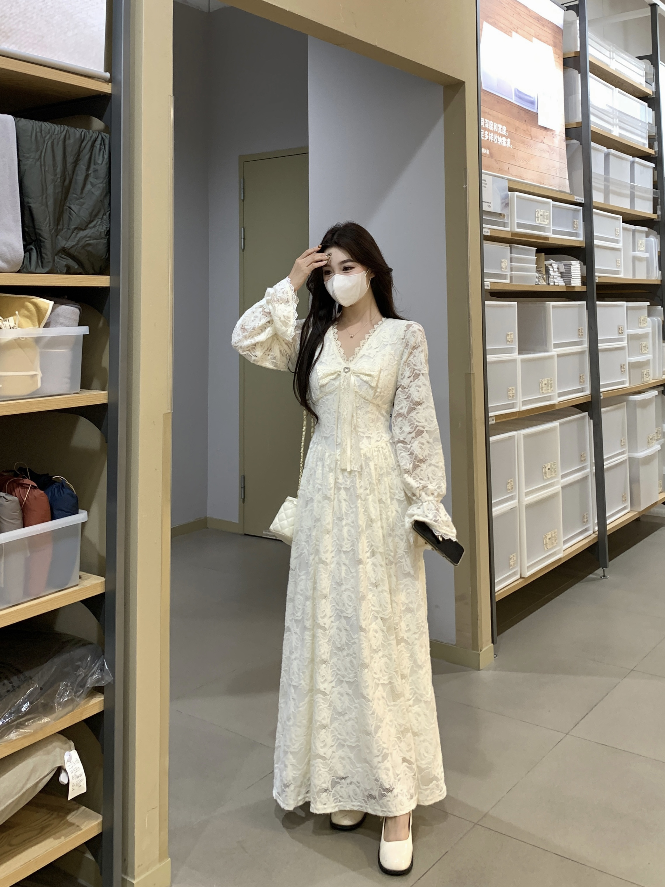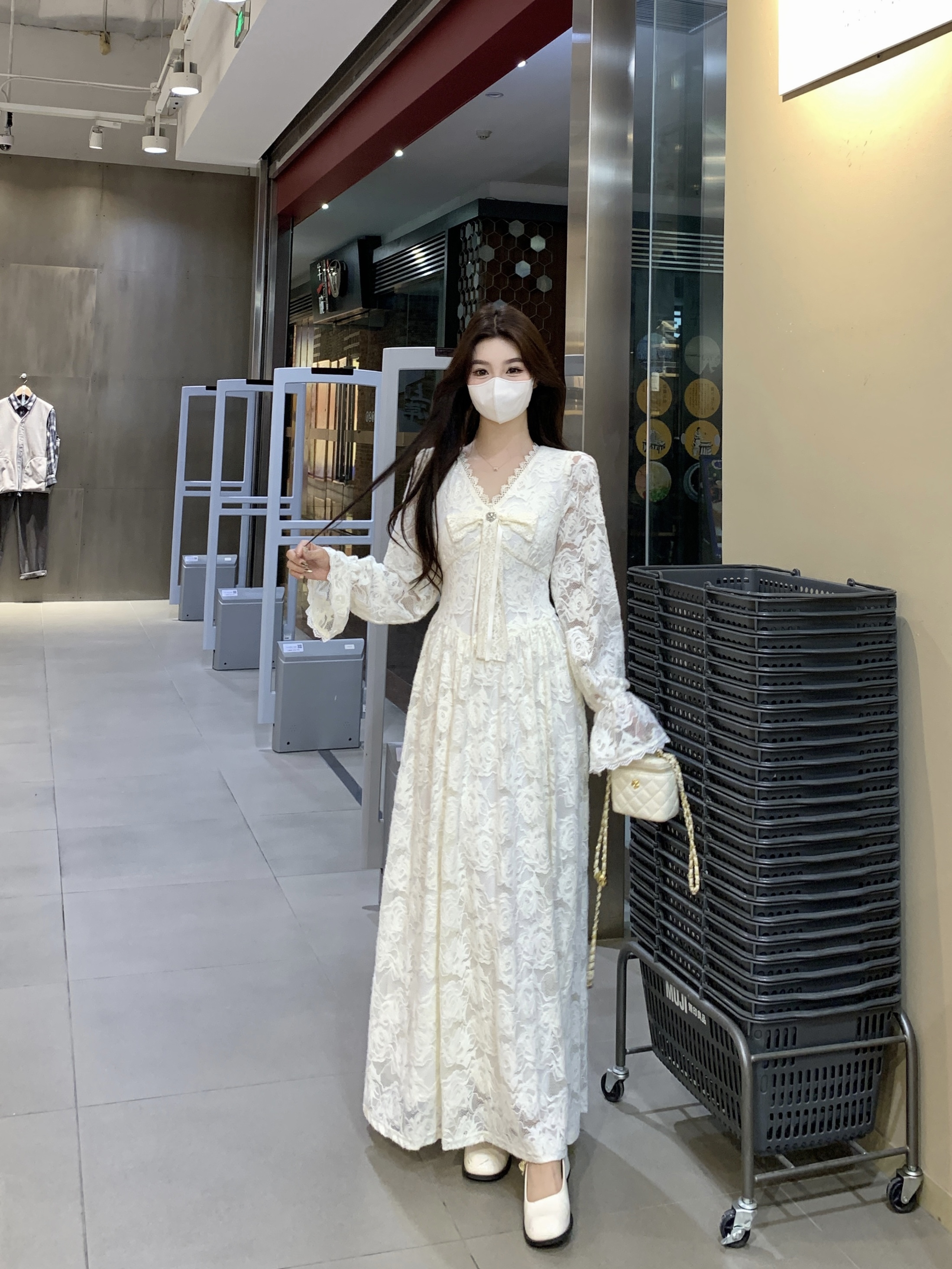 MY15090# 大码2冬雾月白兰蕾丝氛围感加绒长袖V领花边收腰长款连衣裙女女裝貨源服裝批發