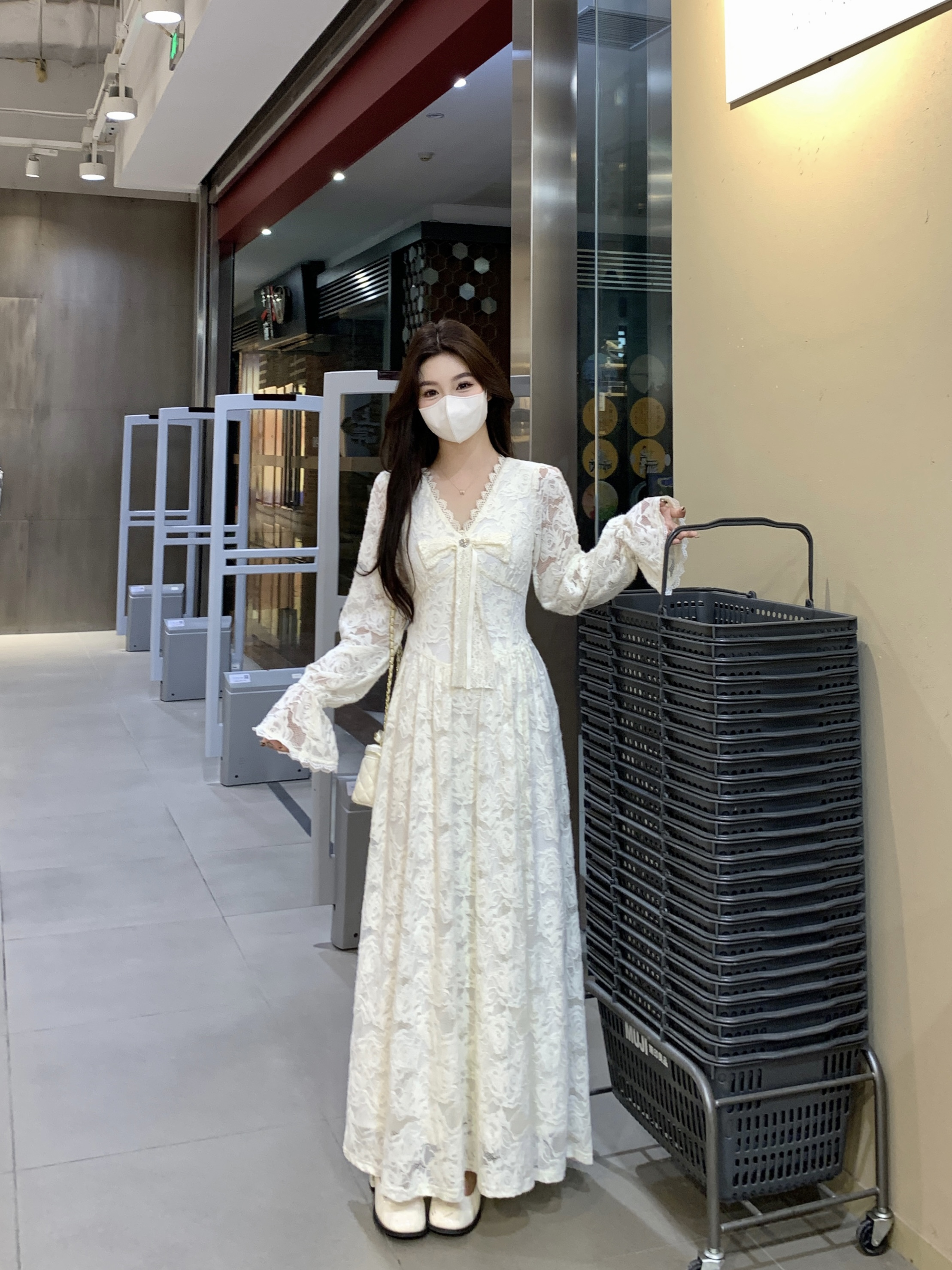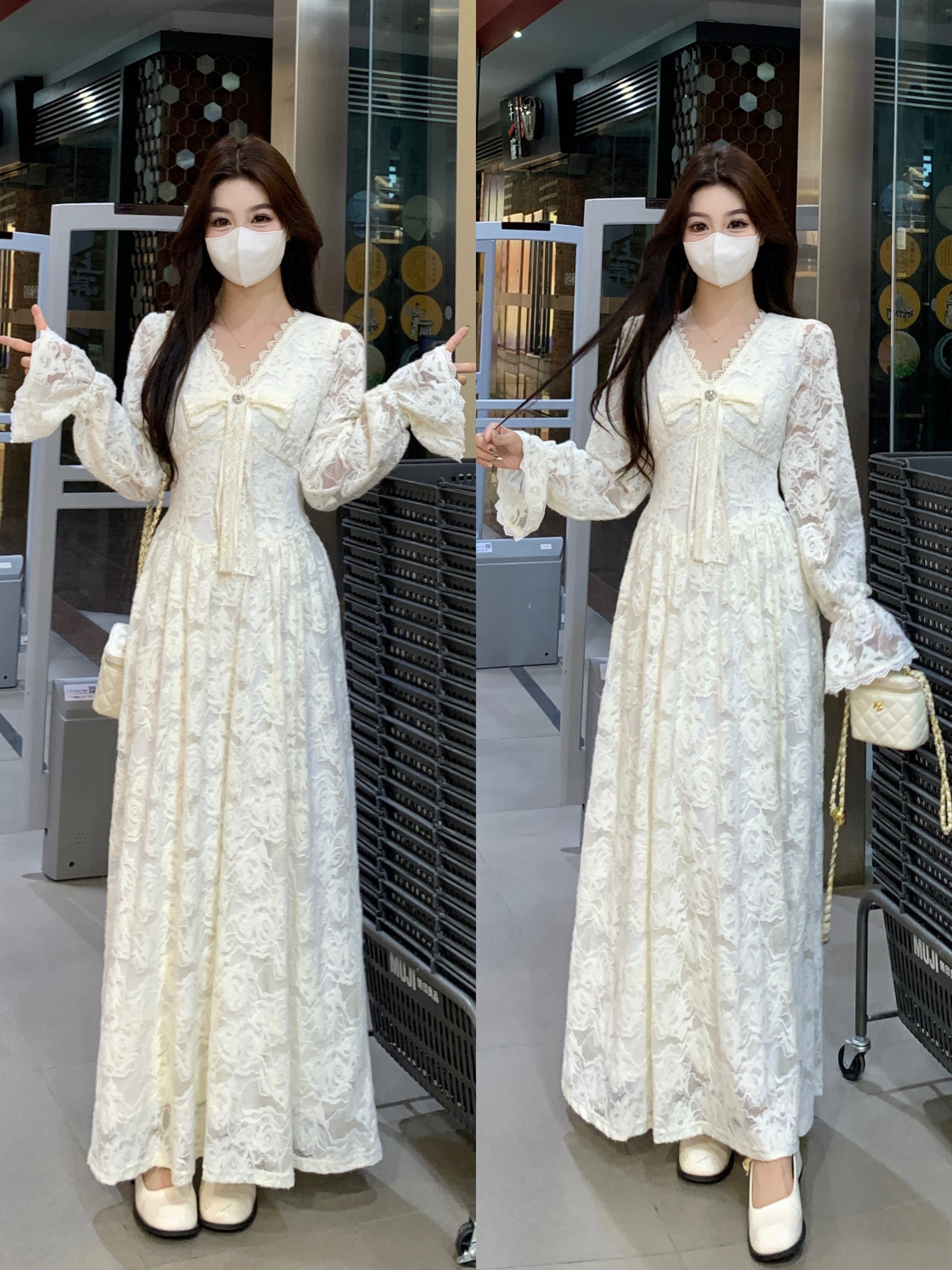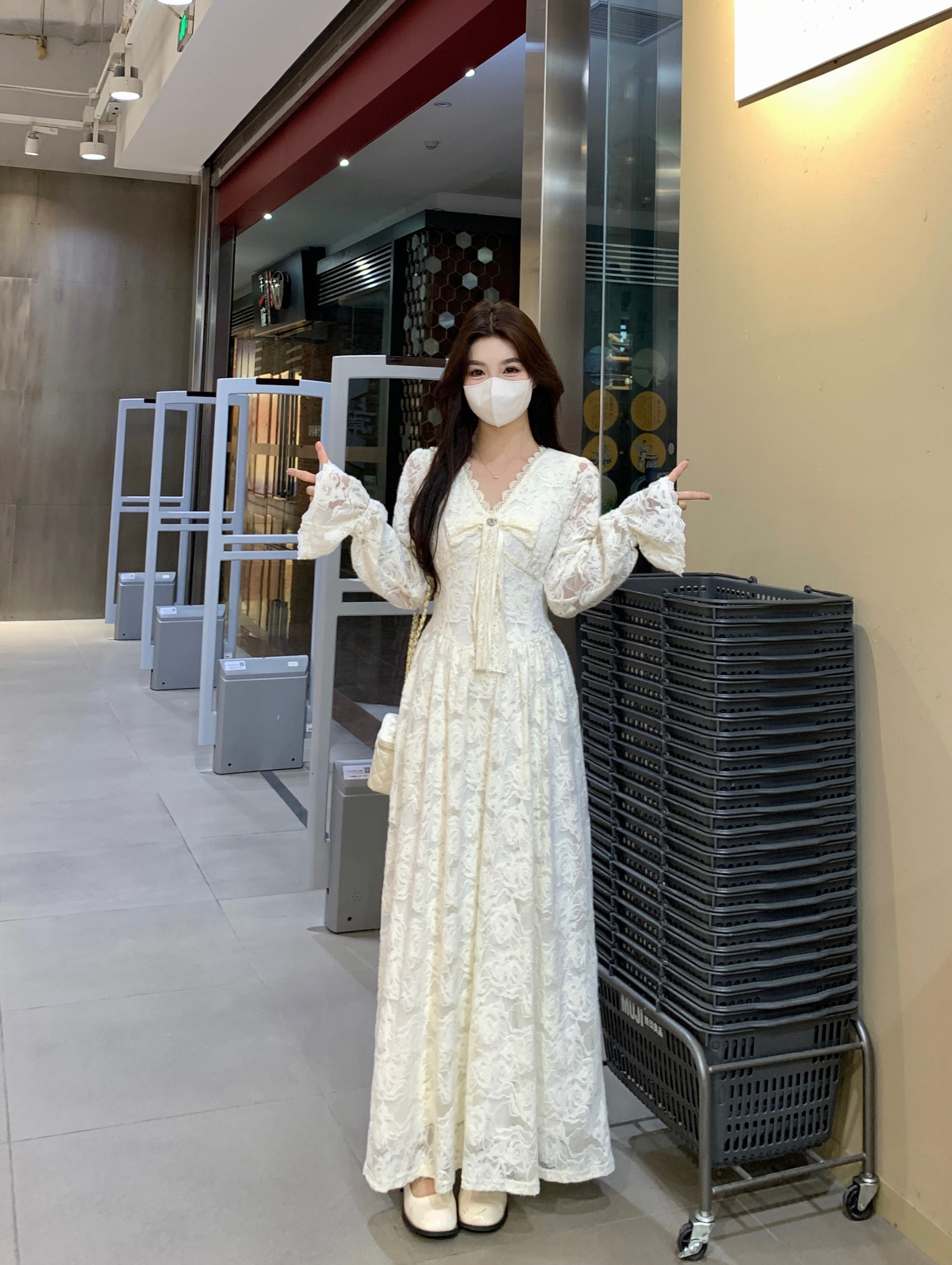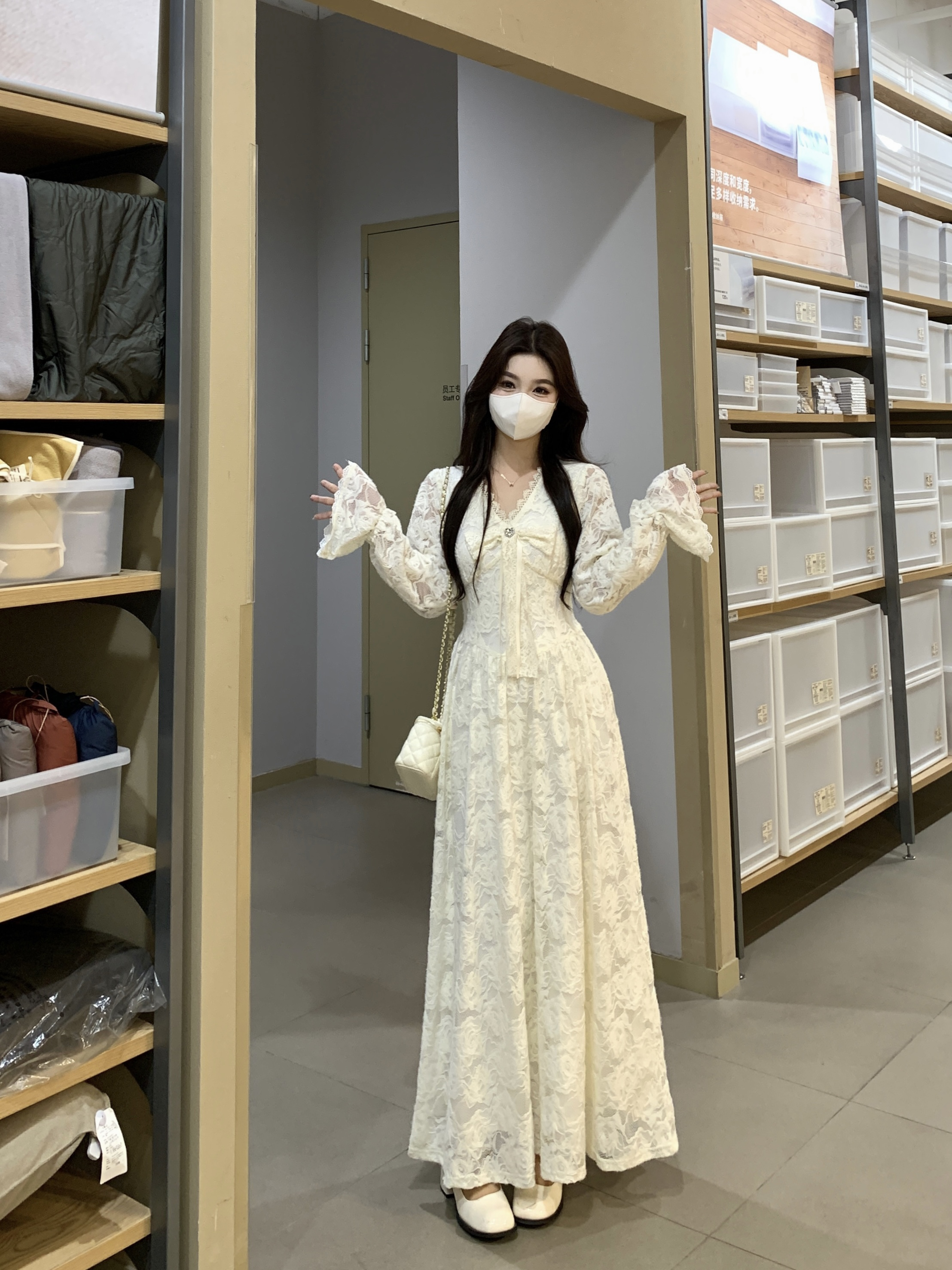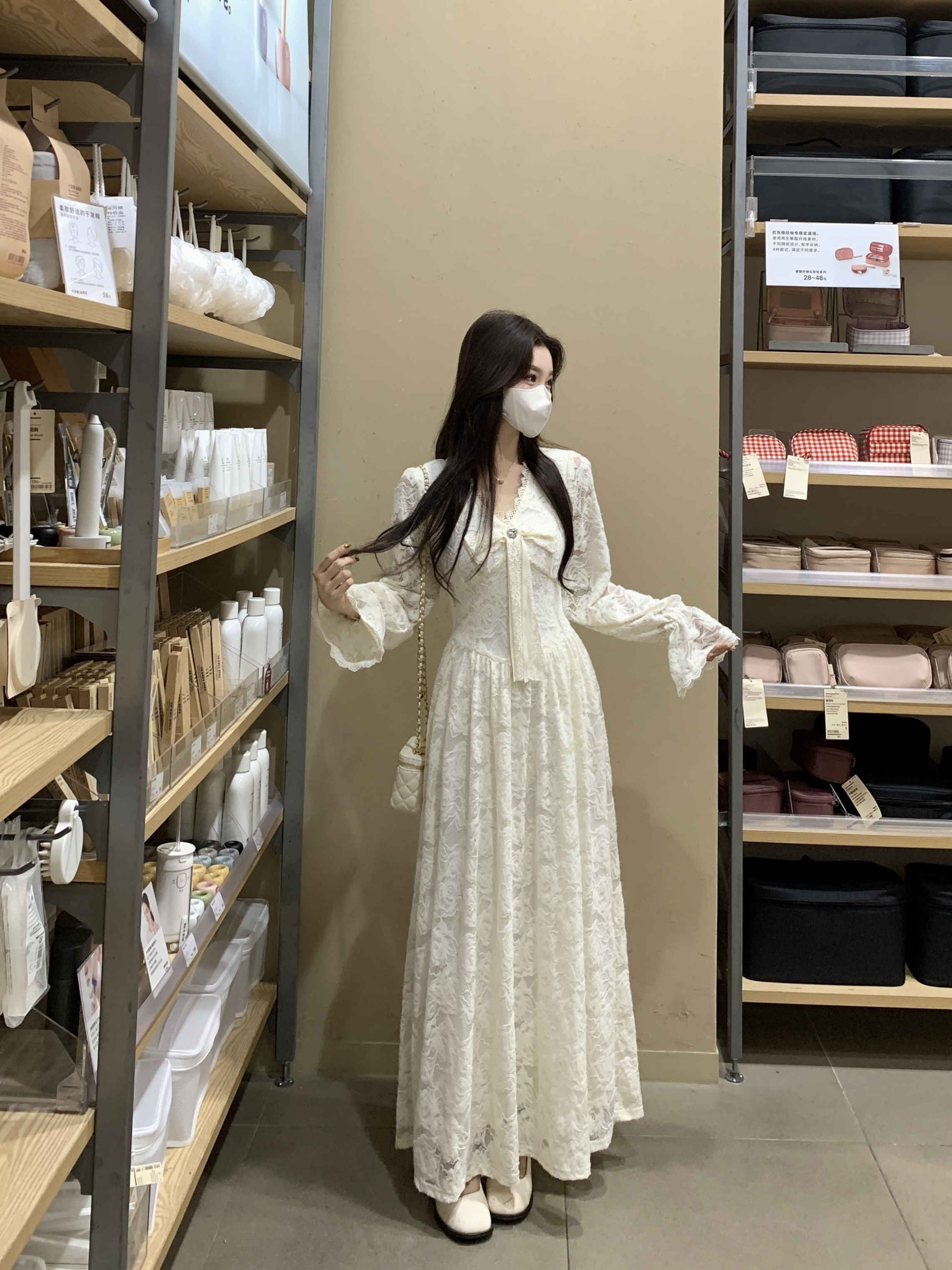 MY15090# 大码2冬雾月白兰蕾丝氛围感加绒长袖V领花边收腰长款连衣裙女女裝貨源服裝批發