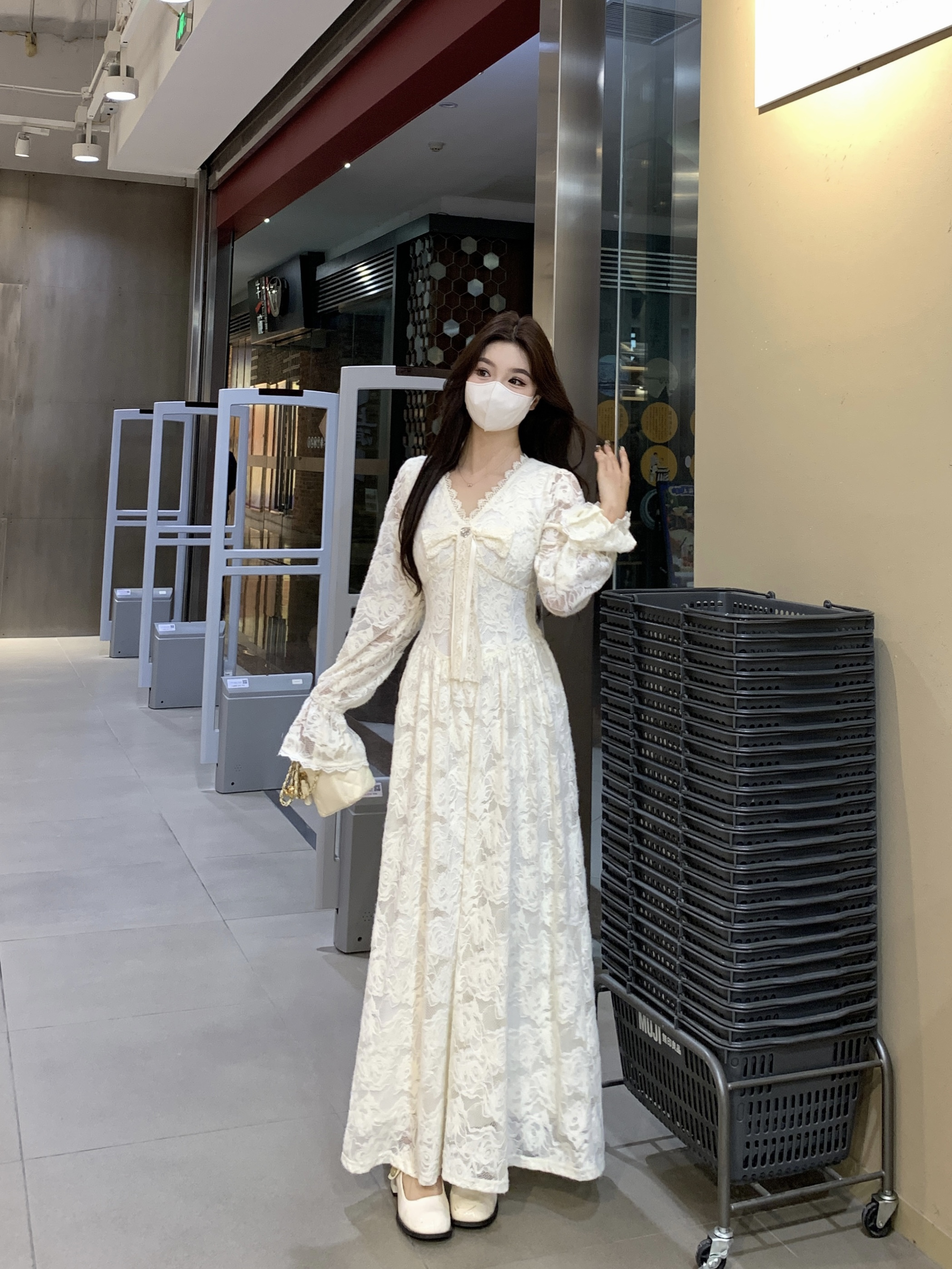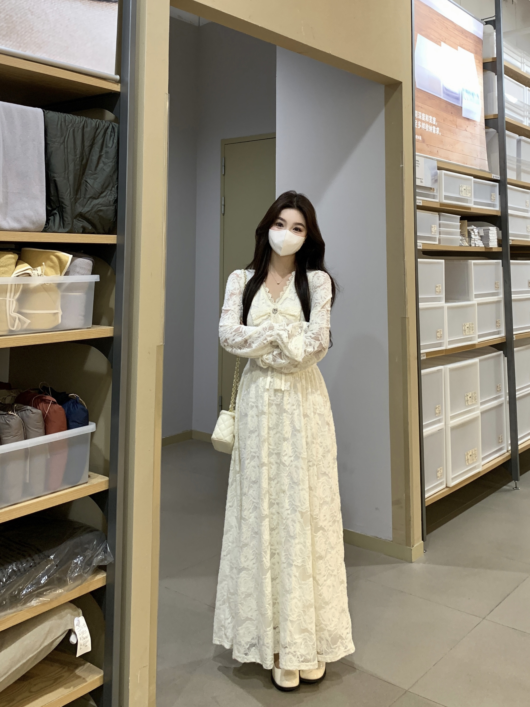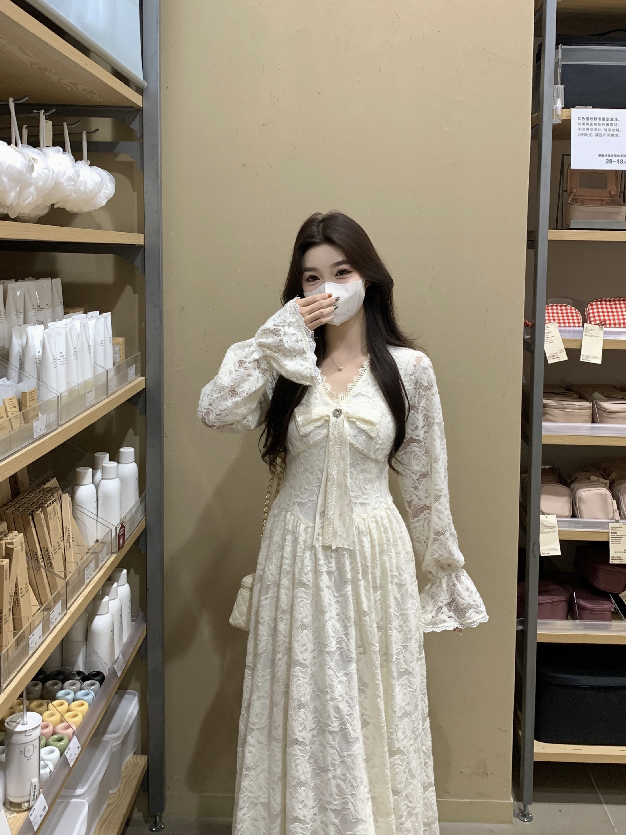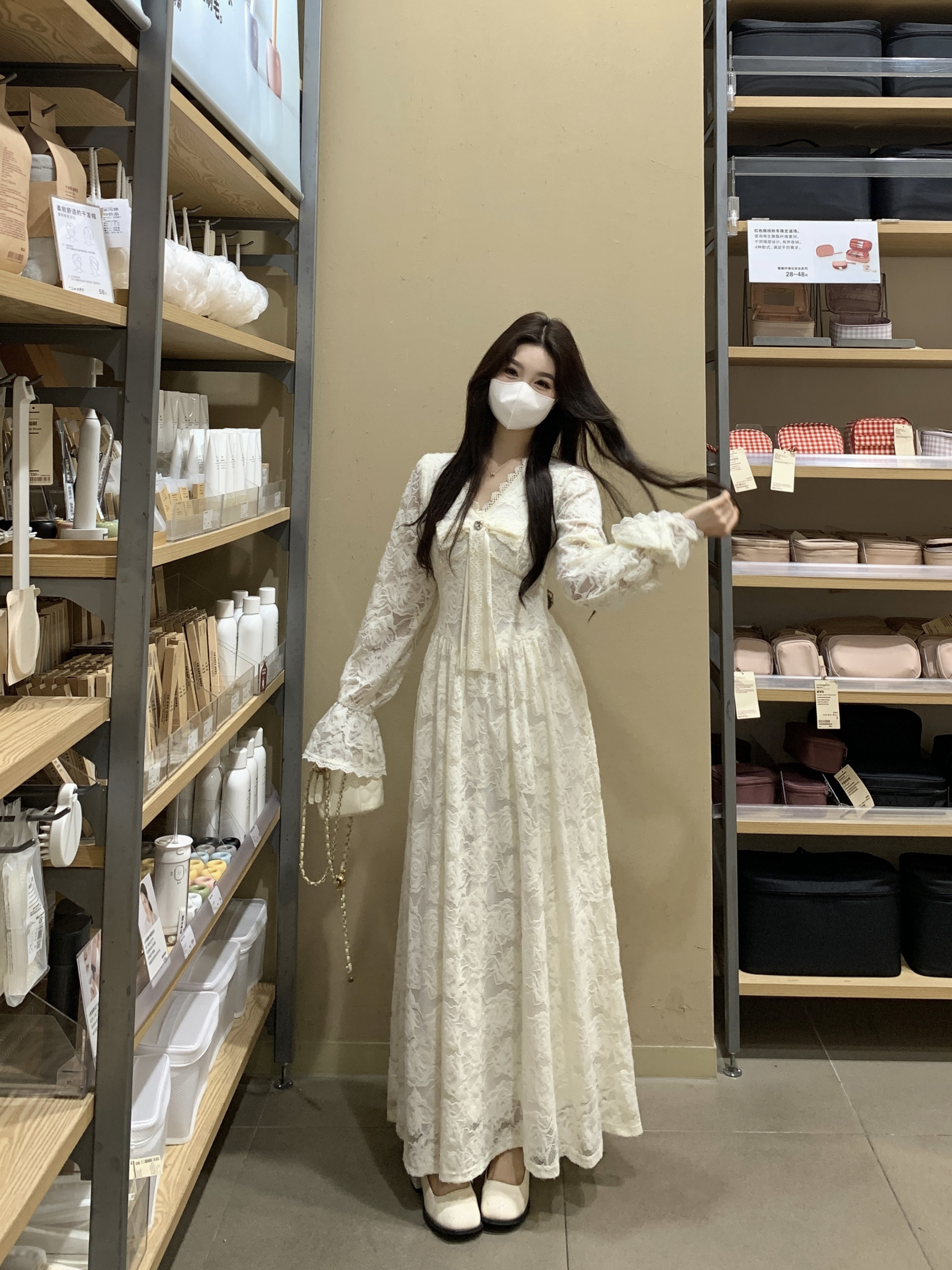 MY15090# 大码2冬雾月白兰蕾丝氛围感加绒长袖V领花边收腰长款连衣裙女女裝貨源服裝批發