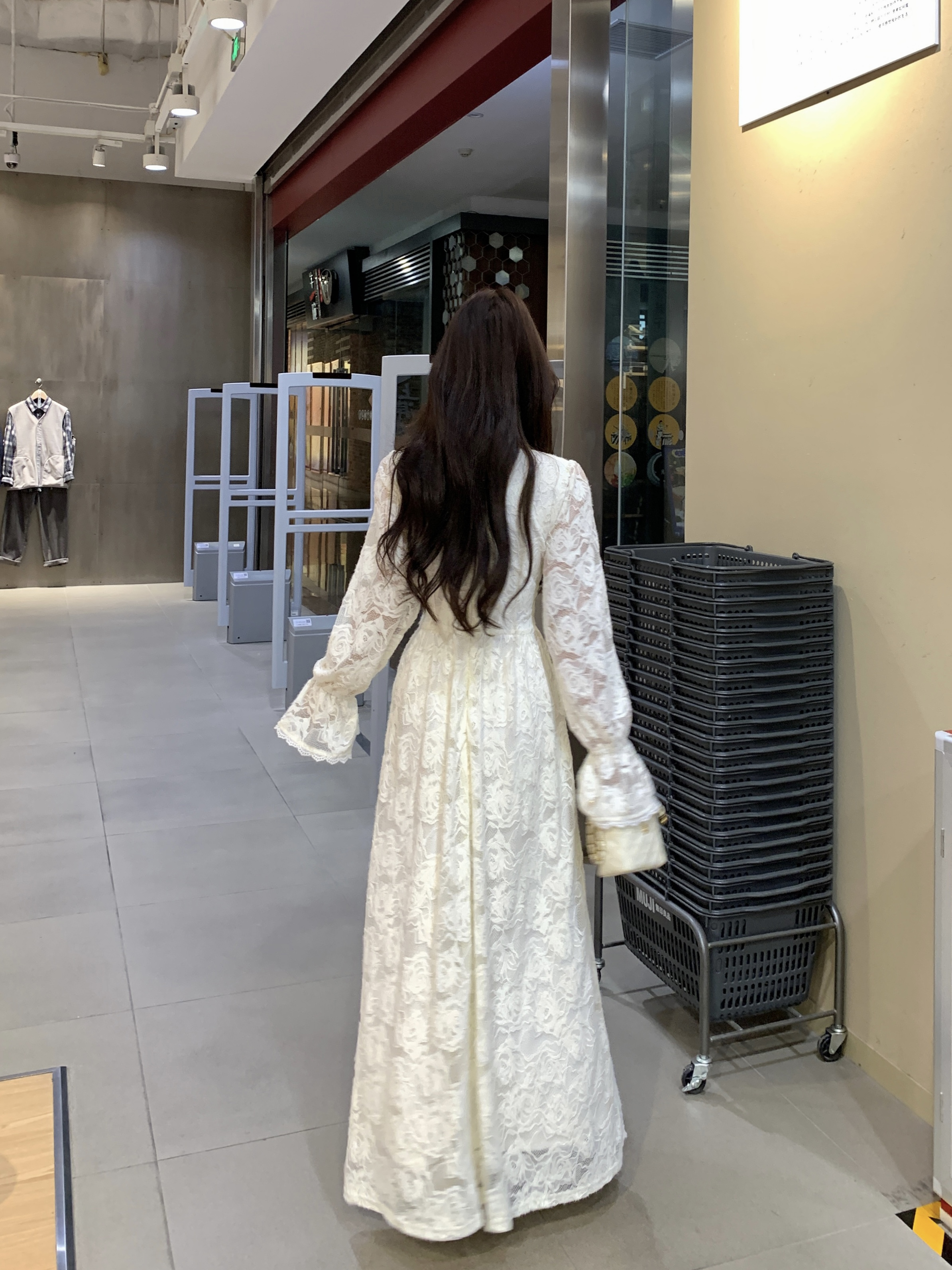 首页 > 女装批发-秋冬款 > 长袖连衣裙 > MY15090# 大码2冬雾月白兰蕾丝氛围感加绒长袖V领花边收腰长款连衣裙女女裝貨源服裝批發