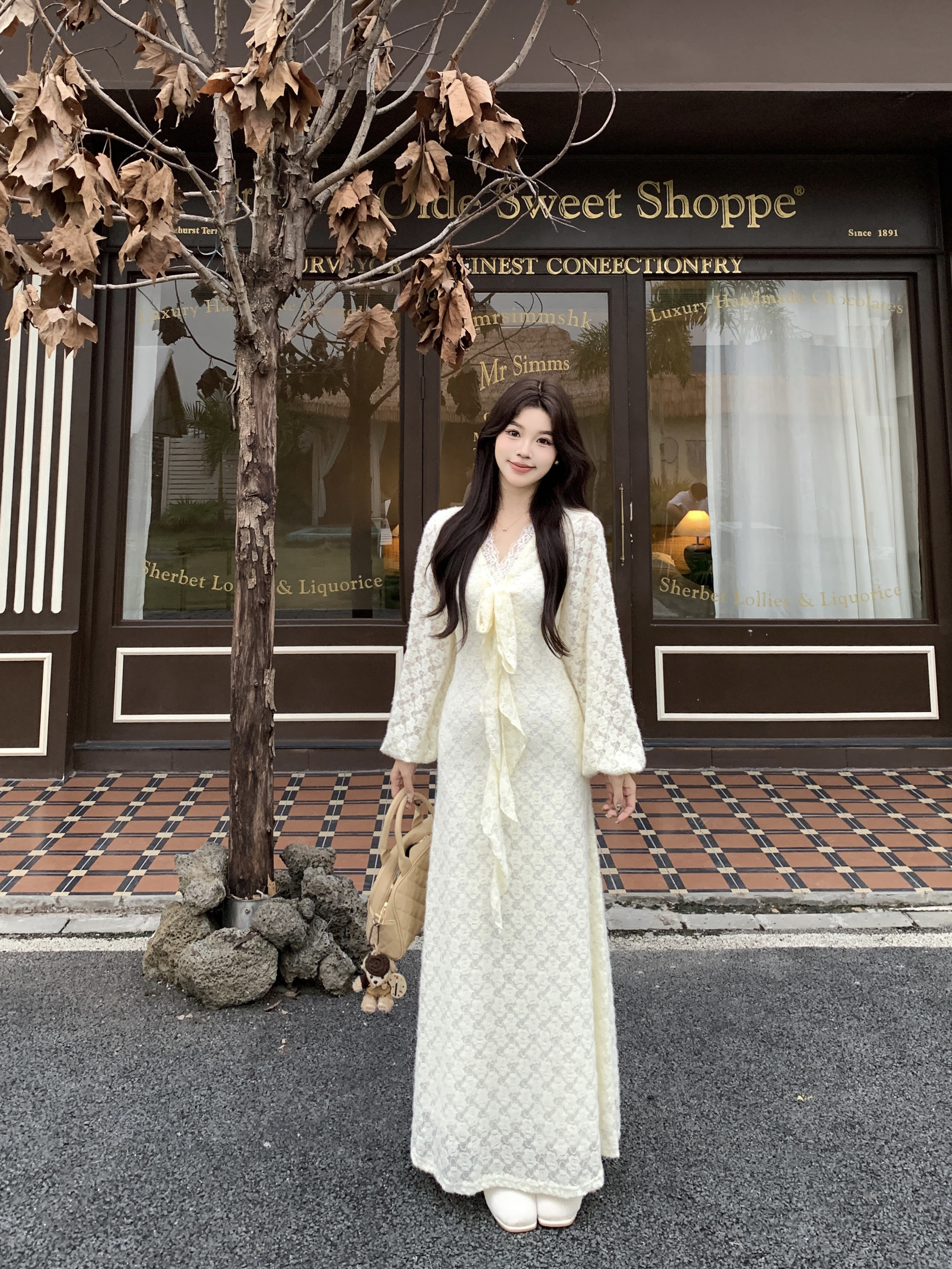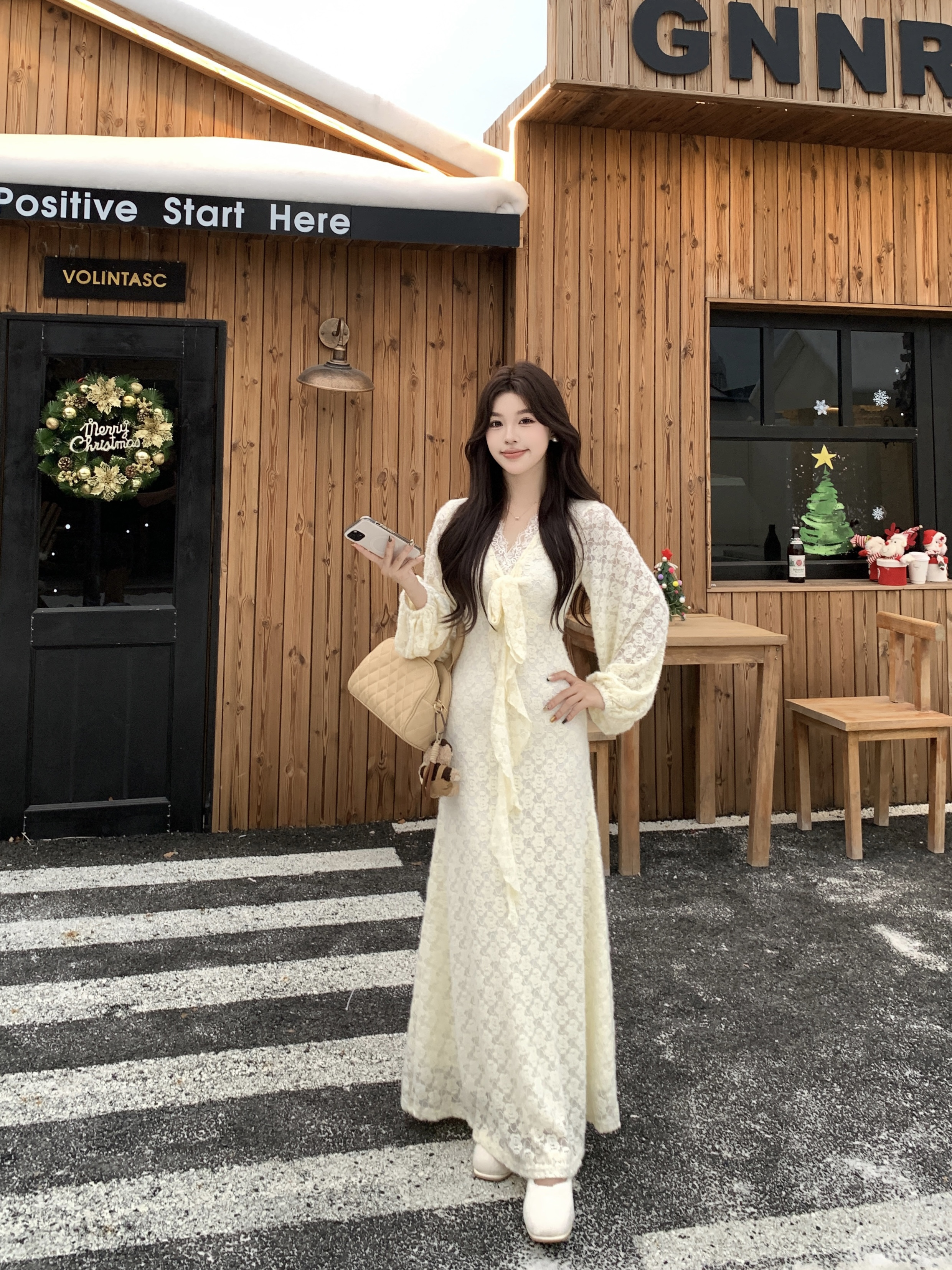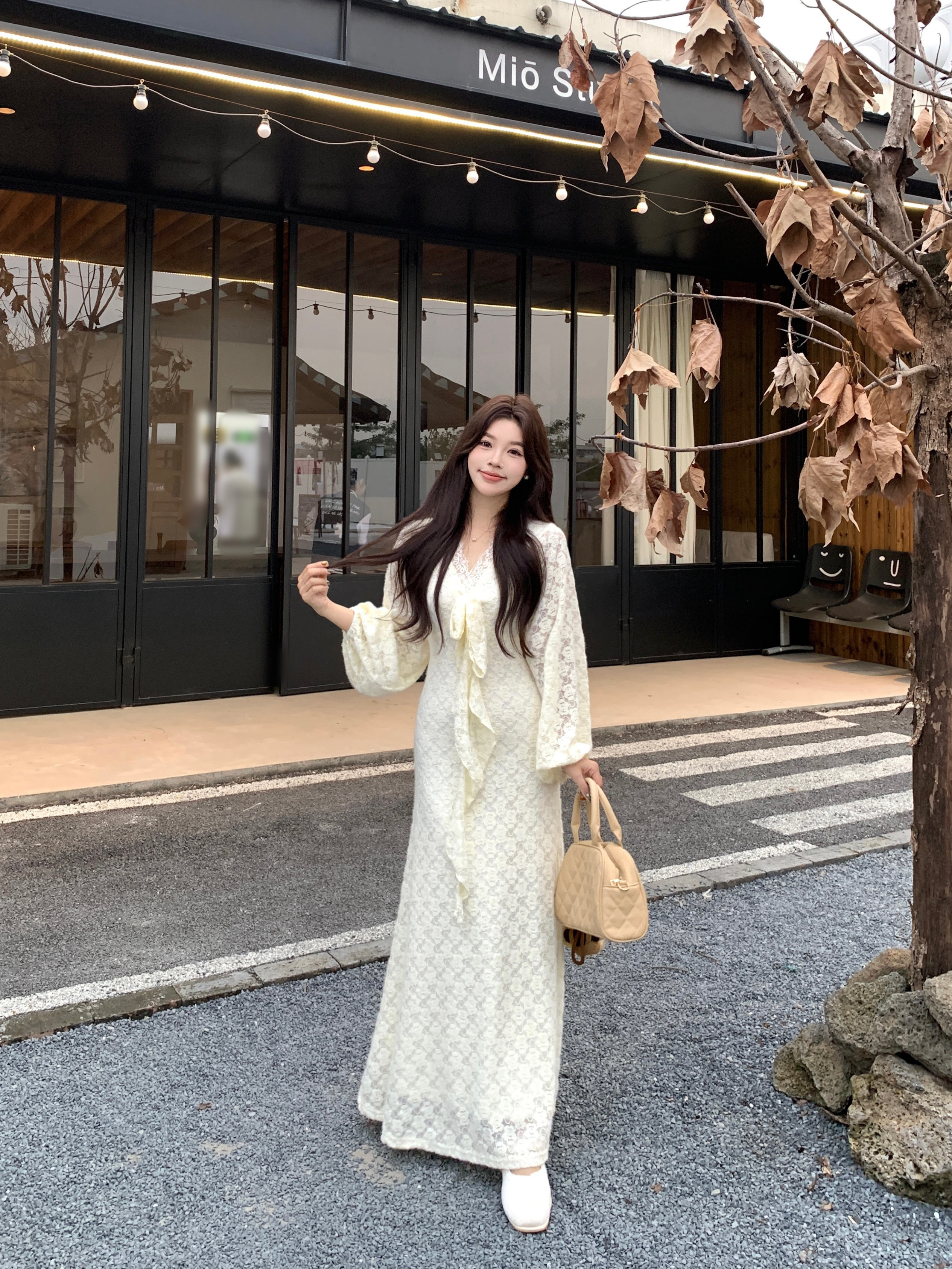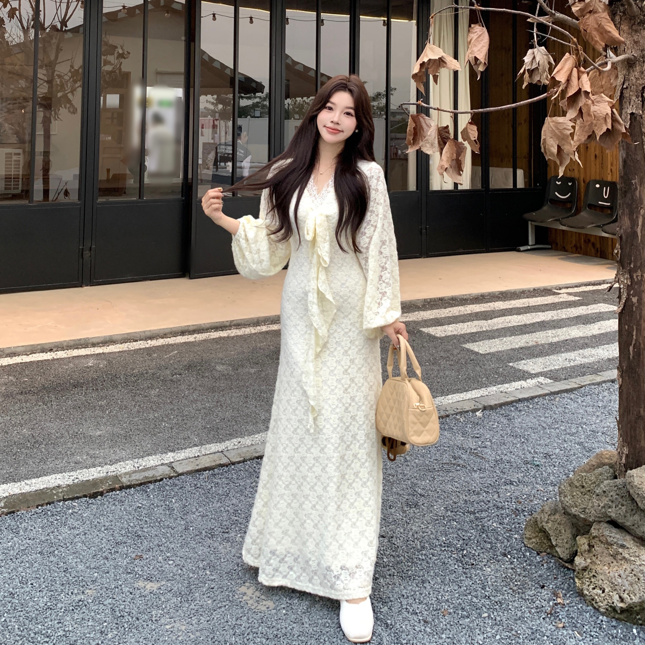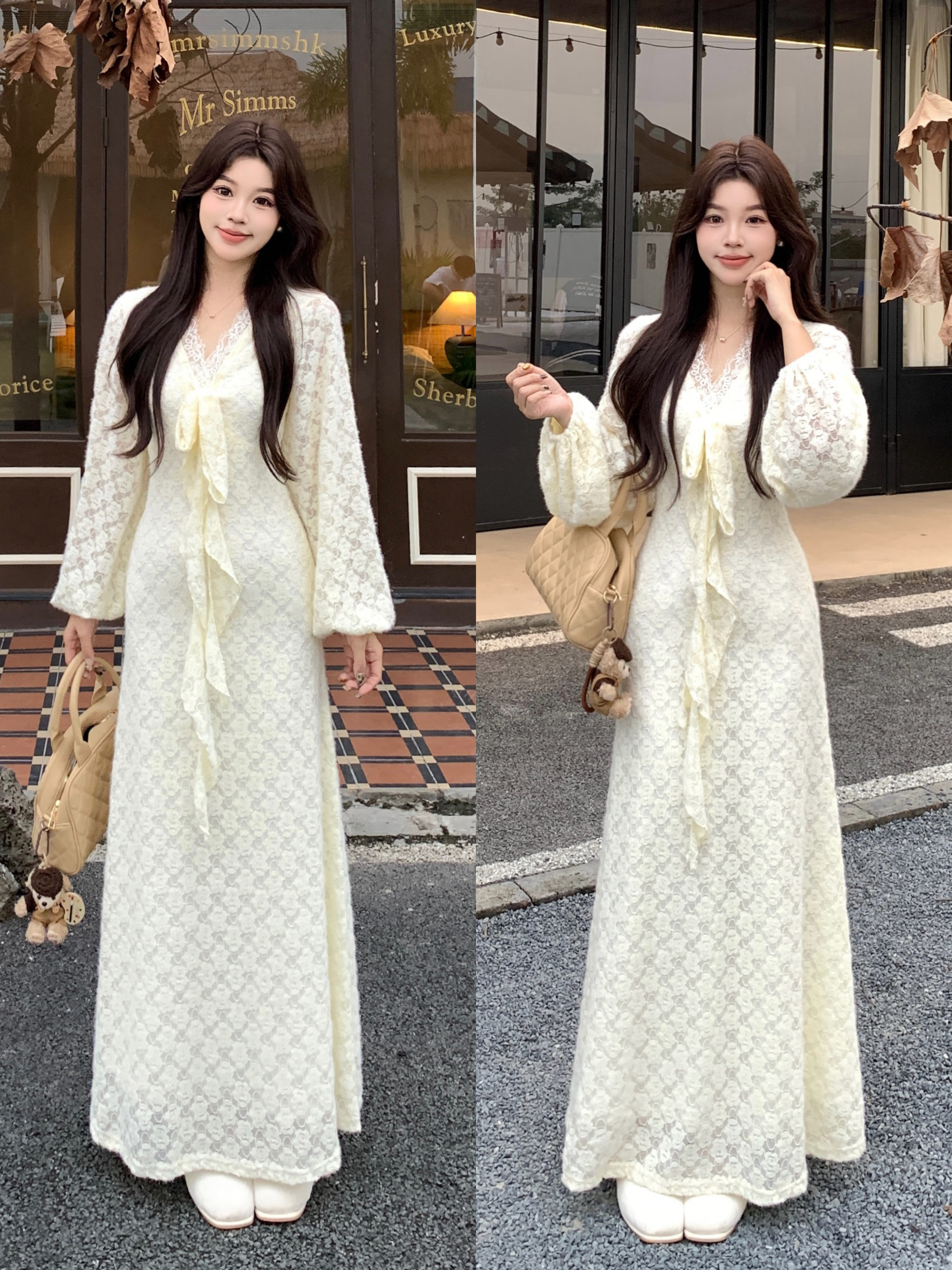 MY15096#大码韩系千金感收腰显瘦磨毛加绒气质法式温柔暖杏轻烟长裙女女裝貨源服裝批發