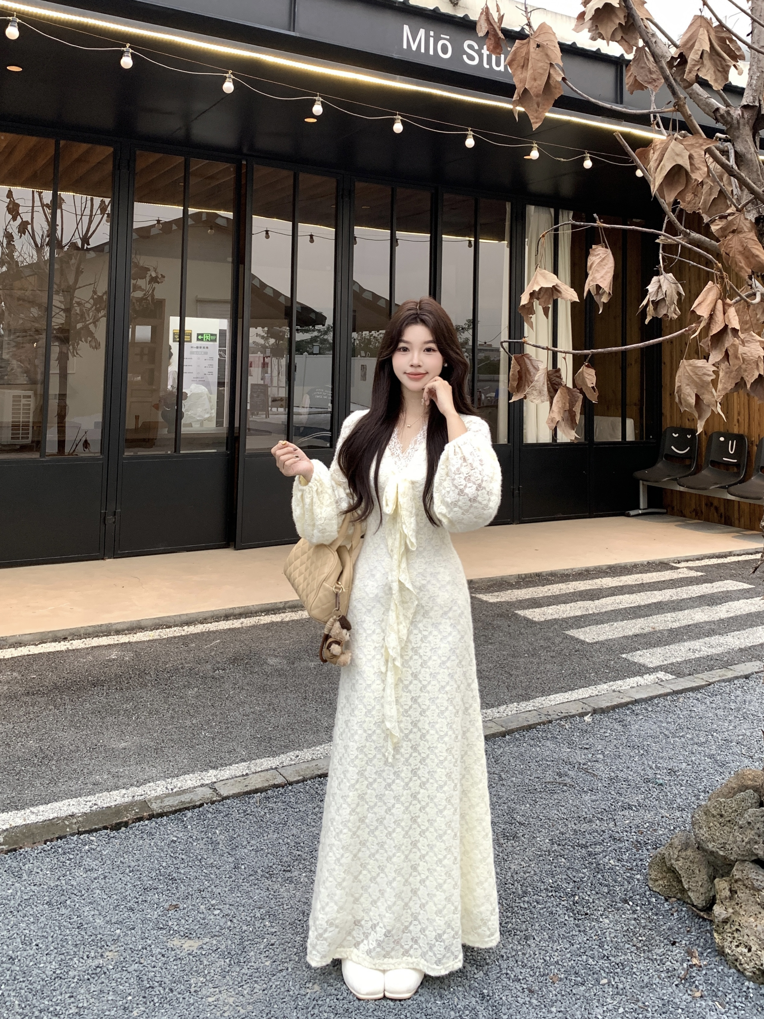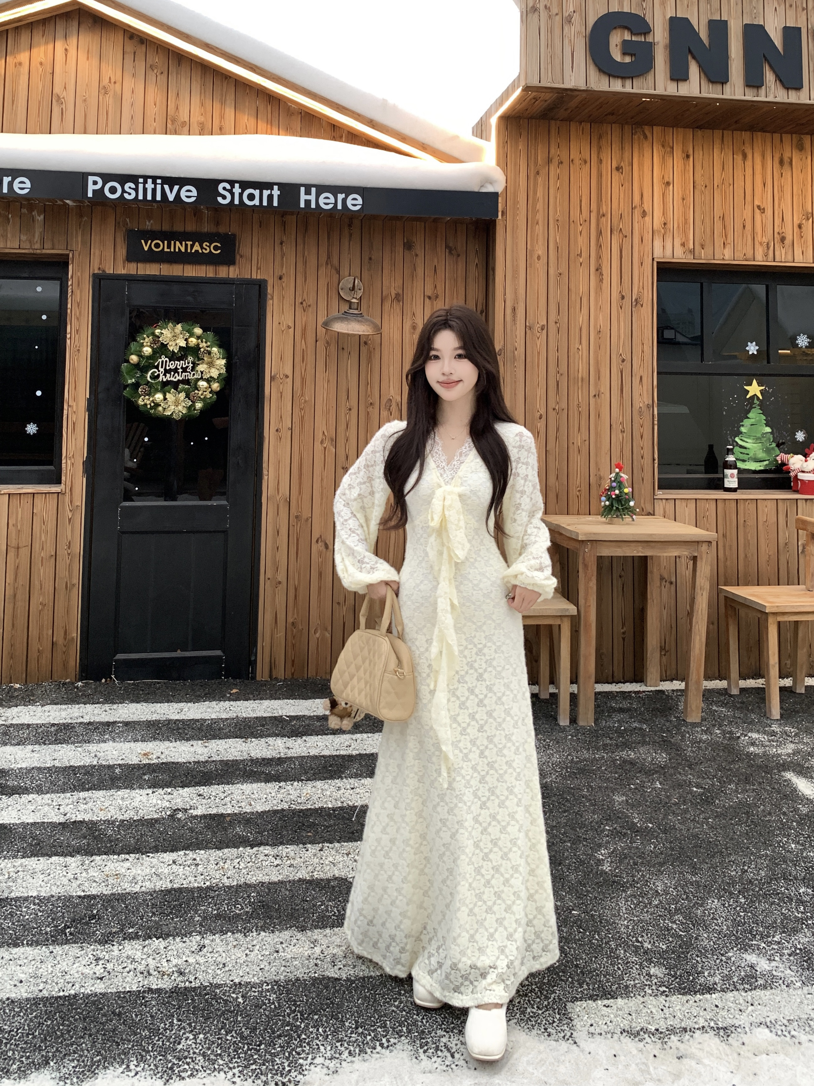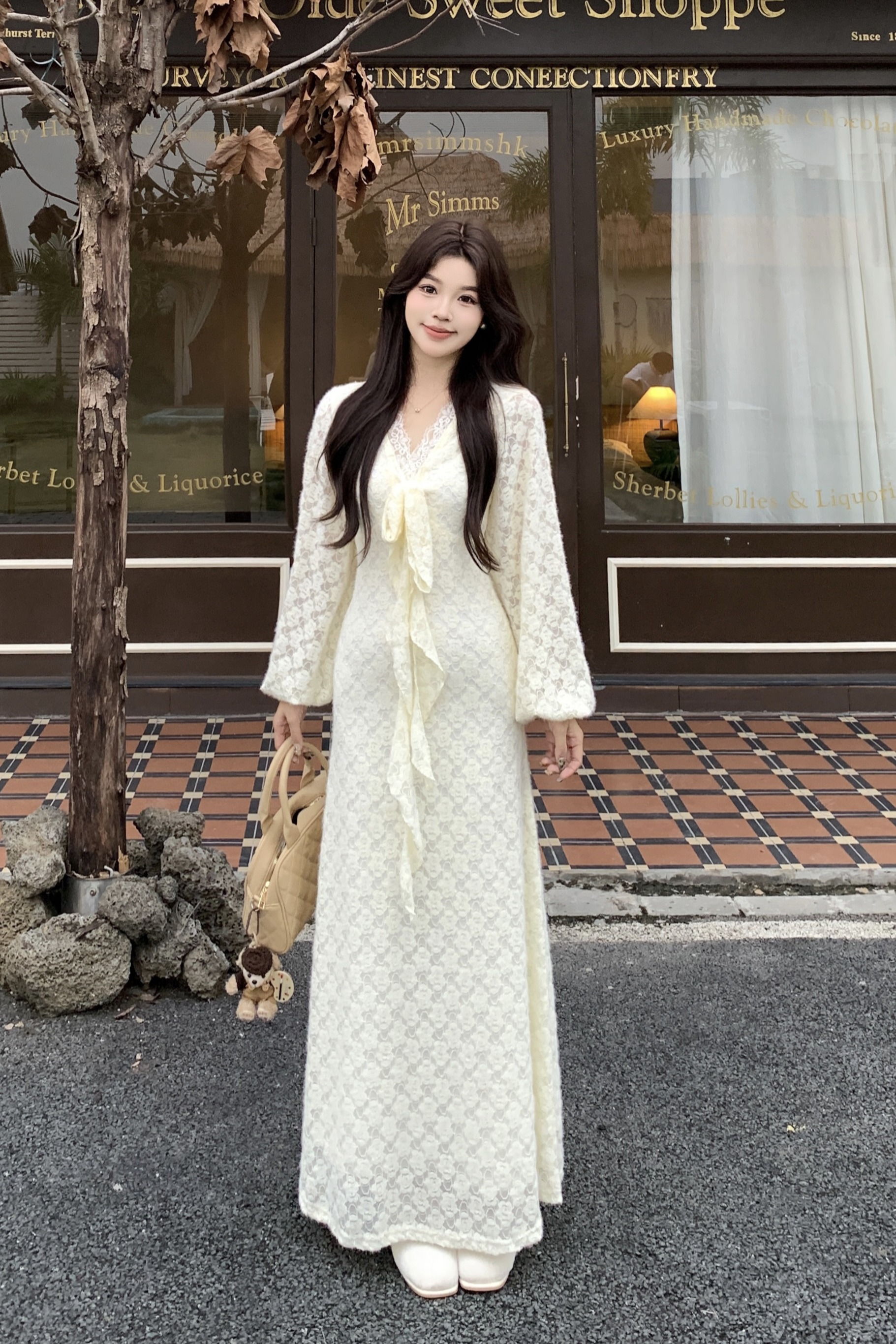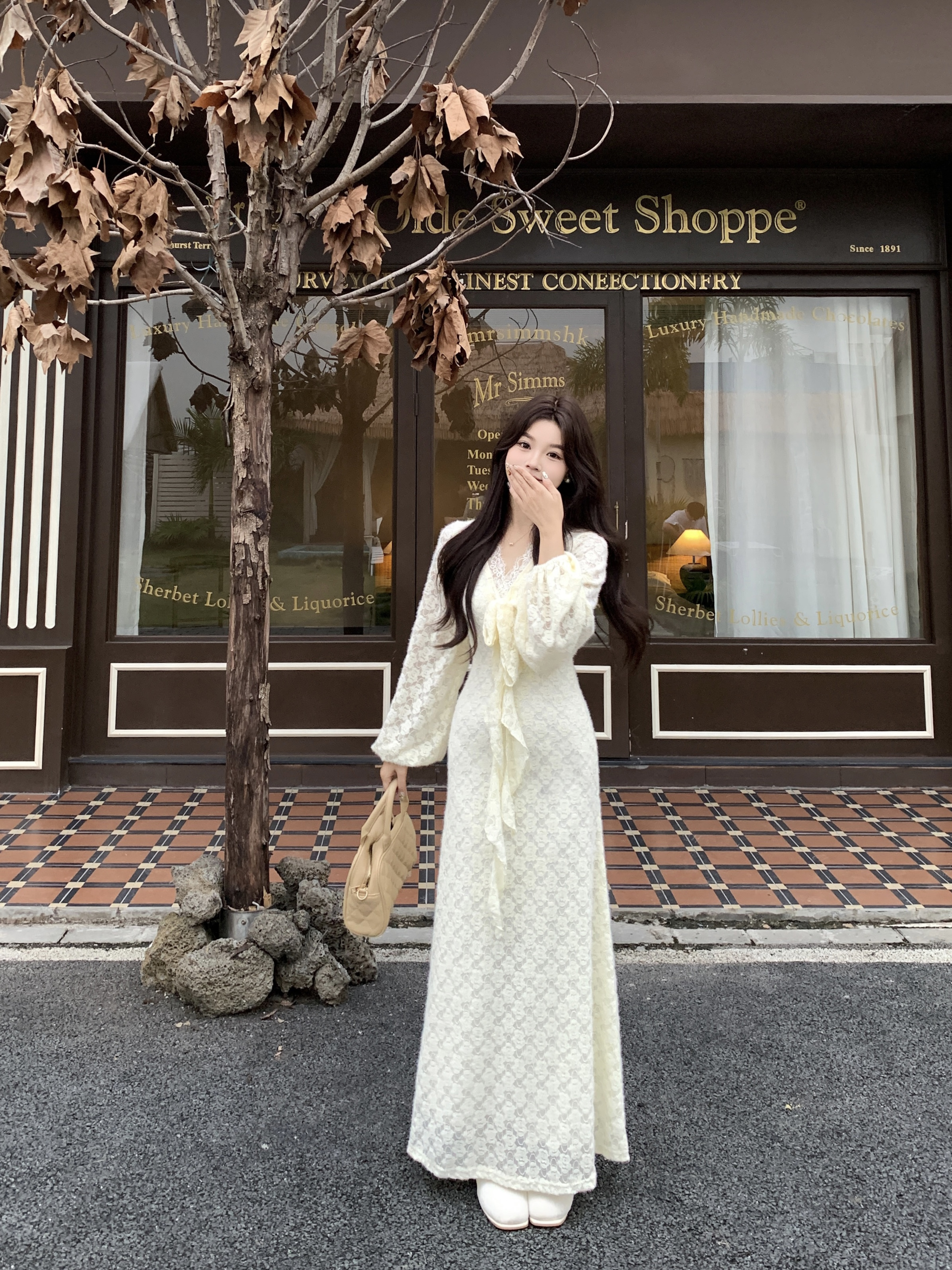 MY15096#大码韩系千金感收腰显瘦磨毛加绒气质法式温柔暖杏轻烟长裙女女裝貨源服裝批發