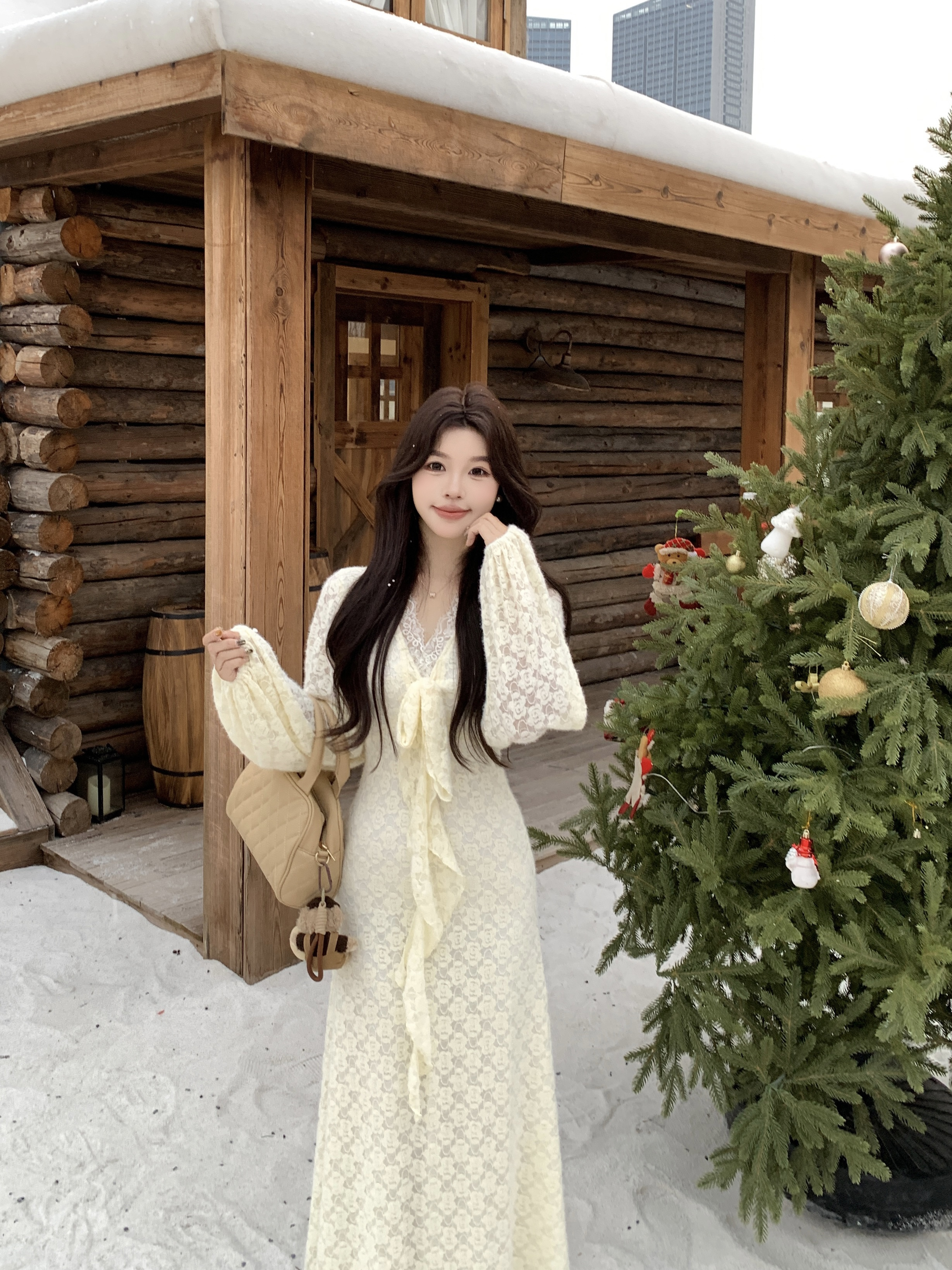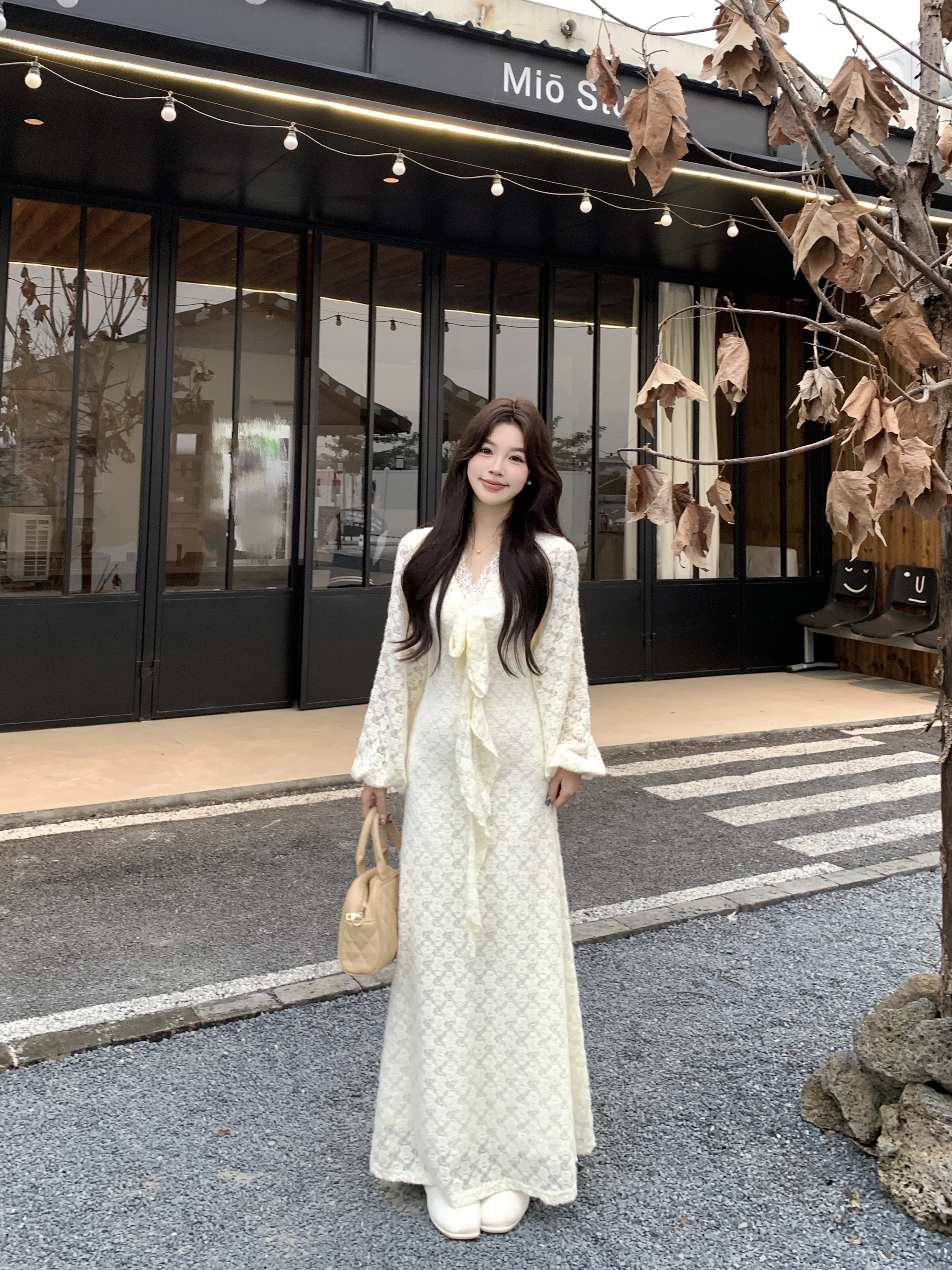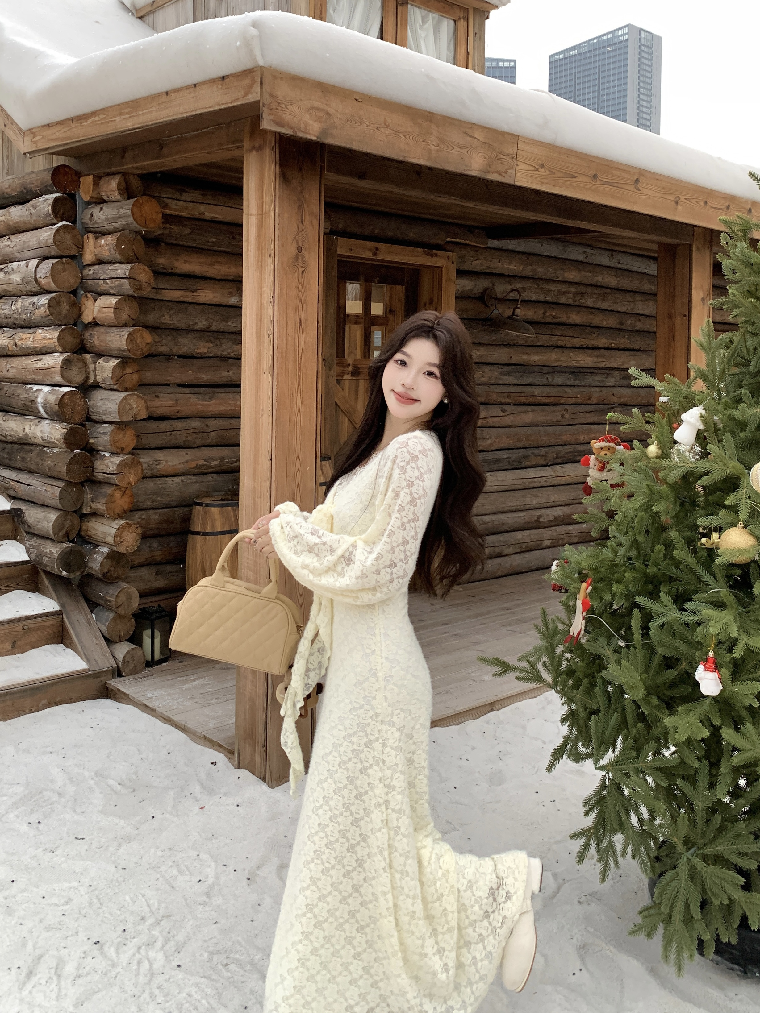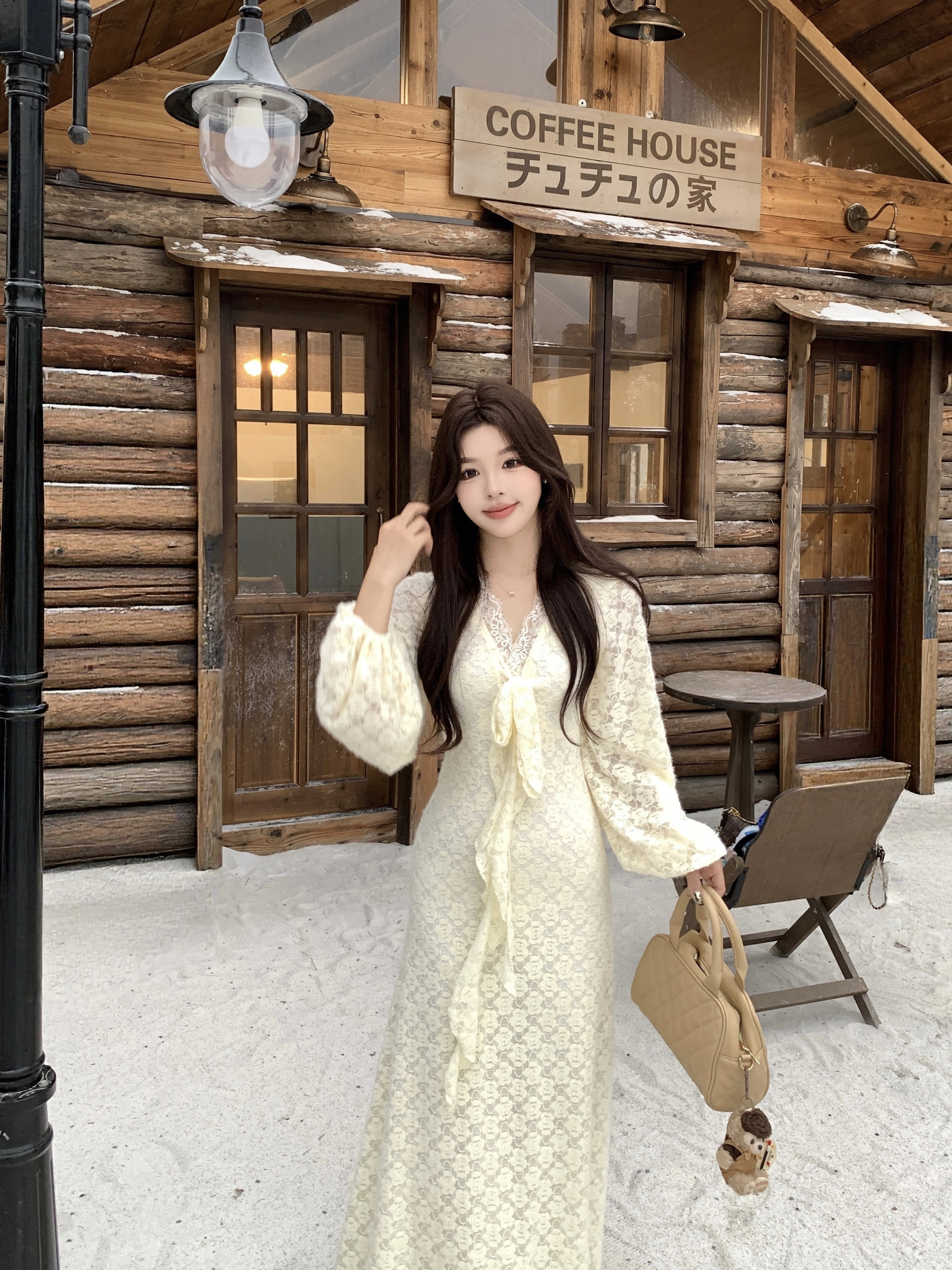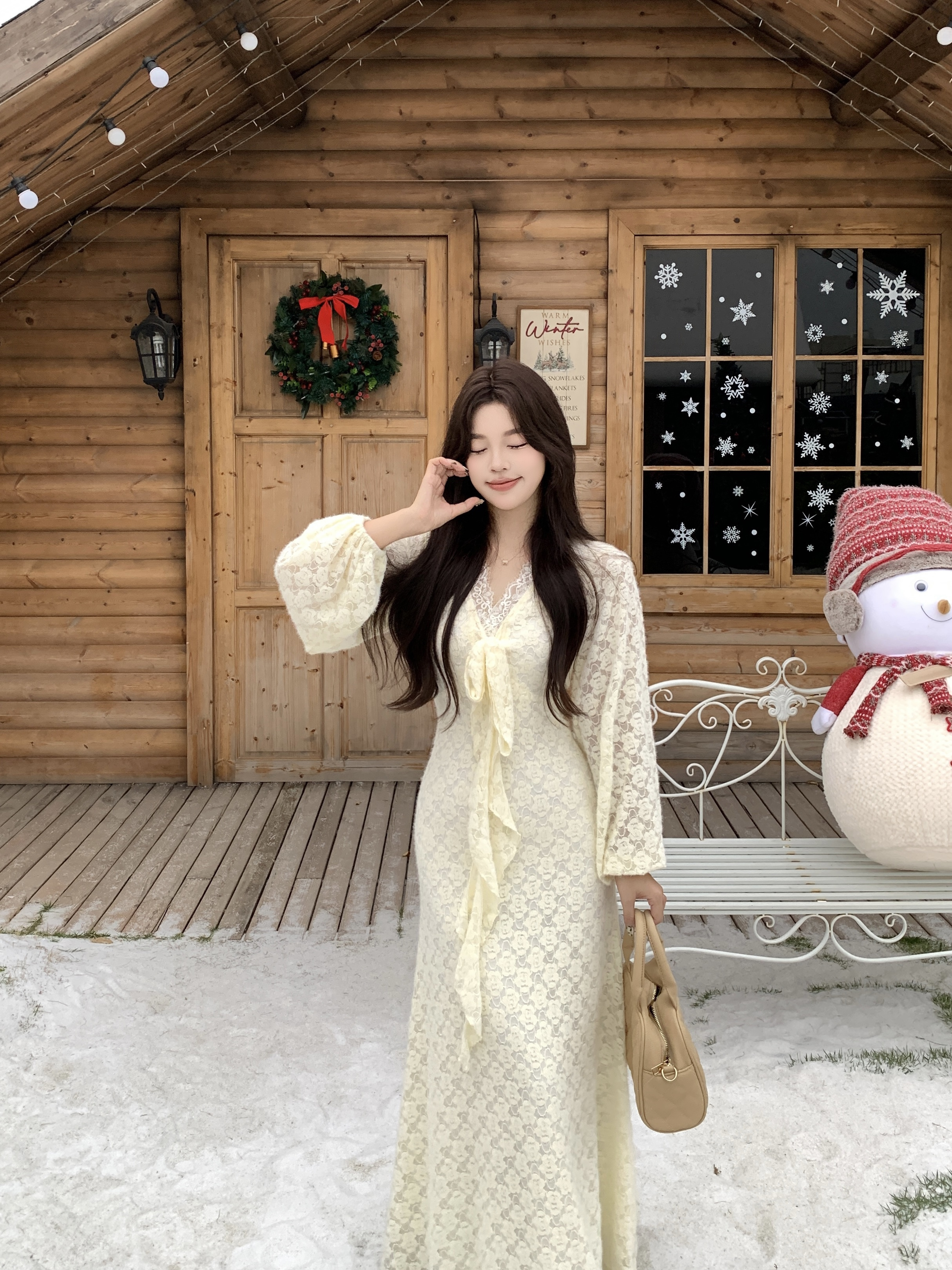 MY15096#大码韩系千金感收腰显瘦磨毛加绒气质法式温柔暖杏轻烟长裙女女裝貨源服裝批發