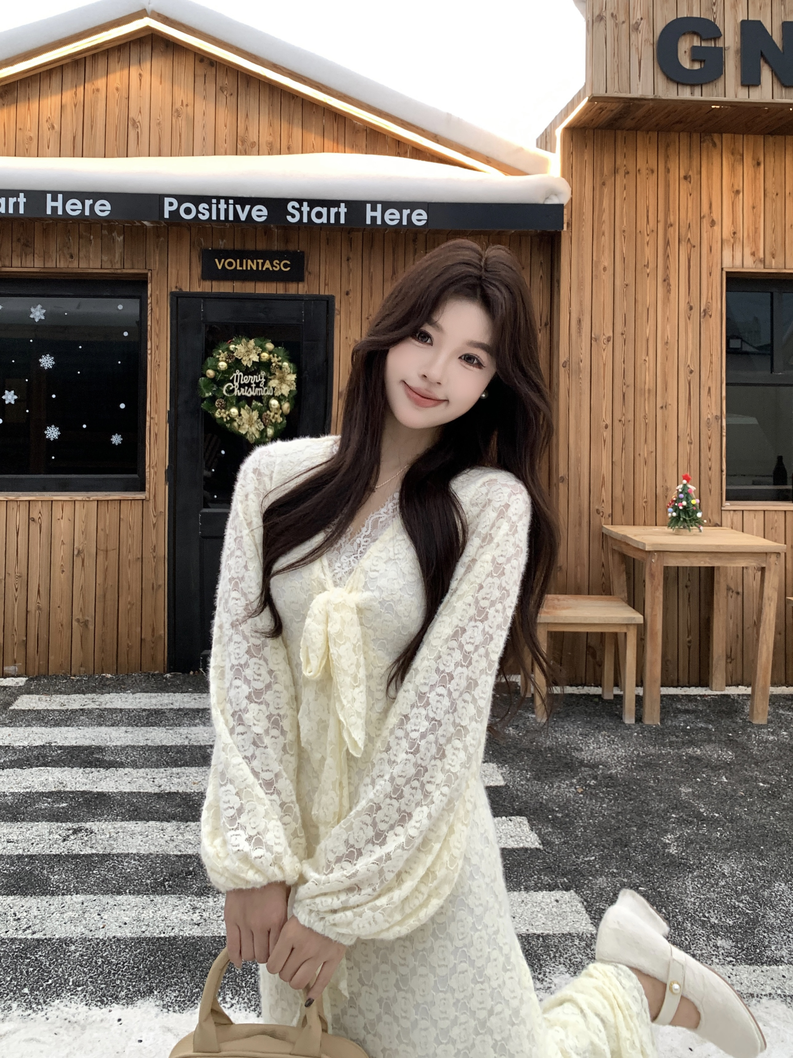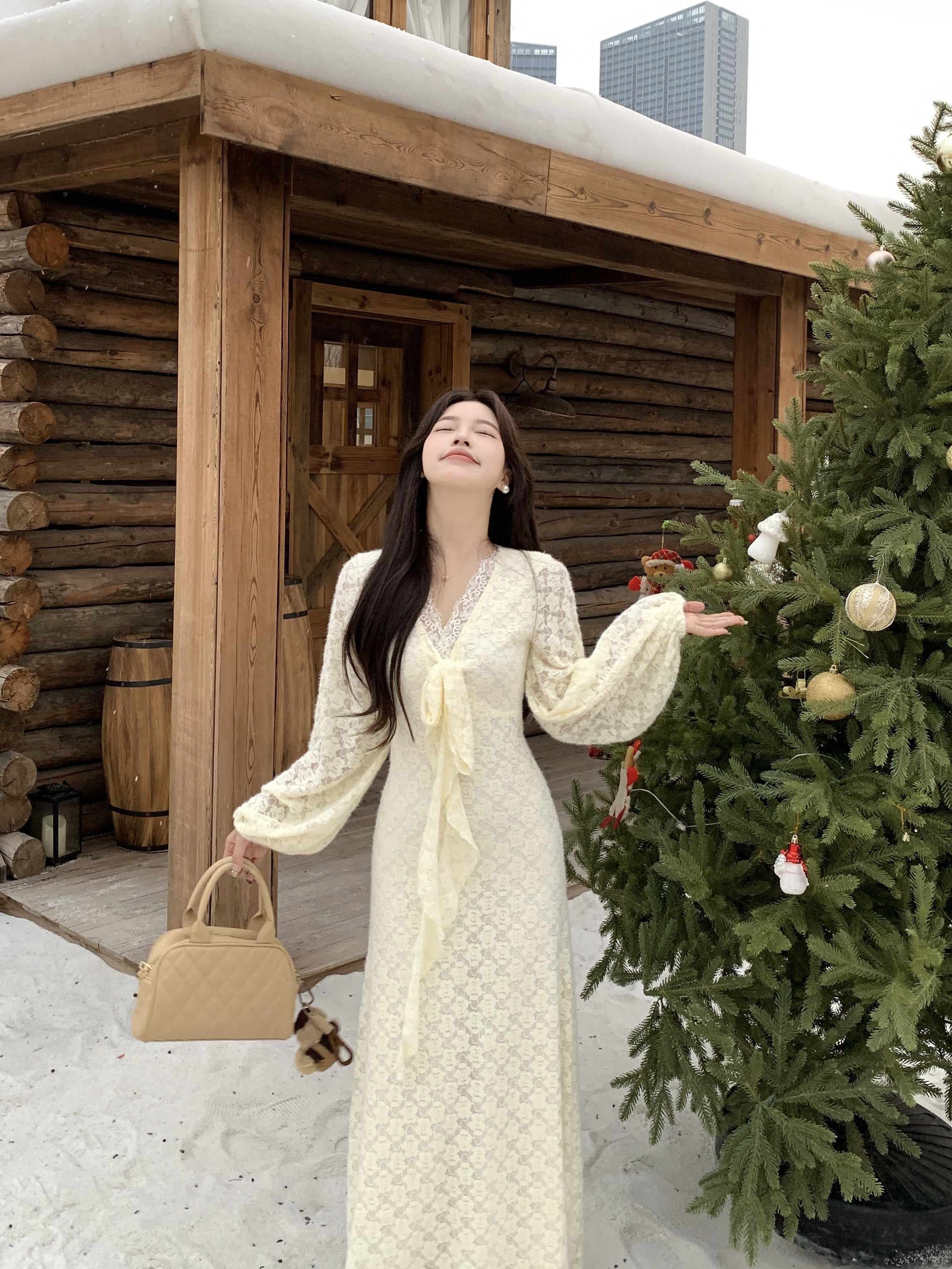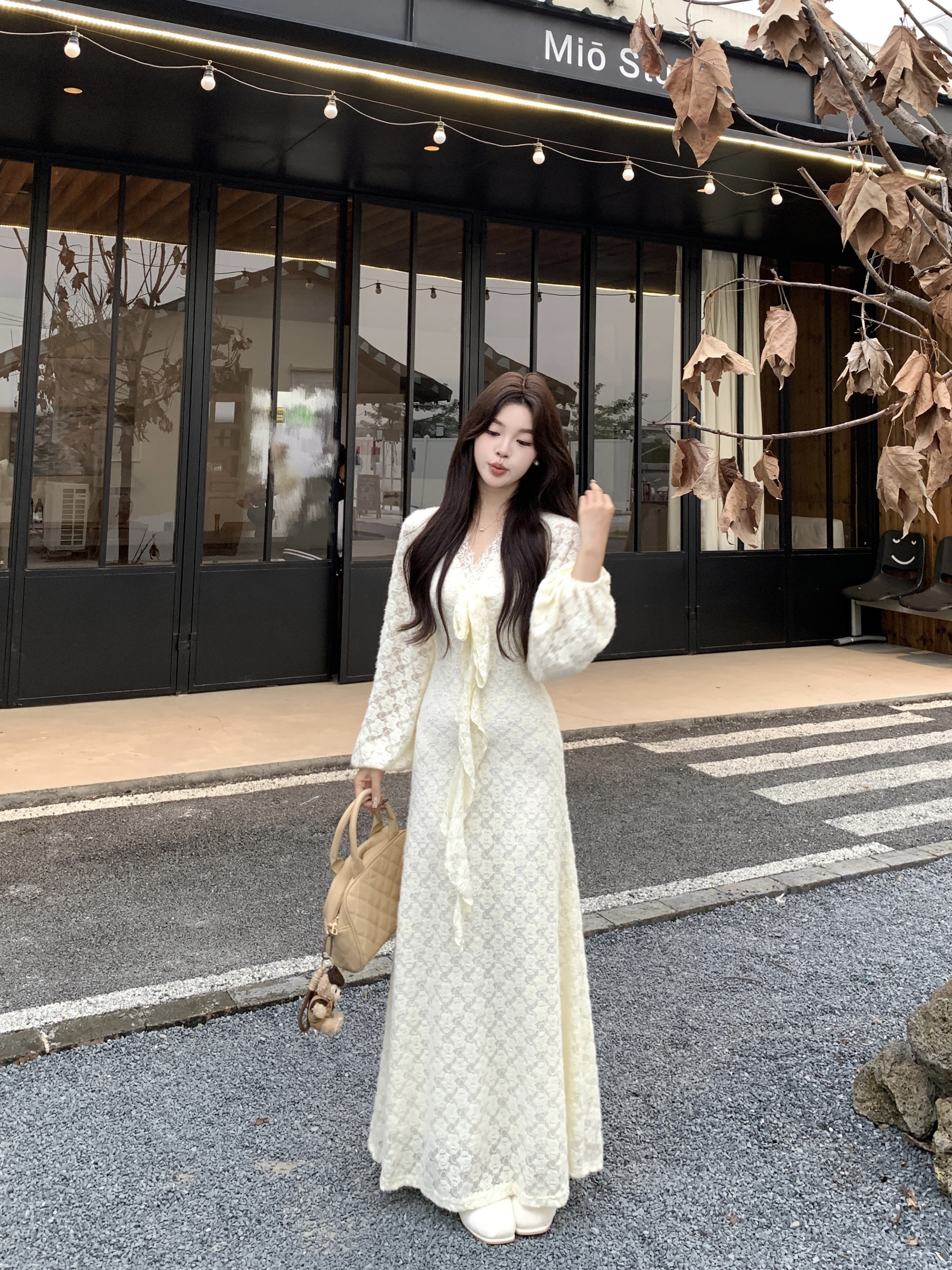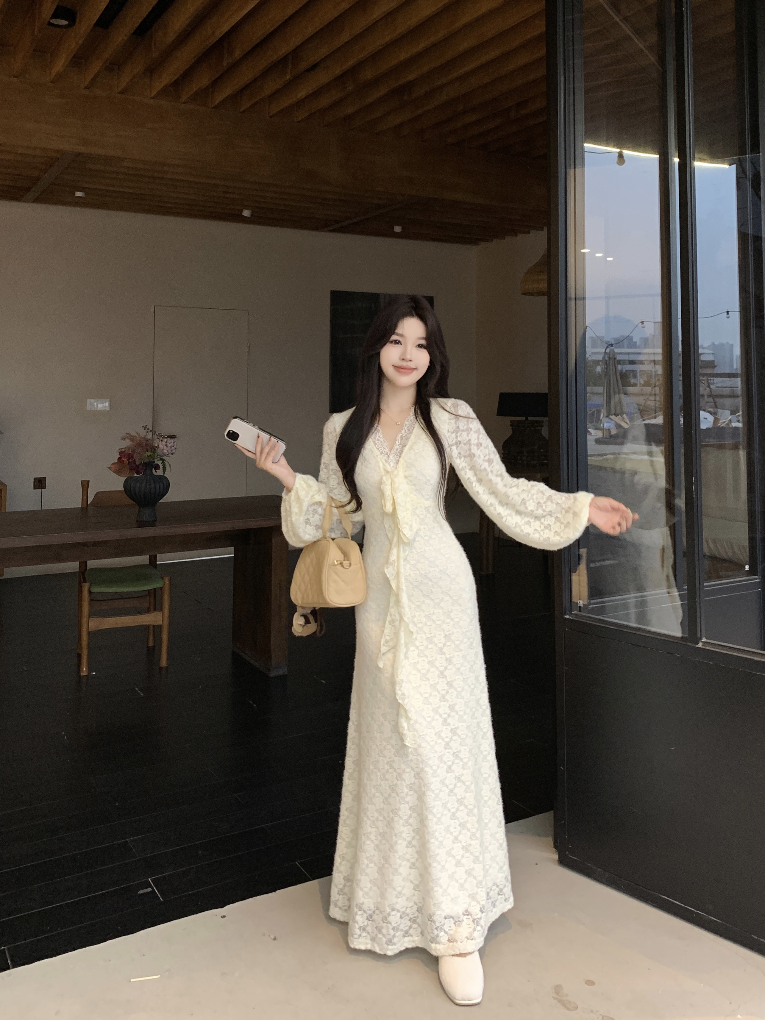 MY15096#大码韩系千金感收腰显瘦磨毛加绒气质法式温柔暖杏轻烟长裙女女裝貨源服裝批發