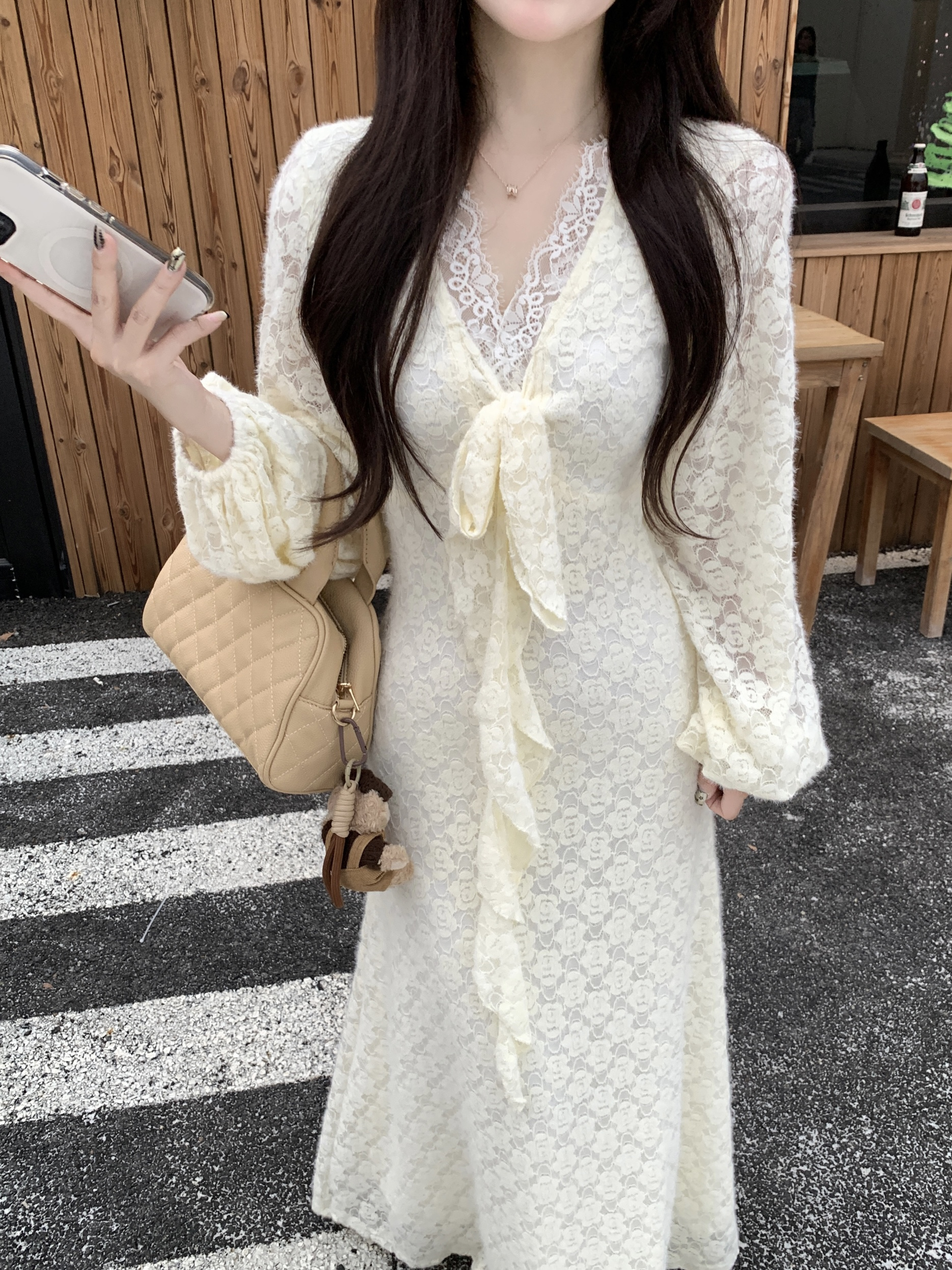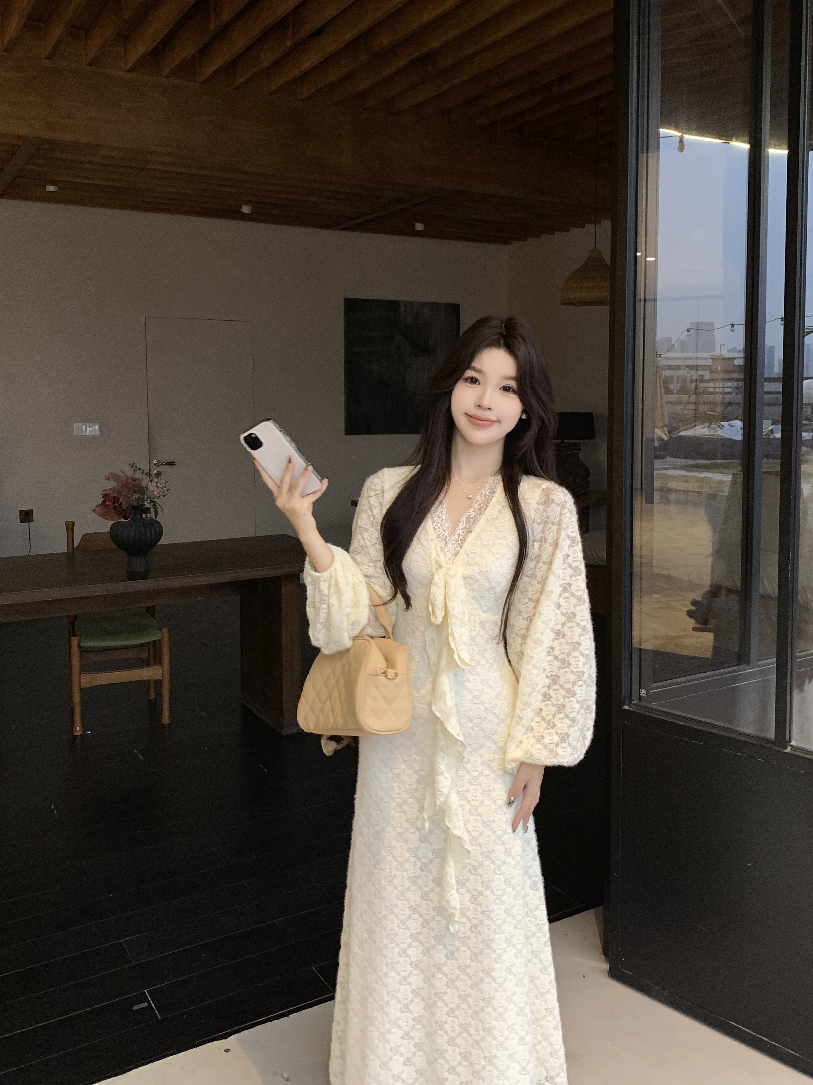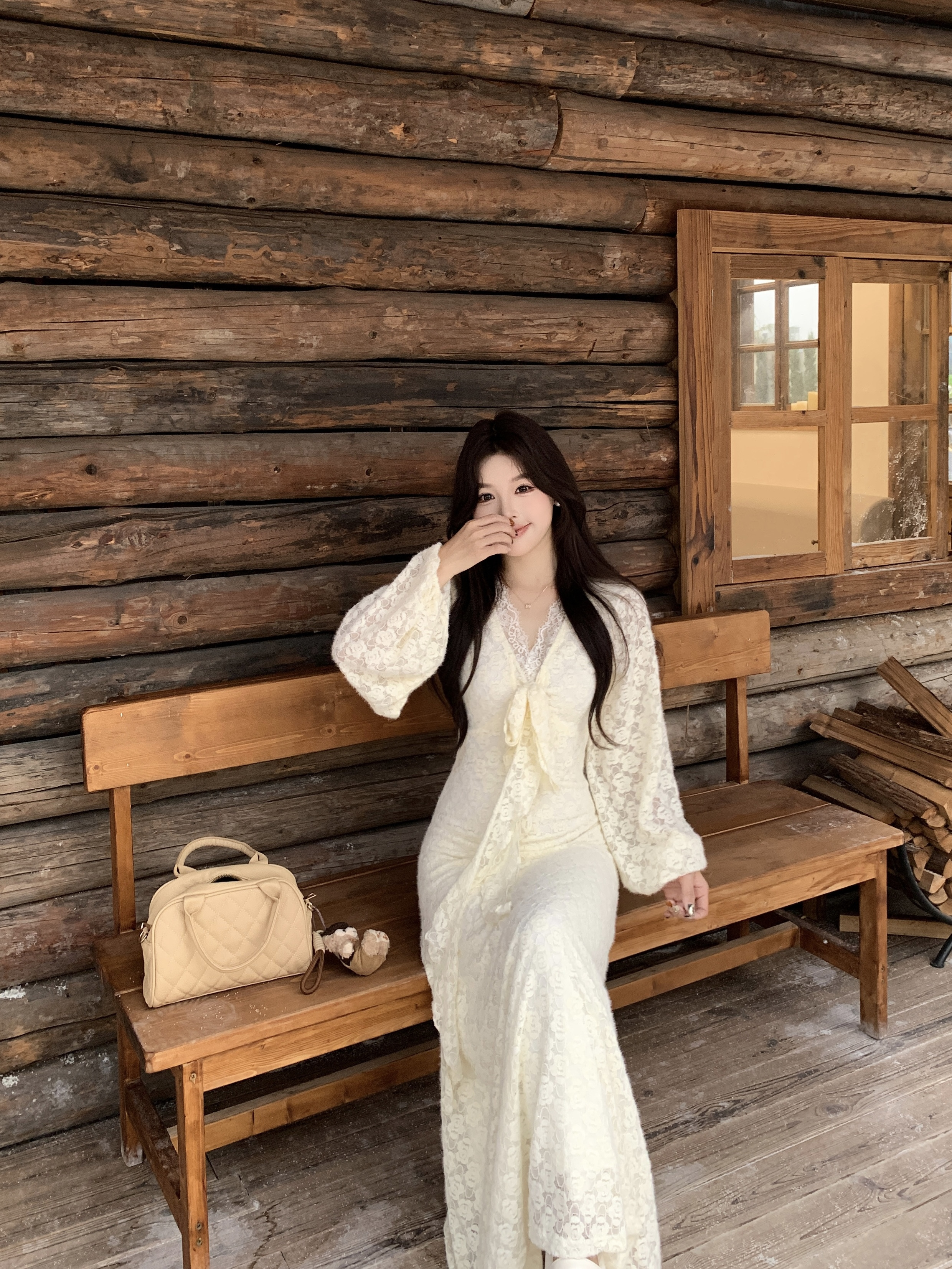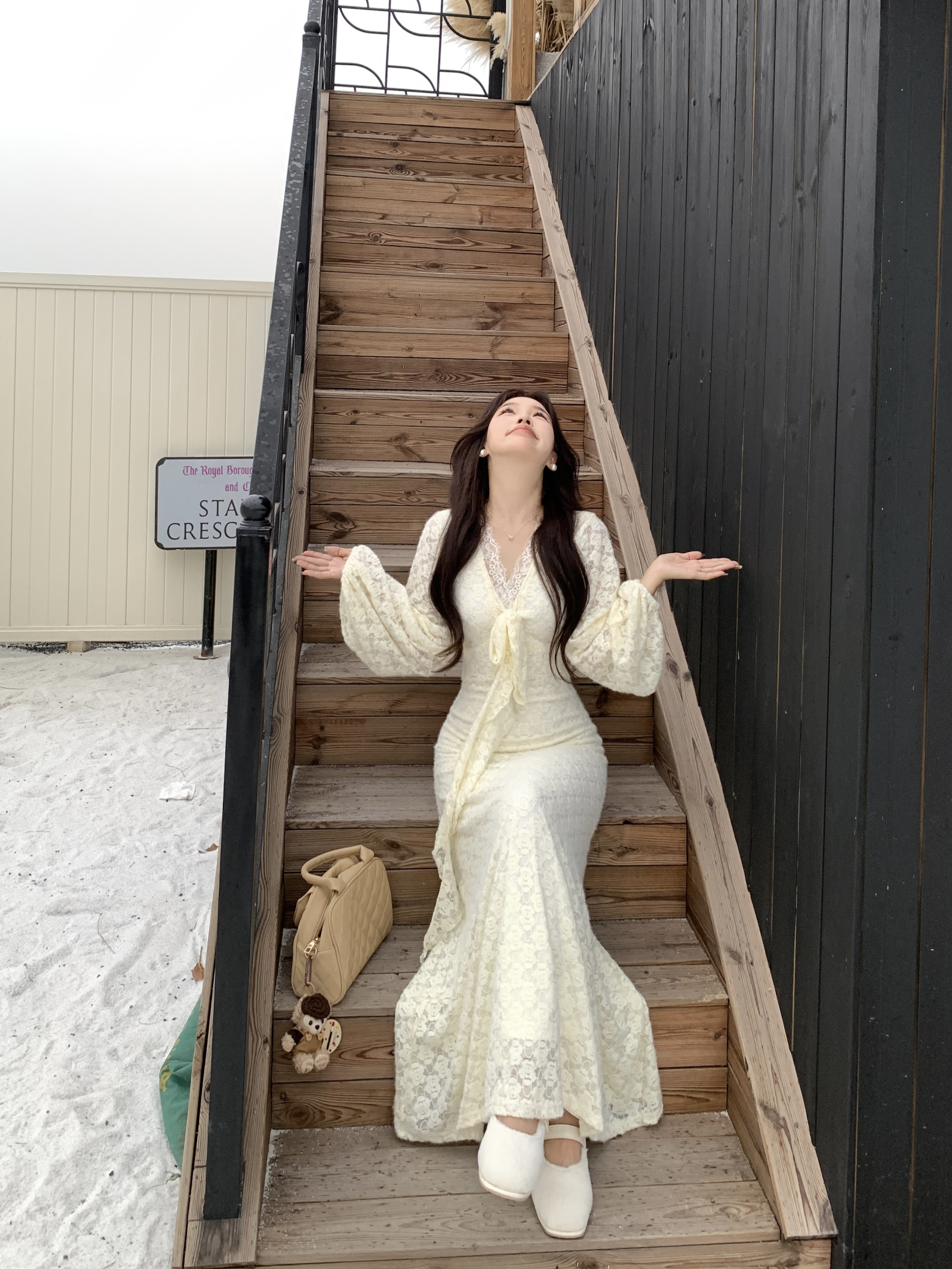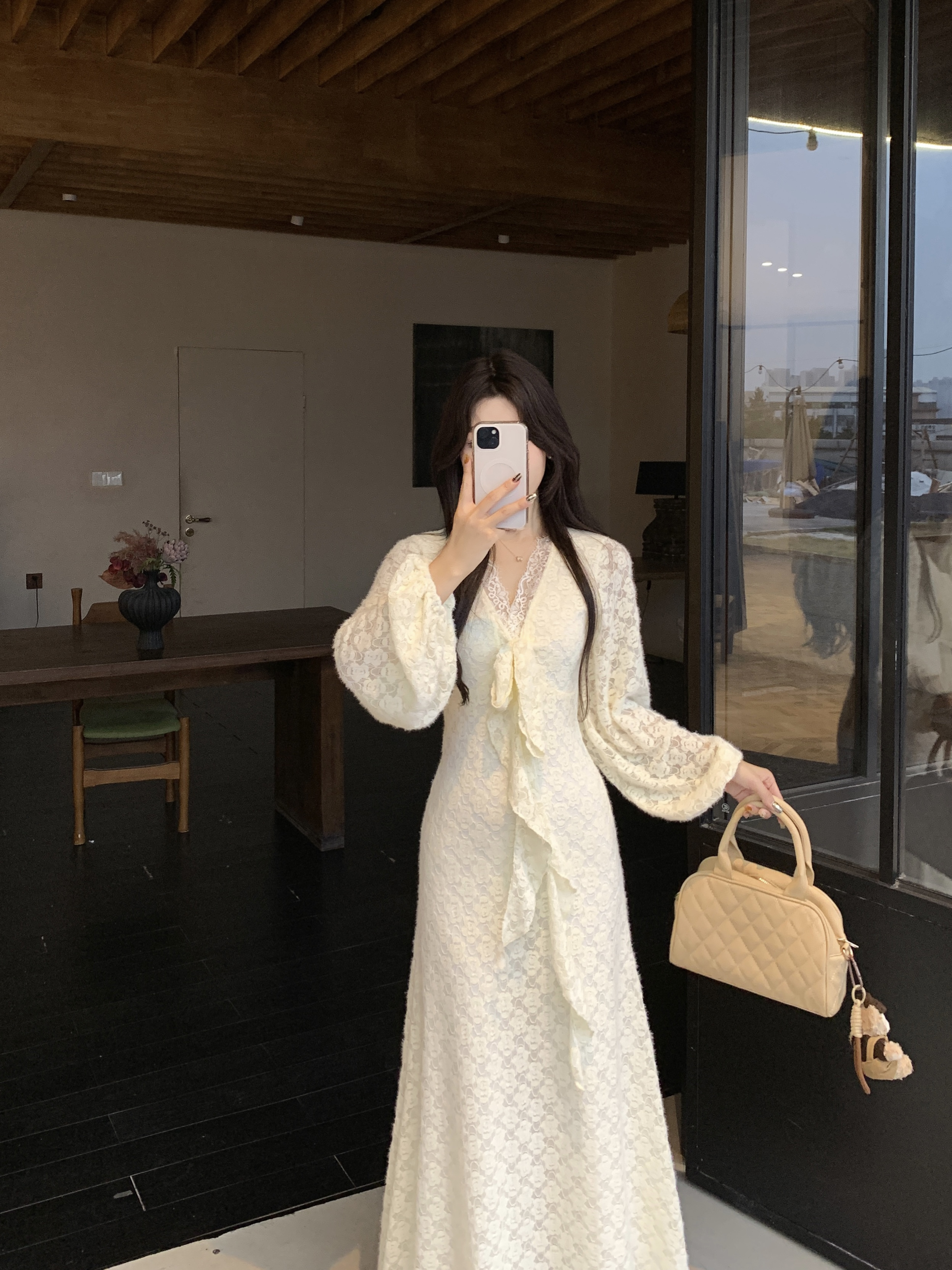 MY15096#大码韩系千金感收腰显瘦磨毛加绒气质法式温柔暖杏轻烟长裙女女裝貨源服裝批發
