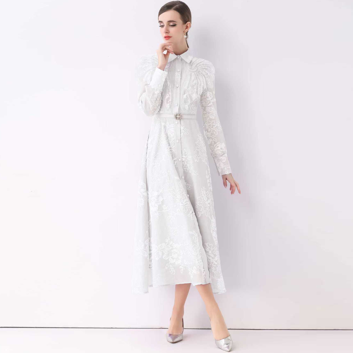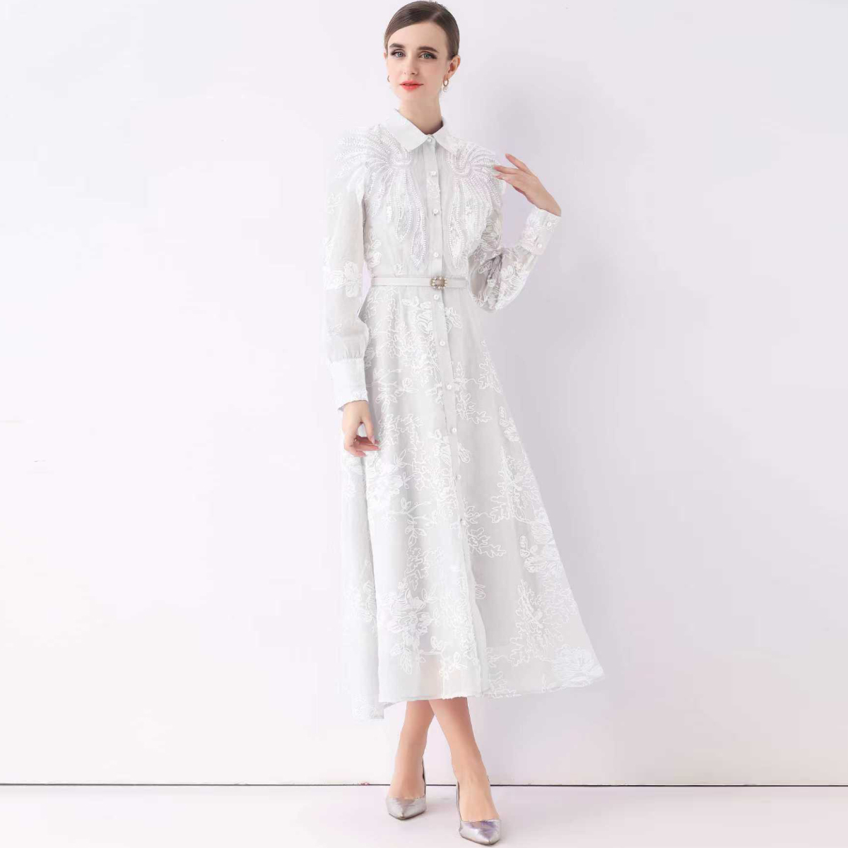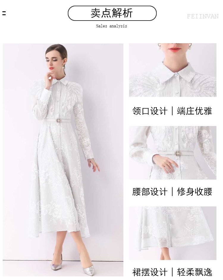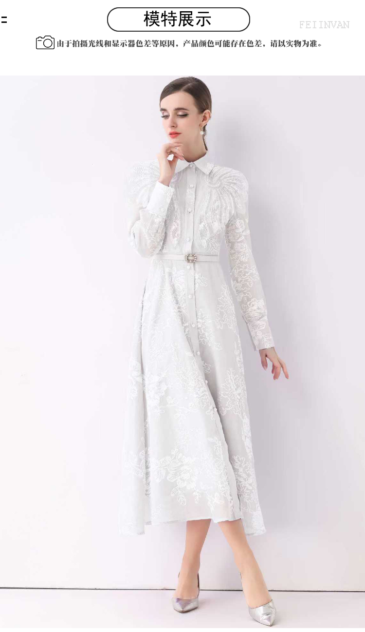 MY15316# 复古宫廷风新款翻领灯笼袖中长款刺绣纯色连衣裙送腰带女裝貨源服裝批發