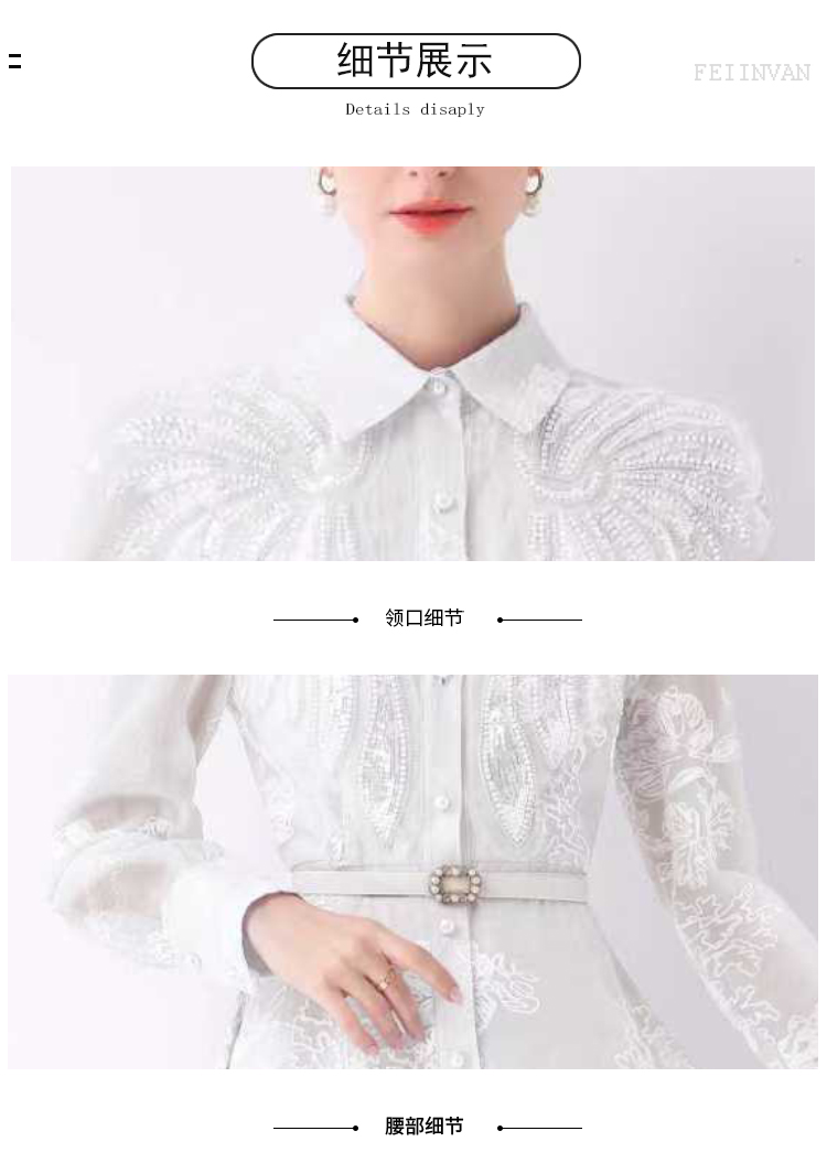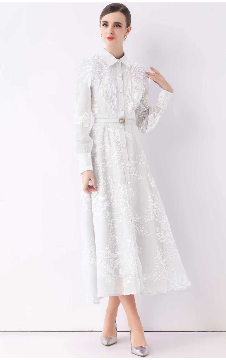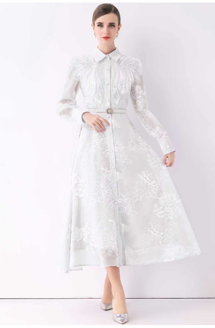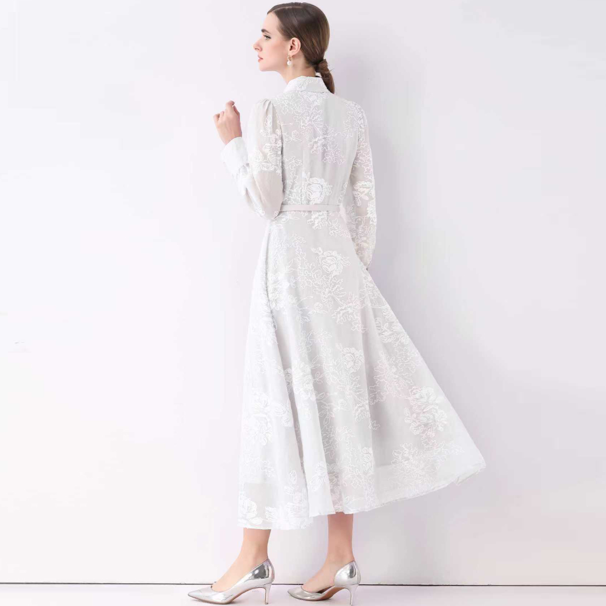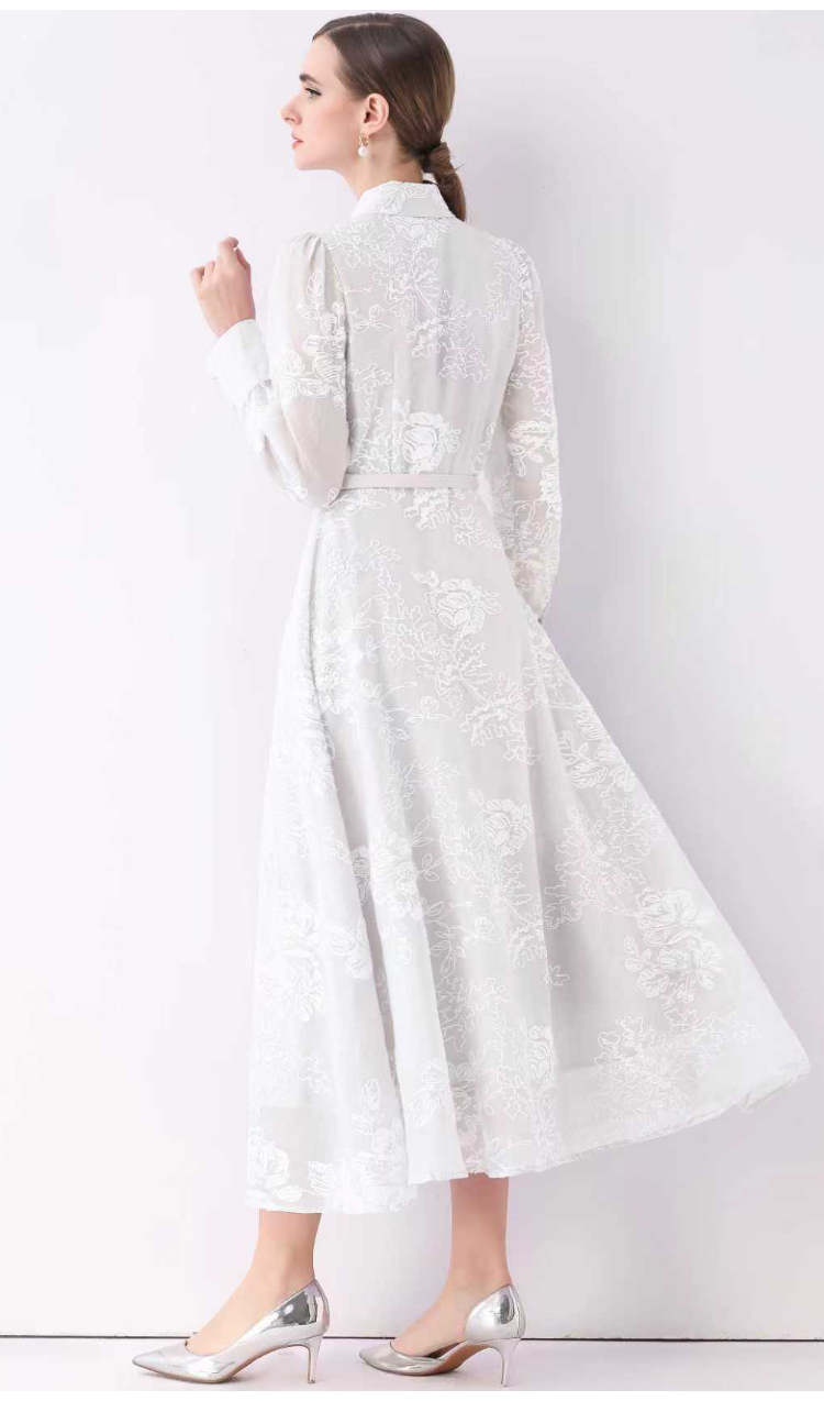MY15316# 复古宫廷风新款翻领灯笼袖中长款刺绣纯色连衣裙送腰带女裝貨源服裝批發
