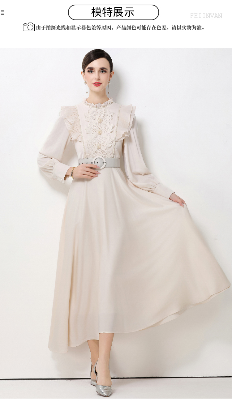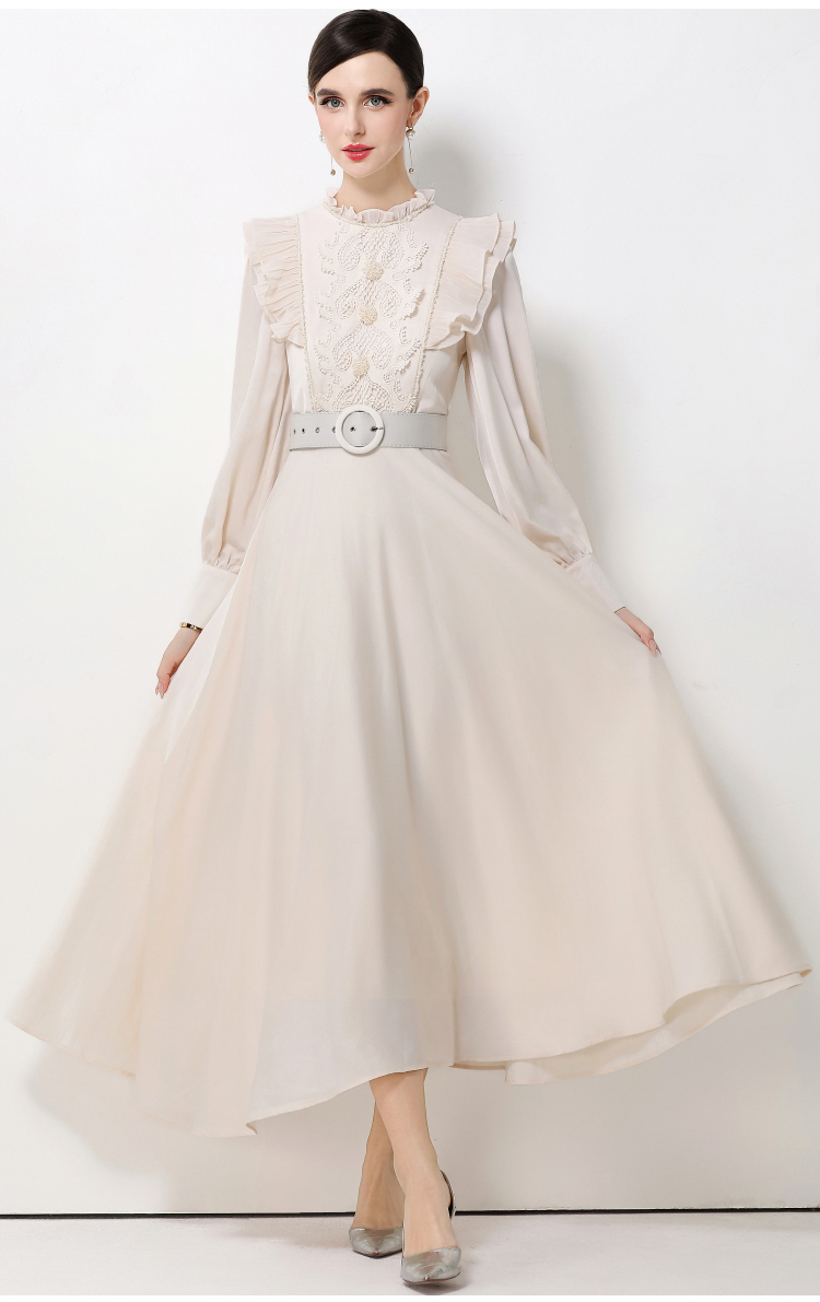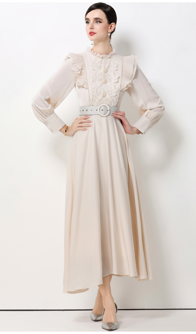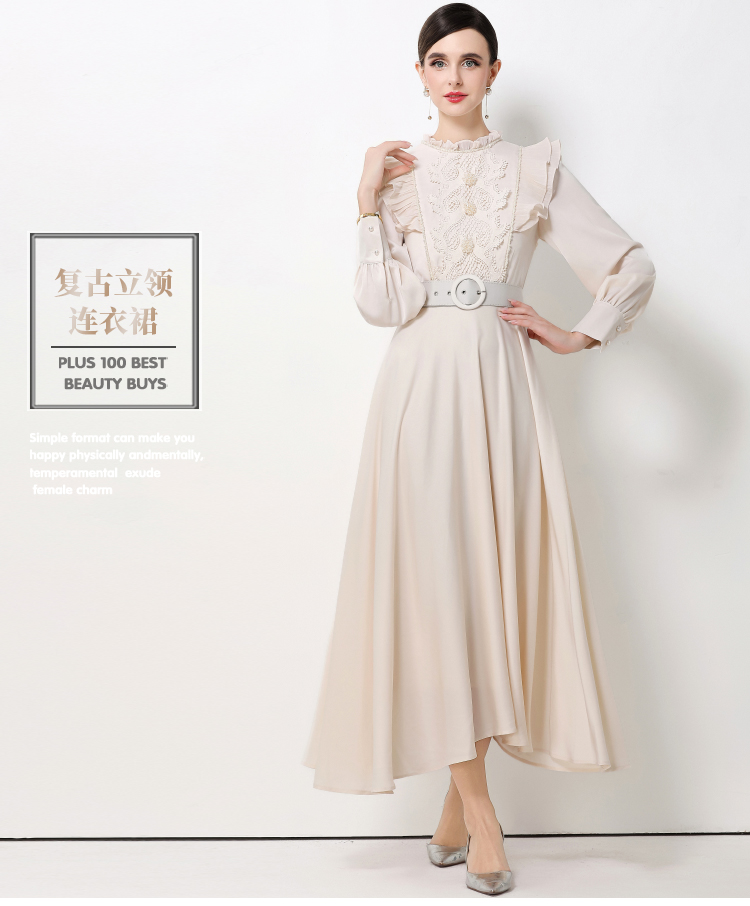 MY15325# 新款复古气质优雅立领荷叶边长袖收腰长款连衣裙长裙送腰带女裝貨源服裝批發