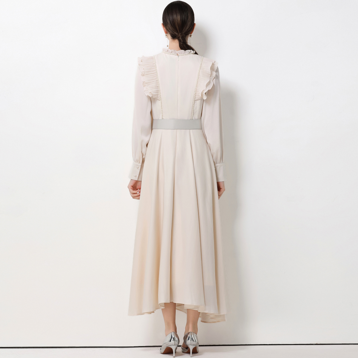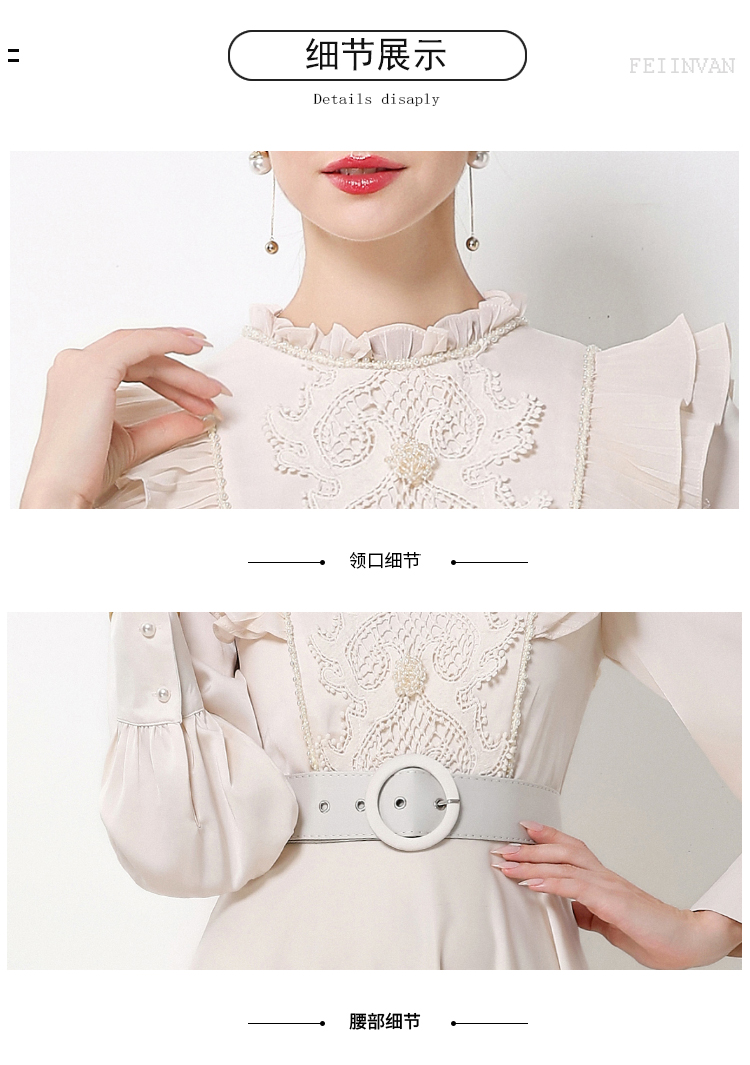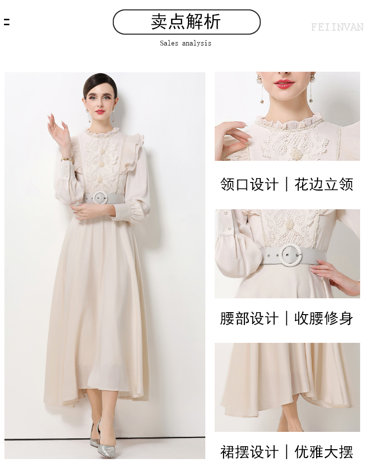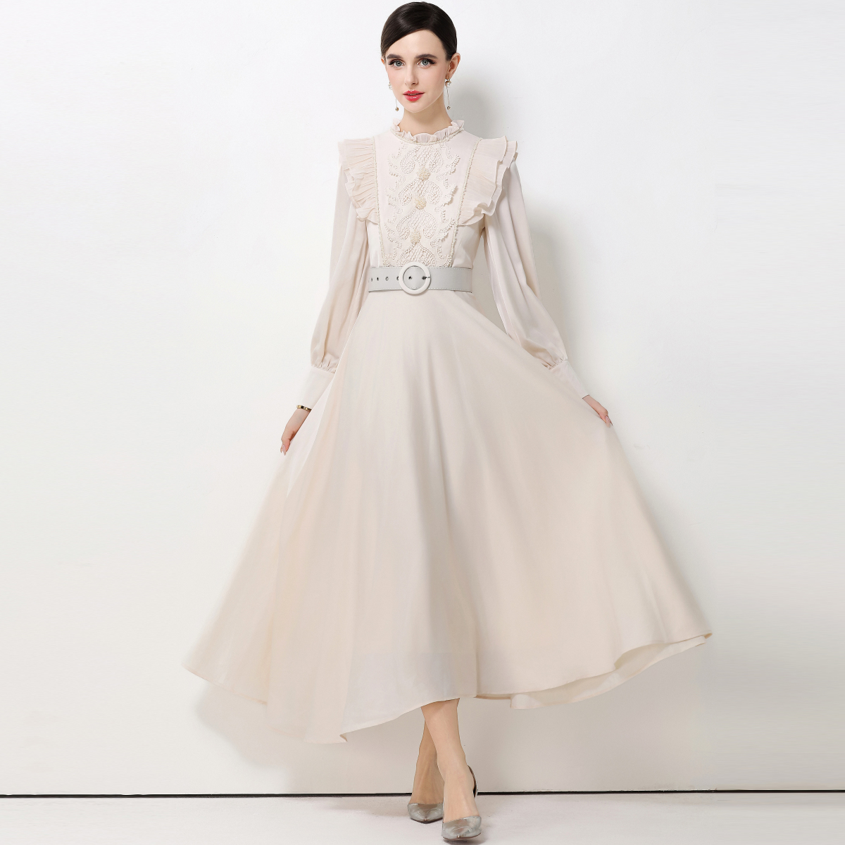 MY15325# 新款复古气质优雅立领荷叶边长袖收腰长款连衣裙长裙送腰带女裝貨源服裝批發