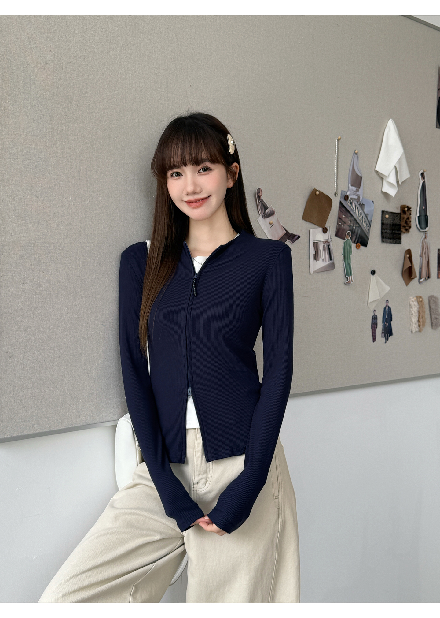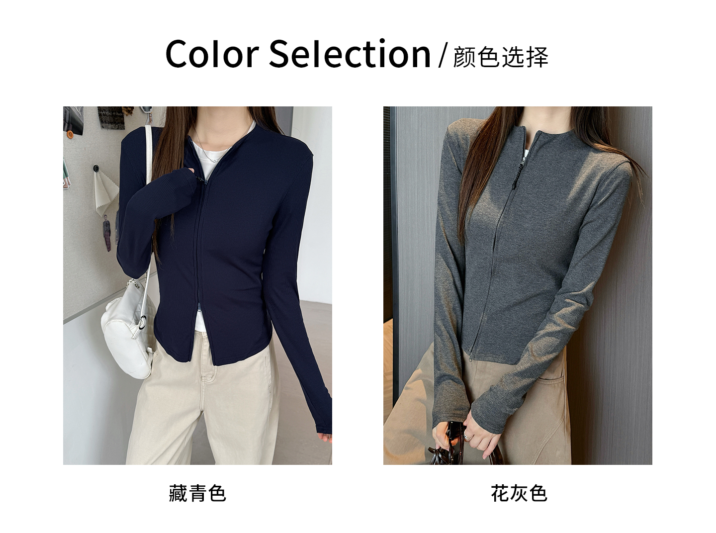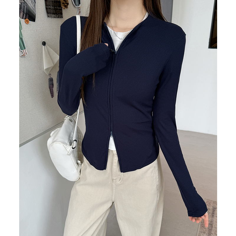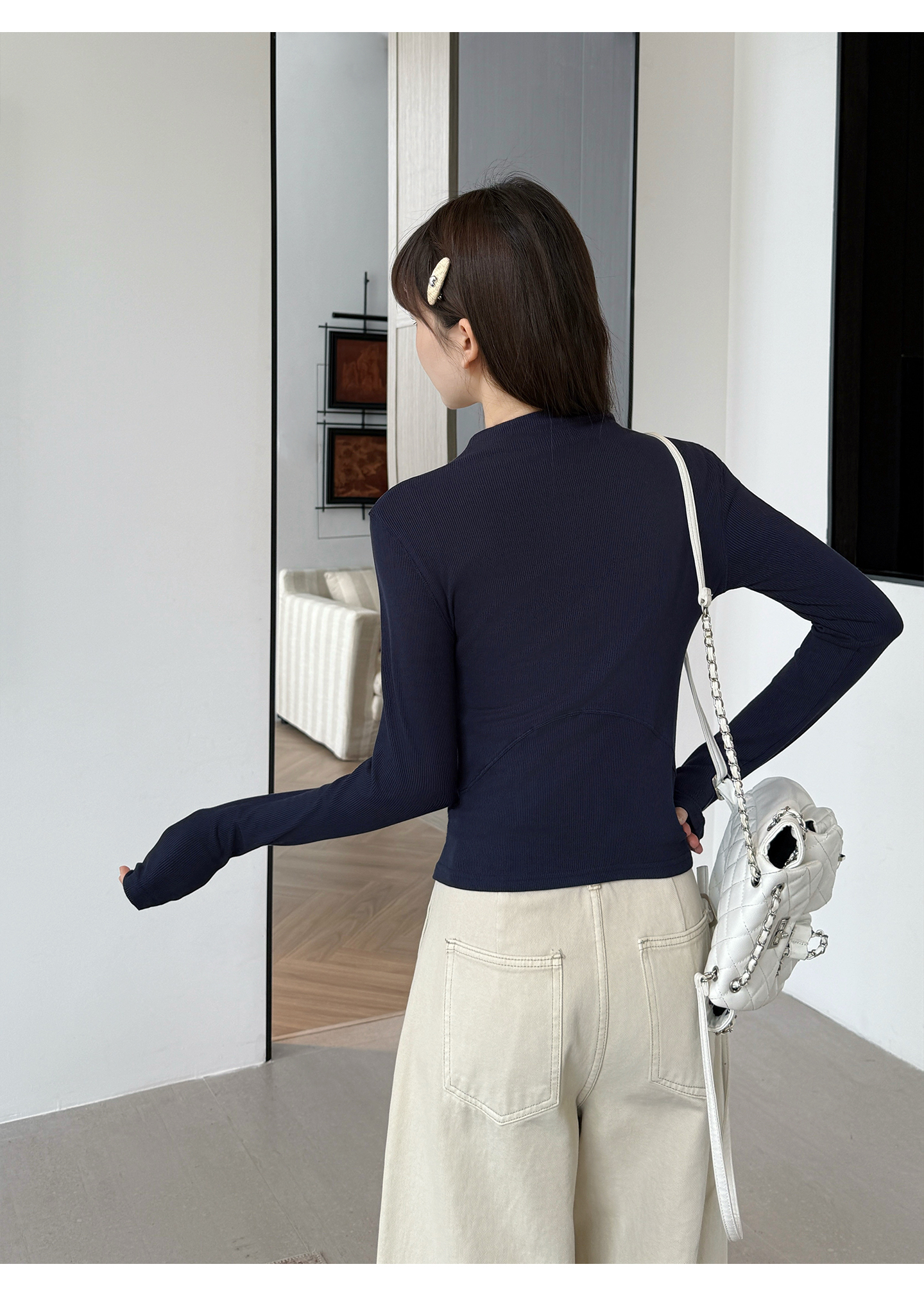 MY15378# 立领双拉链长袖t恤女上衣中领半高领打底衫女内搭女裝貨源服裝批發