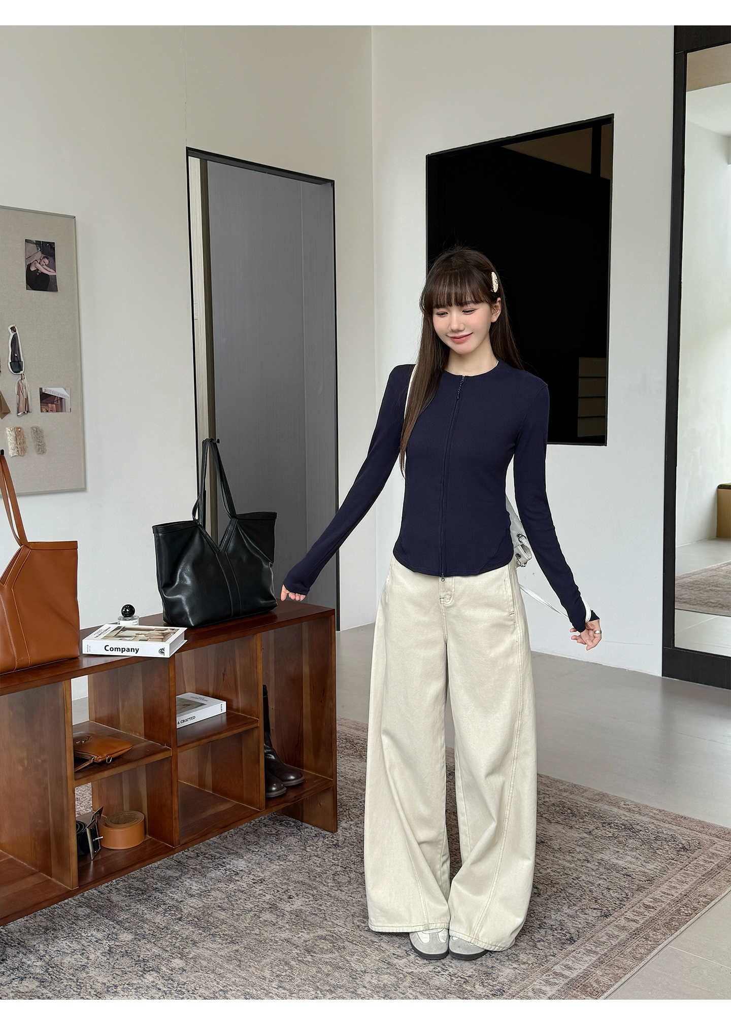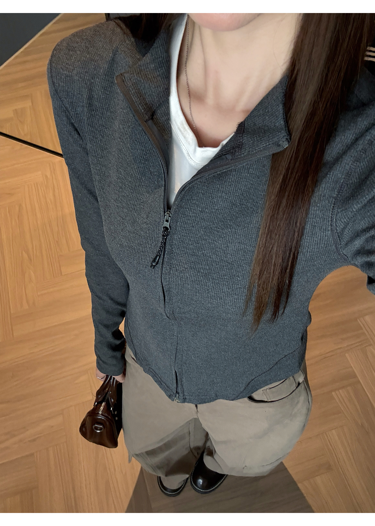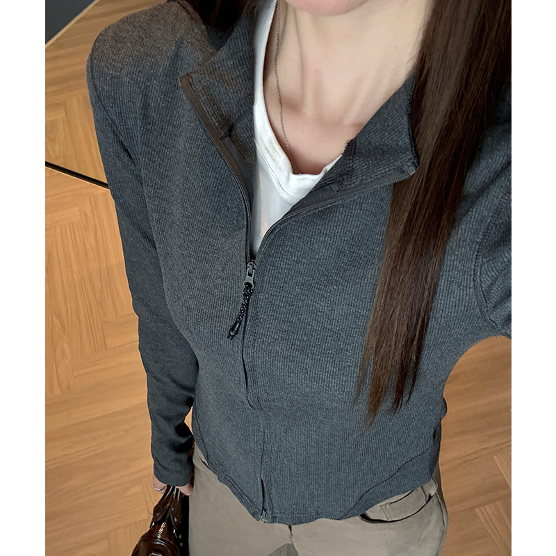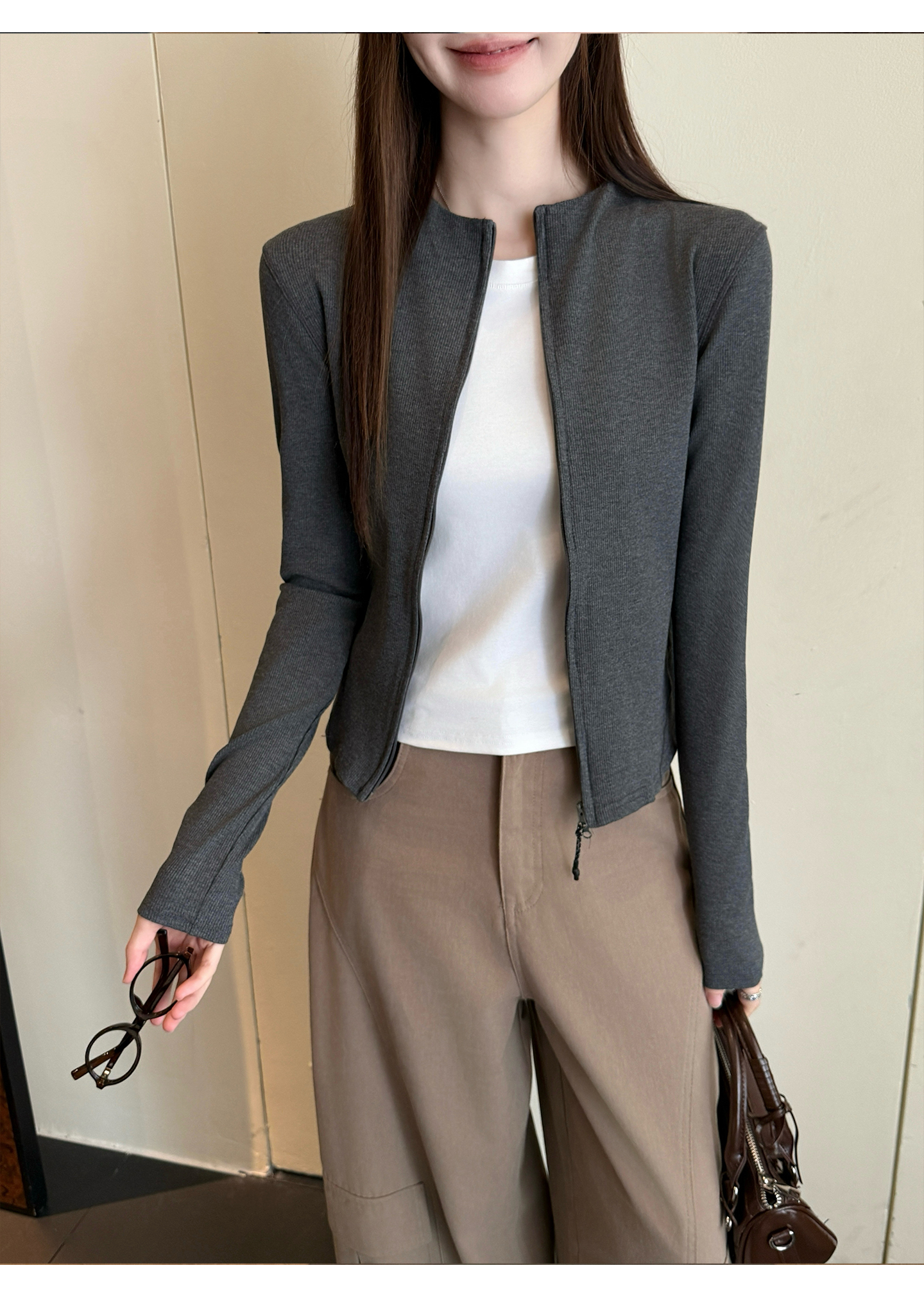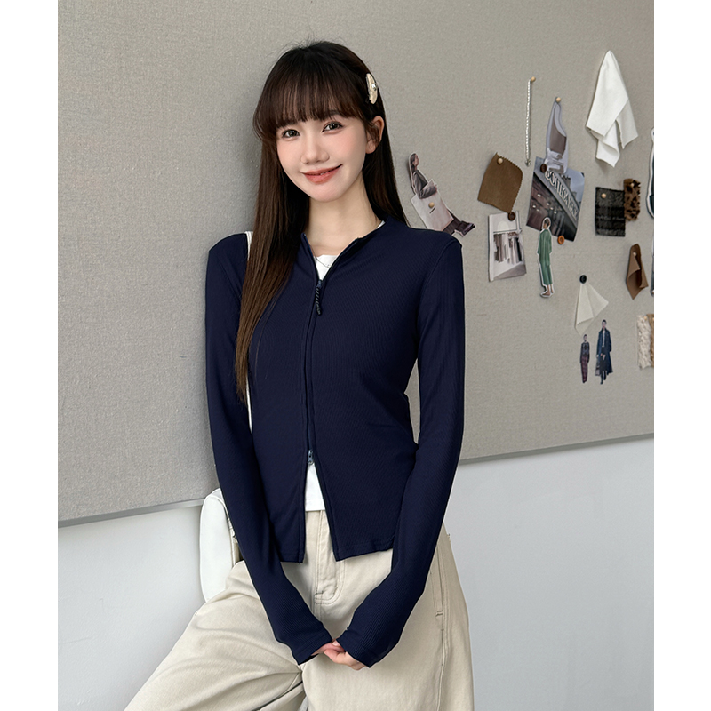 MY15378# 立领双拉链长袖t恤女上衣中领半高领打底衫女内搭女裝貨源服裝批發