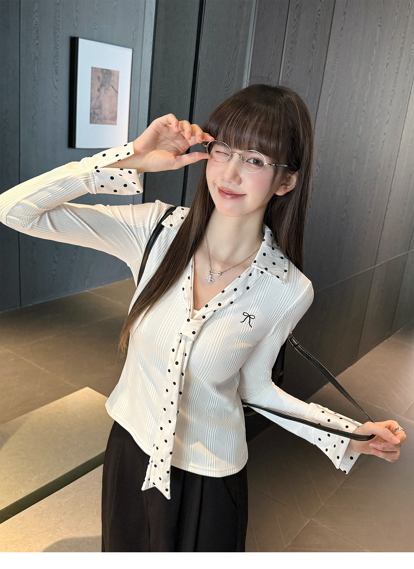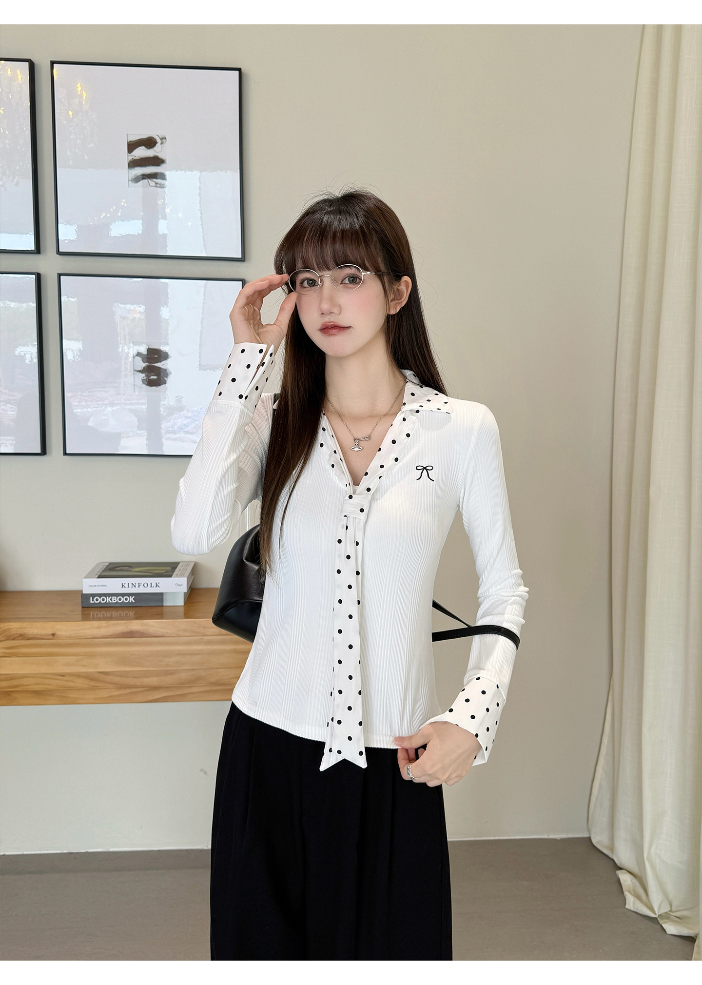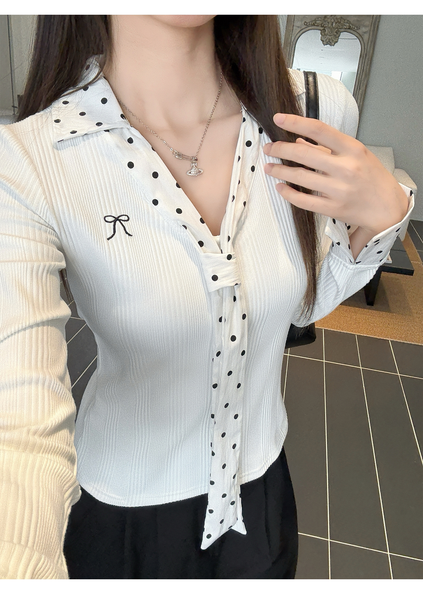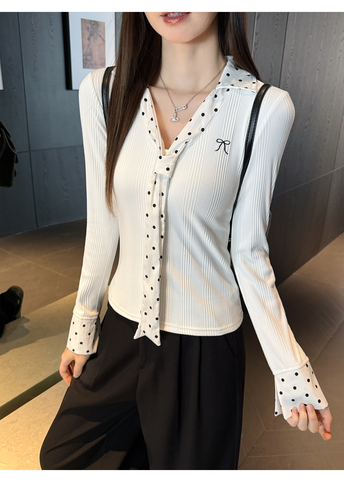 MY15379# 白色波点领带v领长袖t恤女新款设计感修身内搭女裝貨源服裝批發