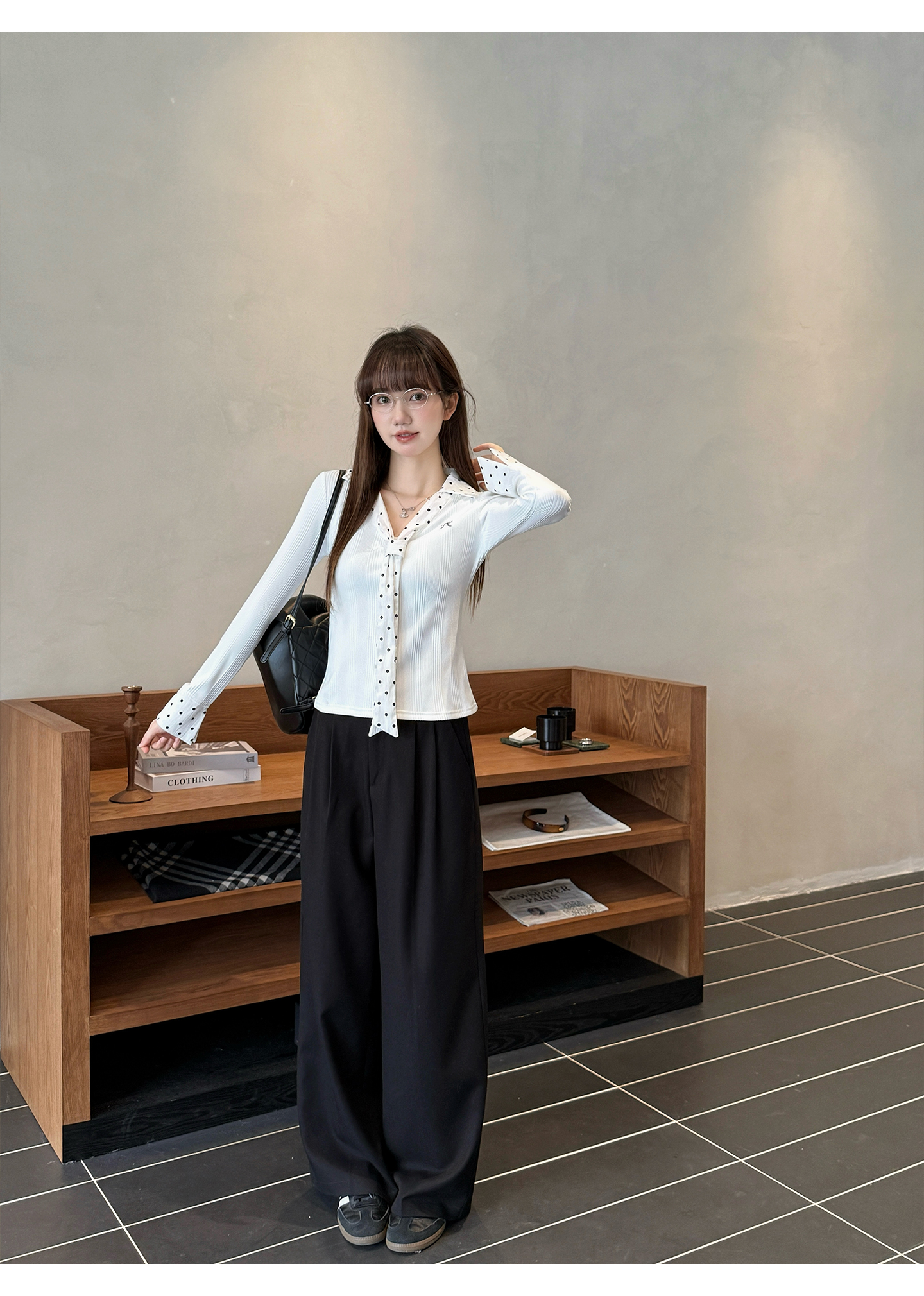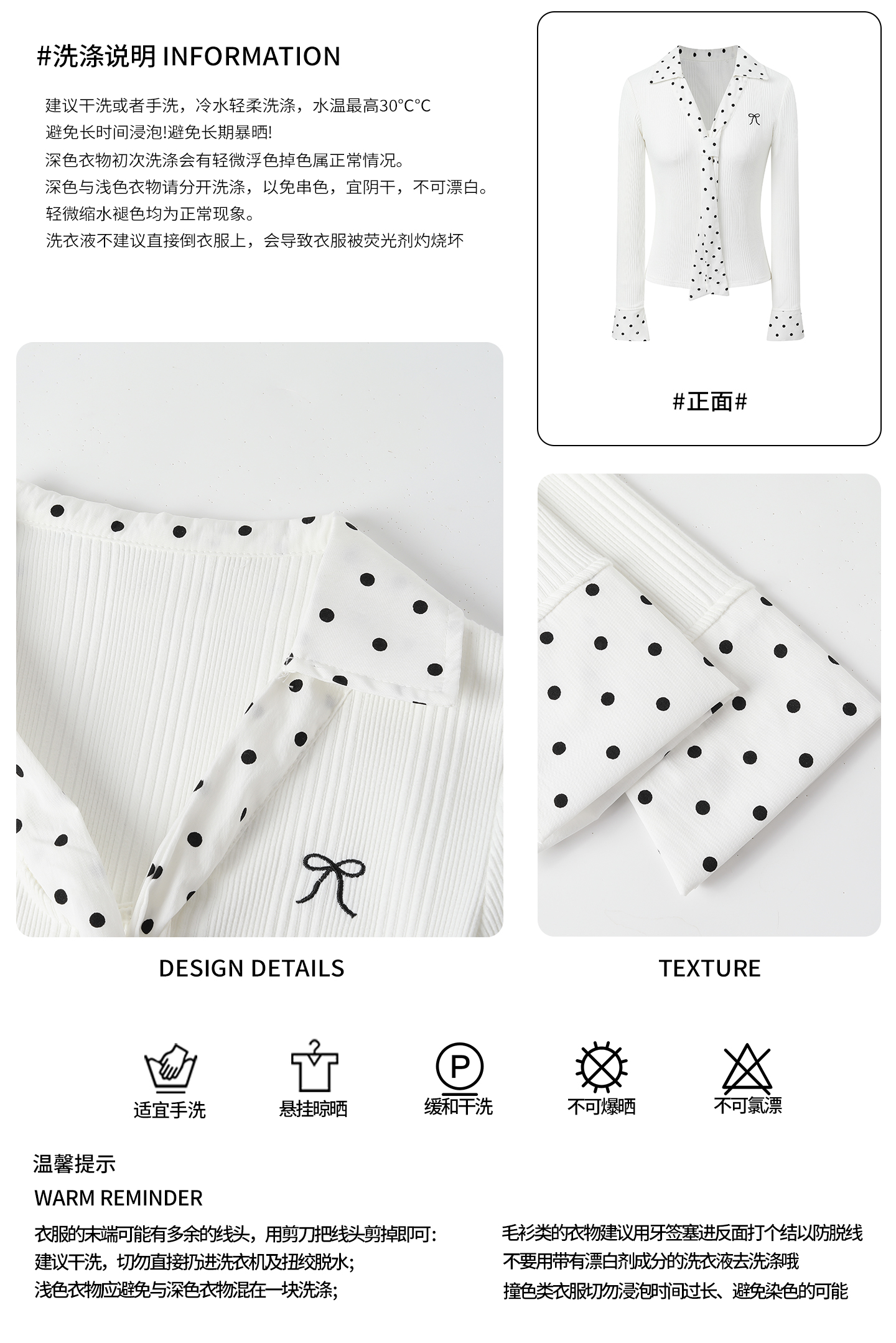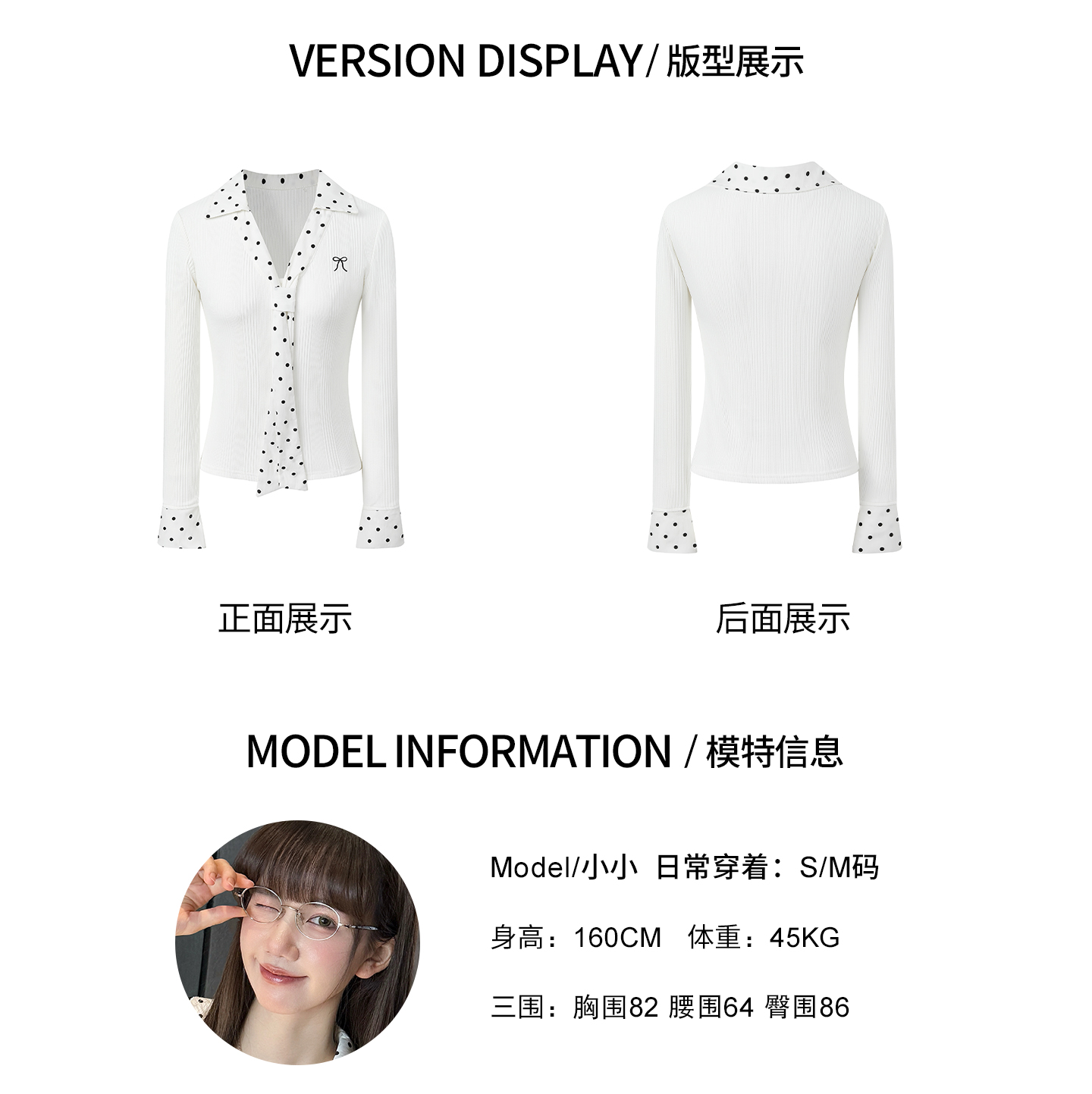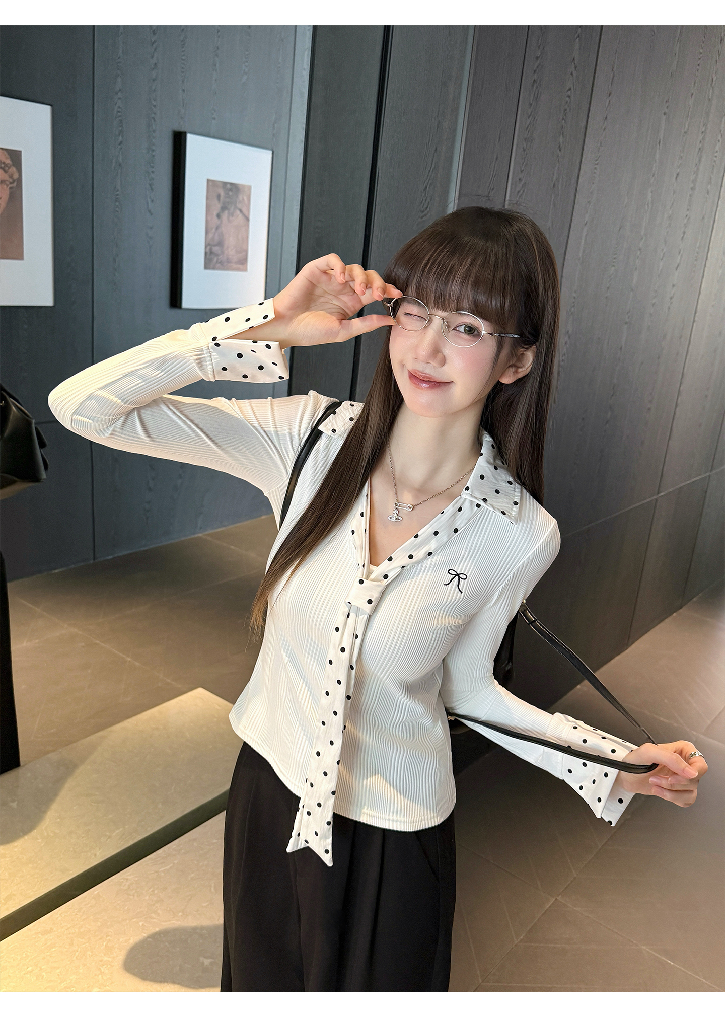 MY15379# 白色波点领带v领长袖t恤女新款设计感修身内搭女裝貨源服裝批發