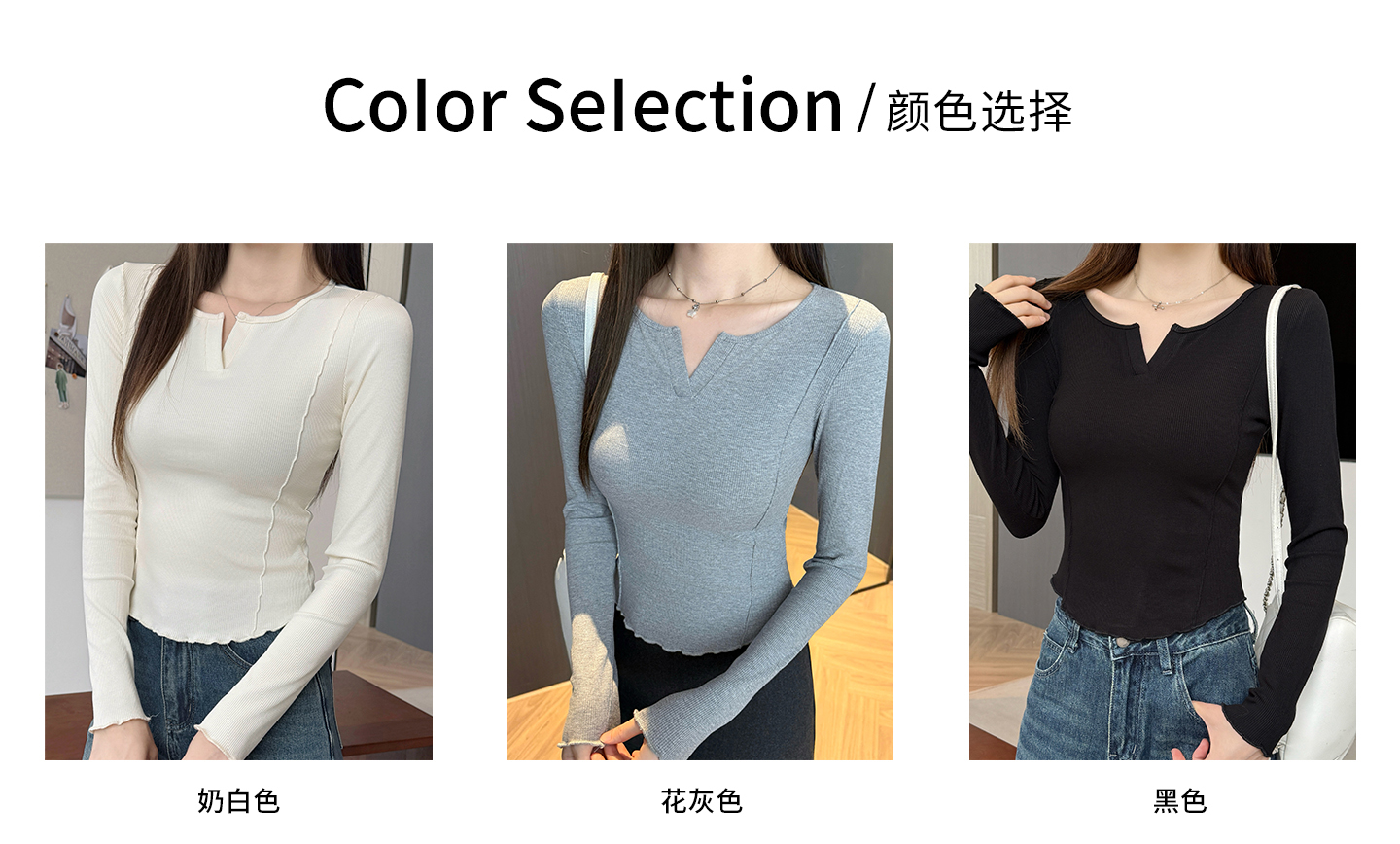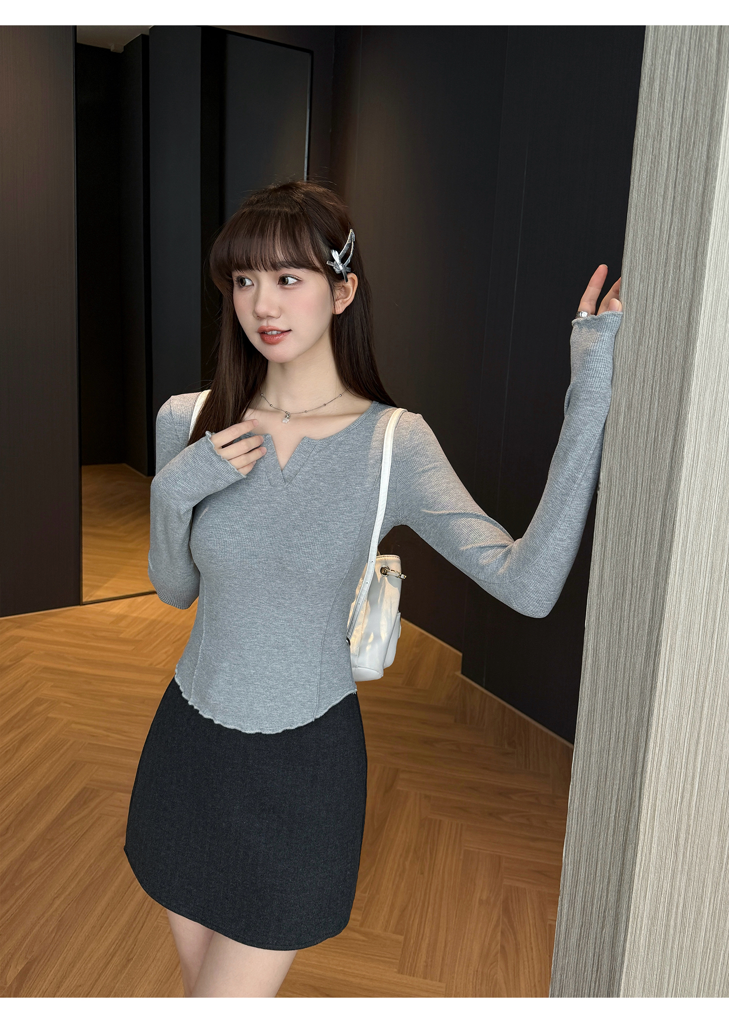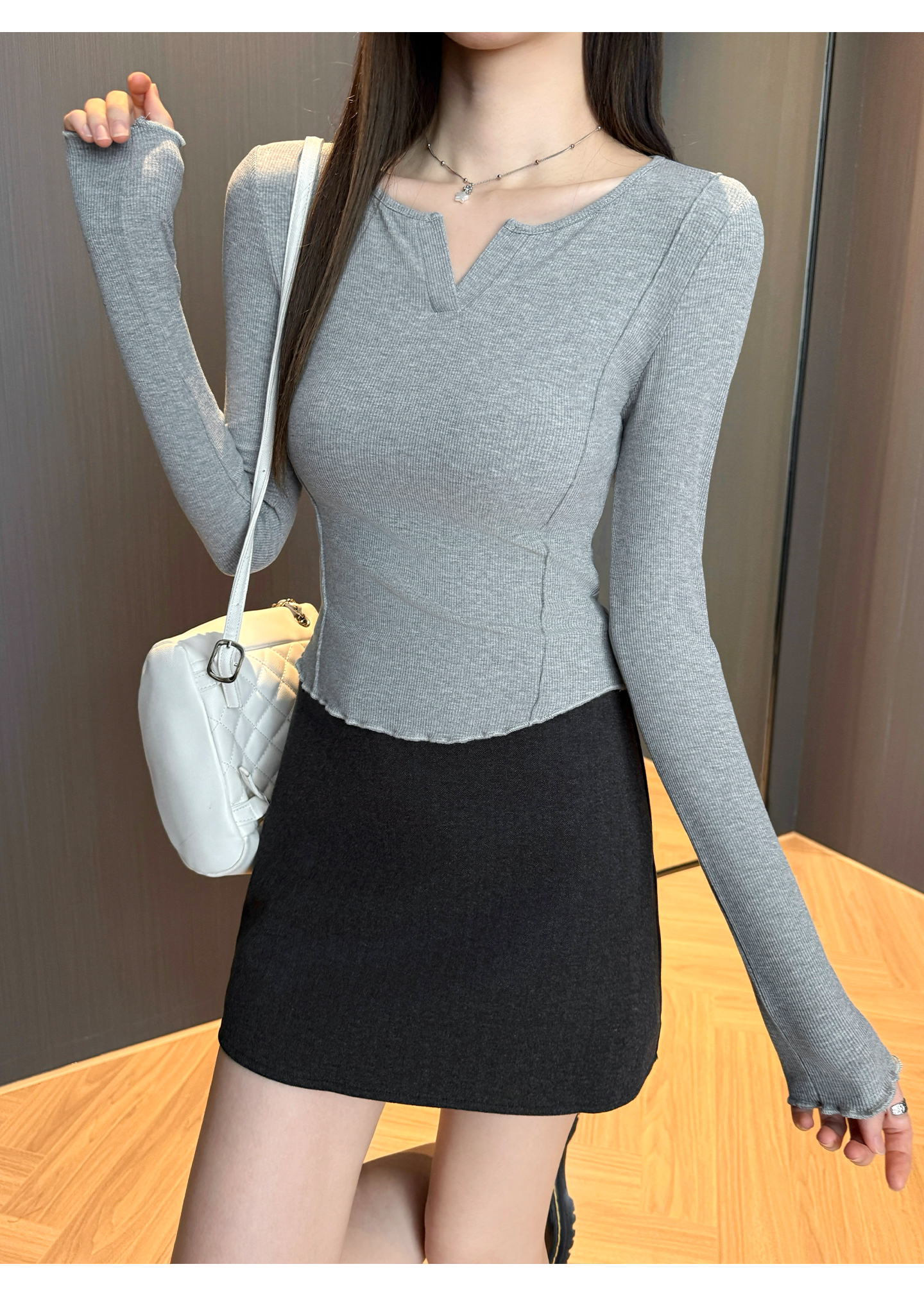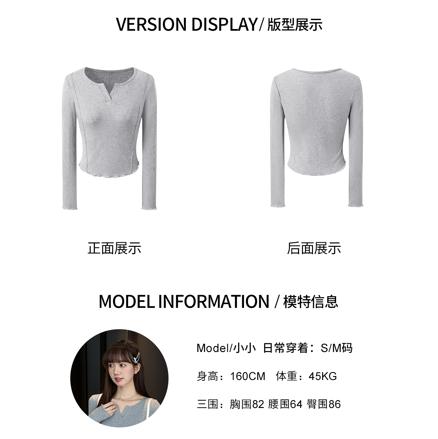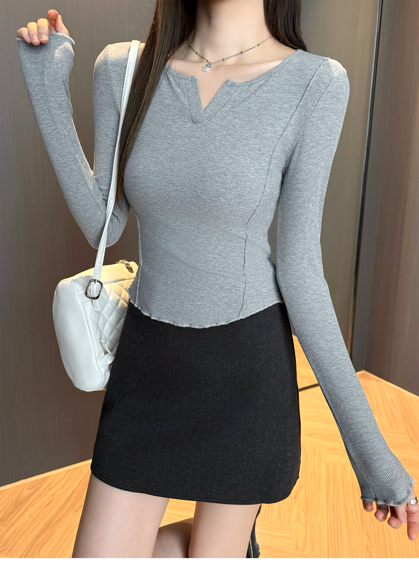 MY15380# 灰色正肩v领长袖t恤新款设计感修身内搭打底衫女裝貨源服裝批發