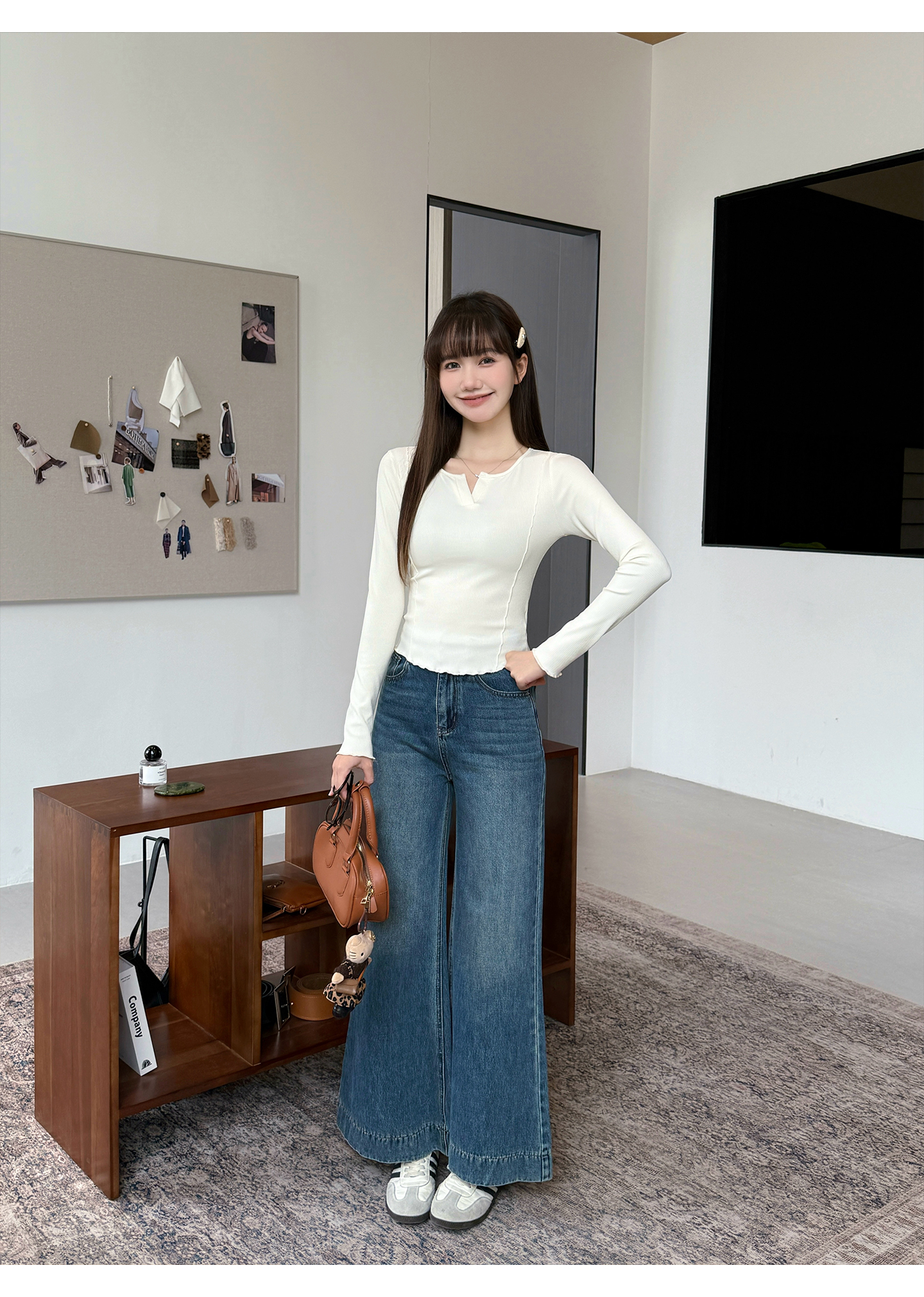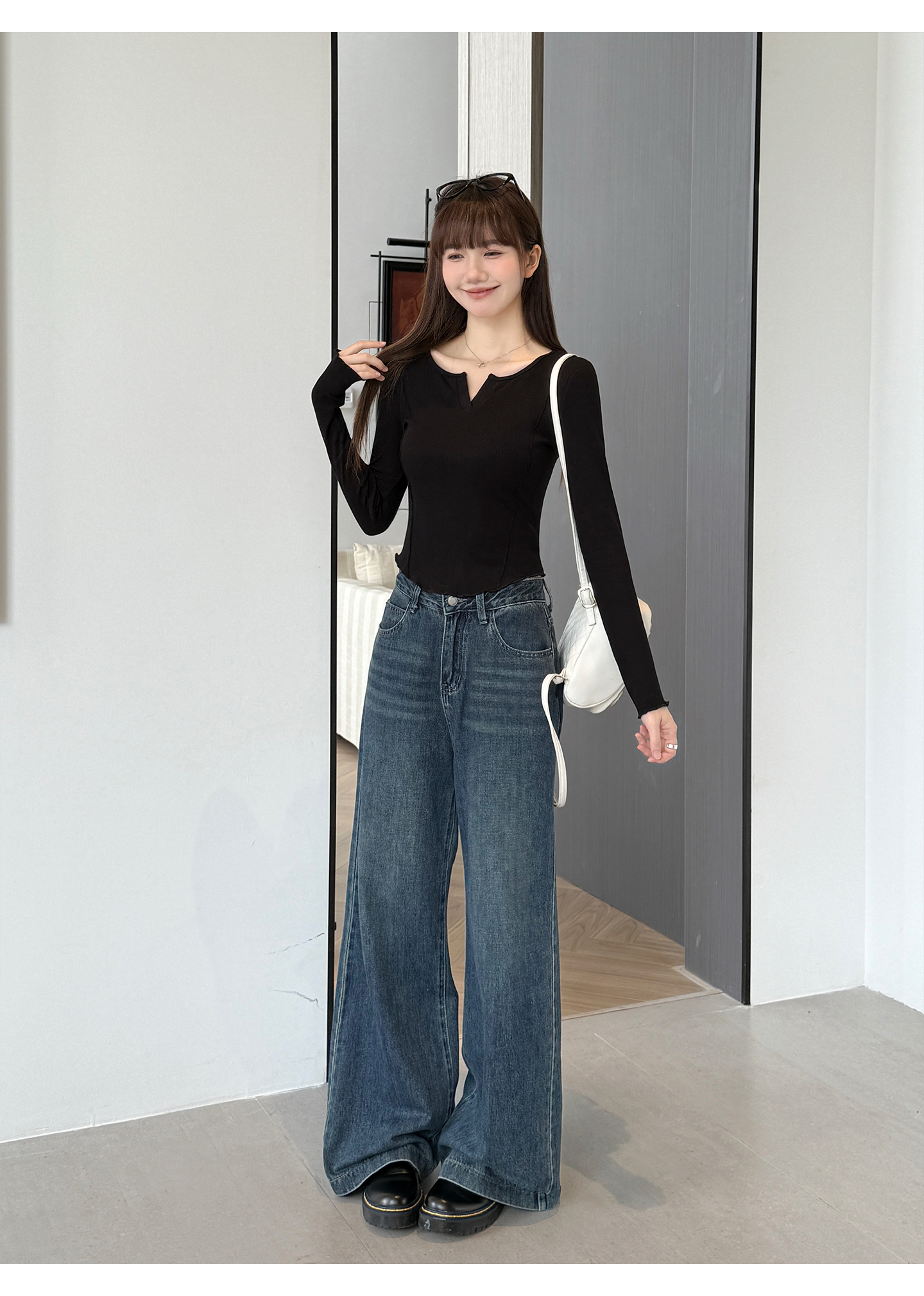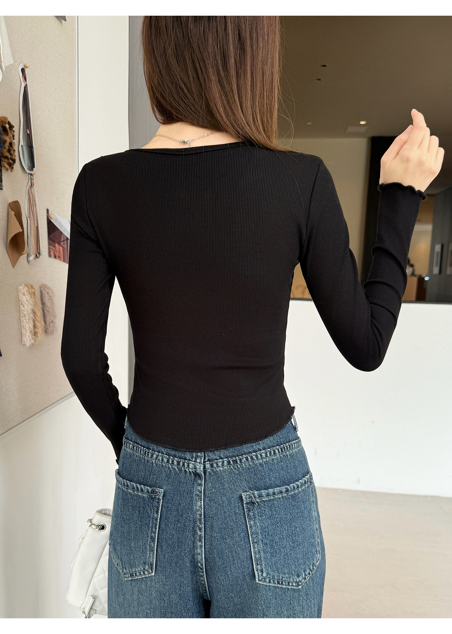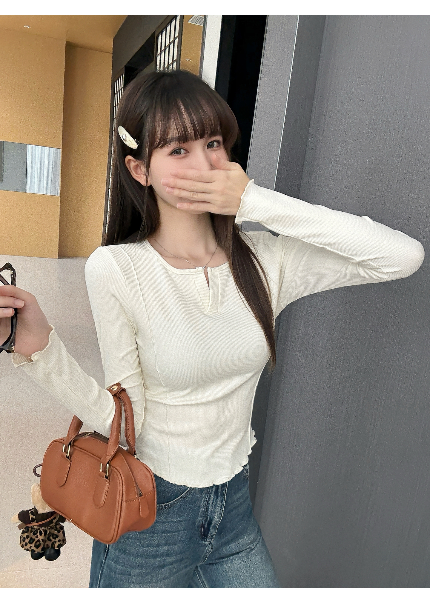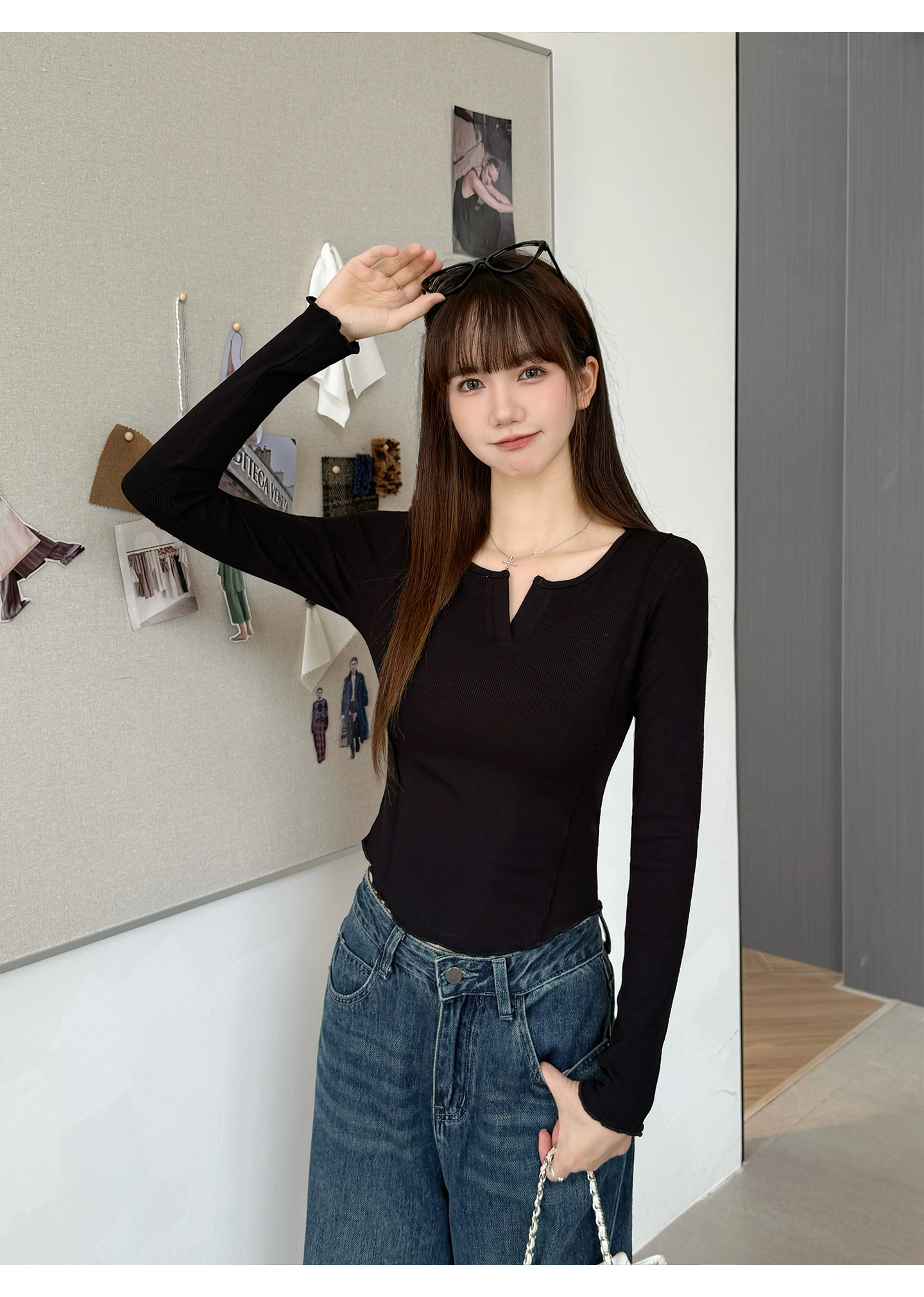 MY15380# 灰色正肩v领长袖t恤新款设计感修身内搭打底衫女裝貨源服裝批發