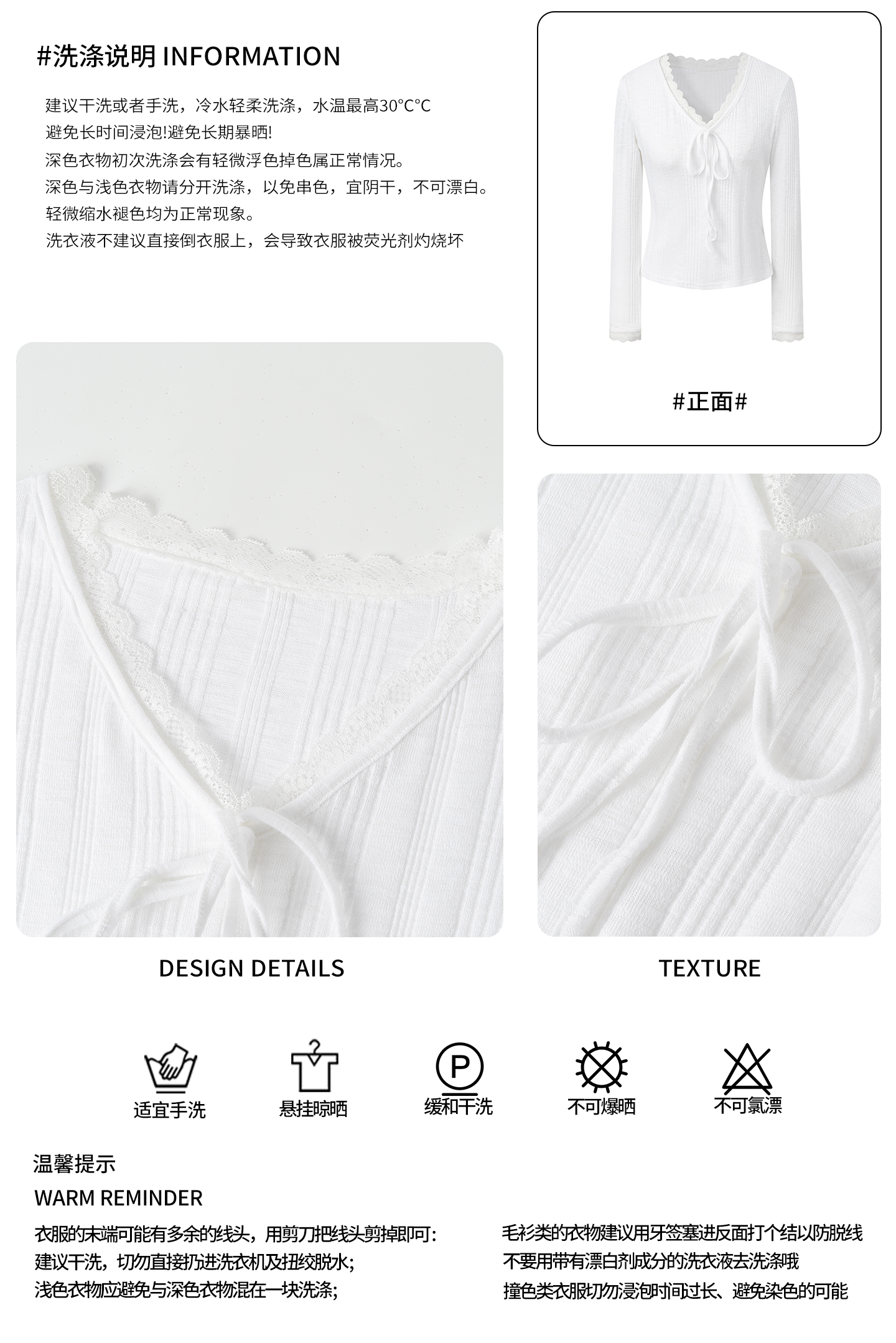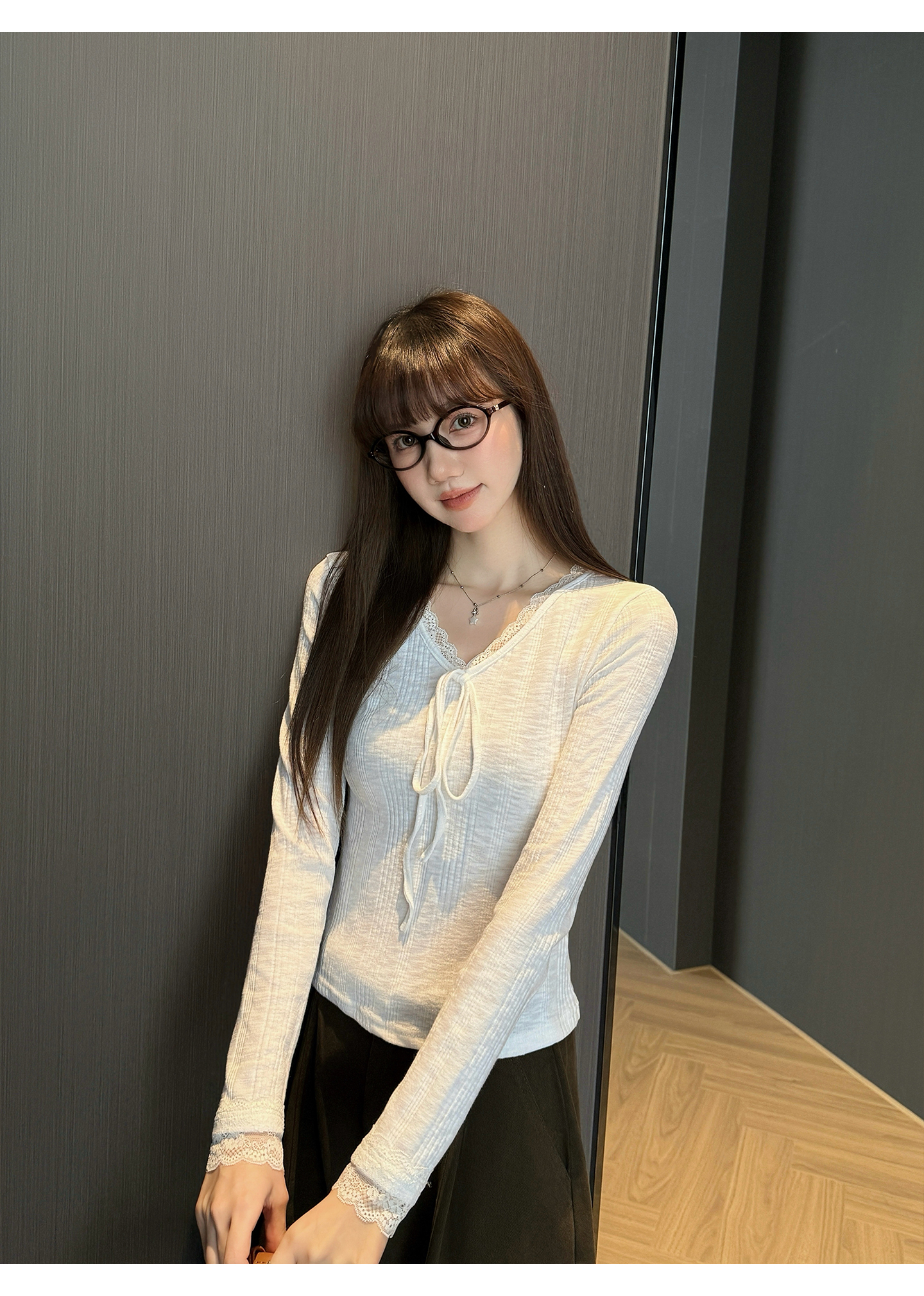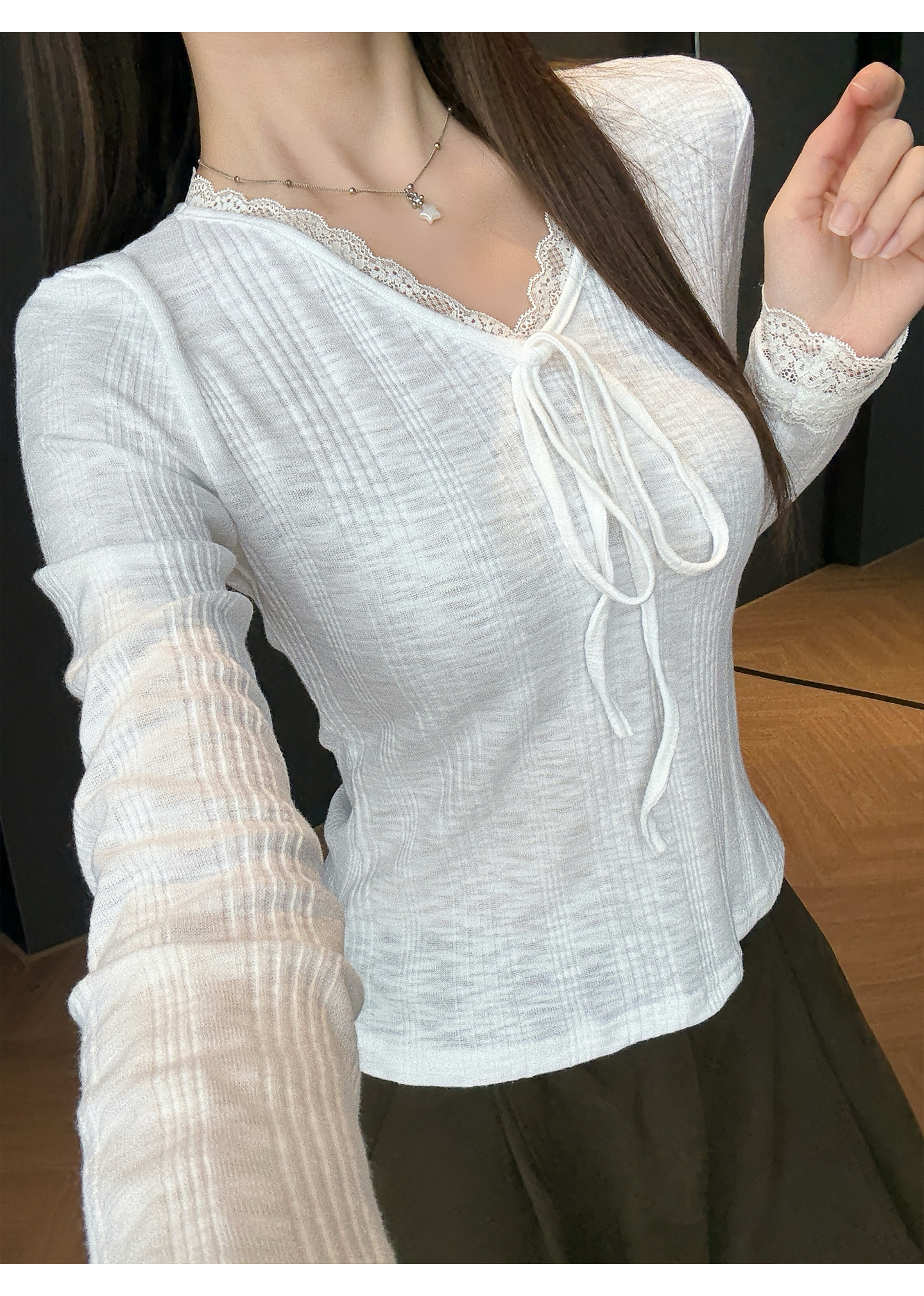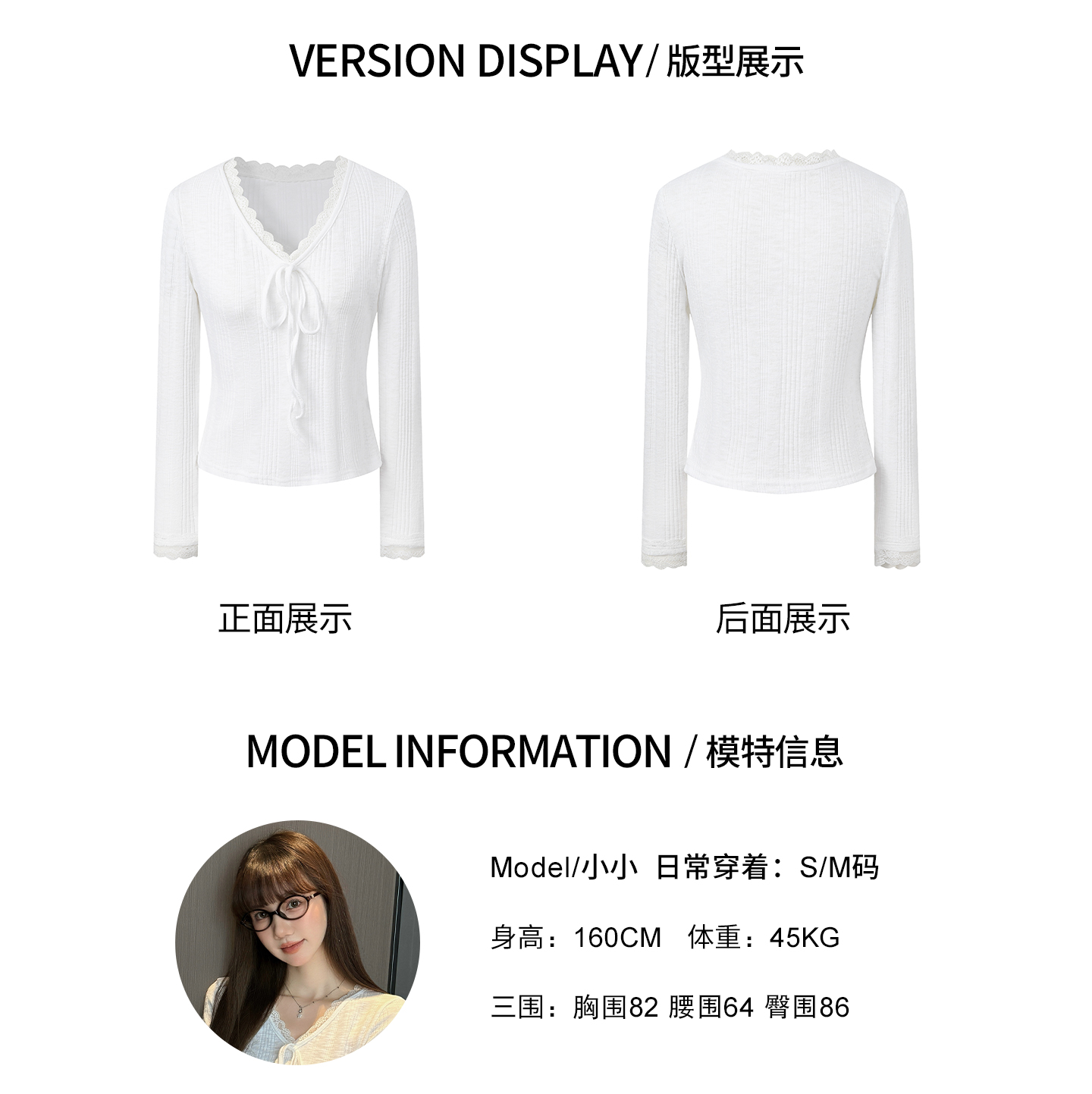 MY15381# 白色v领正肩长袖t恤气质修身蕾丝花边上衣打底衫女裝貨源服裝批發
