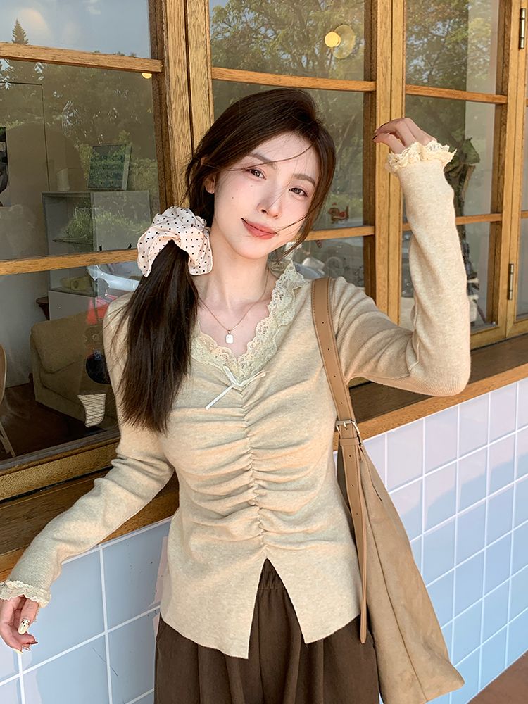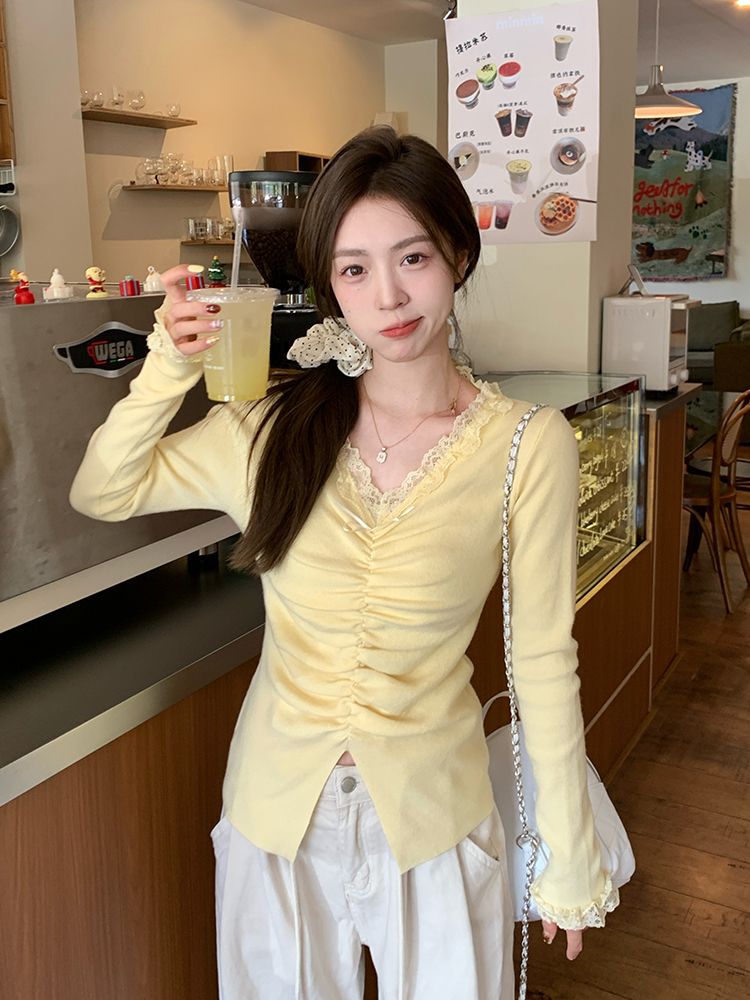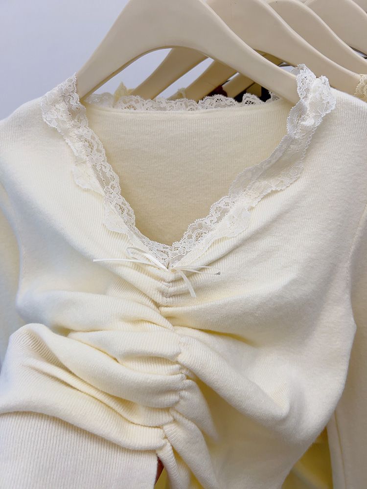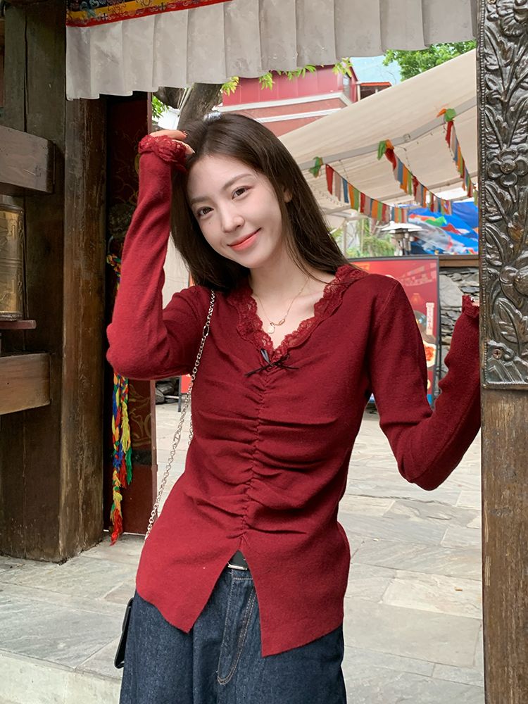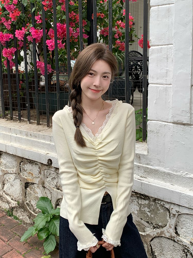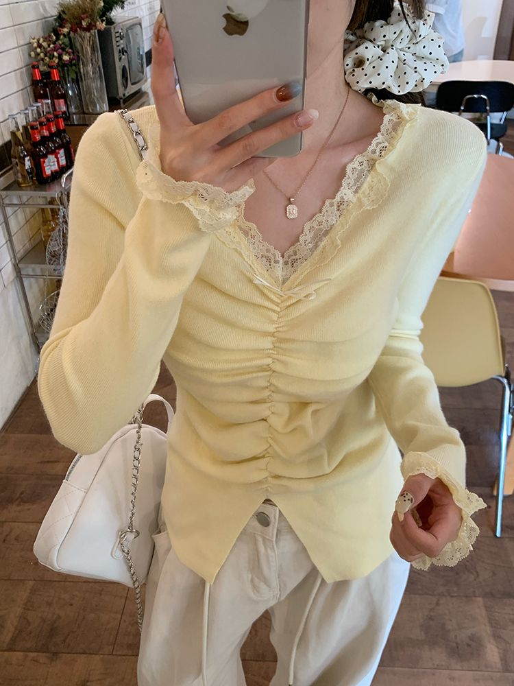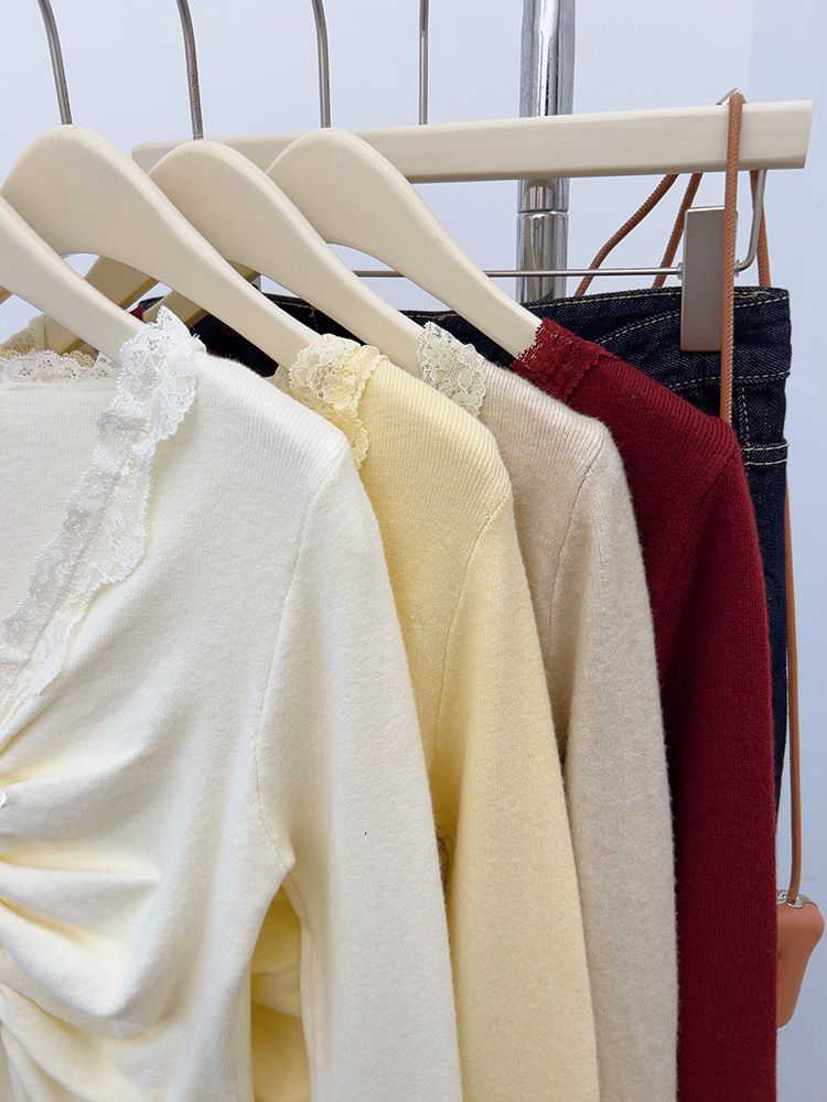MY15386# 设计感小众深v领蕾丝打底针织毛衣女女裝貨源服裝批發