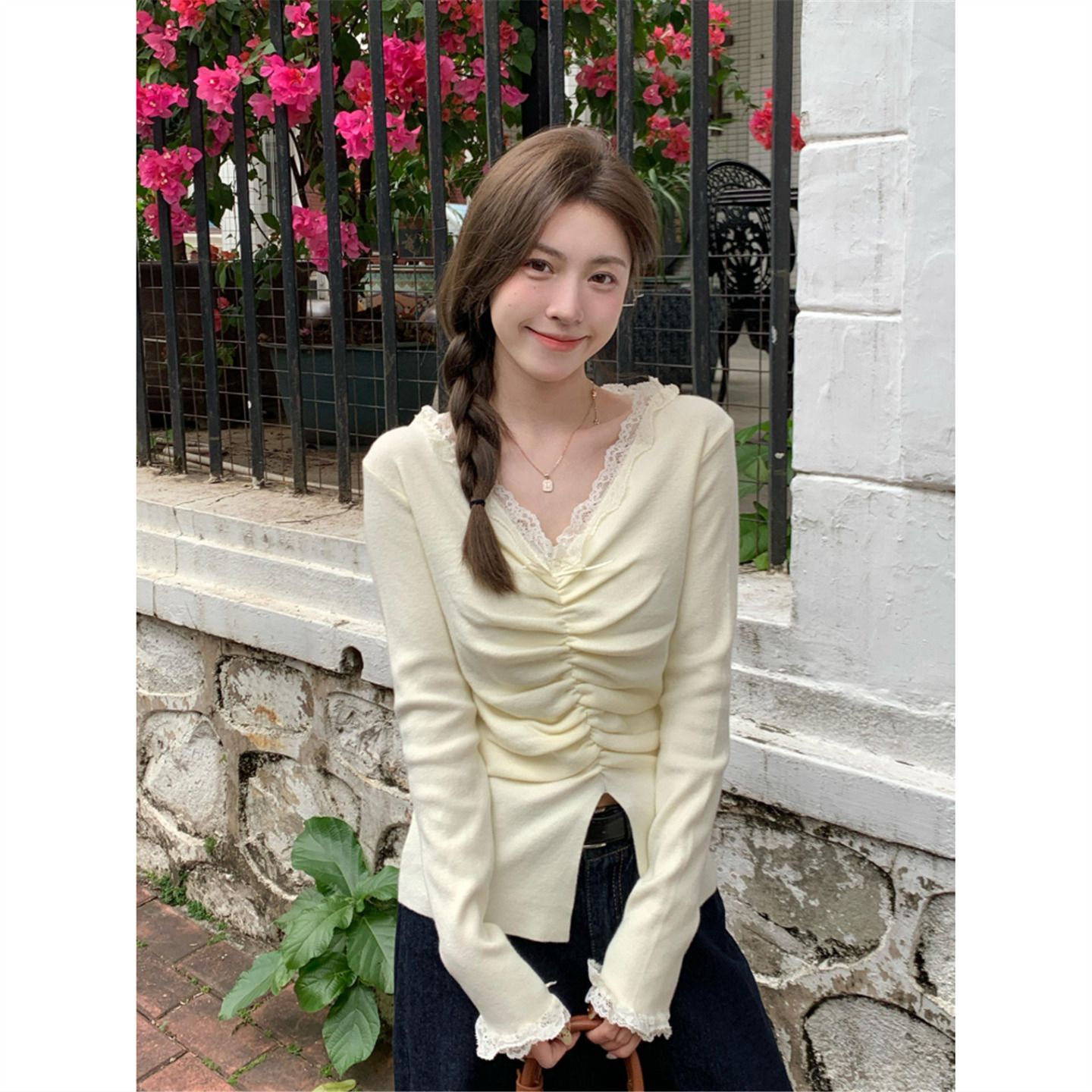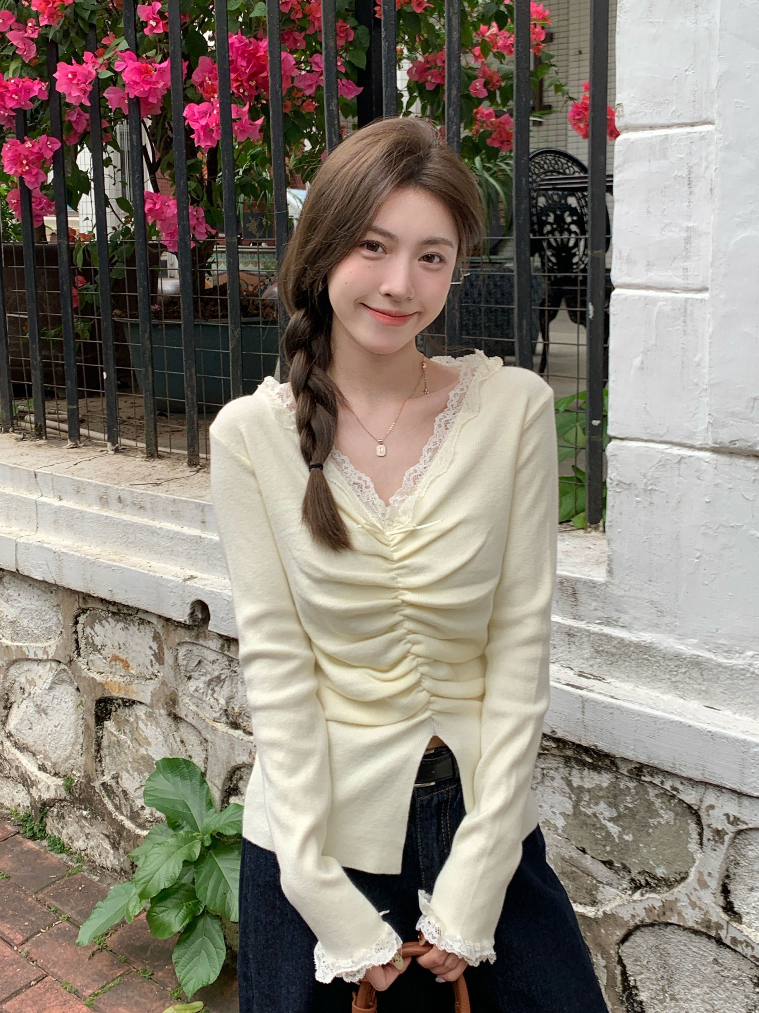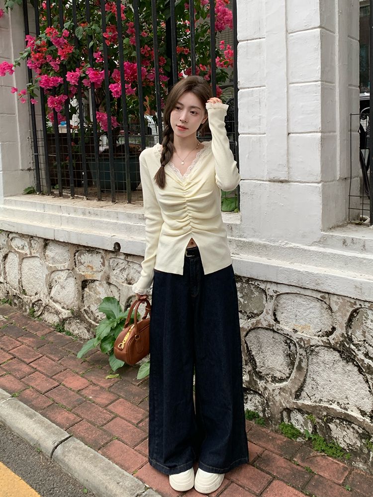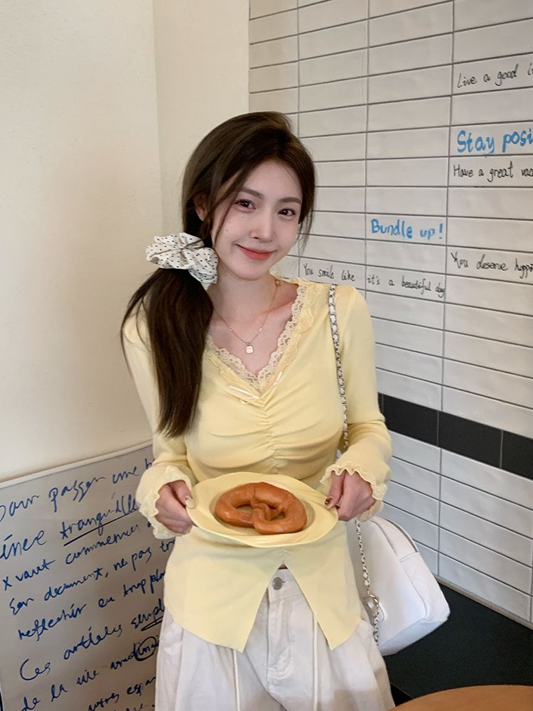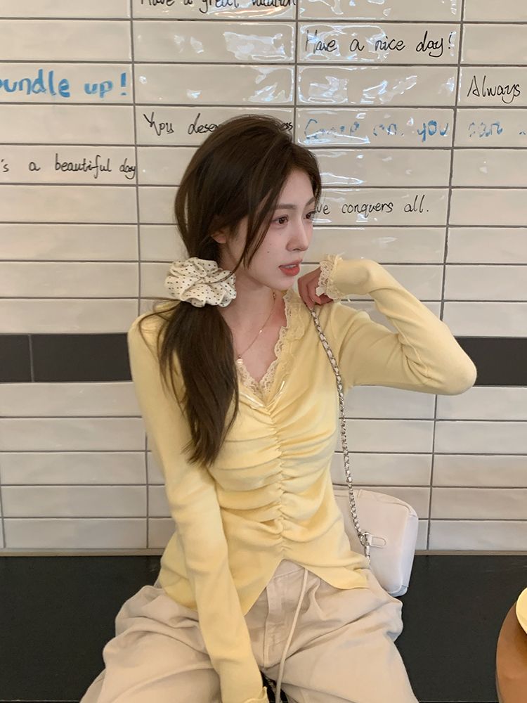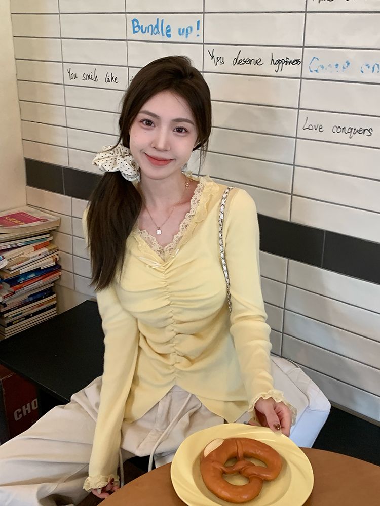 MY15386# 设计感小众深v领蕾丝打底针织毛衣女女裝貨源服裝批發