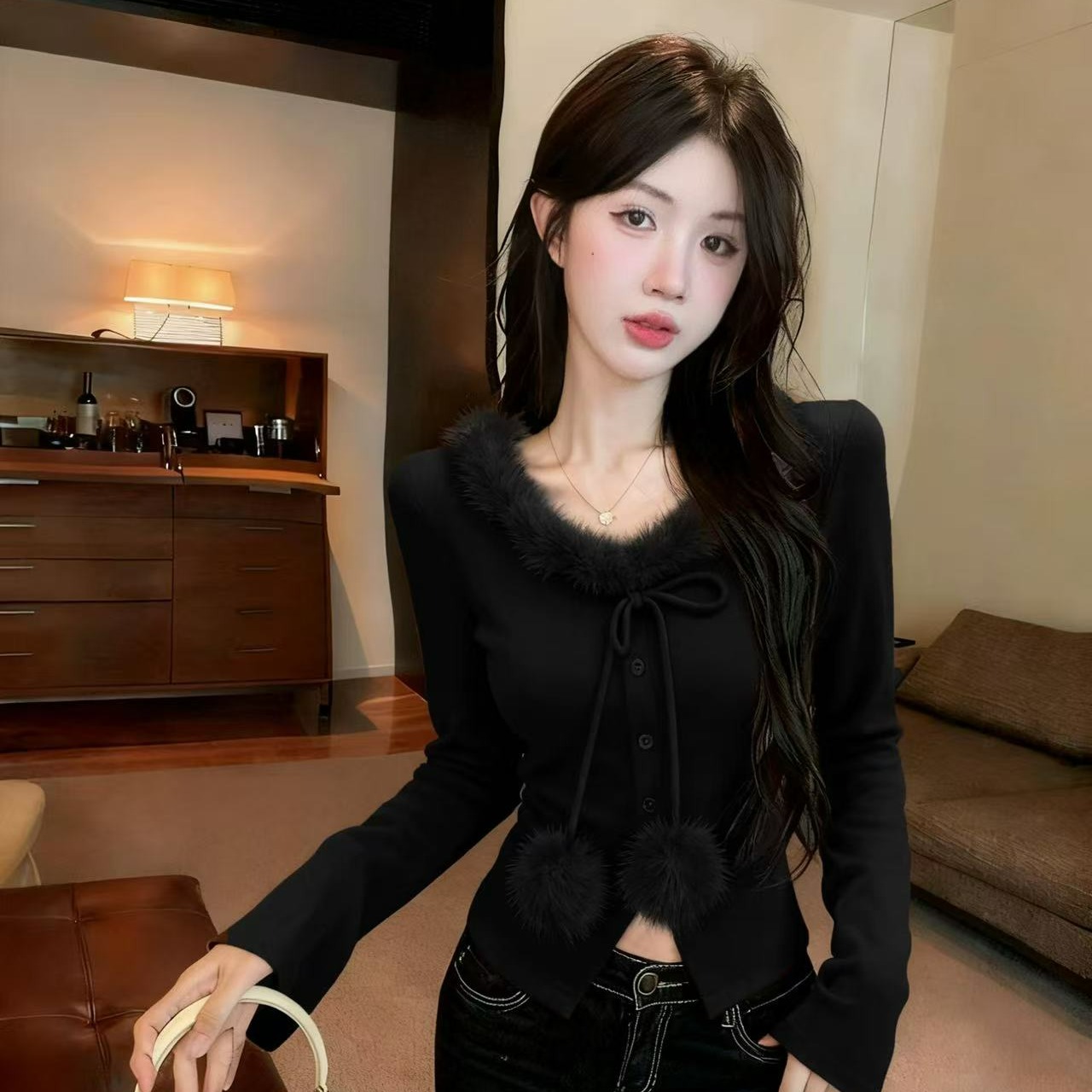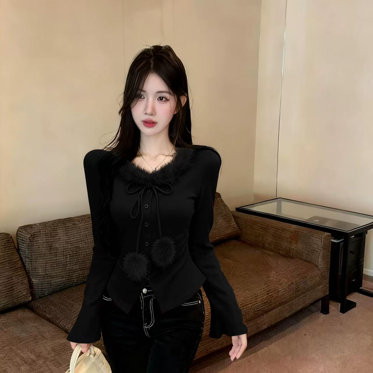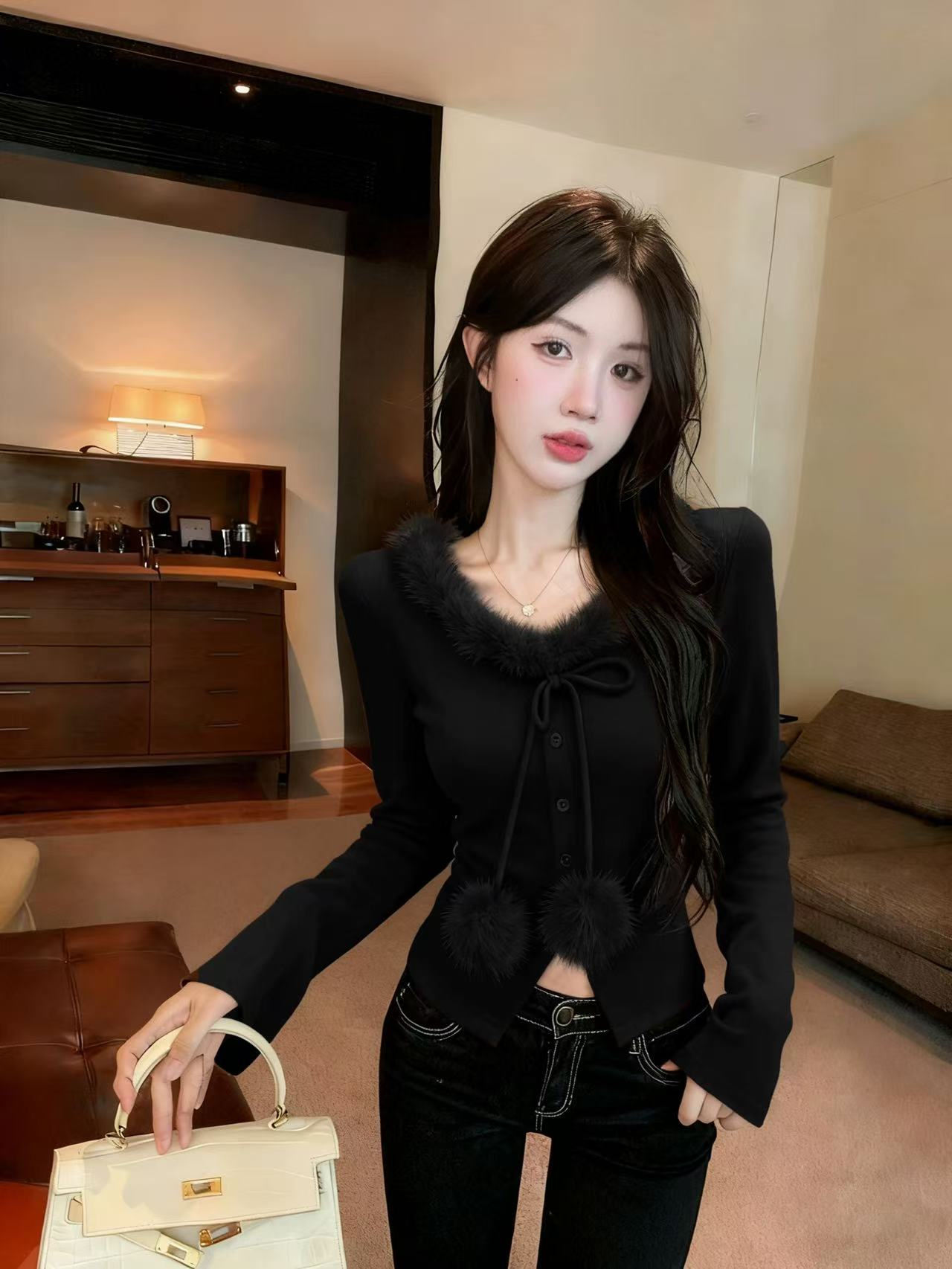 MY15393# 新款法式气质心机时尚毛领系绳毛球装饰打底外穿上衣女女裝貨源服裝批發