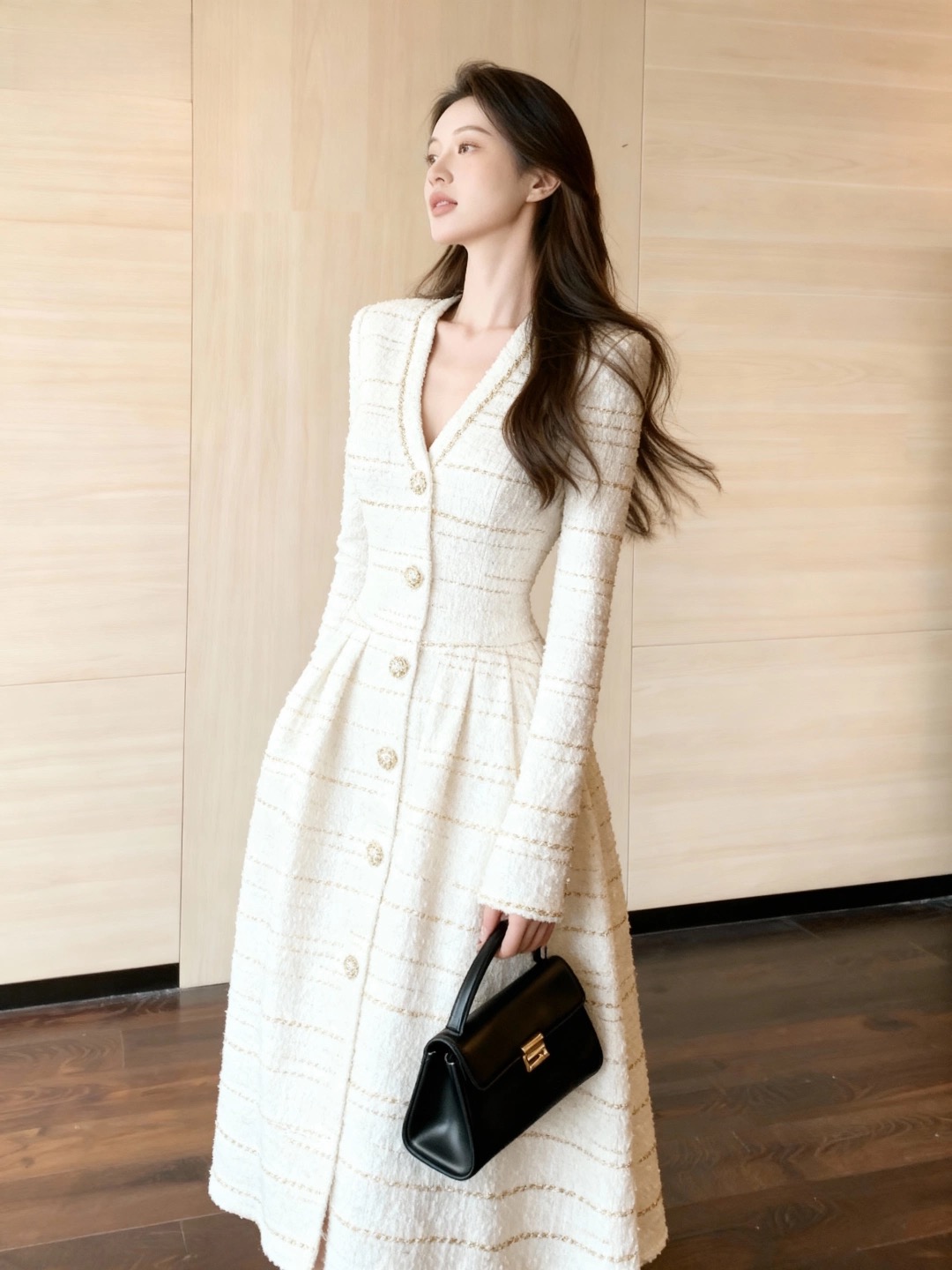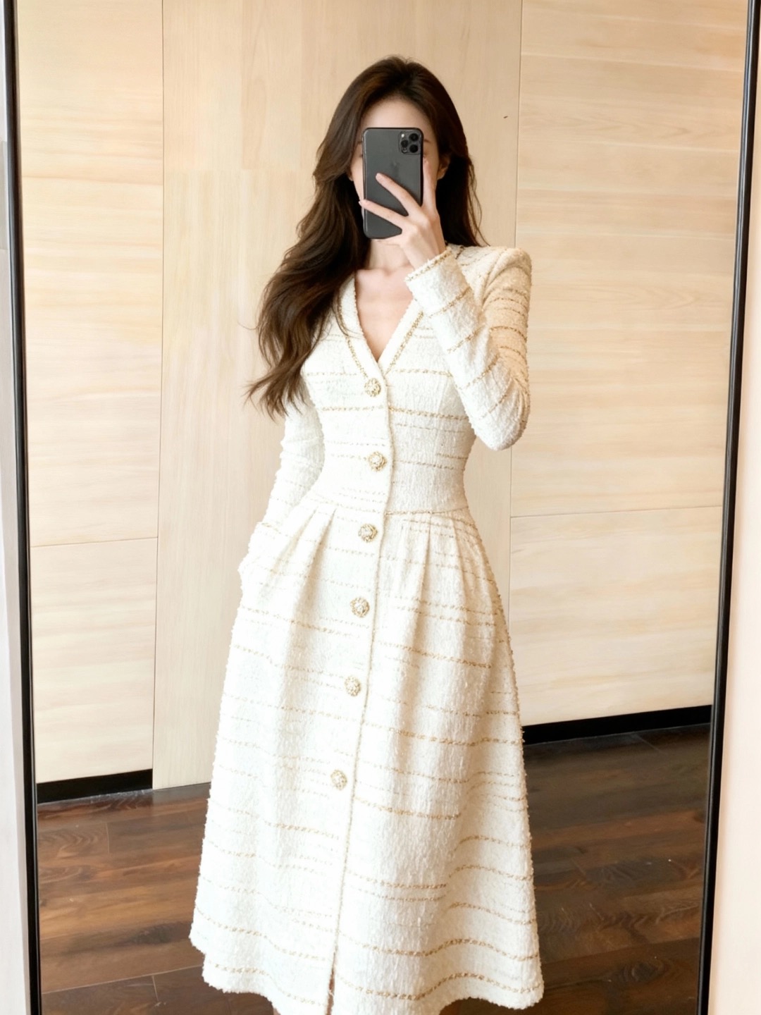 MY15399# 秋季巨好看富家千金miu系白色小香风气质v领连衣裙女女裝貨源服裝批發