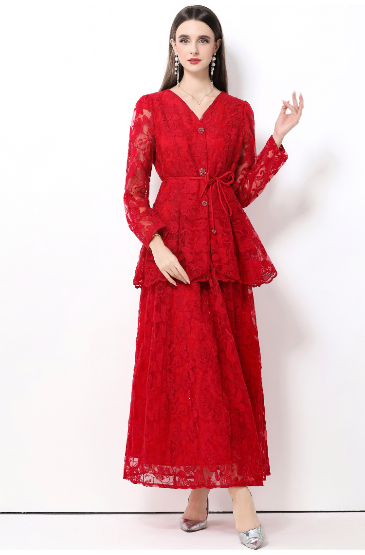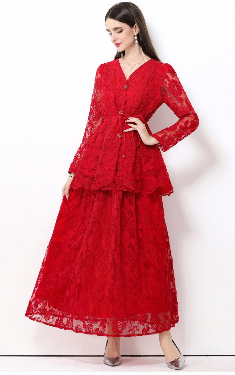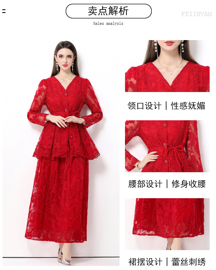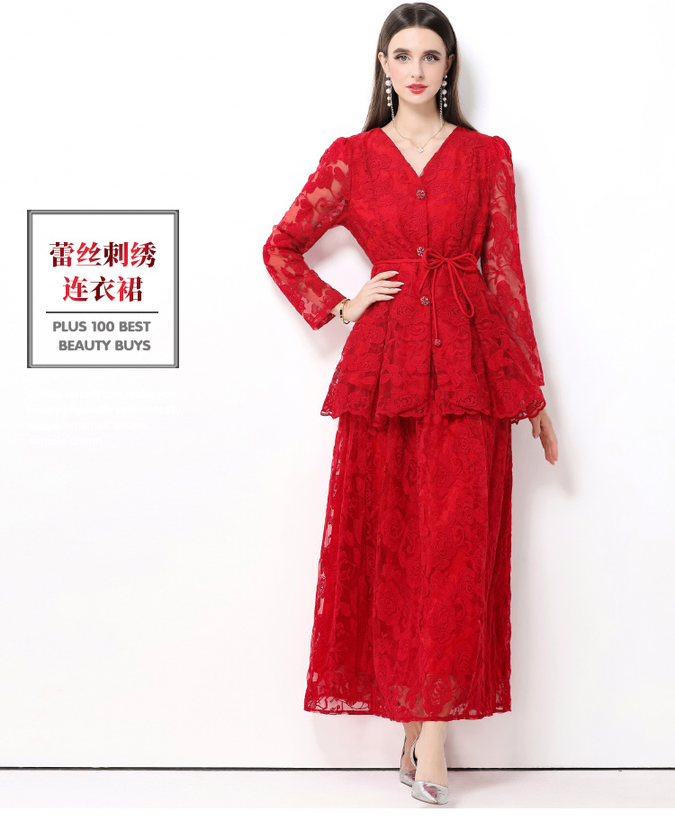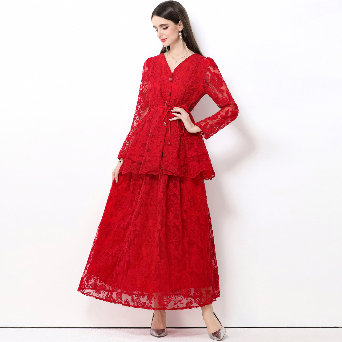 MY15413# 法式绑带收腰灯笼袖单排扣刺绣网纱荷叶边长裙套装连衣裙女裝貨源服裝批發