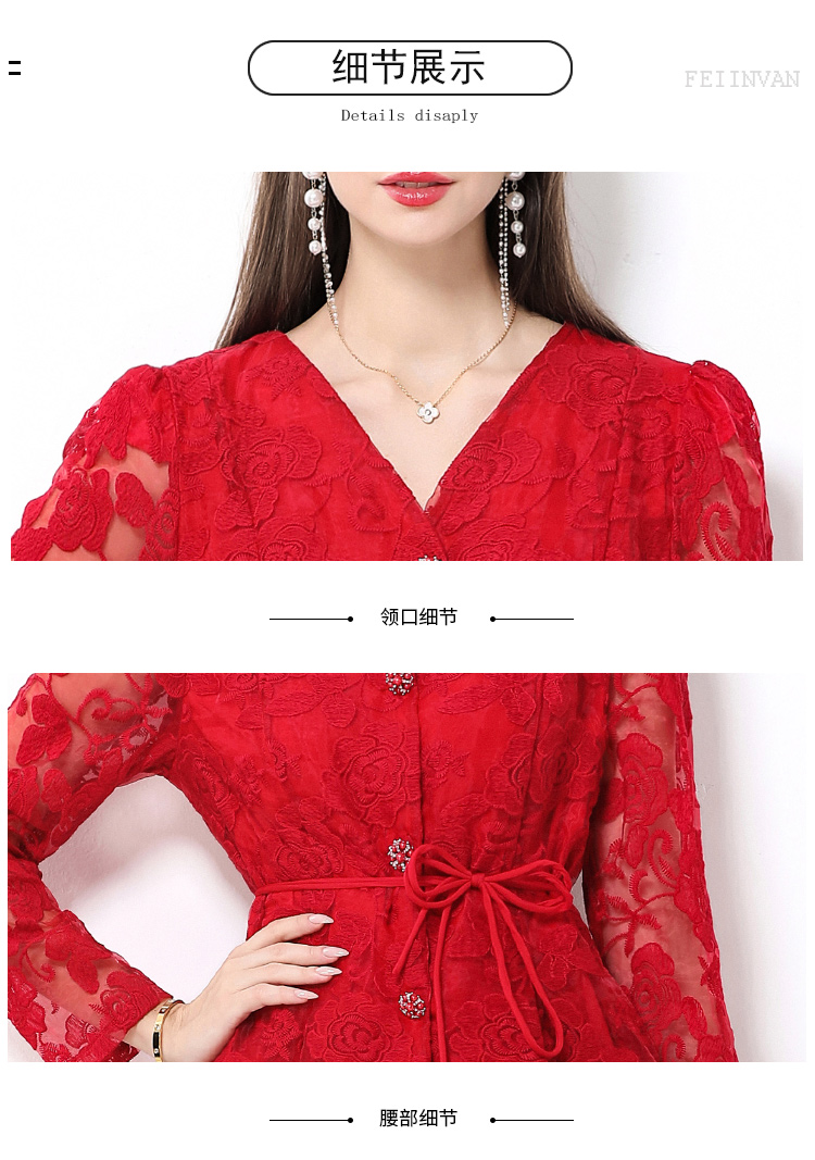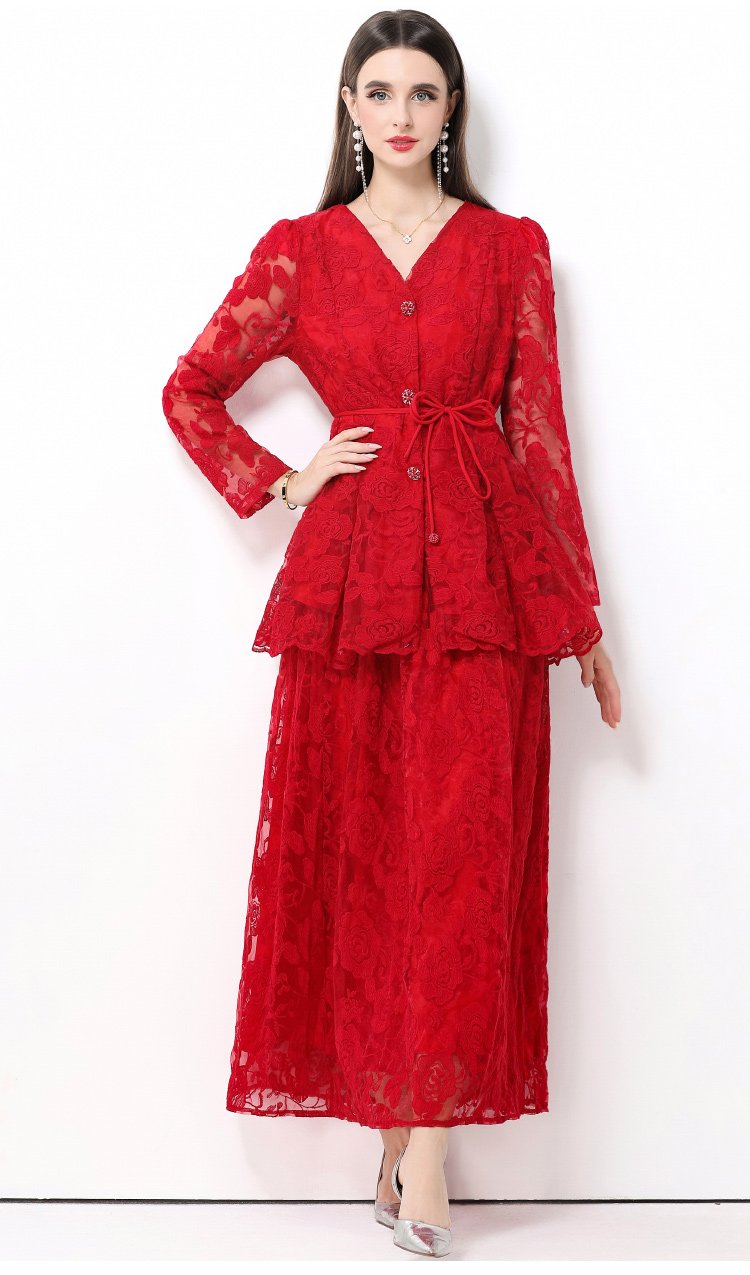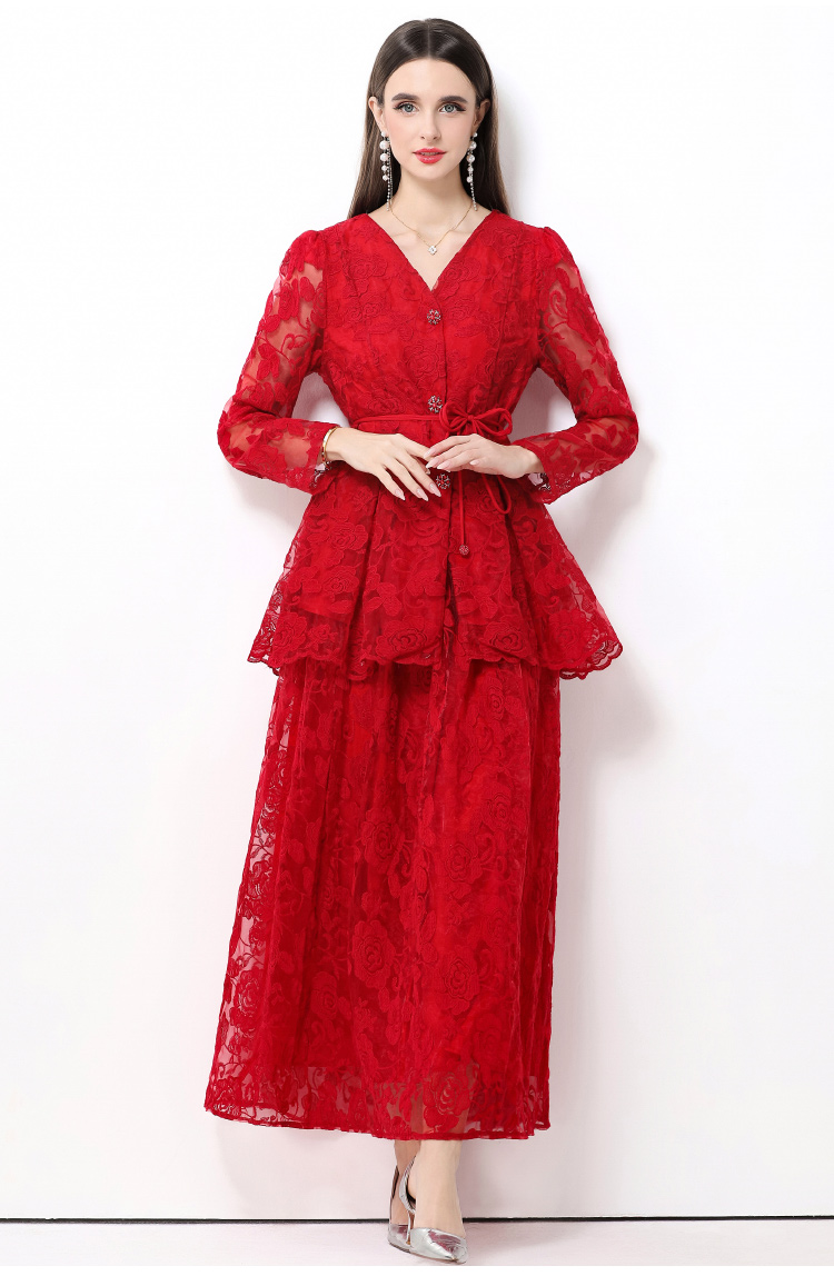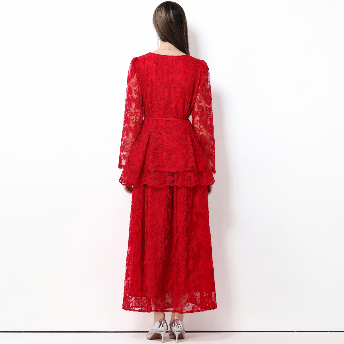 MY15413# 法式绑带收腰灯笼袖单排扣刺绣网纱荷叶边长裙套装连衣裙女裝貨源服裝批發