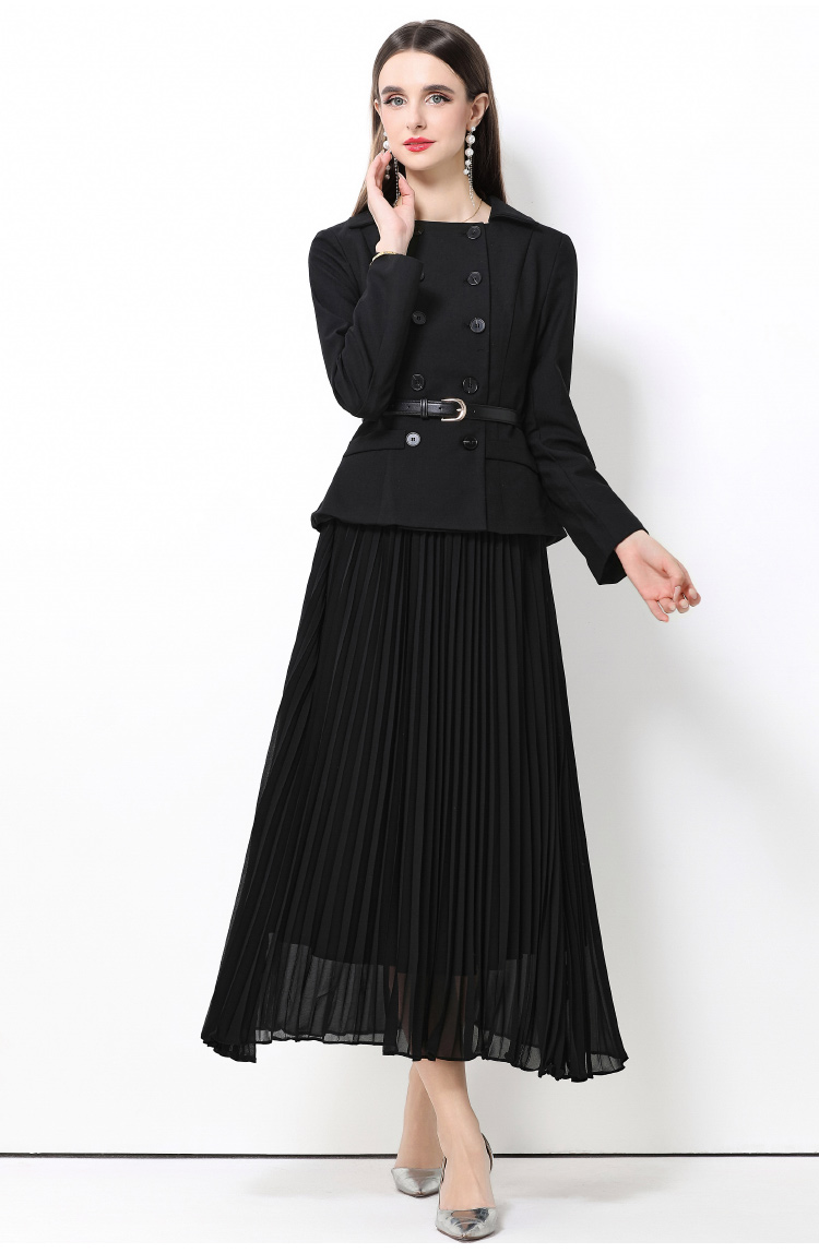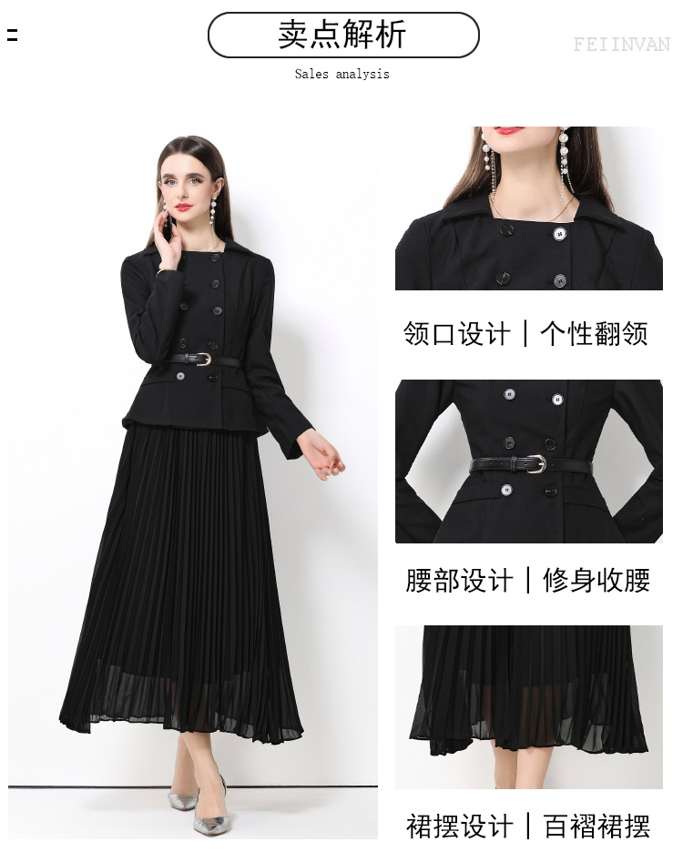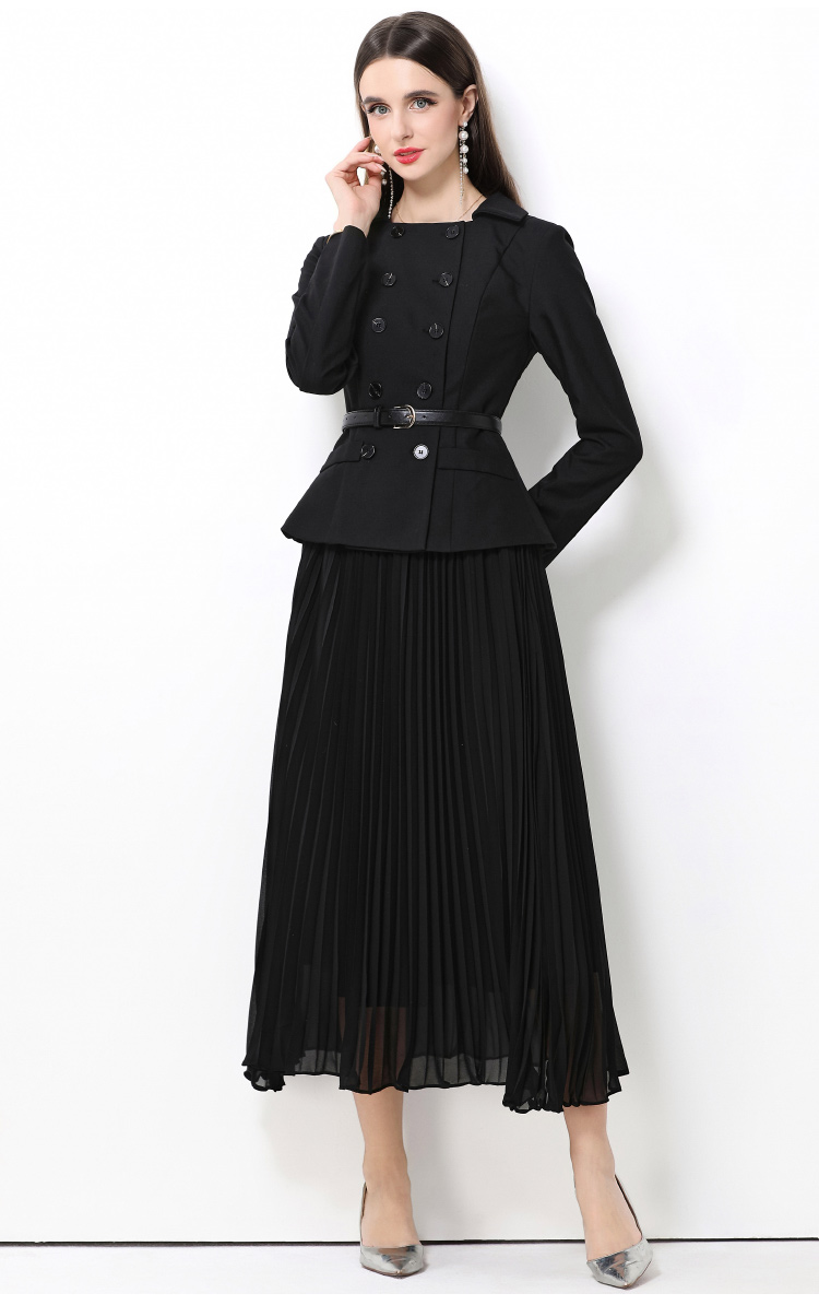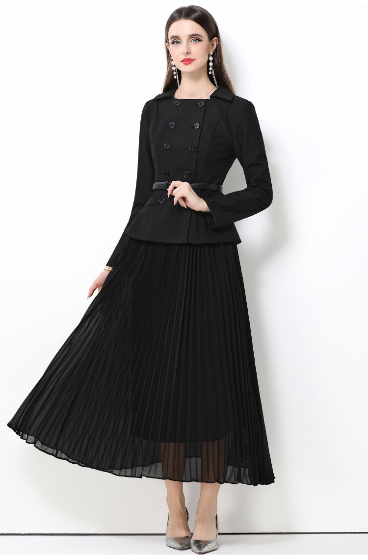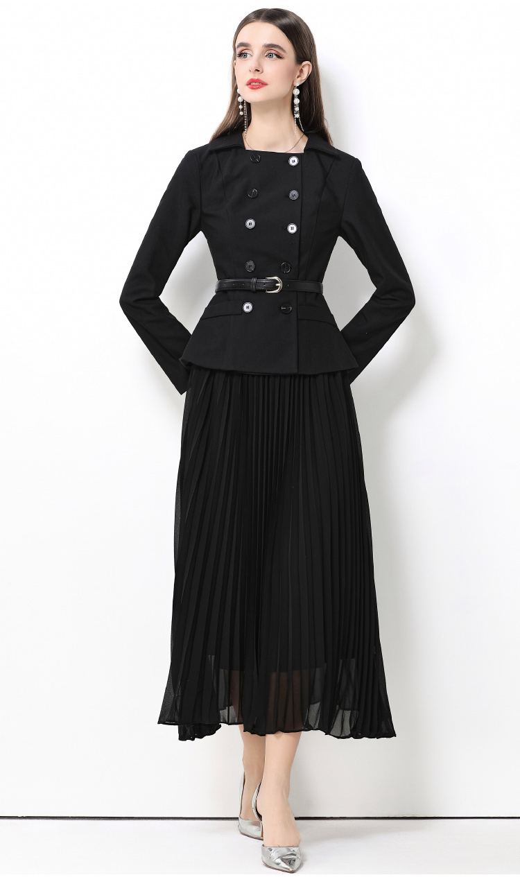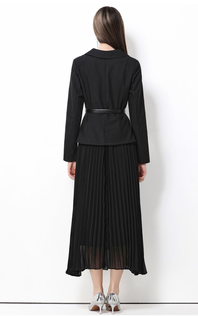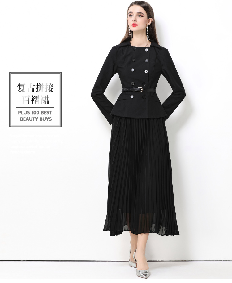 MY15416# 气质黑色翻领双排扣收腰长袖拼接百褶假两件连衣裙送腰带女裝貨源服裝批發
