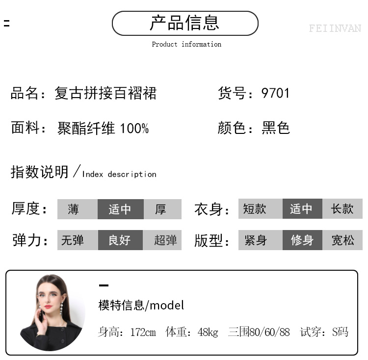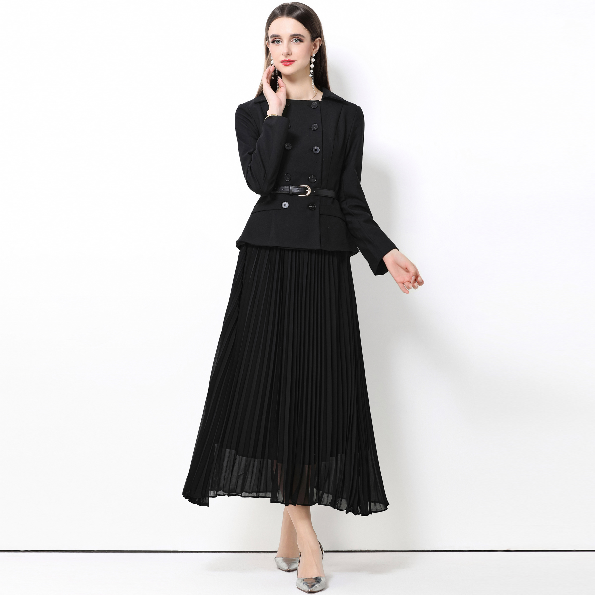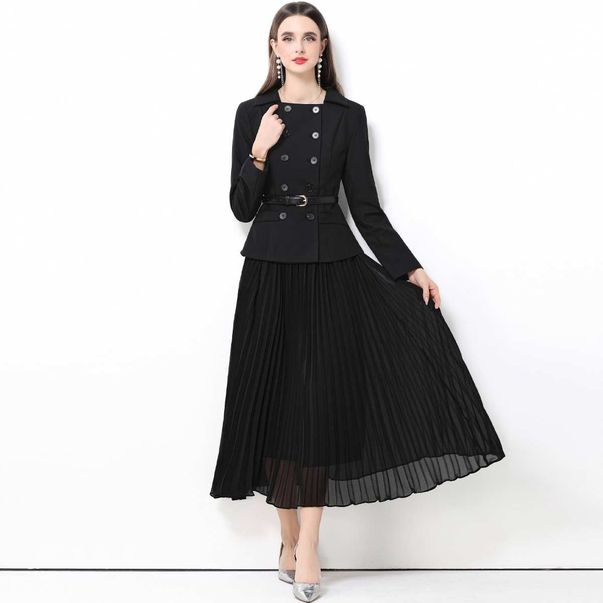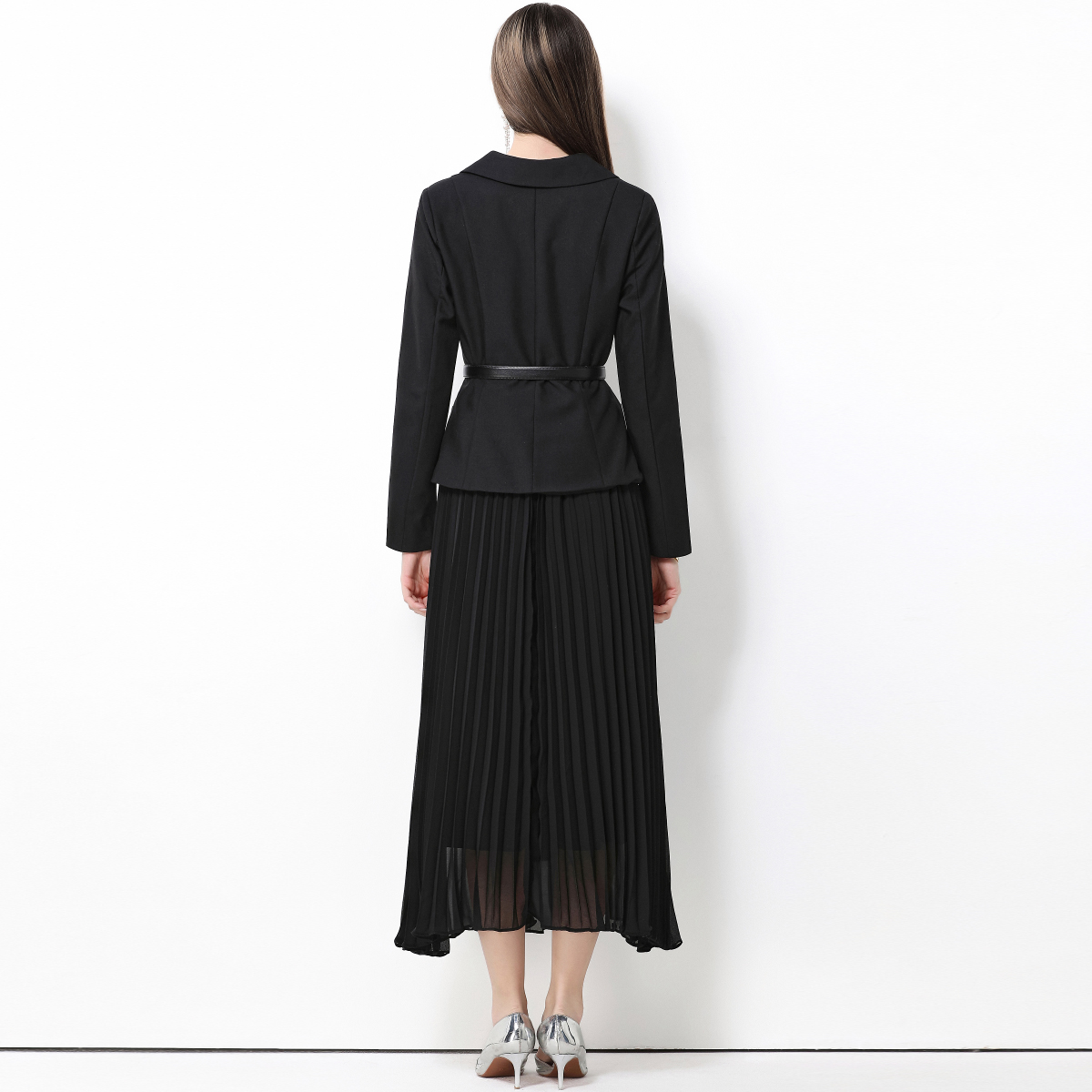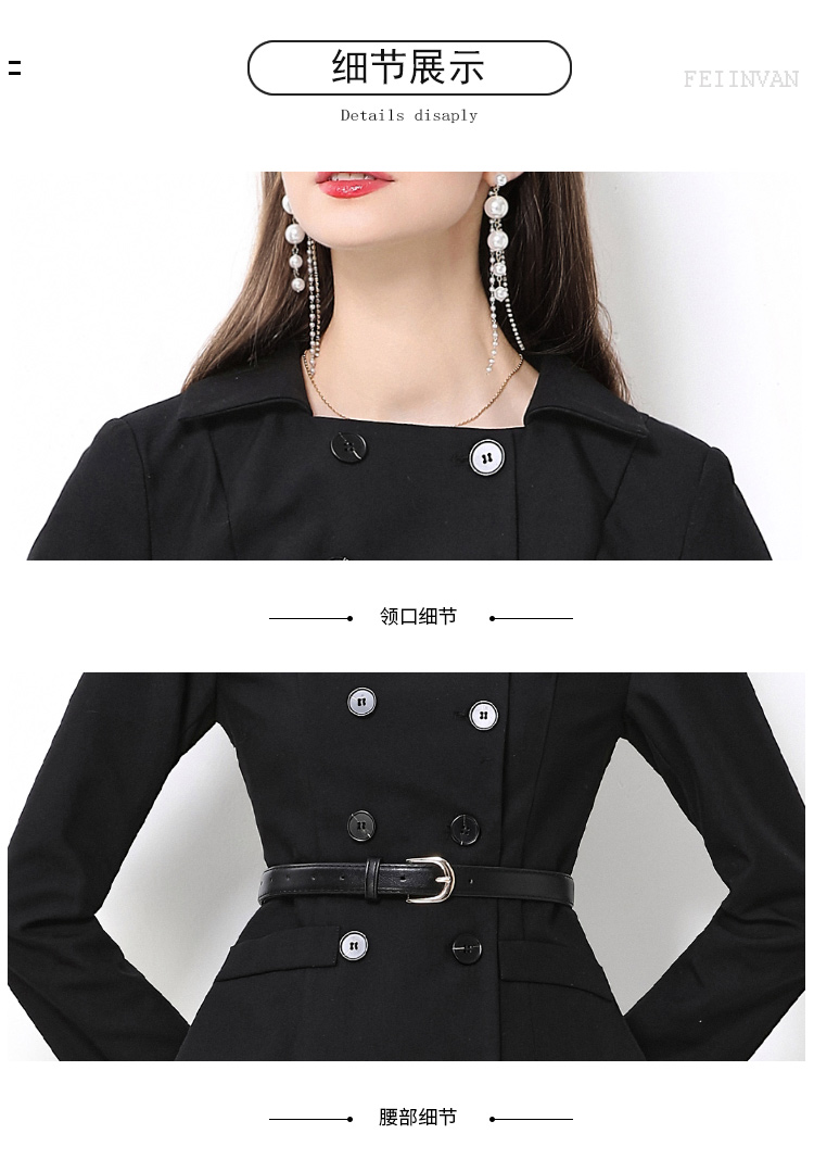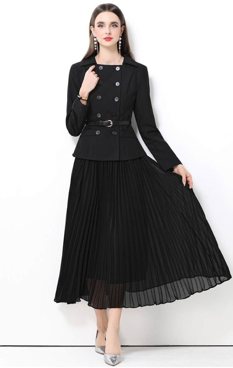 MY15416# 气质黑色翻领双排扣收腰长袖拼接百褶假两件连衣裙送腰带女裝貨源服裝批發