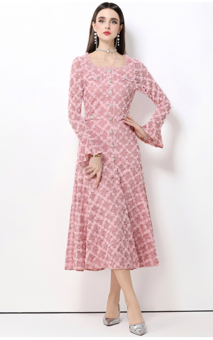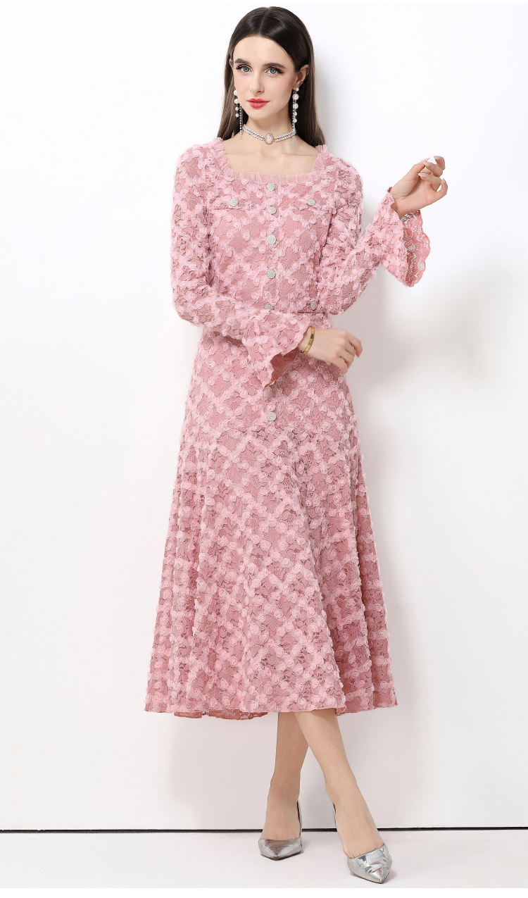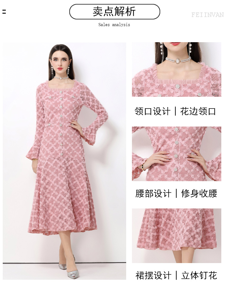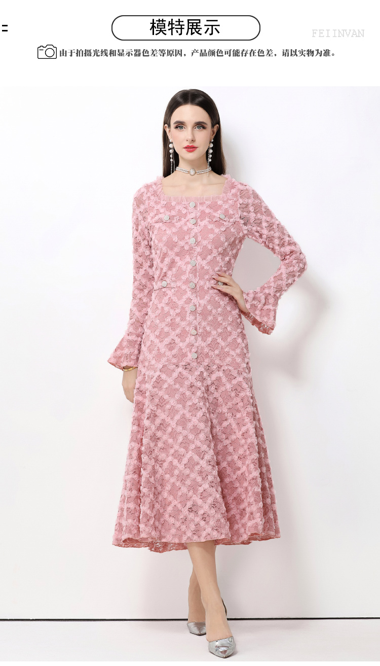 MY15418# 法式轻奢小香风蕾丝重工立体花朵喇叭袖大摆连衣裙女女裝貨源服裝批發