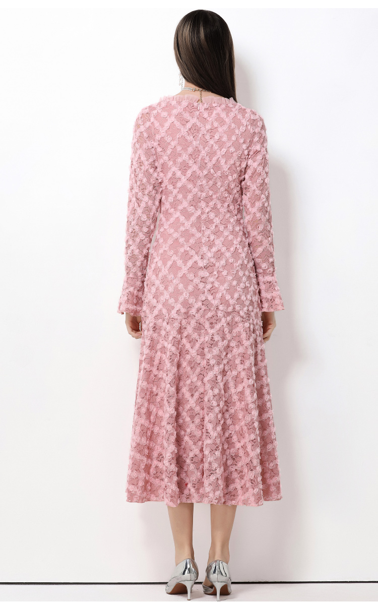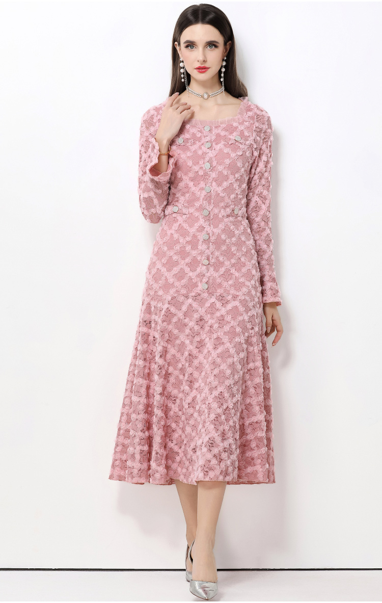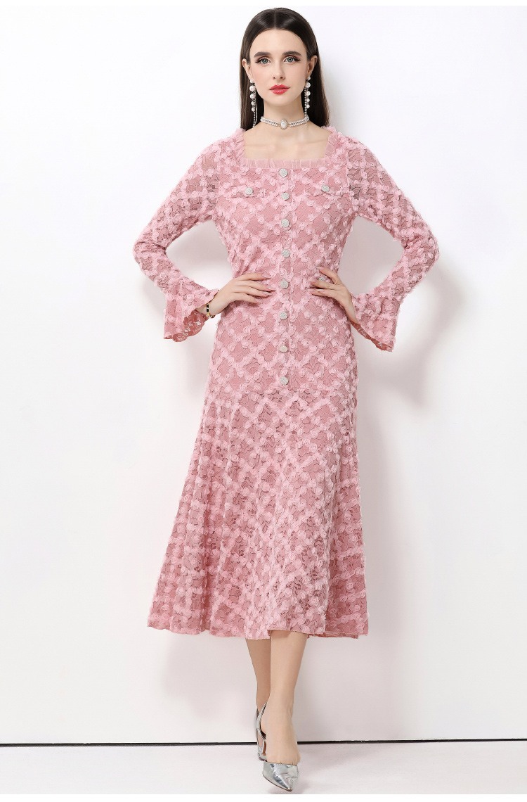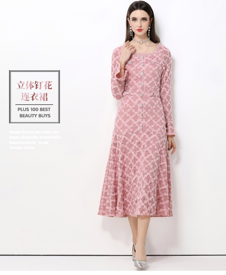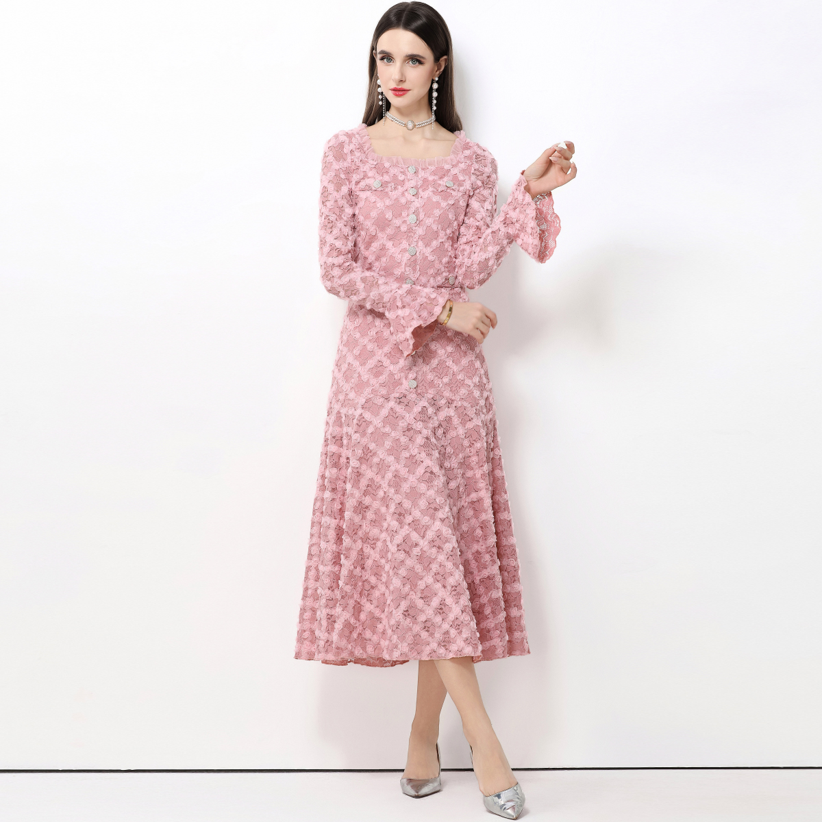 MY15418# 法式轻奢小香风蕾丝重工立体花朵喇叭袖大摆连衣裙女女裝貨源服裝批發
