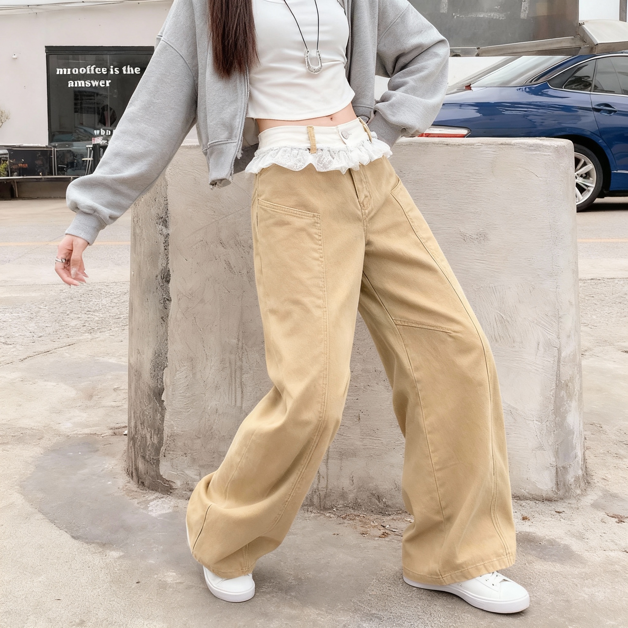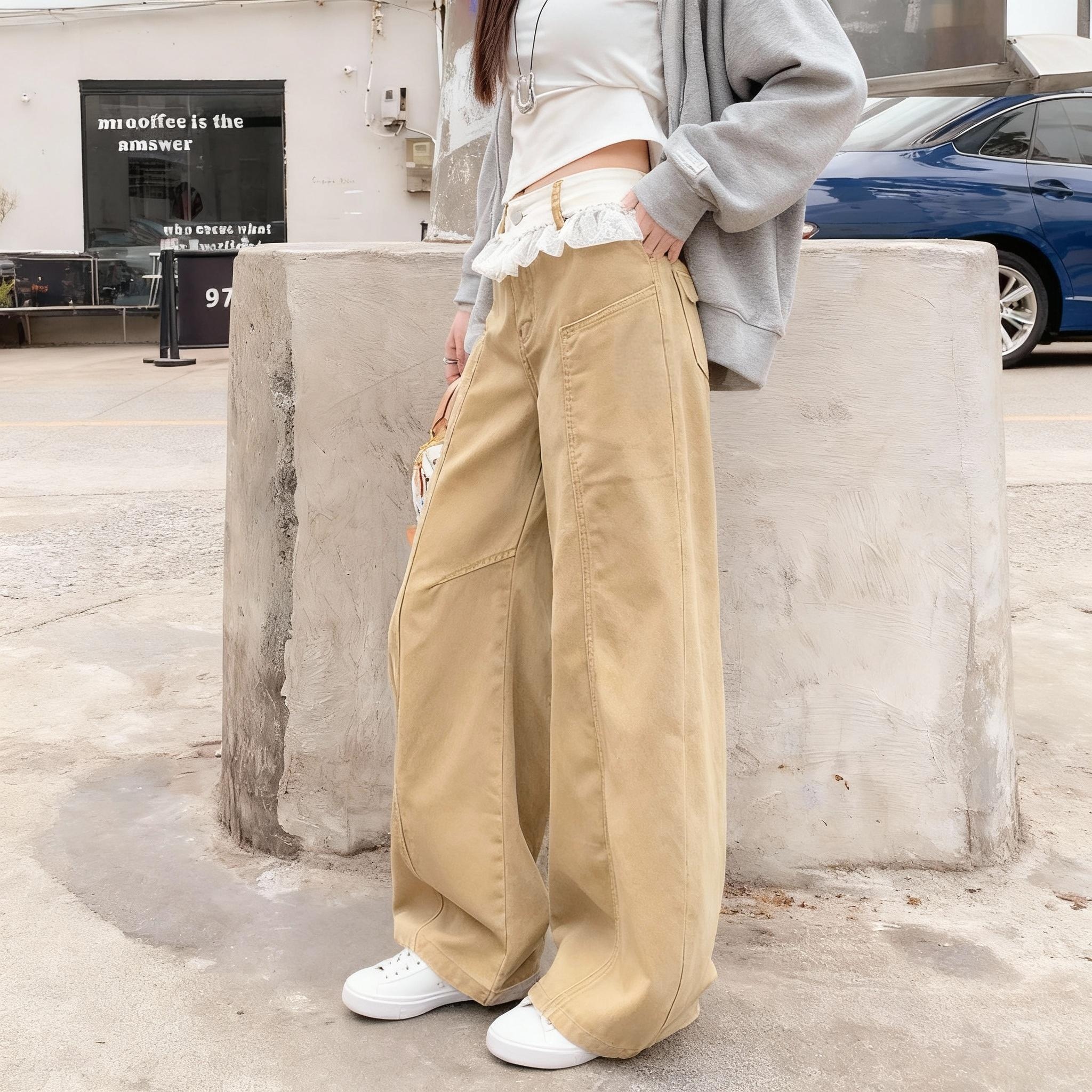 MY15430# 小矮个子复古蕾丝拼接牛仔裤女春季阔腿裤拖地裤女裝貨源服裝批發