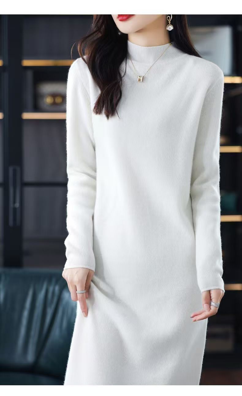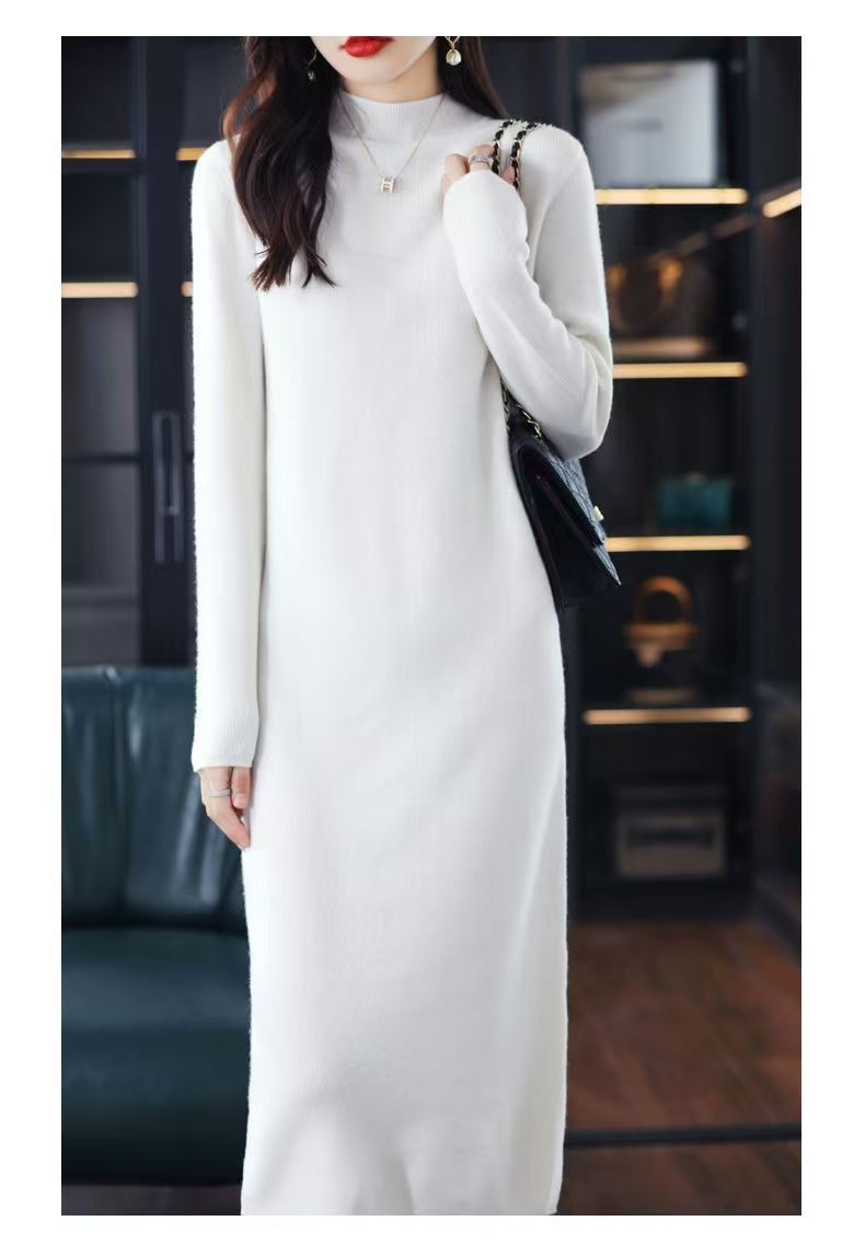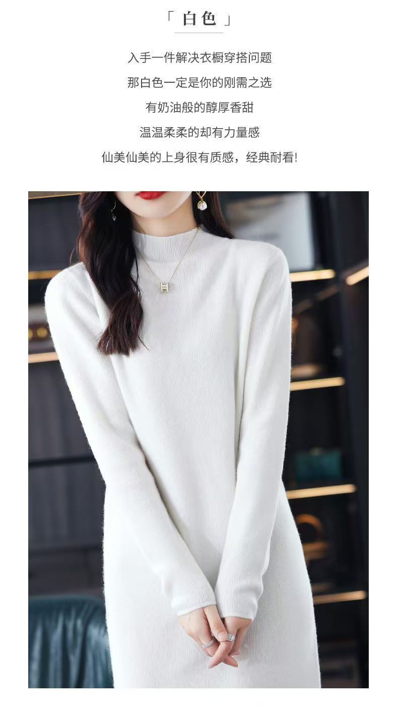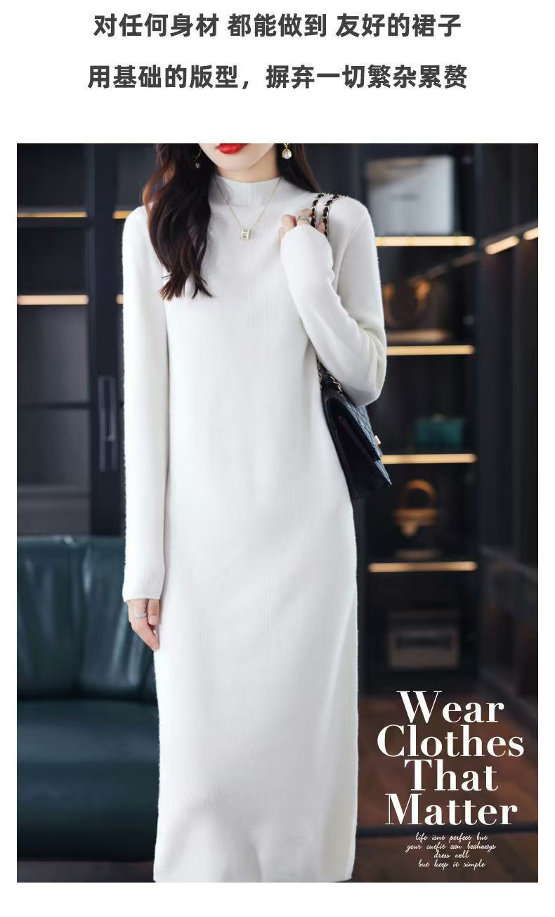 MY15434# 半高领中长款针织连衣裙时尚宽松显瘦直筒保暖打底毛衣裙女裝貨源服裝批發