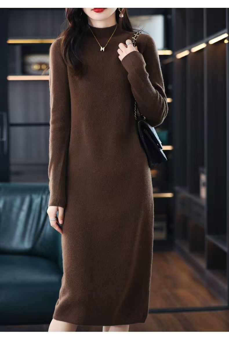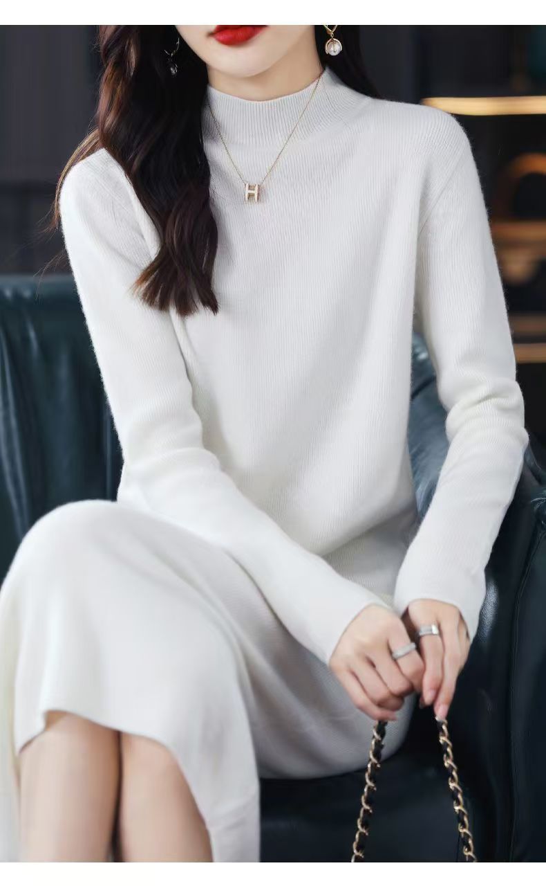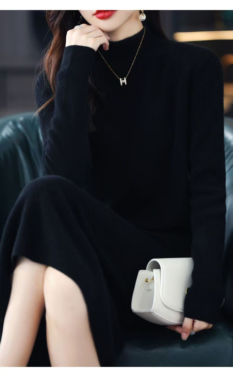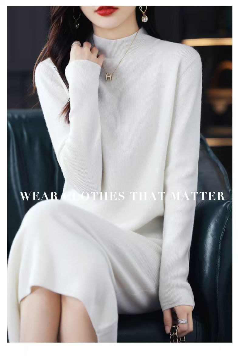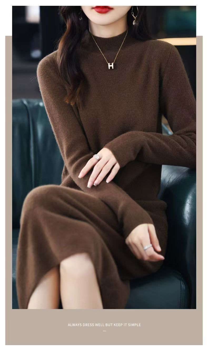 MY15434# 半高领中长款针织连衣裙时尚宽松显瘦直筒保暖打底毛衣裙女裝貨源服裝批發