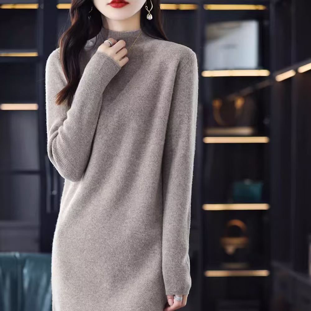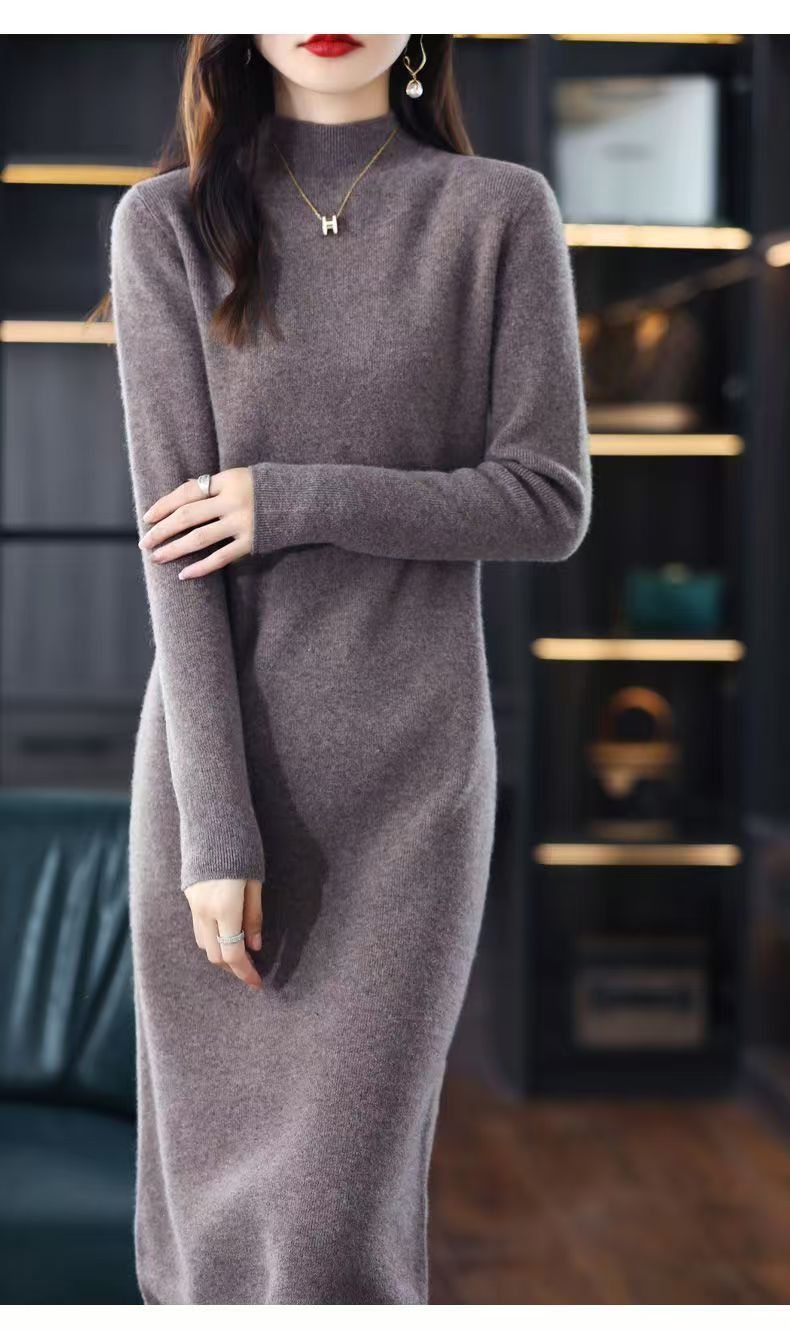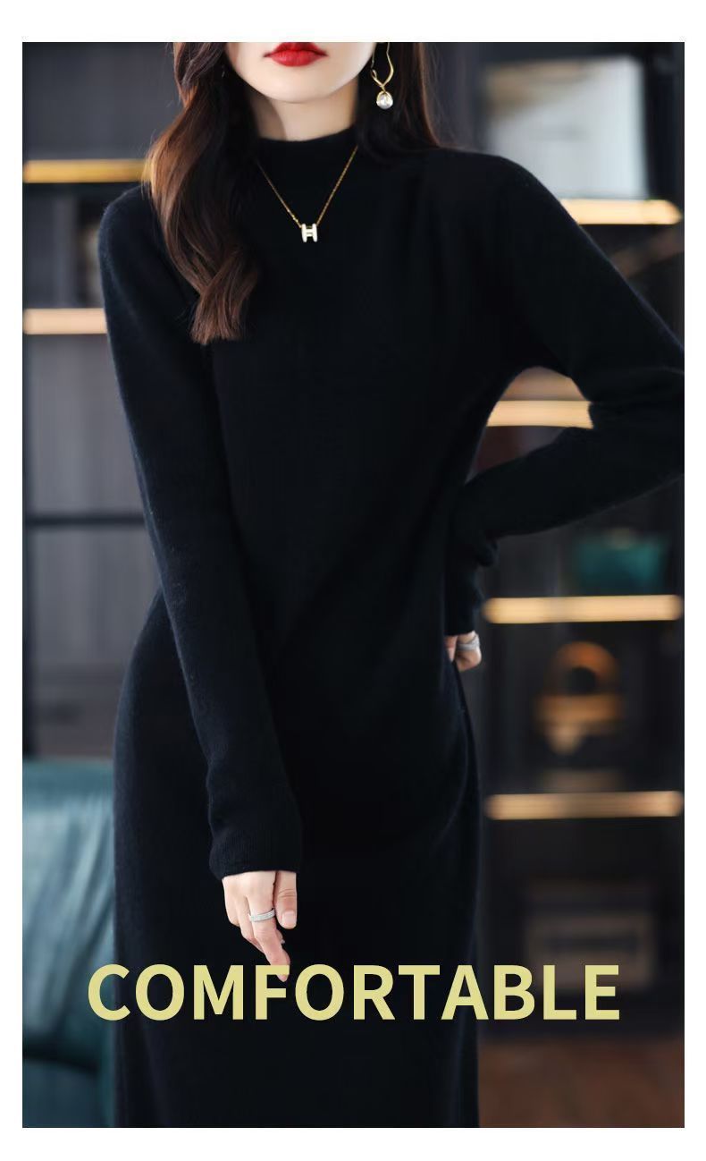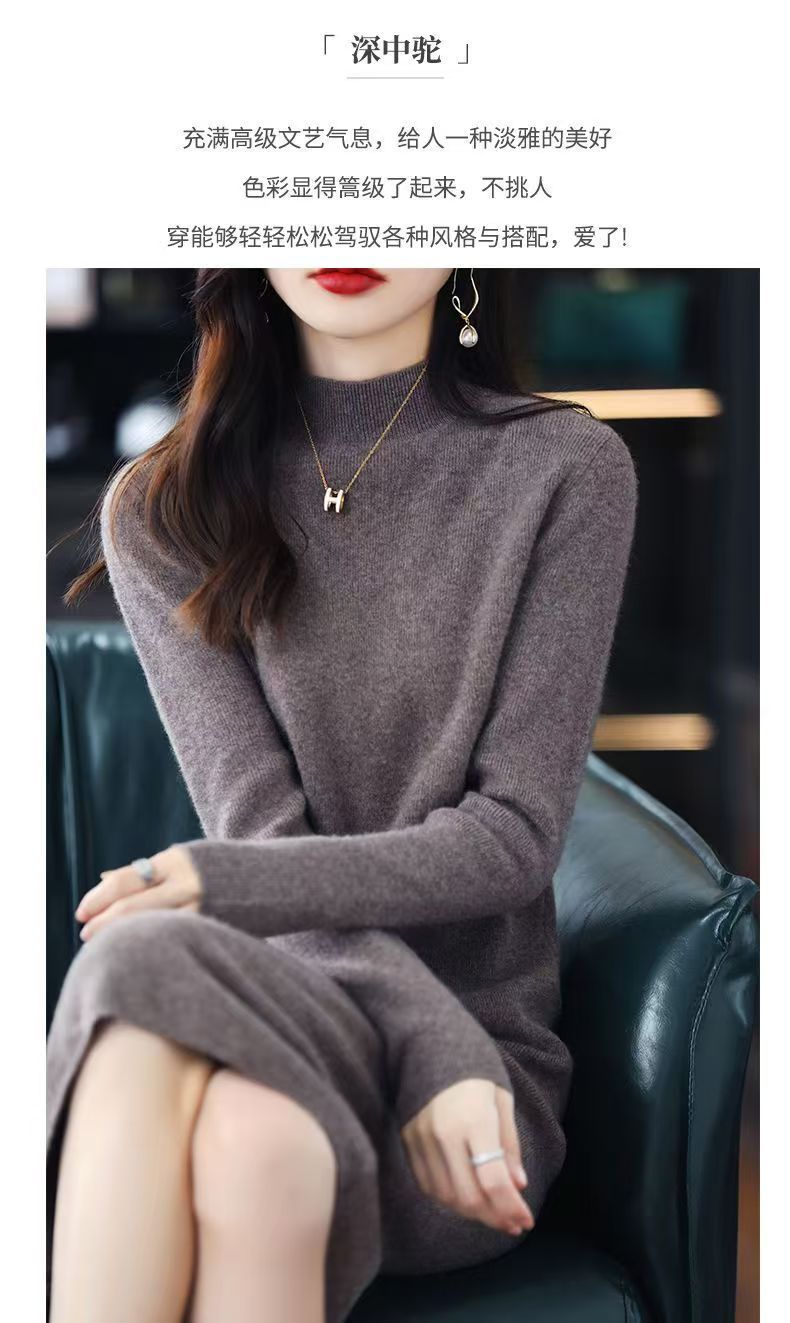 MY15434# 半高领中长款针织连衣裙时尚宽松显瘦直筒保暖打底毛衣裙女裝貨源服裝批發